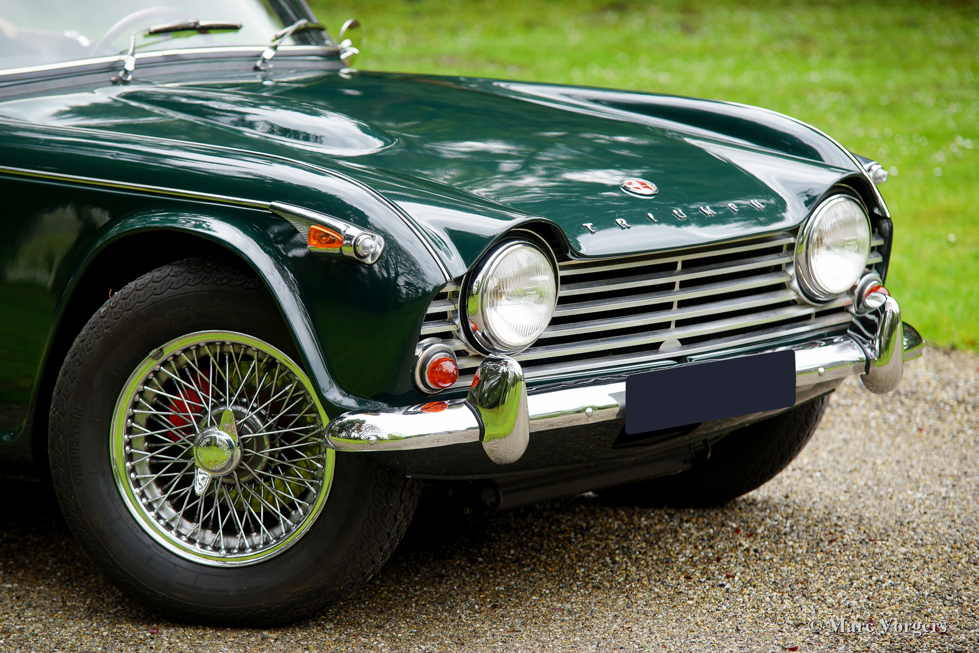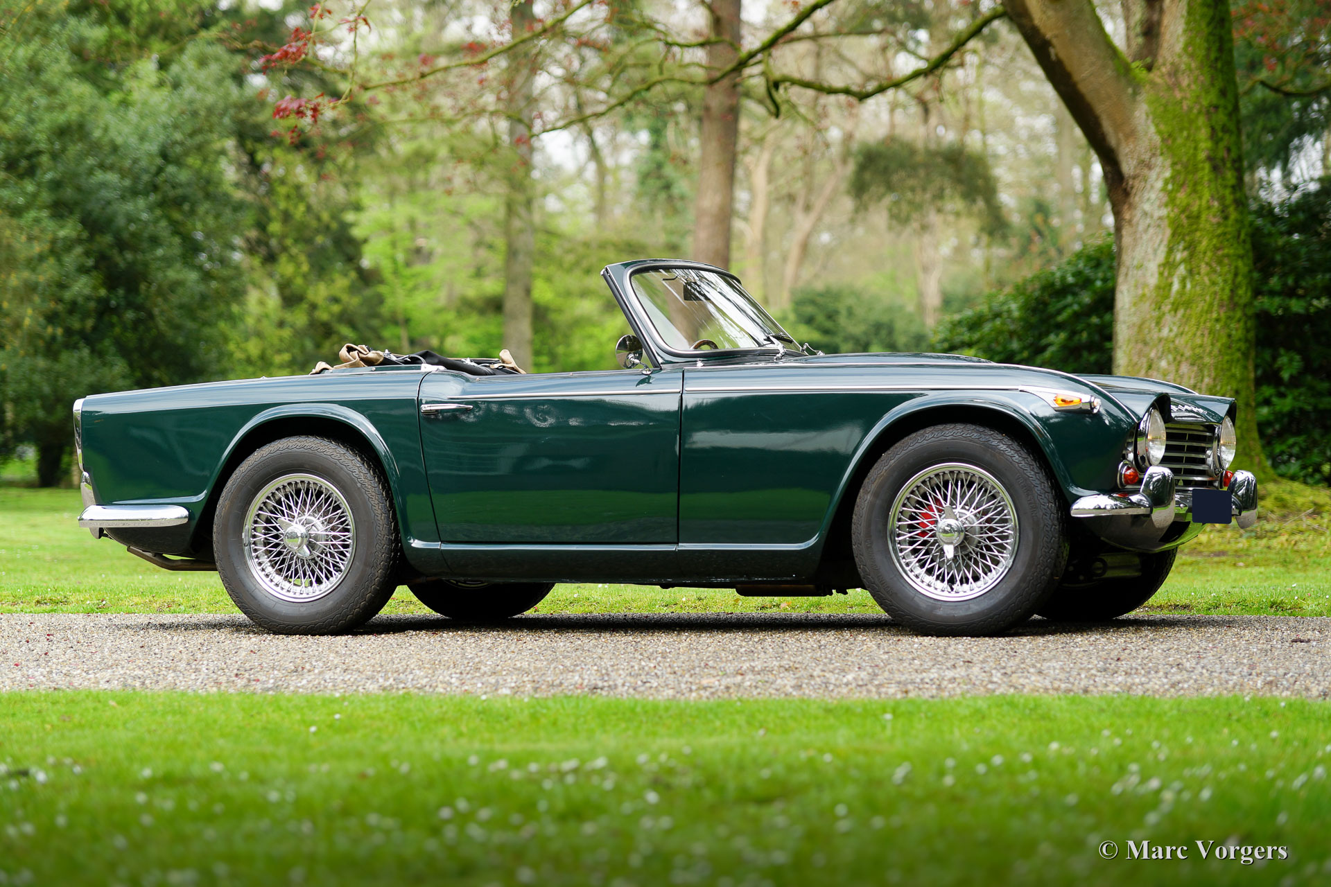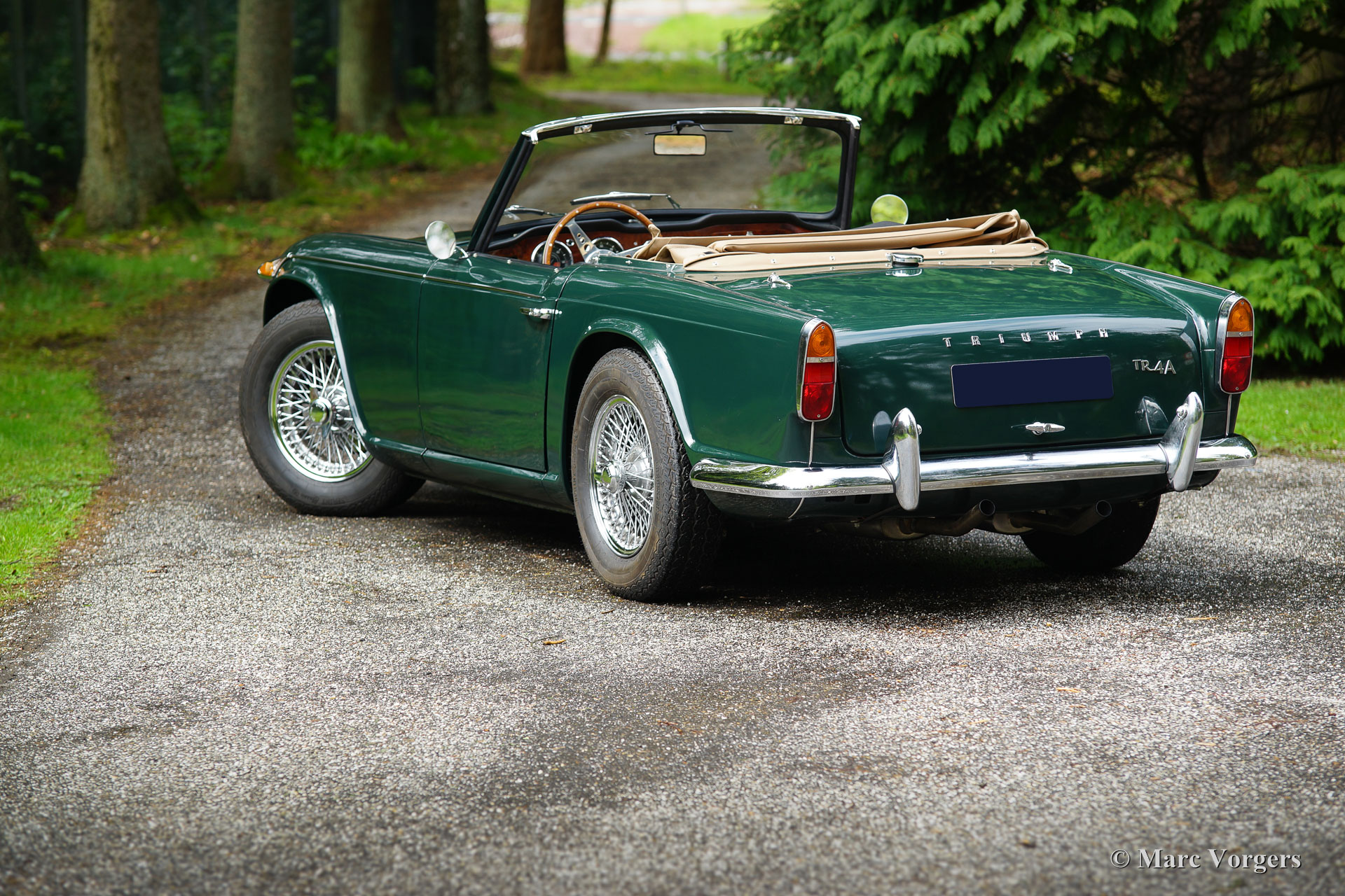 Triumph TR 4A, year 1966. Colour British Racing Green with a beige leather interior trimmed with green piping. Beige carpet and a beige mohair soft-top. This wonderful Triumph TR 4A was extensively and ‘nut & bolt’ restored twelve years ago, photos and a lot of invoices giving insights of the restoration are present. During the restoration, the engine was modified to run on lead-free petrol. This magnificent Triumph TR 4A is in excellent condition with slight signs of use (little hair-scratches in the paint on some spots). The car features chrome wire wheels, a walnut dashboard and a beautiful MotoLita steeringwheel with wood rim. This Triumph TR has been used mainly for holiday trips, the car is ready for sunny adventures with its future owner!