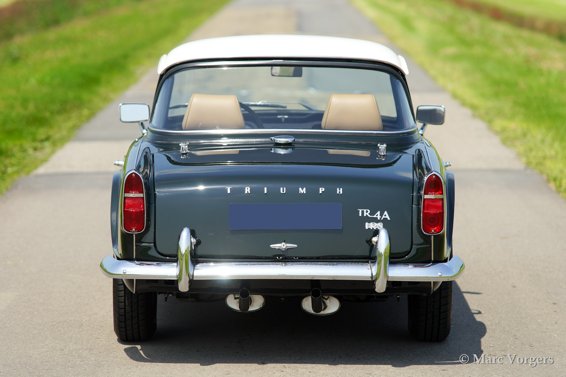 Triumph TR 4a IRS, year 1966. Colour dark British Racing Green with a beige leather interior. Surrey top in body colour with crème white roof panel. The car is fitted with silver enameled wire wheels, a walnut dashboard, comfort seats with a higher back rests and a twin pipe sports exhaust.
