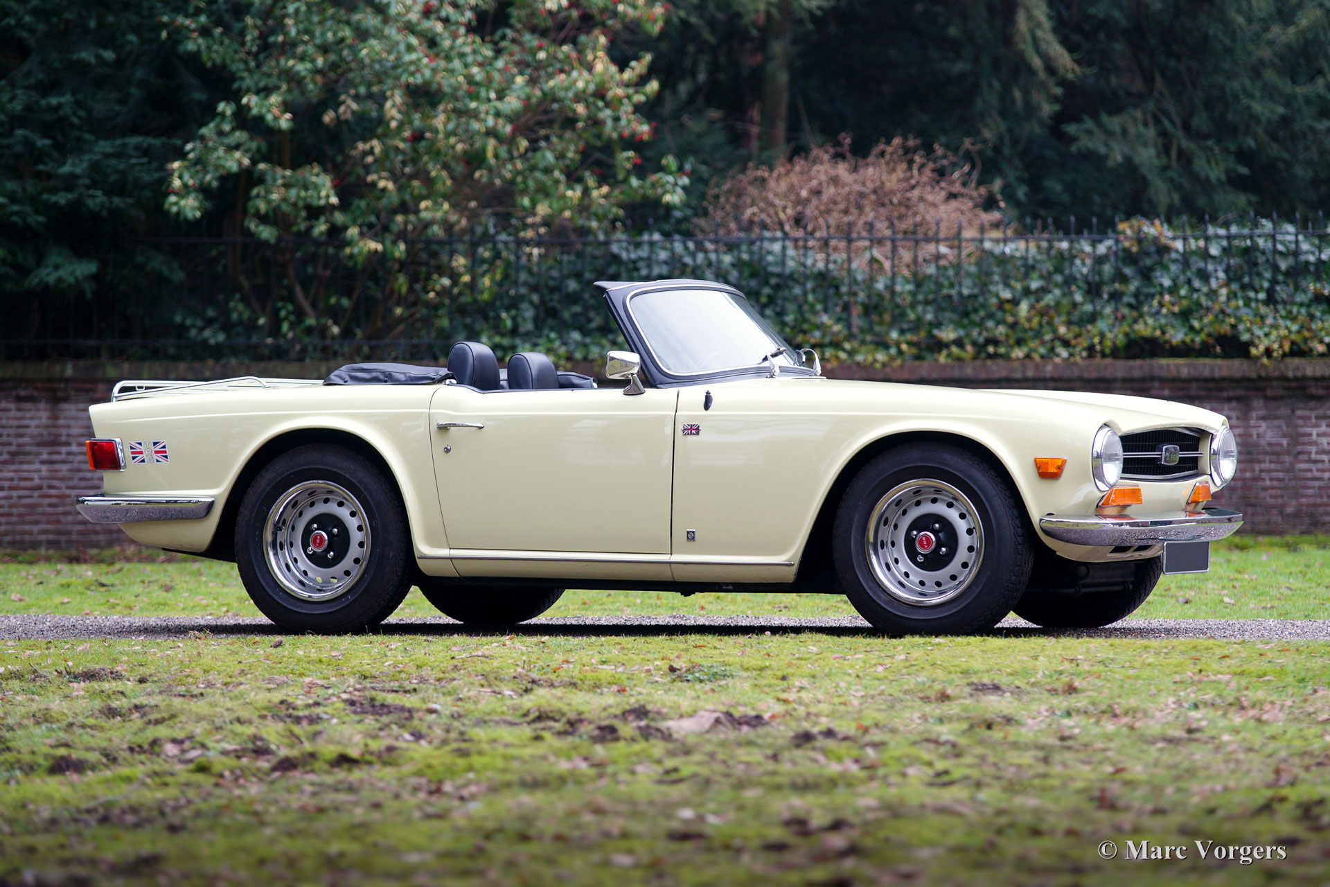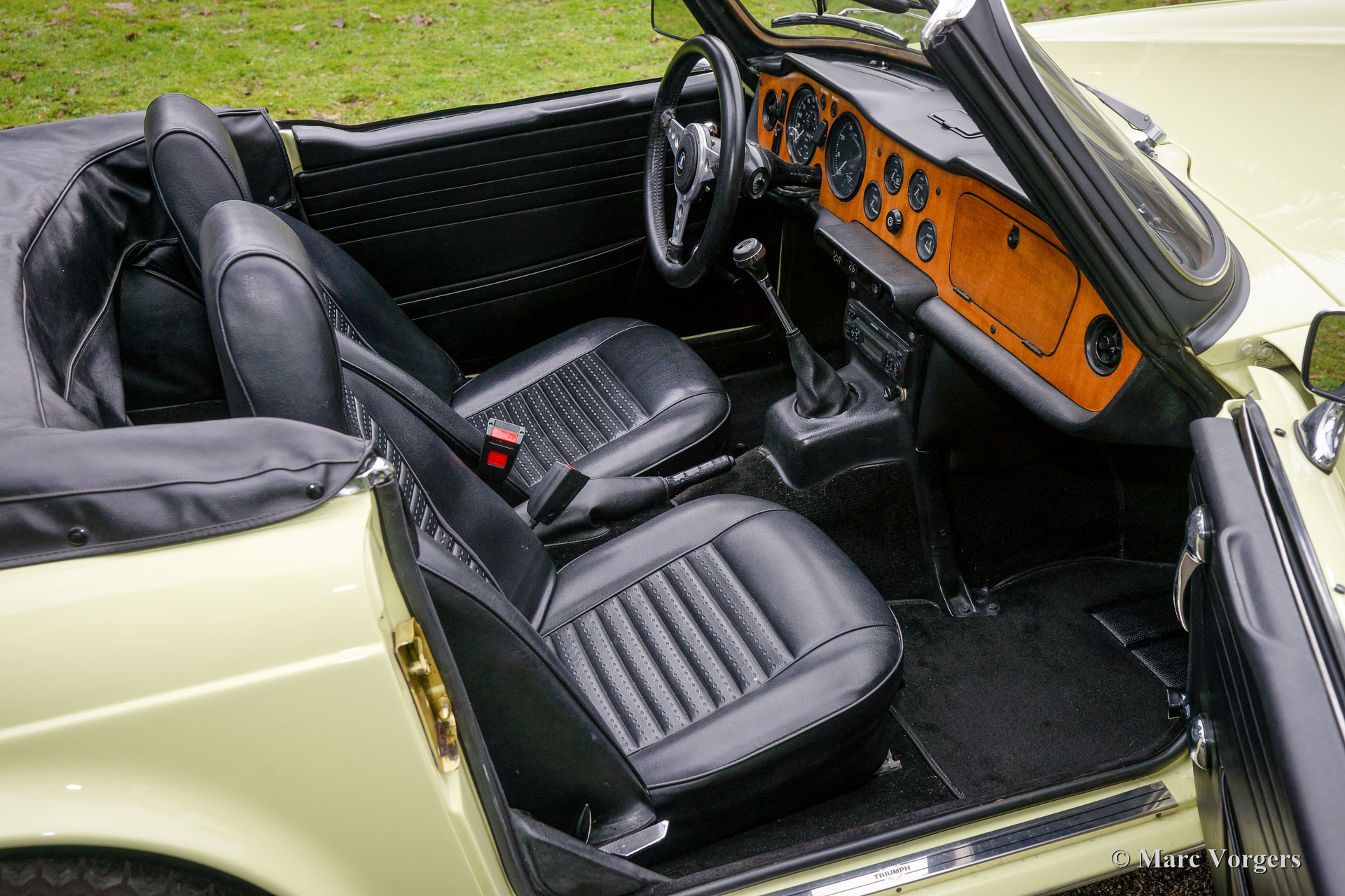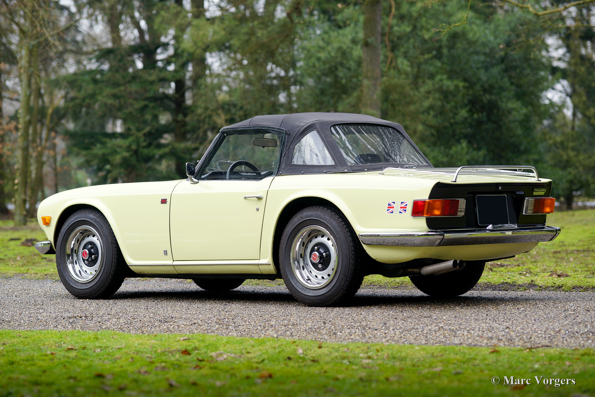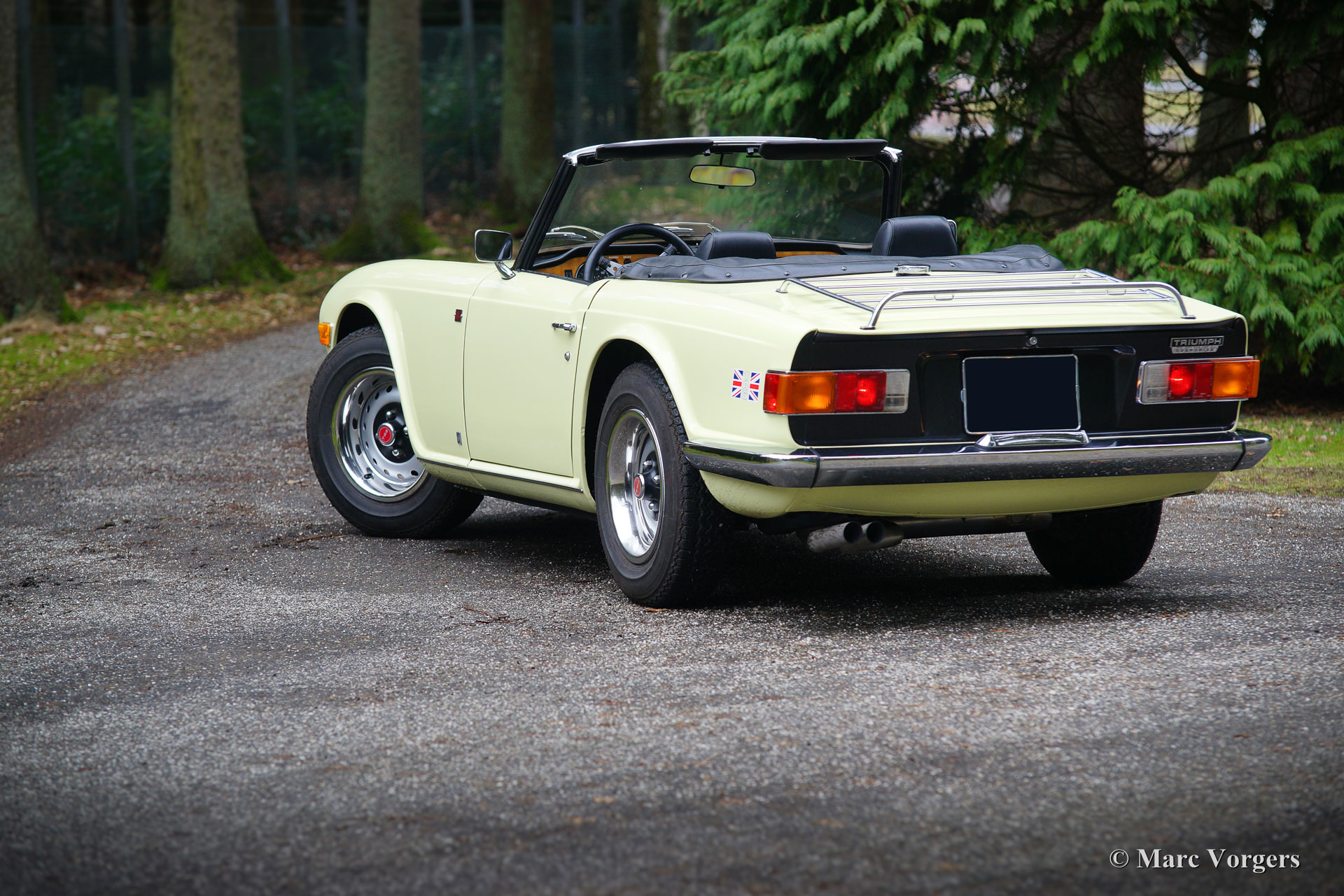 Triumph TR 6, year 1969. Colour pale yellow with a black leatherette interior and black carpet. Black soft-top and hood cover. This fantastic Triumph TR 6 was sold new in the USA. The car was imported to the Netherlands in the year 1995. This TR 6 is in very good condition and the car drives perfectly! The six-cylinder engine sound is wonderful! This early Triumph TR 6 shows all the original details like the cabin light on the floor, the early gauges and the masculine steel wheels with the black hub caps. Furthermore, the car features overdrive (operated from the shift knob), a longer shift stick, a chrome luggage rack and a sports steering wheel with leather covered rim. A very good example at a very interesting price!