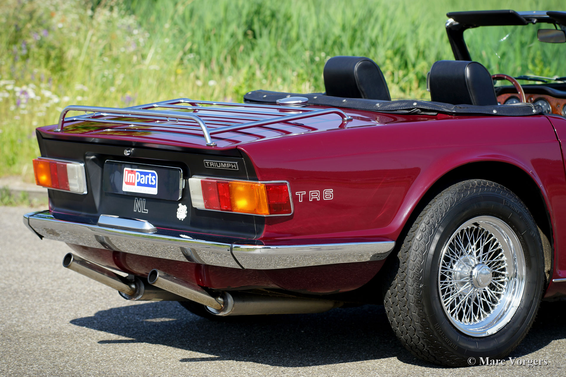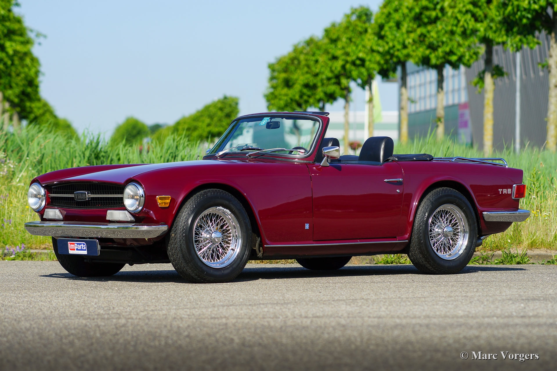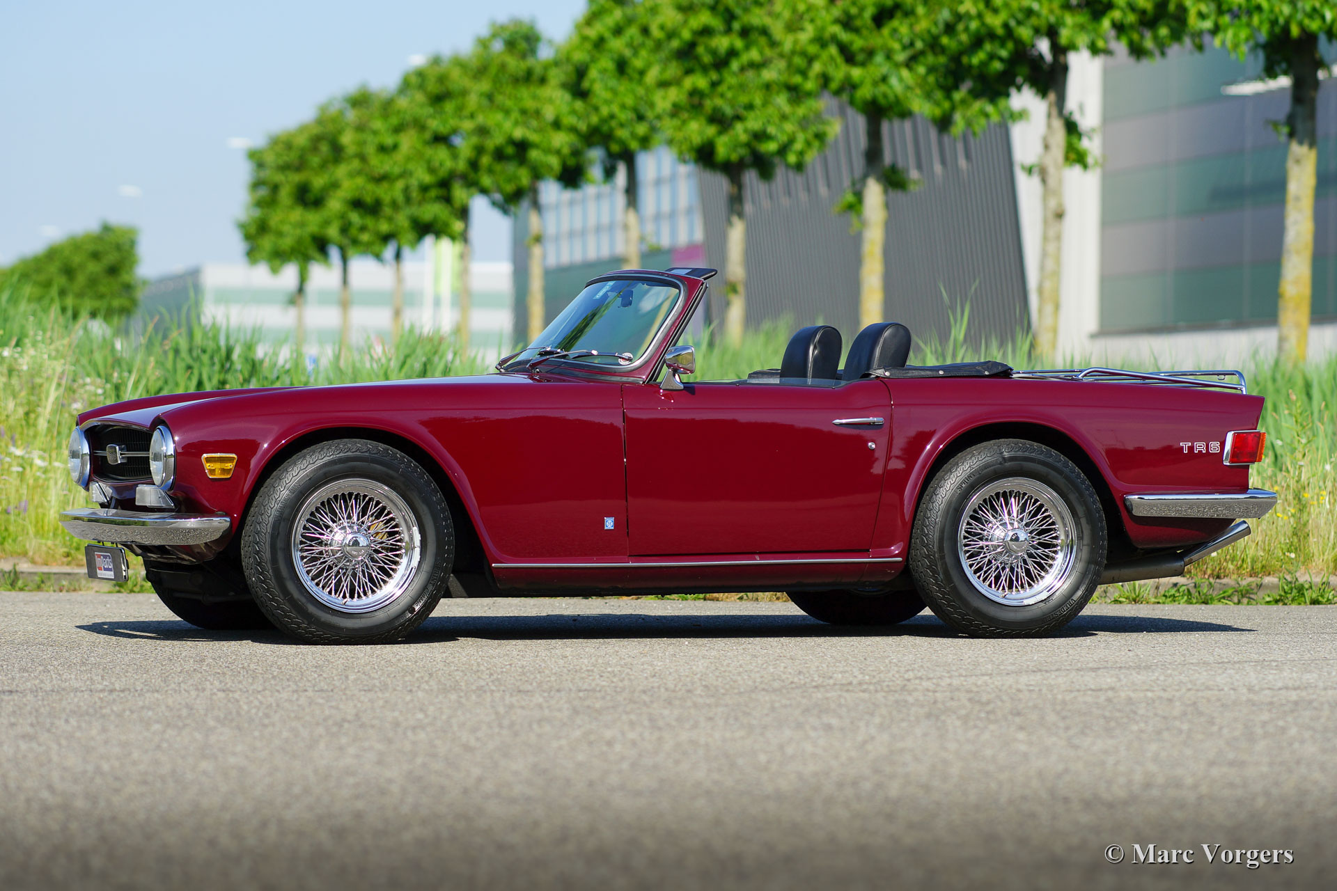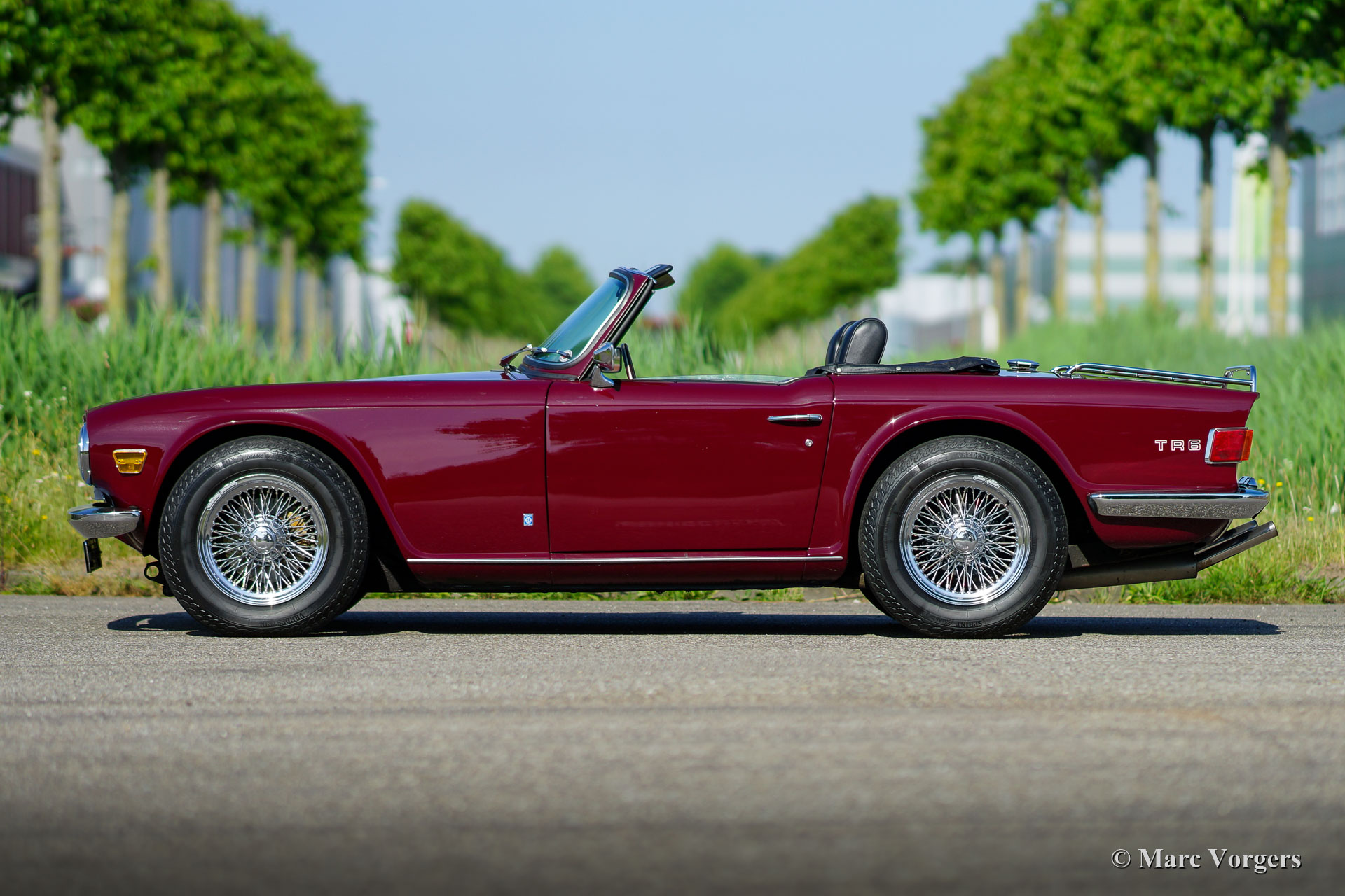 Triumph TR 6, year 1969. Colour Damson red combined with a black leatherette interior, black carpet, black vinyl soft-top, and a black hood cover. This tremendous Triumph TR 6 was built in 1968, so it was one of the first carburettor models exported to the USA. This wonderful automobile was imported to the Netherlands in 1998. This TR 6 was extensively restored in the past, the car is still in excellent condition, and it drives exceptionally well! The car steers, brakes and shifts perfectly and everything feels very well built, restored, and maintained. This masculine and sporty Triumph TR 6 features wide chrome wire wheels, overdrive, an aluminium rocker cover, S.U. carburettors, K&N sports air-filters and a Stainless-Steel exhaust system. The suspension was upgraded with polyurethane bushes for a more solid ride and better steering. The interior was upgraded with a walnut dashboard and a matching shift knob. Under the bonnet you will find a versatile wood storage box for small spare parts. The delightful 2.5 Litre six-cylinder engine runs smooth and powerful, and the exhaust note is addictive! This is a highly desirable example in excellent condition!