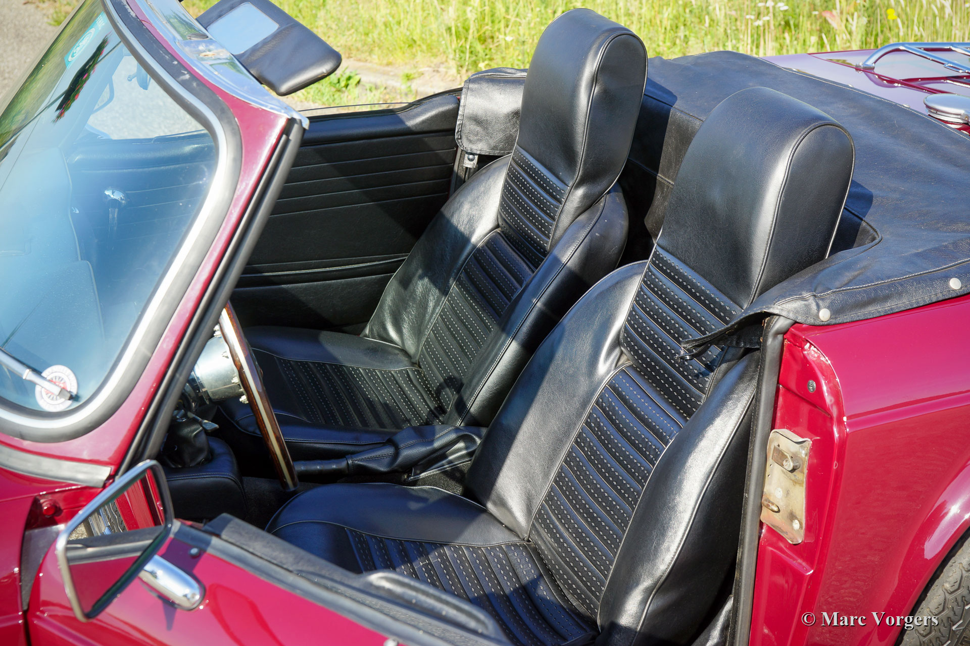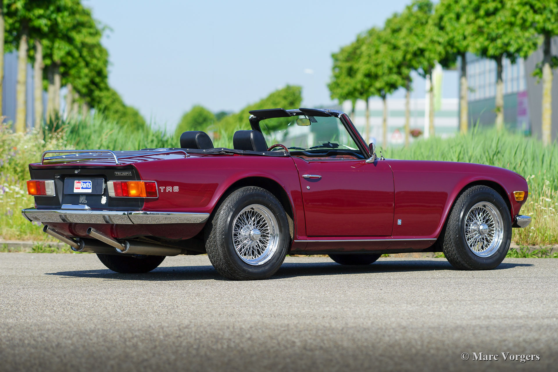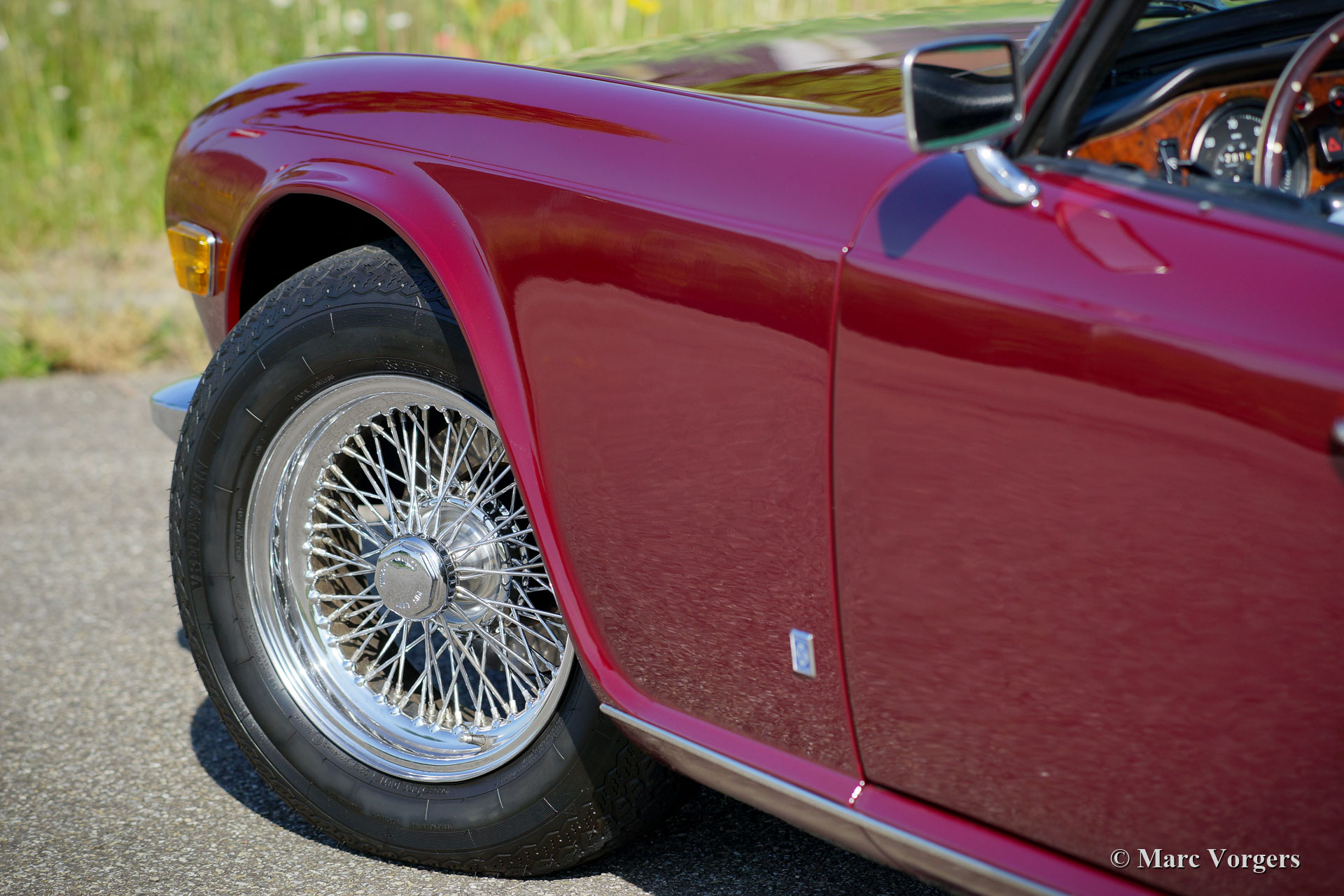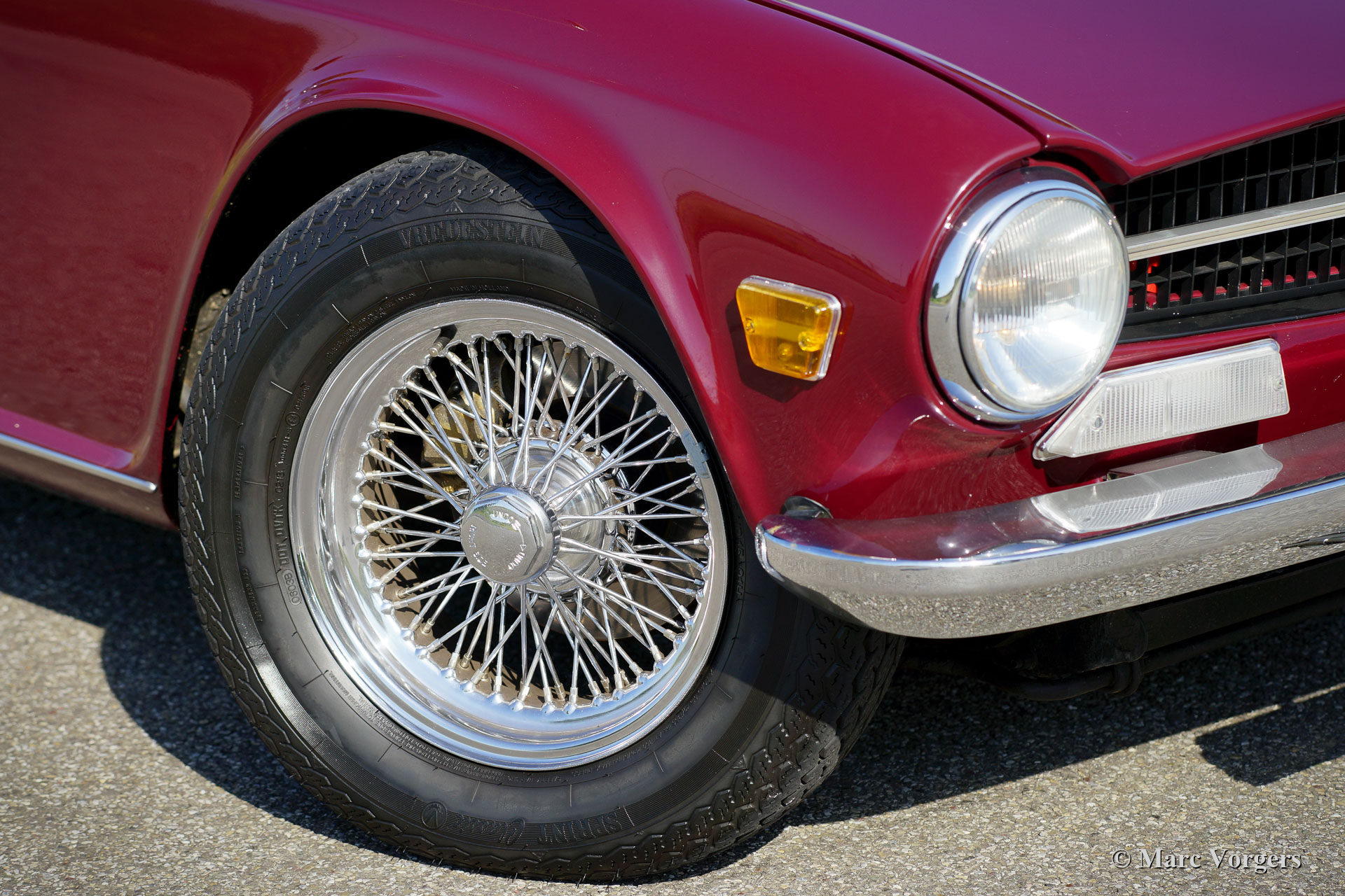 Triumph TR 6, year 1969. Colour Damson red combined with a black leatherette interior, black carpet, black vinyl soft-top, and a black hood cover. This tremendous Triumph TR 6 was built in 1968, so it was one of the first carburettor models exported to the USA. This wonderful automobile was imported to the Netherlands in 1998. This TR 6 was extensively restored in the past, the car is still in excellent condition, and it drives exceptionally well! The car steers, brakes and shifts perfectly and everything feels very well built, restored, and maintained. This masculine and sporty Triumph TR 6 features wide chrome wire wheels, overdrive, an aluminium rocker cover, S.U. carburettors, K&N sports air-filters and a Stainless-Steel exhaust system. The suspension was upgraded with polyurethane bushes for a more solid ride and better steering. The interior was upgraded with a walnut dashboard and a matching shift knob. Under the bonnet you will find a versatile wood storage box for small spare parts. The delightful 2.5 Litre six-cylinder engine runs smooth and powerful, and the exhaust note is addictive! This is a highly desirable example in excellent condition!
