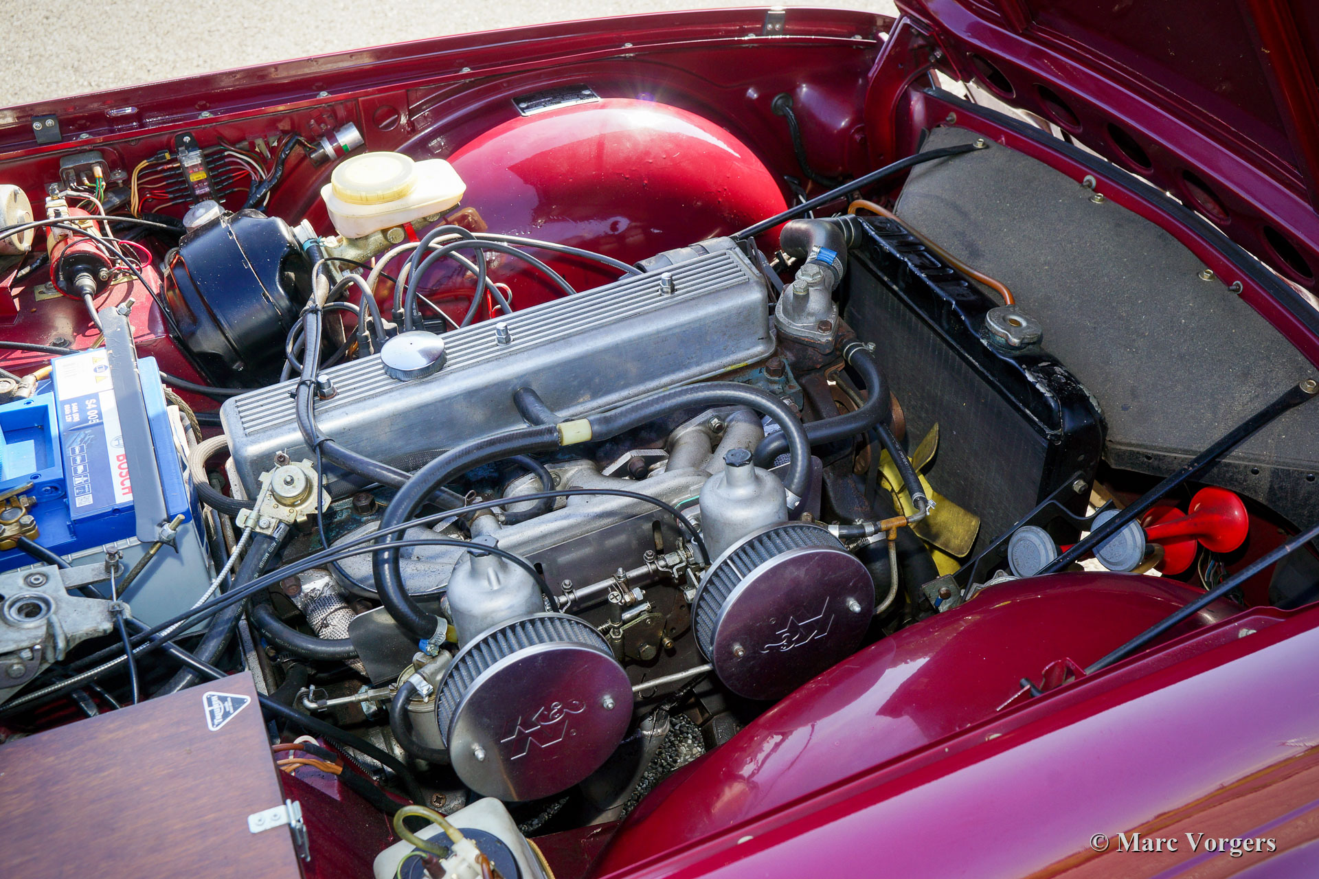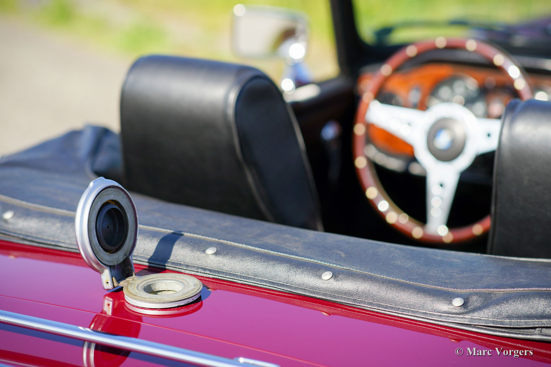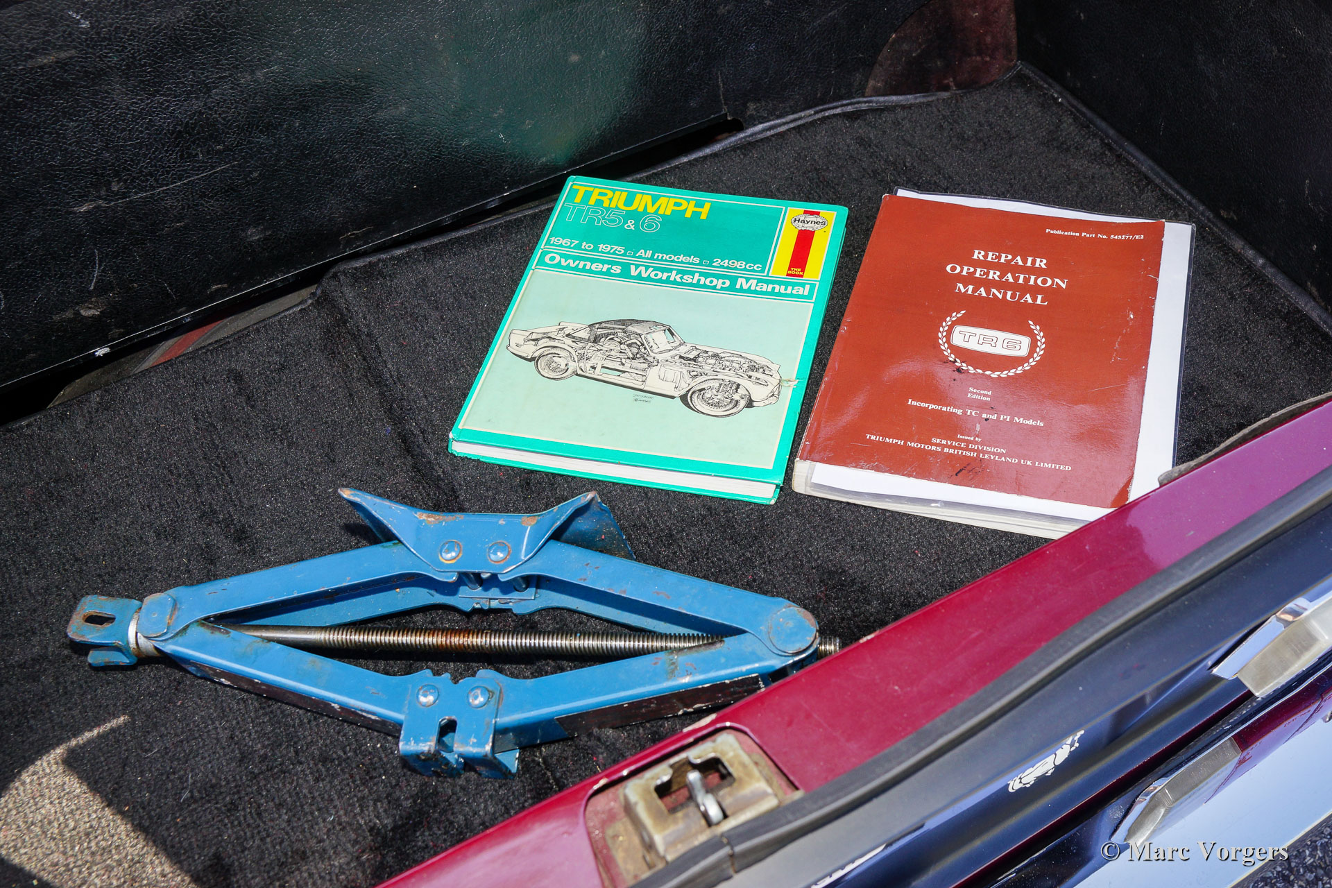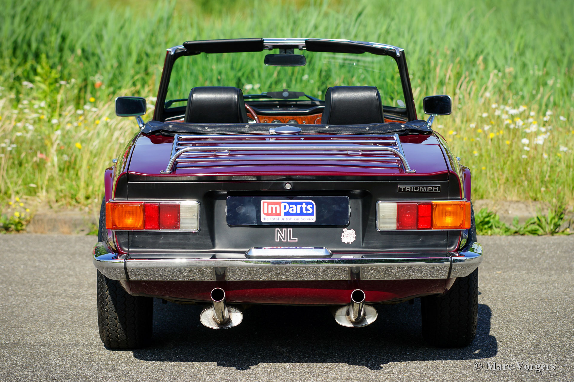 Triumph TR 6, year 1969. Colour Damson red combined with a black leatherette interior, black carpet, black vinyl soft-top, and a black hood cover. This tremendous Triumph TR 6 was built in 1968, so it was one of the first carburettor models exported to the USA. This wonderful automobile was imported to the Netherlands in 1998. This TR 6 was extensively restored in the past, the car is still in excellent condition, and it drives exceptionally well! The car steers, brakes and shifts perfectly and everything feels very well built, restored, and maintained. This masculine and sporty Triumph TR 6 features wide chrome wire wheels, overdrive, an aluminium rocker cover, S.U. carburettors, K&N sports air-filters and a Stainless-Steel exhaust system. The suspension was upgraded with polyurethane bushes for a more solid ride and better steering. The interior was upgraded with a walnut dashboard and a matching shift knob. Under the bonnet you will find a versatile wood storage box for small spare parts. The delightful 2.5 Litre six-cylinder engine runs smooth and powerful, and the exhaust note is addictive! This is a highly desirable example in excellent condition!