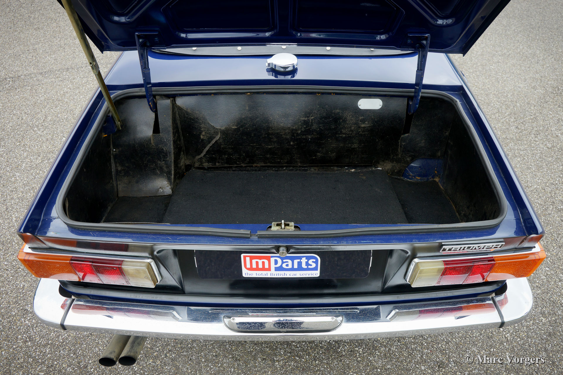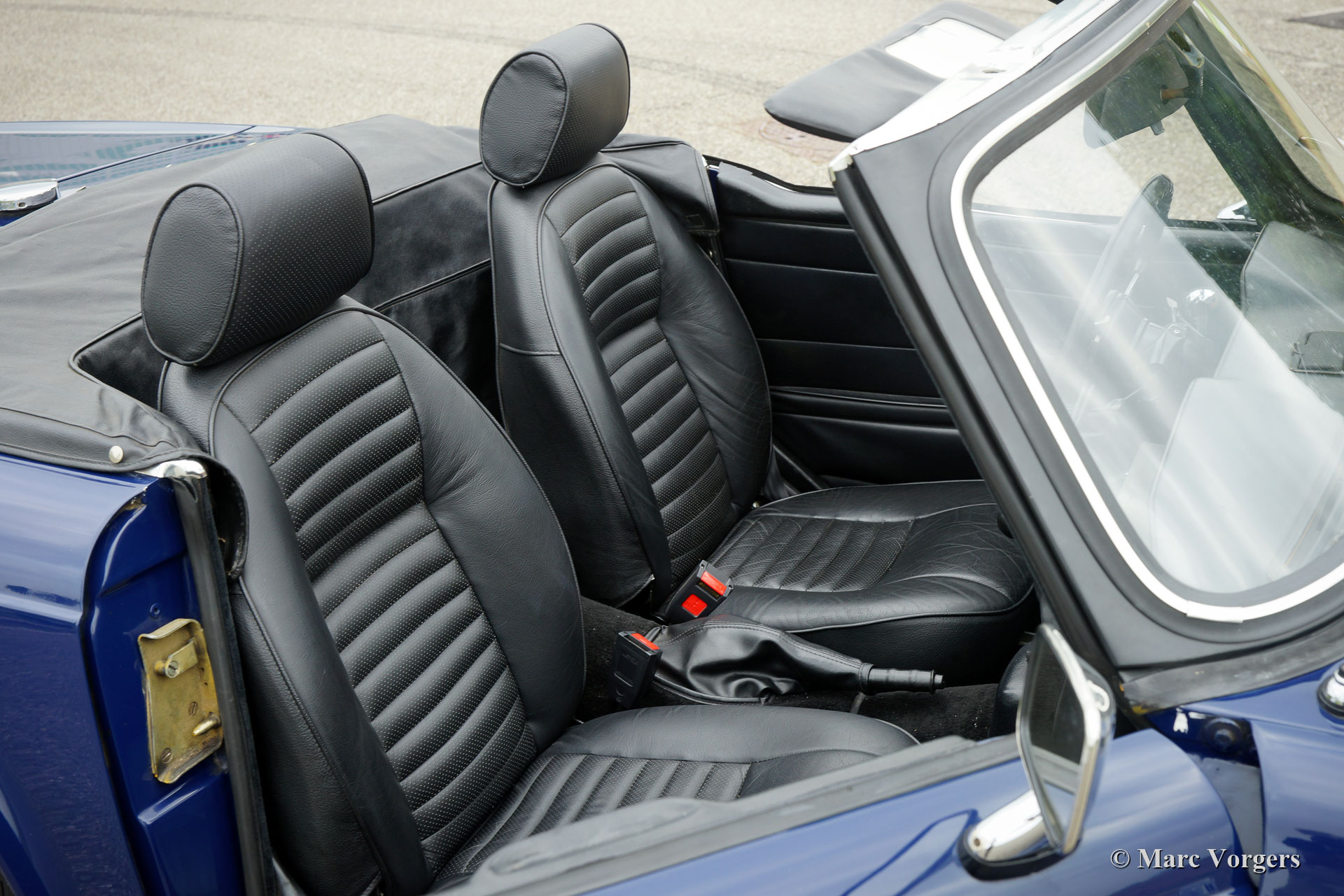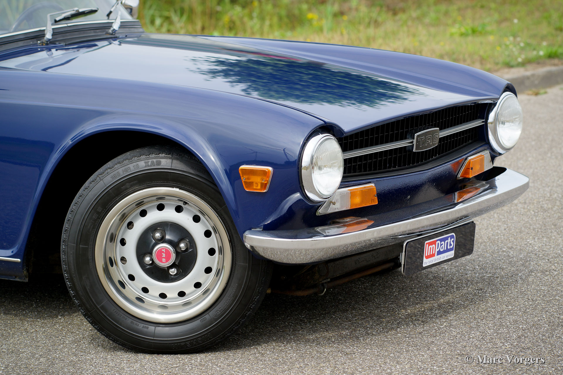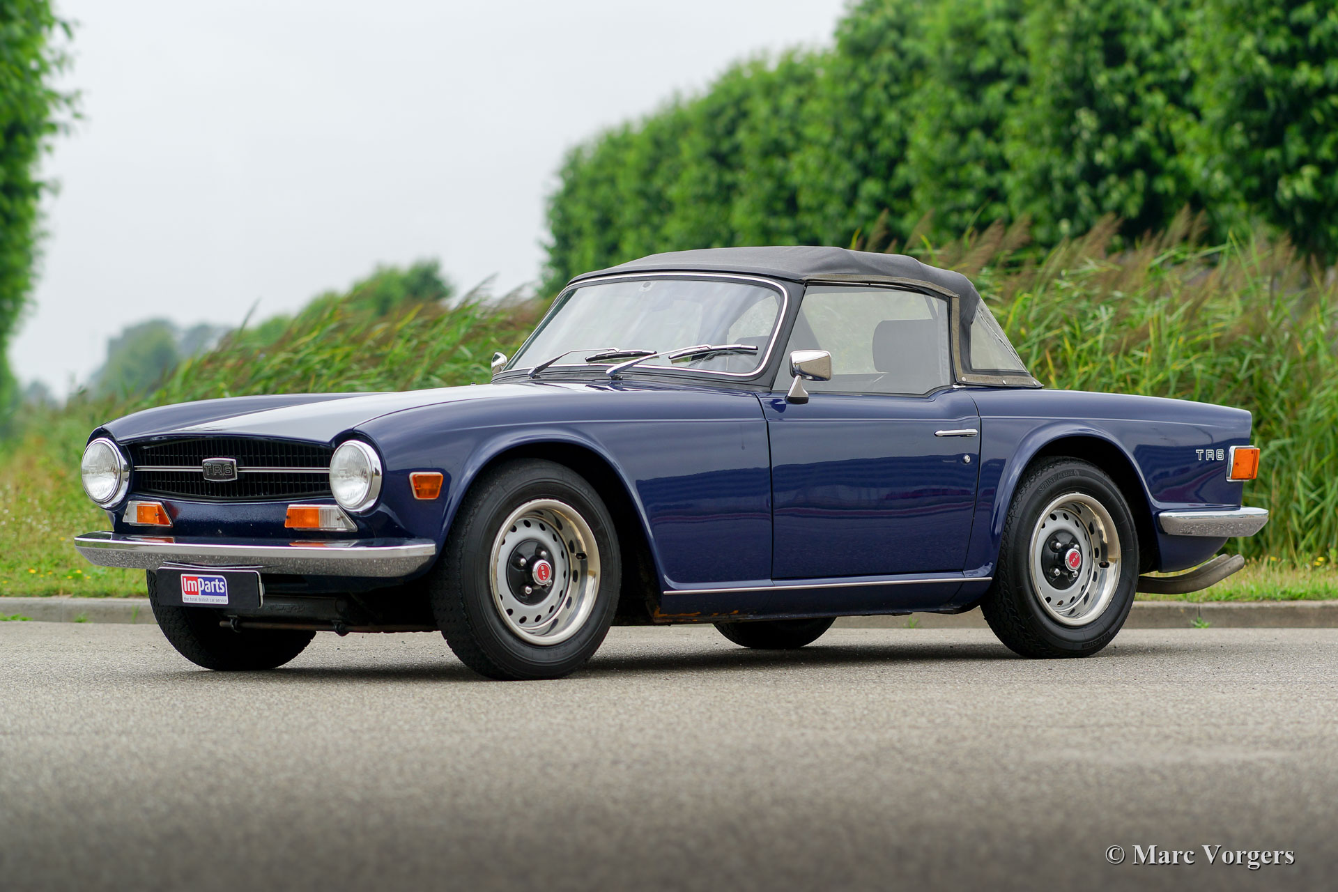 Triumph TR 6 PI, year 1972. Colour dark blue with a black leather interior and black carpet. Black vinyl soft-top and hood-cover. This beautiful factory original TR6 PI is a CP model with the very desirable 150 bhp engine. The car was delivered to Belgium as a CKD car to be assembled, the car was dispatched to the Netherland in June 1972. This TR6 PI was cherished by the last owner since the year 2005, the automobile is in very good driver condition and the car drives and sounds perfectly! The car features a modified PI system (Bosch Petrol pump instead of the Lucas type), special comfort seats with a higher back and head-rests, two chrome door-mirrors, electronic ignition and an electric cooling fan.