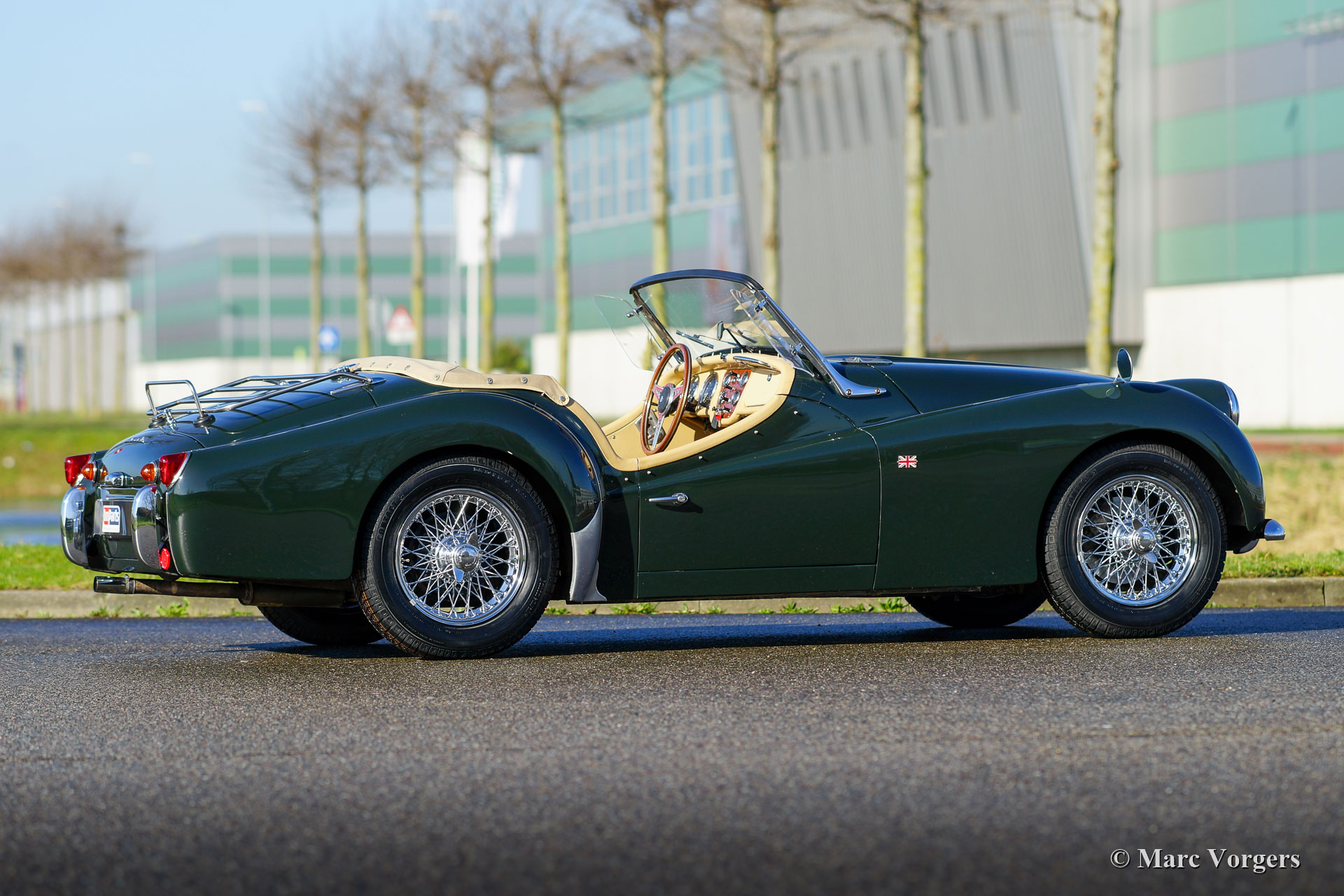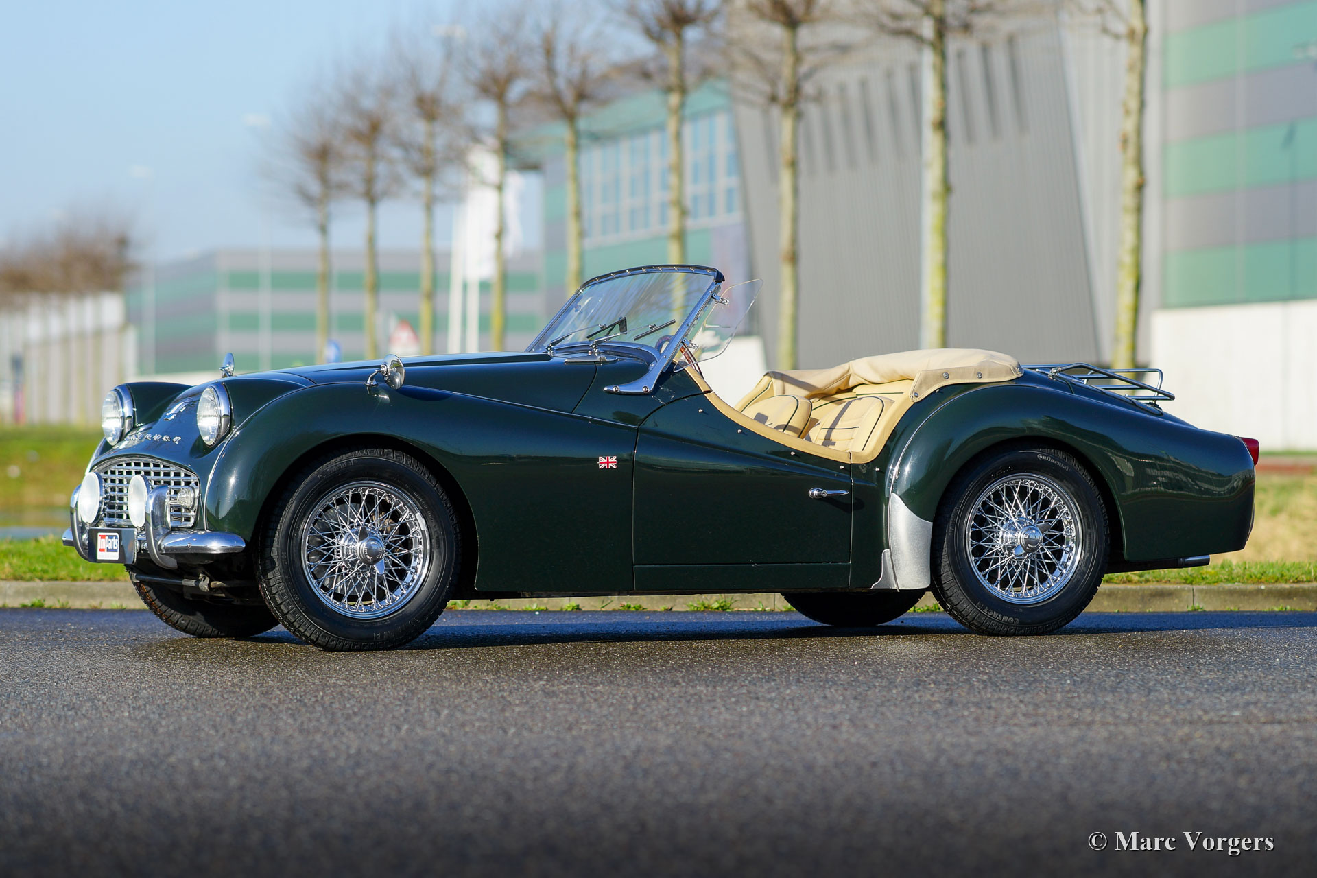 Triumph TR3 A, year 1960. Colour British Racing Green combined with a beige (biscuit) leather interior trimmed with dark green piping. Beige mohair soft-top and side-screen frames. This wonderful Triumph TR3 A was imported from the US in the year 1997 After arrival in the Netherlands the car was extensively restored to top condition. The steering box was exchanged for a more modern unit to improve the steering which is now lighter and more precise. This TR3 A is in excellent condition and it drives perfectly! The car features overdrive, new chrome wire wheels, additional driving lamps at the front, a MotoLita steering wheel with a wood rim, a chrome baggage rack, electronic ignition, K&N sports air-filtres, and an aluminium rocker cover. The 2.2 Litre four cylinder in-line engine pulls strongly, and it sounds fantastic! A very nice example!