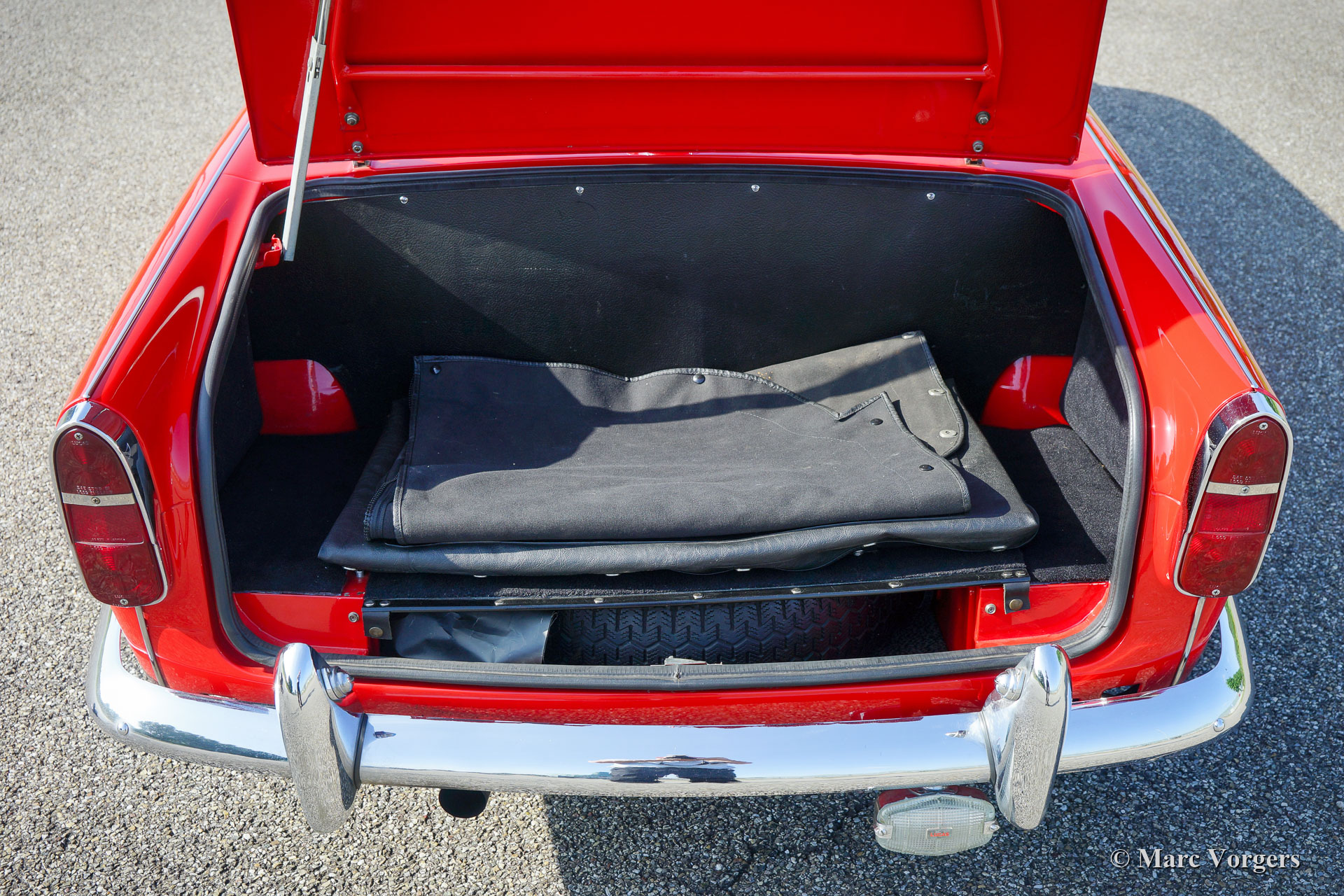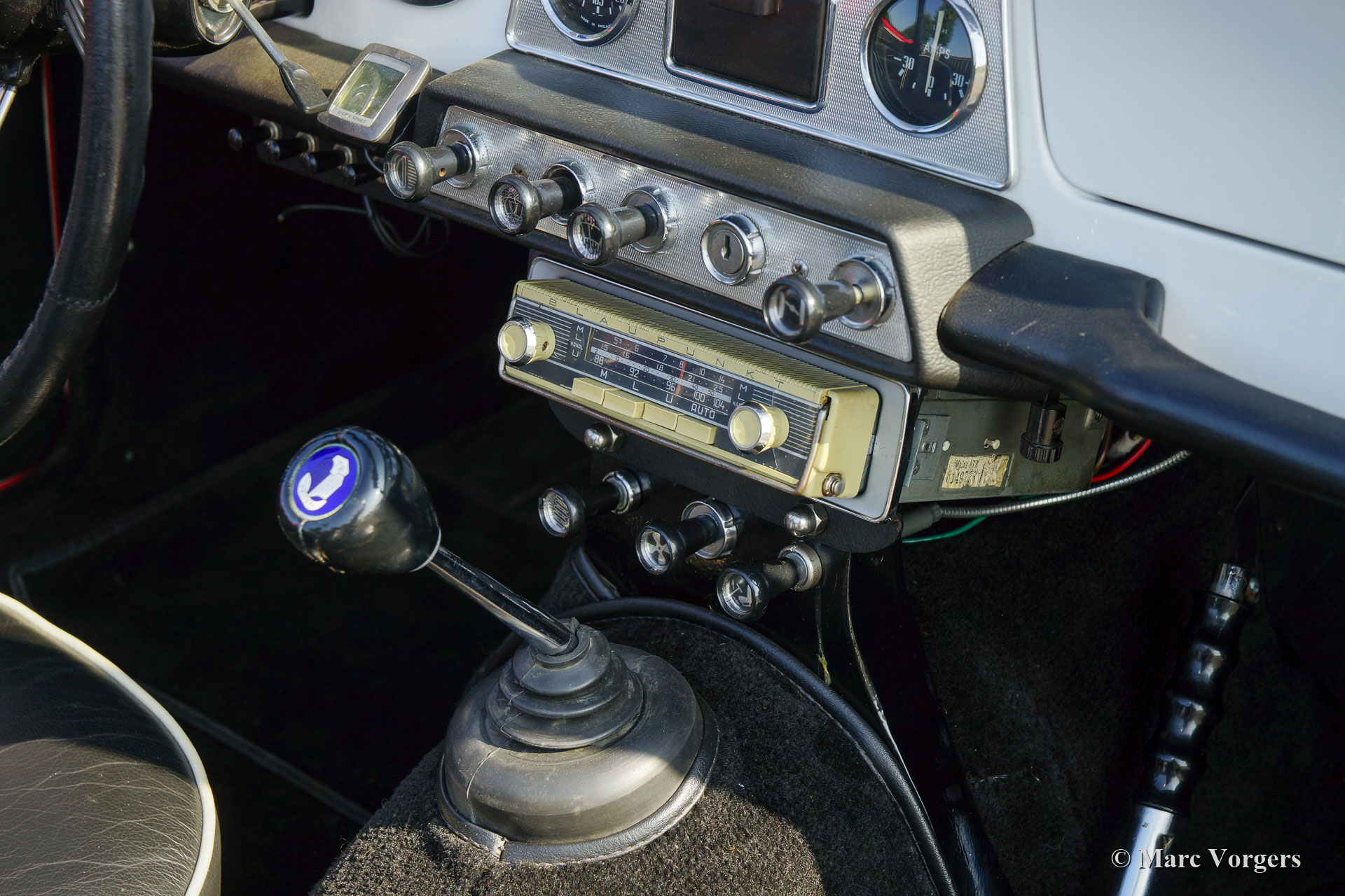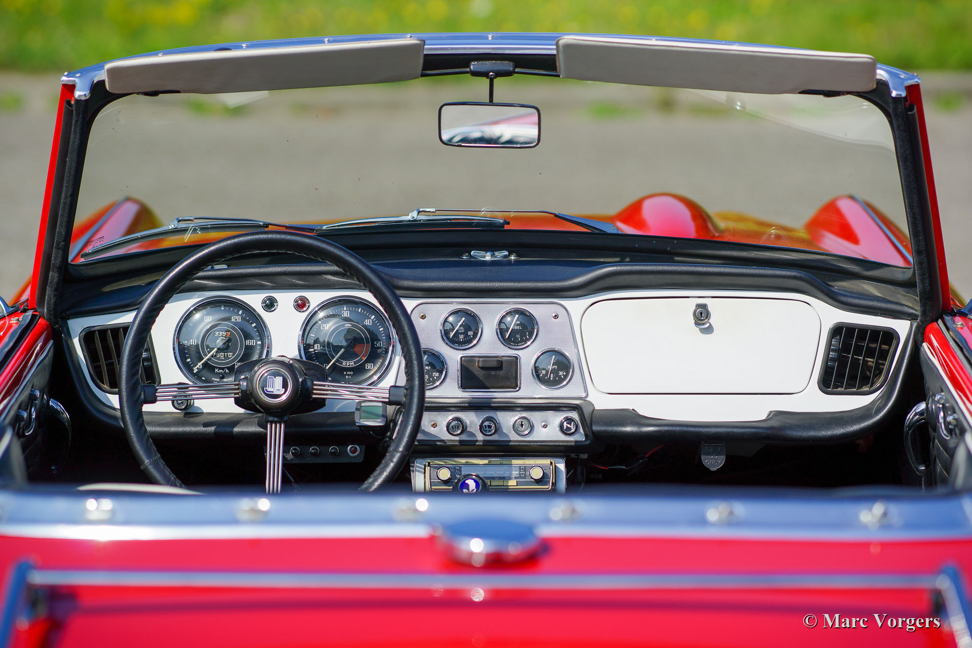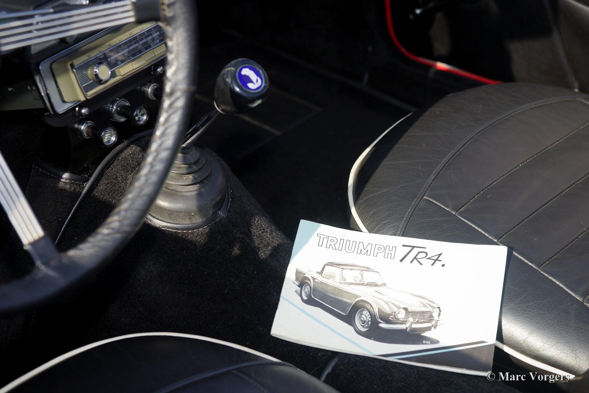 Triumph TR 4, year 1962. Colour red combined with a black leather interior trimmed with white piping. Black soft-top and tonneau-cover. This ‘matching numbers’ early Triumph was fully restored in the years 2000 – 2002. Looking at the car you get the impression that the car was restored about a year ago. This rare early TR4 is in superb condition and the car drives perfectly! The early TR4 is immediately recognizable by the gorgeous metal dashboard which is painted white in this car. The bonnet still has the short ‘tear-drop’ which gives room to the carburettors. Very special is the 1964 Blaupunkt Mainz ATR radio which features the desirable FM waveband. This radio is a portable transistor radio which can be used outside the car! In the car the radio has to be inserted in a special sled thru which the 12-volt, antenna, and external speaker are connected. A very rare and handsome looking period device! Furthermore, this Triumph TR4 features Lucas FT/LR 11 ‘Nova’ spot and fog lamps at the front, silver painted wire wheels, the original steering wheel and an original chrome luggage rack. The car was up-rated / modified at some points: polyurethane bushes in the suspension, 12V mains-switch, Alternator (DC dynamo still present), extra electric cooling fan, oil-filter modification (the old one is still present) and an aluminium oil-sump. A top-class specimen!
