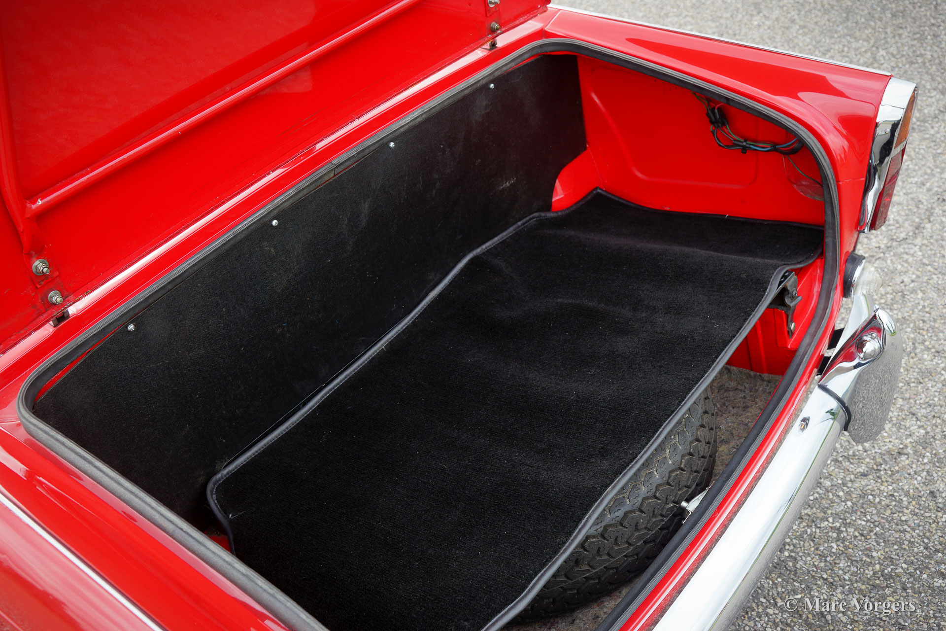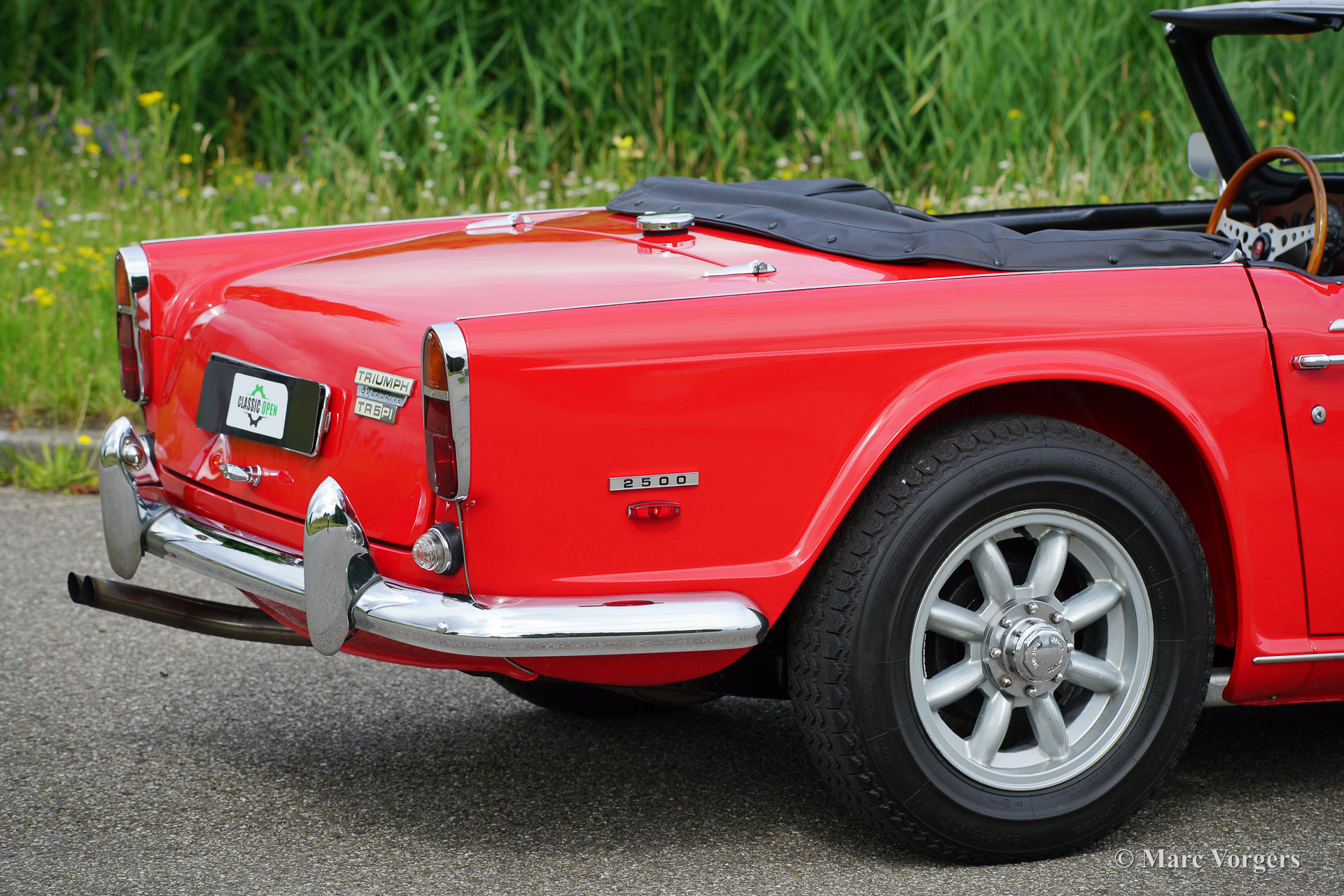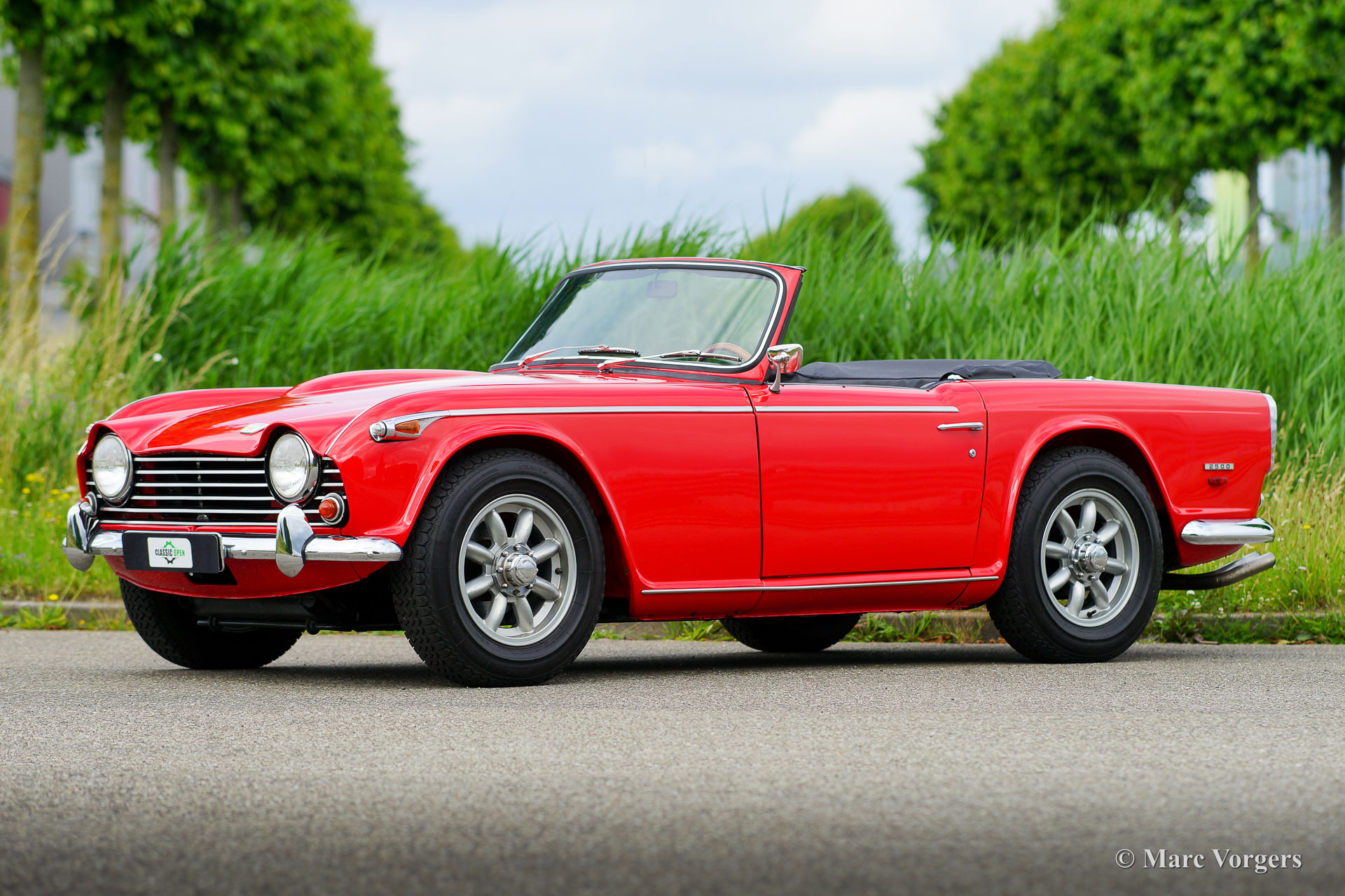 Triumph TR5, year 1968. Colour signal red combined with a black interior trimmed with white piping and black carpet. Black vinyl soft top and hood cover. This rare and wonderful Triumph TR5 with chassis number 1CP166LP was built in Belgium in 1967. This is the first TR5 which was sold in the Netherlands! The car comes with a complete history file. This magnificent Triumph TR5 was extensively and ‘body-off’ restored and overhauled, the work was carried out to original factory specifications. A photo report and invoices of the restoration are present. The car features the powerful (150 SAE bhp) CP engine and overdrive. The rebuilt mechanical Lucas injection system is now fitted with a Bosch fuel pump and fuel filter. The car is fitted with gorgeous Minilite style alloy wheels with ‘knock-on’ wheel nuts, Michelin 185-15 tyres, a Stainless-Steel exhaust, and a wonderful sports steering wheel with wood rim. This is a wonderful and very hard to find original Triumph TR5 in superb condition!