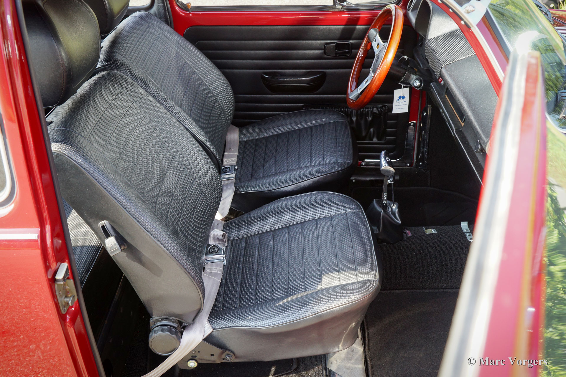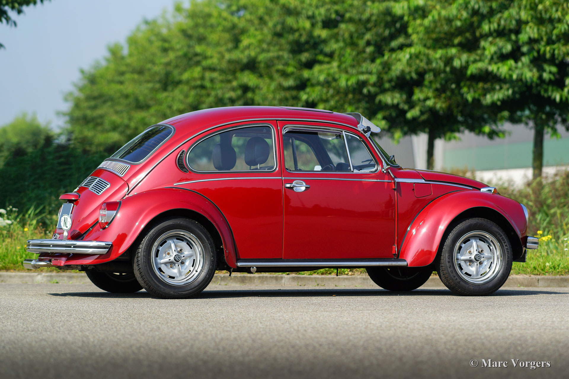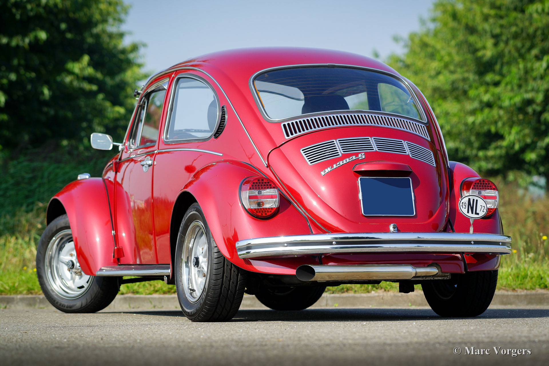 Volkswagen ‘Beetle’ 1303 S, year 1972. Colour red metallic (Pomegranate Red) with a black leathercloth interior, black carpet and black roof lining. This fantastic VW ‘Beetle’ 1303 S with 1600 cc engine was extensively restored. During the build-up, the interior was given additional sound-proofing for added comfort. Also the car was given a professional Waxoil / ML anti-corrosion treatment. The steel wheels have been durably coated and are fitted with chrome rim embellishers. Tyre size at the front 185/65-15, rear 205/60-15. This VW ‘Beetle’ has been fitted with extra wide plastic mudguards which absolutely look their part! Furthermore, this VW features Koni shock dampers, a sunshine roof, LED rear lights, an ‘Australian Sunvisor’, a wood rimmed steering wheel, a ‘dual-handle-speed-shift’ gear lever, front suspension strut, stabiliser bars at the front and the rear and a beautiful ‘Jet Pipe’ stainless-steel exhaust. This is a perfectly driving VW 1303 S; a beautifully modified example!
