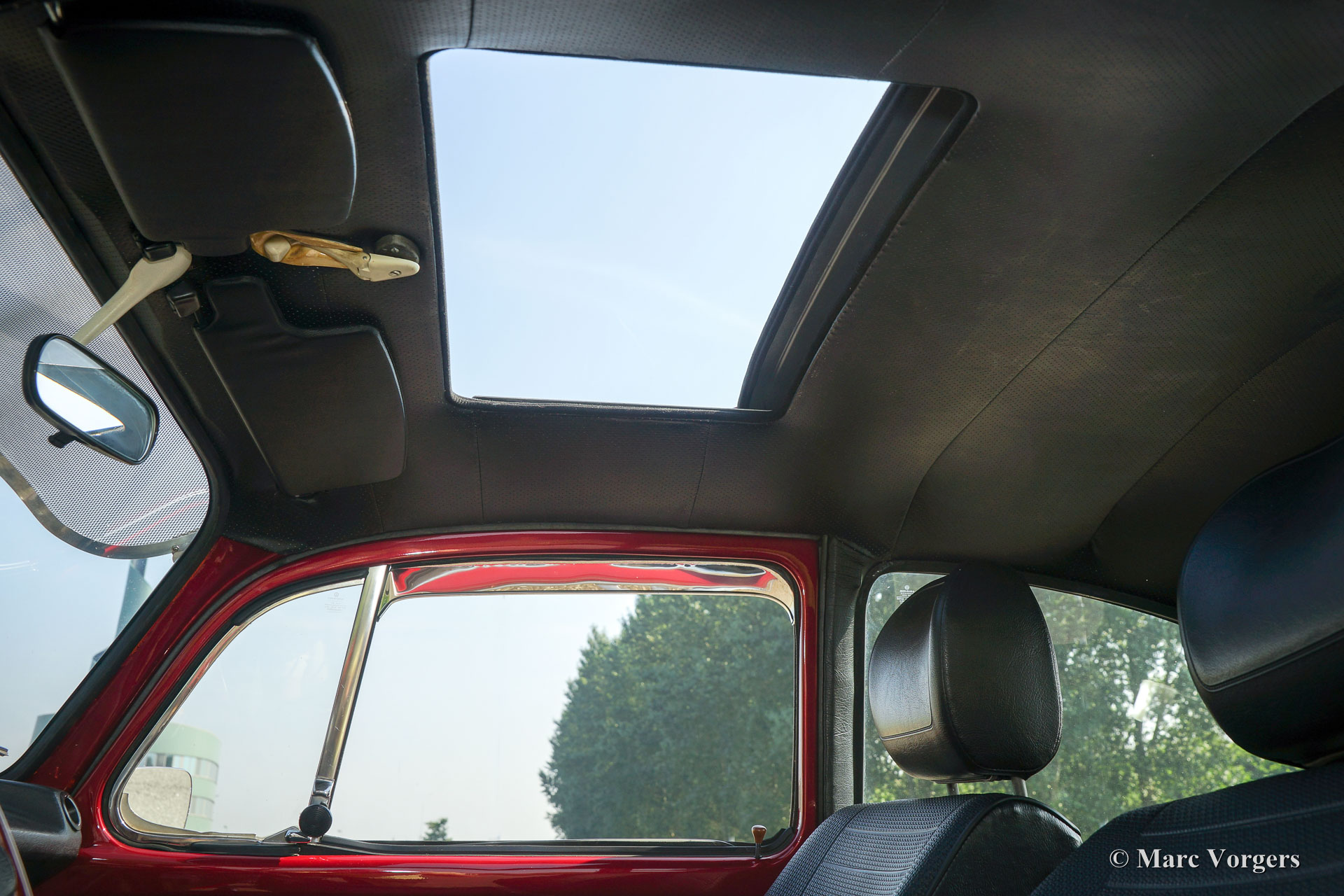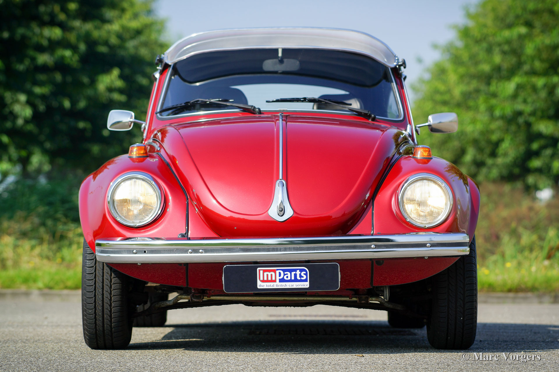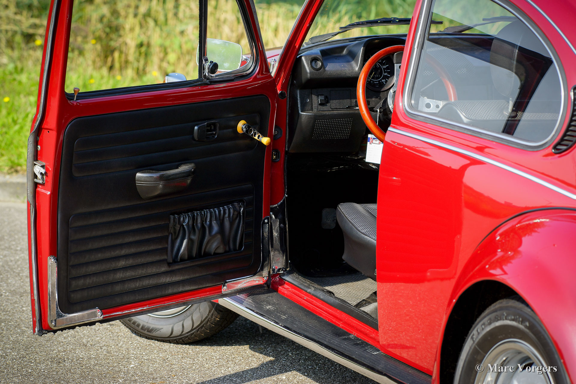 Volkswagen ‘Beetle’ 1303 S, year 1972. Colour red metallic (Pomegranate Red) with a black leathercloth interior, black carpet and black roof lining. This fantastic VW ‘Beetle’ 1303 S with 1600 cc engine was extensively restored. During the build-up, the interior was given additional sound-proofing for added comfort. Also the car was given a professional Waxoil / ML anti-corrosion treatment. The steel wheels have been durably coated and are fitted with chrome rim embellishers. Tyre size at the front 185/65-15, rear 205/60-15. This VW ‘Beetle’ has been fitted with extra wide plastic mudguards which absolutely look their part! Furthermore, this VW features Koni shock dampers, a sunshine roof, LED rear lights, an ‘Australian Sunvisor’, a wood rimmed steering wheel, a ‘dual-handle-speed-shift’ gear lever, front suspension strut, stabiliser bars at the front and the rear and a beautiful ‘Jet Pipe’ stainless-steel exhaust. This is a perfectly driving VW 1303 S; a beautifully modified example!
