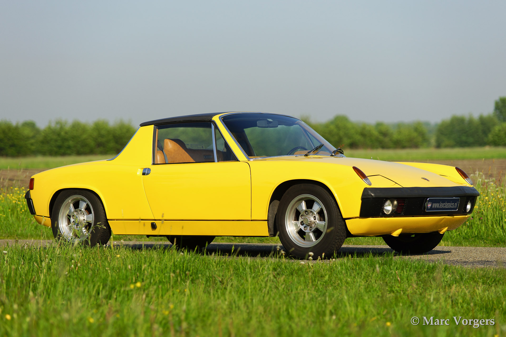 VW-Porsche 914 1.7L, year 1970. Colour yellow with a beige/black/grey interior. This VW-Porsche 914 was extensively restored. The originally black interior has been given a more luxurious appearance with beige leatherette covering the dashboard and the door panels. Special feature on the 914 is the detachable roof panel which can be stored in the rear compartment! With the roof panel in place luggage space is available in the front and the rear! This VW-Porsche 914 features alloy wheels, fog lamps at front and a car radio.