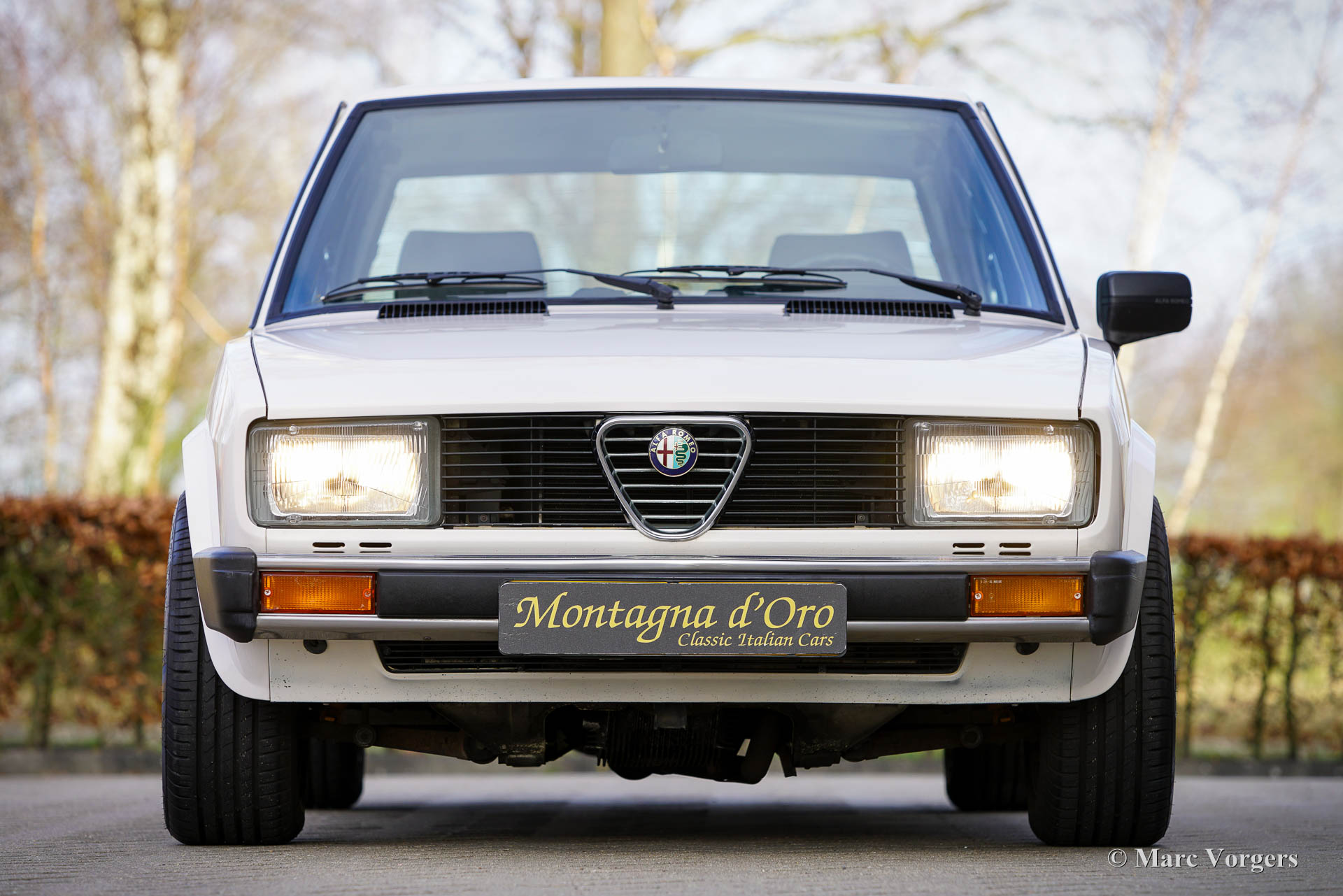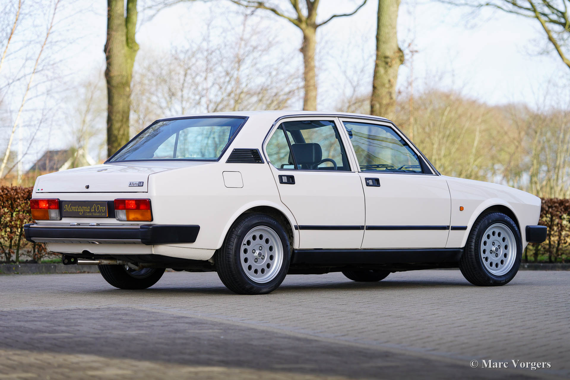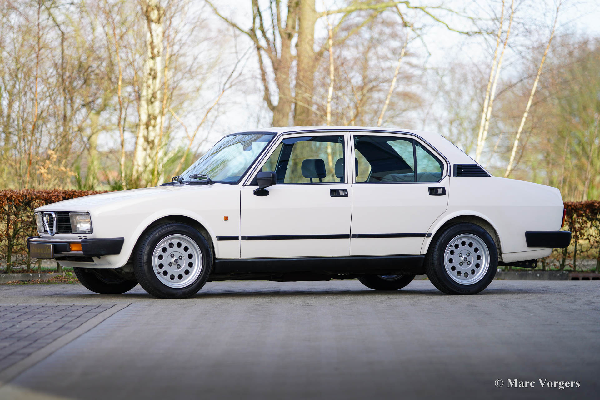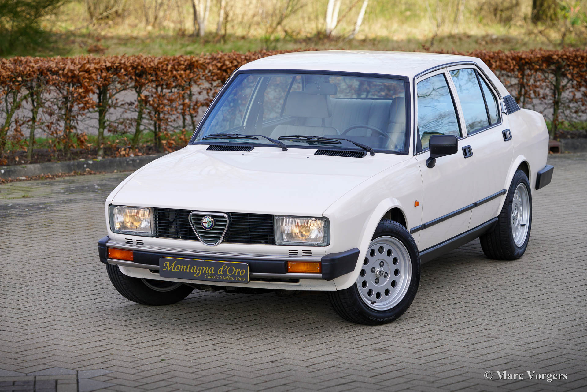 Alfa Romeo Alfetta 1800 Berlina, year 1983. Colour crème white (Bianco Capodimonte A.R.015) combined with a grey/black cloth/leathercloth interior trimmed with black carpet. This beautiful Alfa Romeo Alfetta 1800 Berlina was sold new in Italy. The car was imported to the Netherlands in 2021. This Alfetta 1800 Berlina is in a very good to excellent condition, the odometer currently shows 85.454 kilometres. The car shows only slight signs of previous use, under the bonnet everything looks crisp and clean, and the original interior is in excellent condition! The Alfa Romeo Alfetta is a sporty classic saloon featuring the mechanical details of a thoroughbred sports car. The car features an aluminium four-cylinder engine with twin overhead camshafts, a 5-speed “transaxle” gearbox fitted just in front of the rear suspension for 50-50 weight distribution, disc brakes around and a de-Dion rear axle. The car drives, handles, steers, and brakes perfectly! This Alfetta 1800 is fitted with wonderful Ronal alloy wheels shod with Kumho 205/55 tyres. This is a gorgeous Alfetta 1800 for the Alfa Romeo enthusiast!