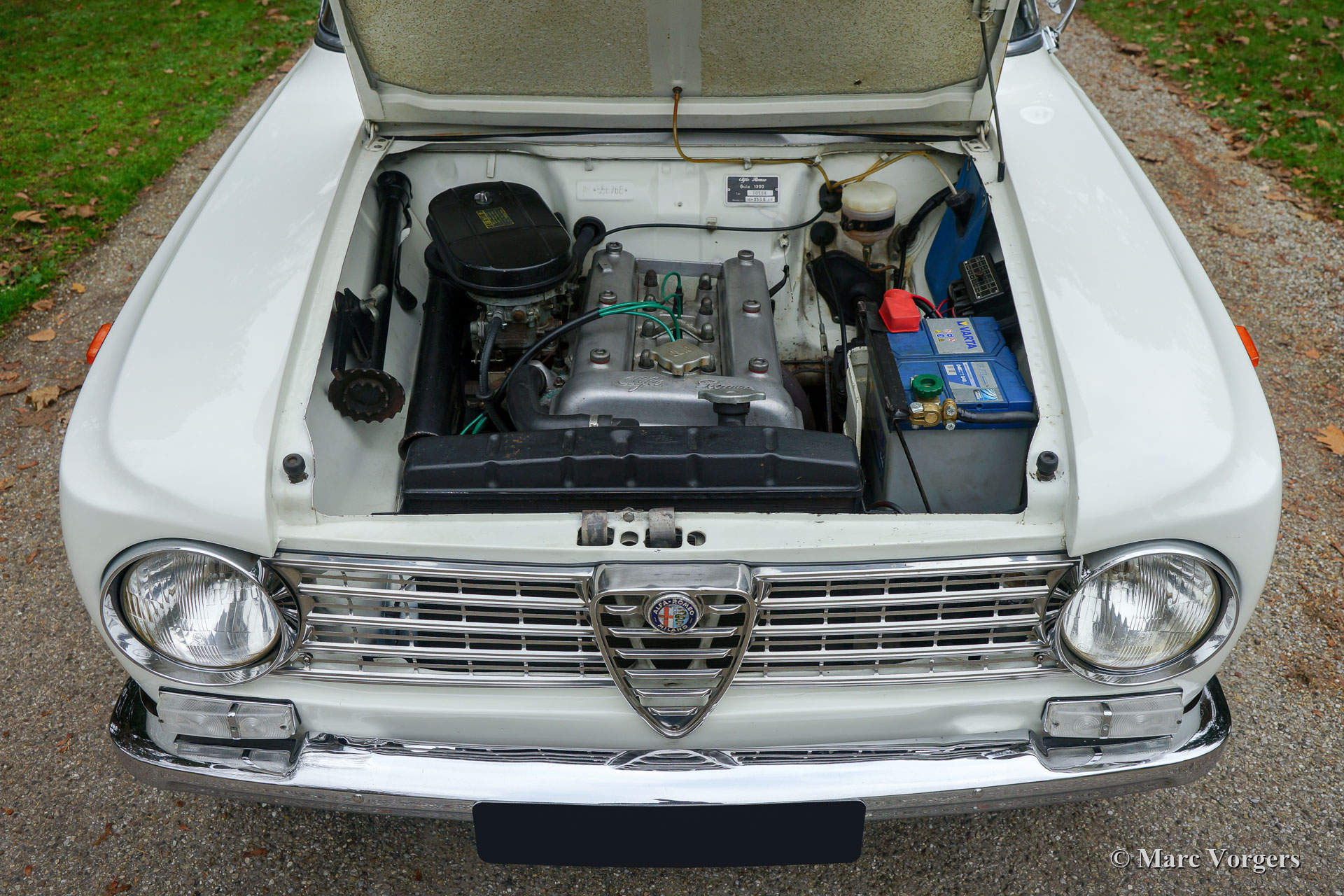 Alfa Romeo Giulia 1300, year 1964. Colour Bianco Spino (White) combined with a black interior with light-grey cloth seat faces. This gorgeous Alfa Romeo Giulia is a very original early example in very good condition! In recent years the engine and the carburettors were overhauled, and the shock dampers were renewed all-round. The car was given new paint a couple of years ago. The interior is fully original and in wonderful condition. The cloth seat-faces show signs of age. This beautiful Alfa Romeo Giulia 1300 shows all the original details and the car drives perfectly!