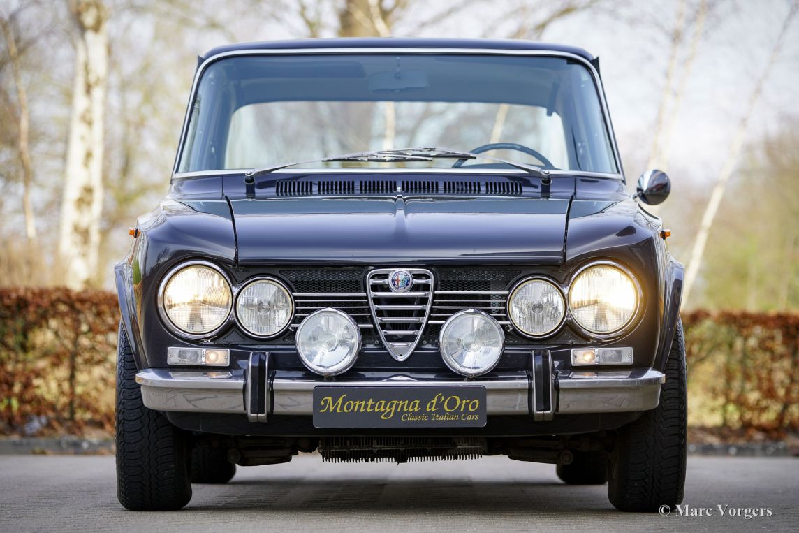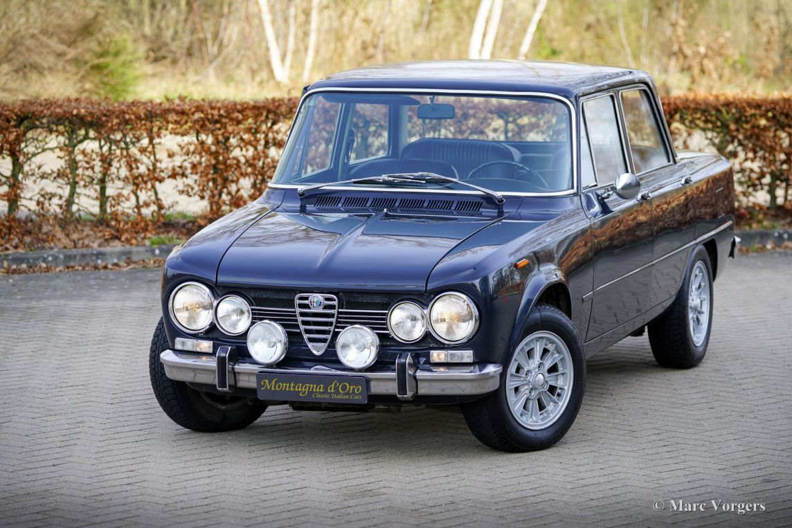 Alfa Romeo Giulia 1300 TI, year 1969. Chassis (VIN) number AR10539*1070104*, engine number AR00539*62659*. Body colour dark grey (Antracite Inglese AR 736) combined with a black leatherette interior and anthracite (dark grey) carpet. This wonderful Alfa Romeo Giulia is in a wonderful and very good original condition. The bodywork was beautifully repainted in the original colour. The interior is fully original and in a very good condition with only slight signs of previous use. The black door cards, which show some wear at the bottom edge, will be replaced by perfect examples. Montagna d’Oro have sold this beauty nine years ago (February 2017) and the car has now been traded in. The odometer currently shows 83.434 kilometres, and this fine Alfa Romeo comes with an impeccable yearly service history. In the late 1960s, the Alfa Romeo Giulia was a roomy and very desirable sports sedan fitted with servo assisted disc brakes, an aluminium four-cylinder engine with twin overhead camshafts, a 5- speed gearbox, and all the gauges on the dashboard the sporty driver would desire. This is a very original and great looking example fitted with wonderful period correct SEV Marchal 662 Halogen spot lamps, beautiful Cromodora alloy wheels and K&N sports air filters on the twin choke Weber carburettors!