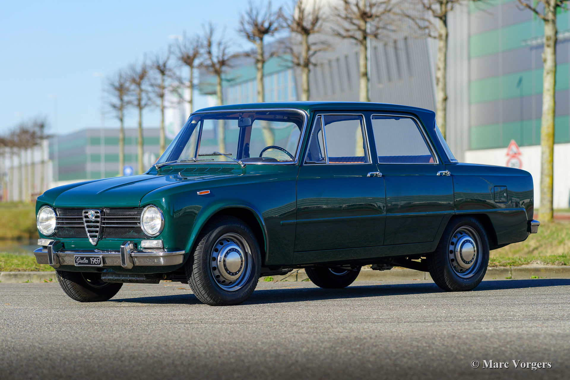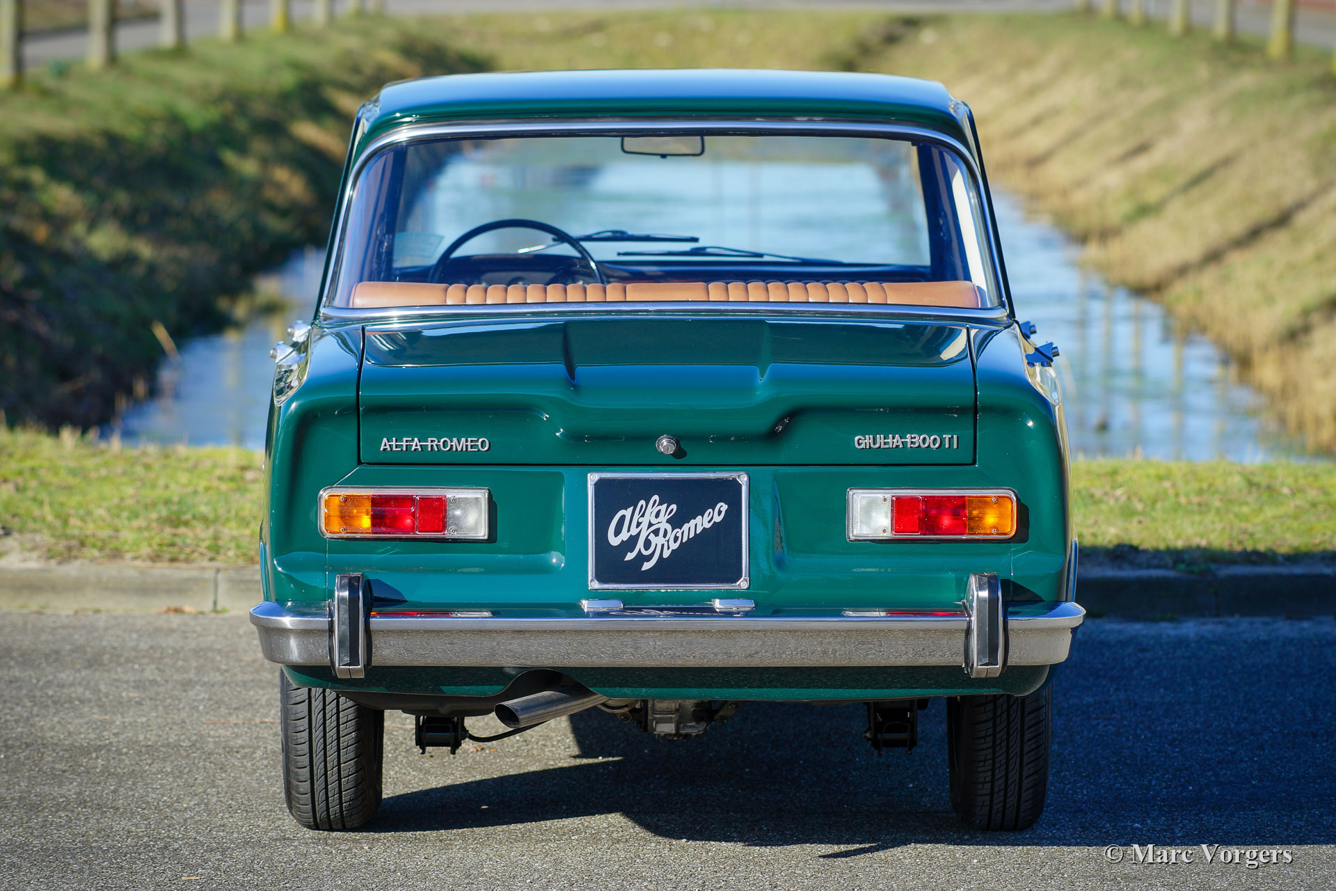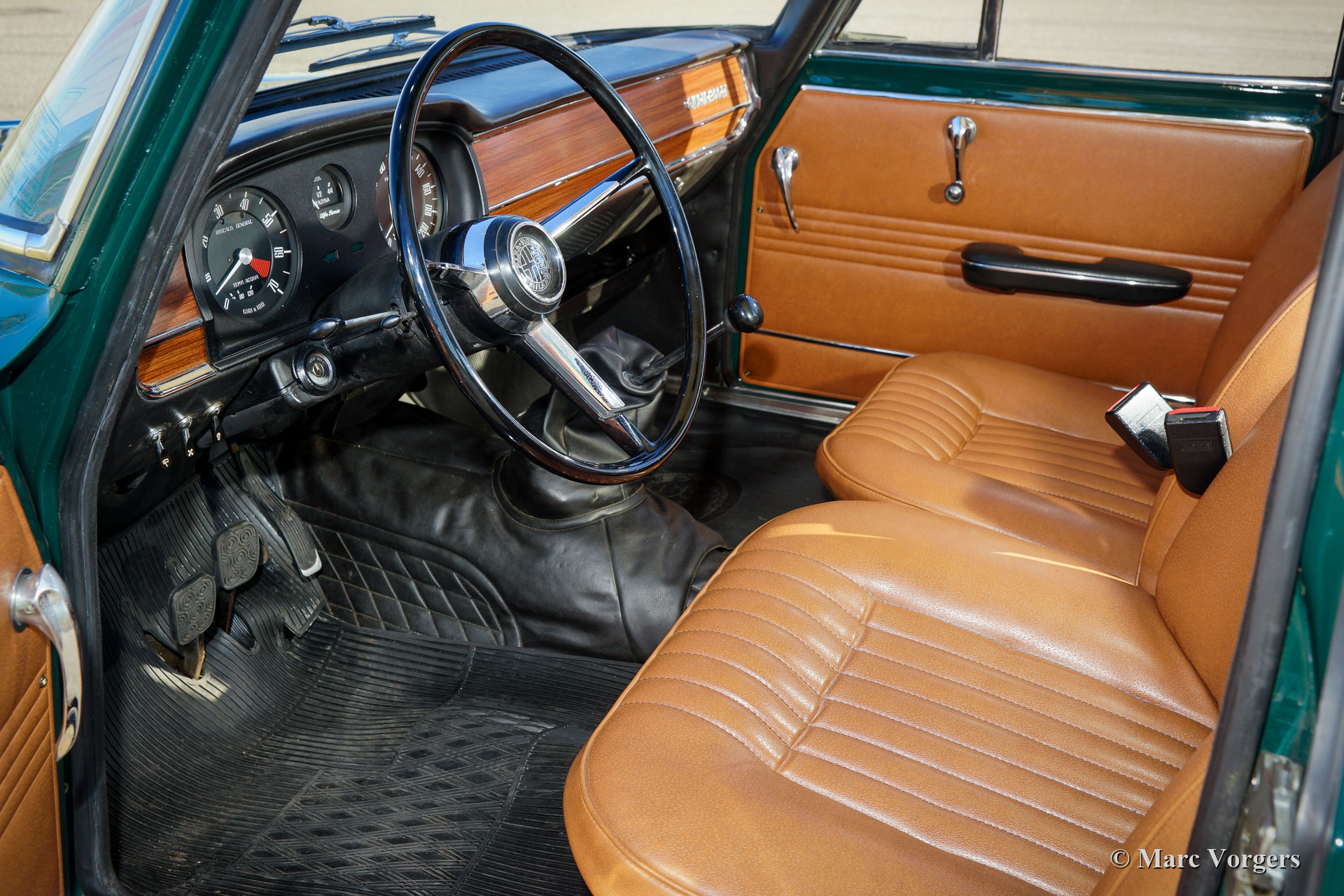 Alfa Romeo Giulia 1300 TI, year 1969. Colour dark green (Verde Muschio Chiaro) combined with a cognac brown (wild boar) leatherette interior and black rubber carpet. This wonderful Alfa Romeo Giulia was extensively restored with a good eye for originality. The bodywork is wonderful with a superb panel fit and excellent paint. The interior was newly upholstered with the correct leatherette on the seats in pale brown. The door panels were also renewed. The car was fitted with a new wiring loom, new rubbers and seals and a new exhaust. This beautiful Alfa Romeo 1300 TI is in excellent condition and the car drives perfectly. In the late 1960s, the Alfa Romeo Giulia was a roomy sports sedan fitted with servo assisted disc brakes, an aluminium four-cylinder engine with twin overhead camshafts, a 5- speed gearbox, and all the gauges on the dashboard the sporty driver would desire. This is a very desirable example, extensively restored and still showing all the original details!