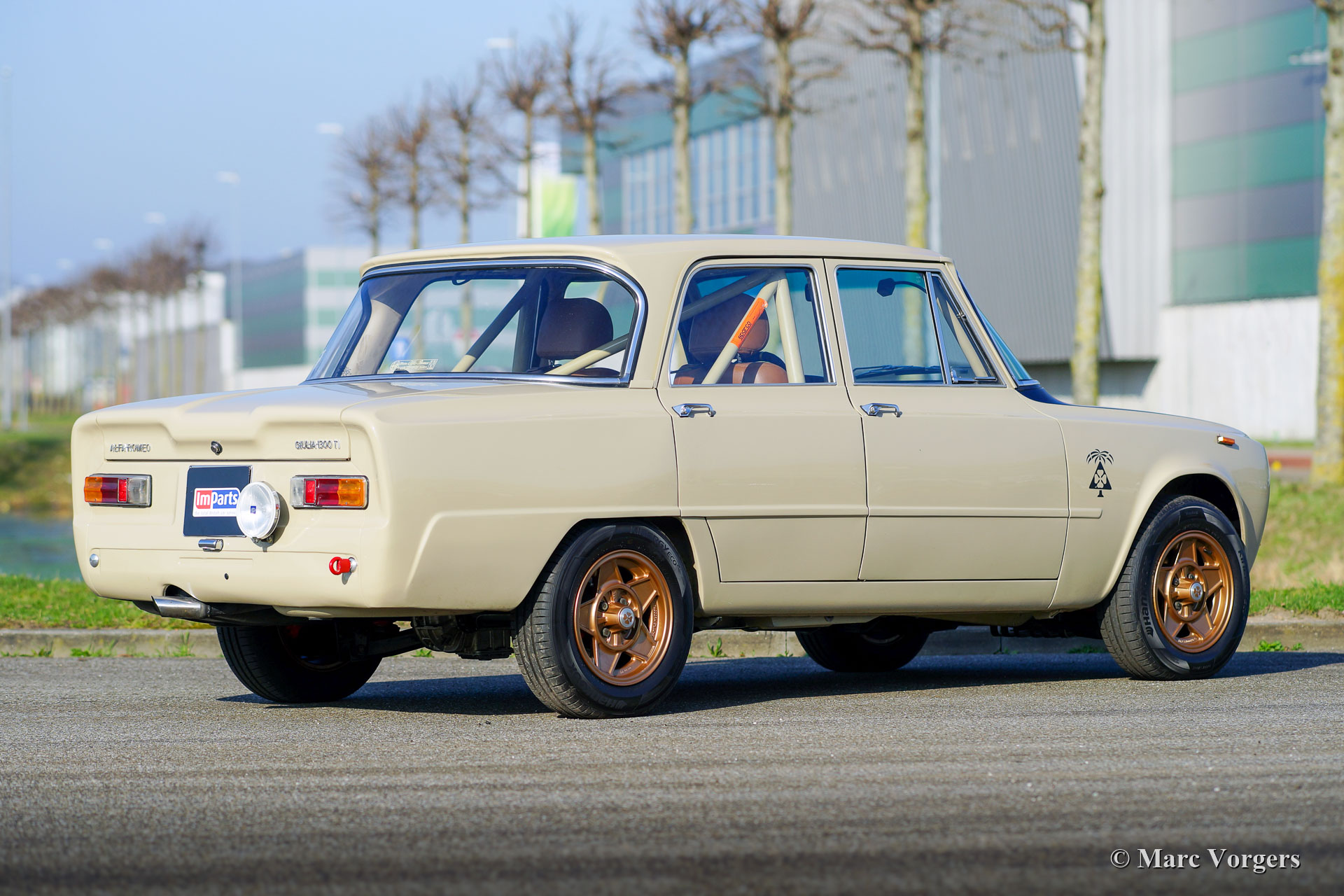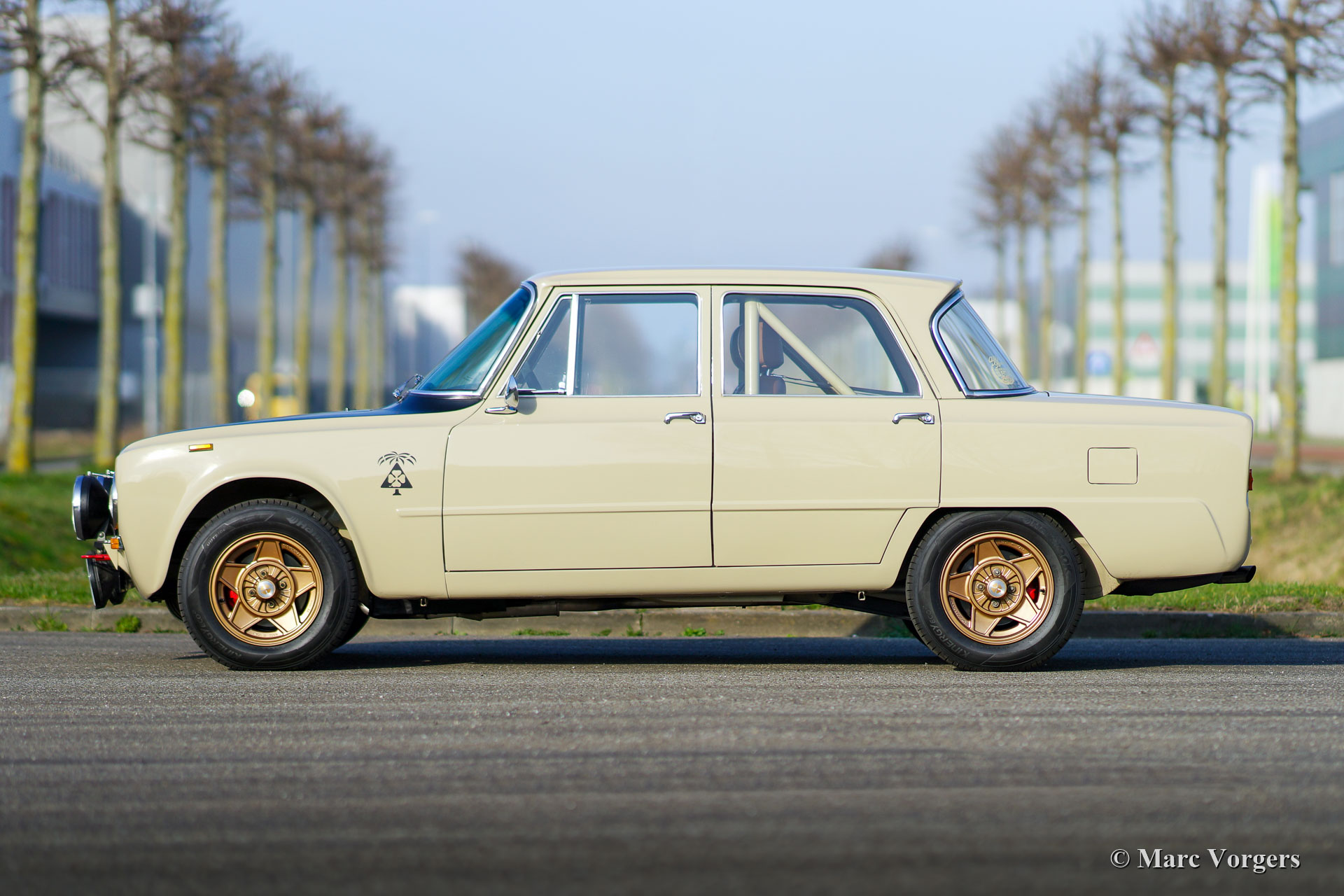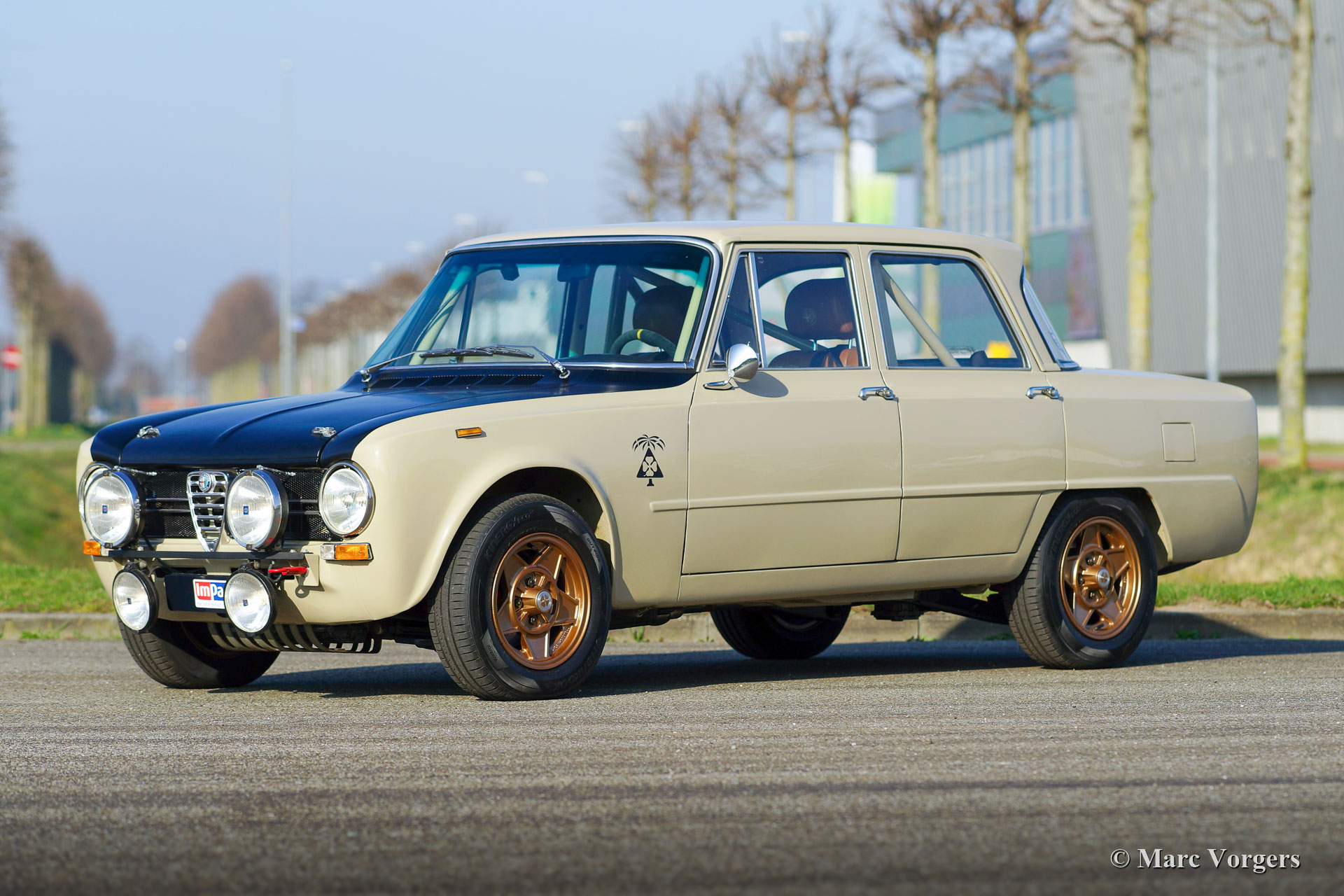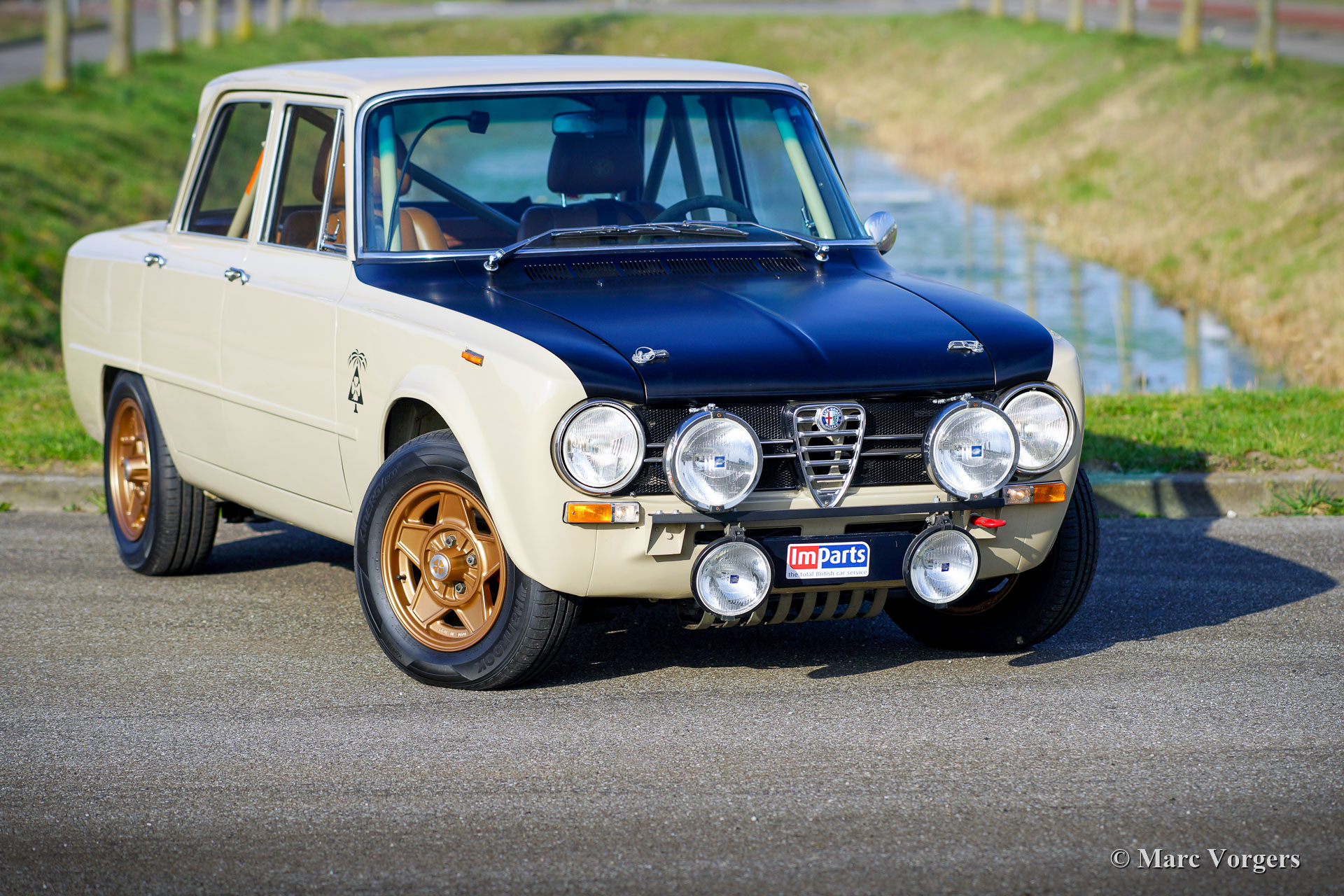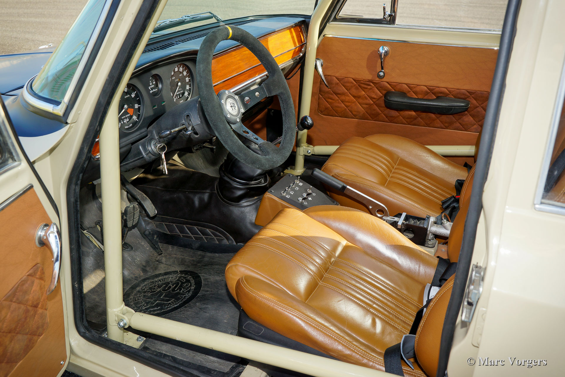 Alfa Romeo Giulia 1300 TI Rally Car, year 1969. Colour Cava (sand-beige) combined with a pale brown leather / leathercloth interior. This fabulous Alfa Romeo Giulia rally car was extensively restored. The car was beautifully rebuilt and prepared as a competitive historic rally car. The bodywork was restored and painted all round and inside and out. The interior was superbly upholstered with eye for details. The 1300 engine was replaced by fully overhauled and tuned 2 Litre unit fitted with fast-road camshafts, higher compression, twin choke carburettors, a sport air-filter, and electronic ignition. The 5-speed gearbox was also fully rebuilt. The wiring loom was renewed and optimised for rally purposes. This Alfa Romeo rally car is in an excellent condition and the car drives perfectly! (Sporty and still comfortable, not hard core.) The rally car features special sports seats with 4-point Sparco safety harnesses, a Sparco roll-cage, a Brantz rally tripmeter, a sump protector plate, Hella 2000 spot lamps, Hella wide beam cornering lamps, a Hella backup lamp, and wonderful bronze painted Cromodora alloy wheels. This is a very desirable Alfa Romeo rally car which was built to perfection. This machine is ready for every (rally) adventure in the hands of a new owner!