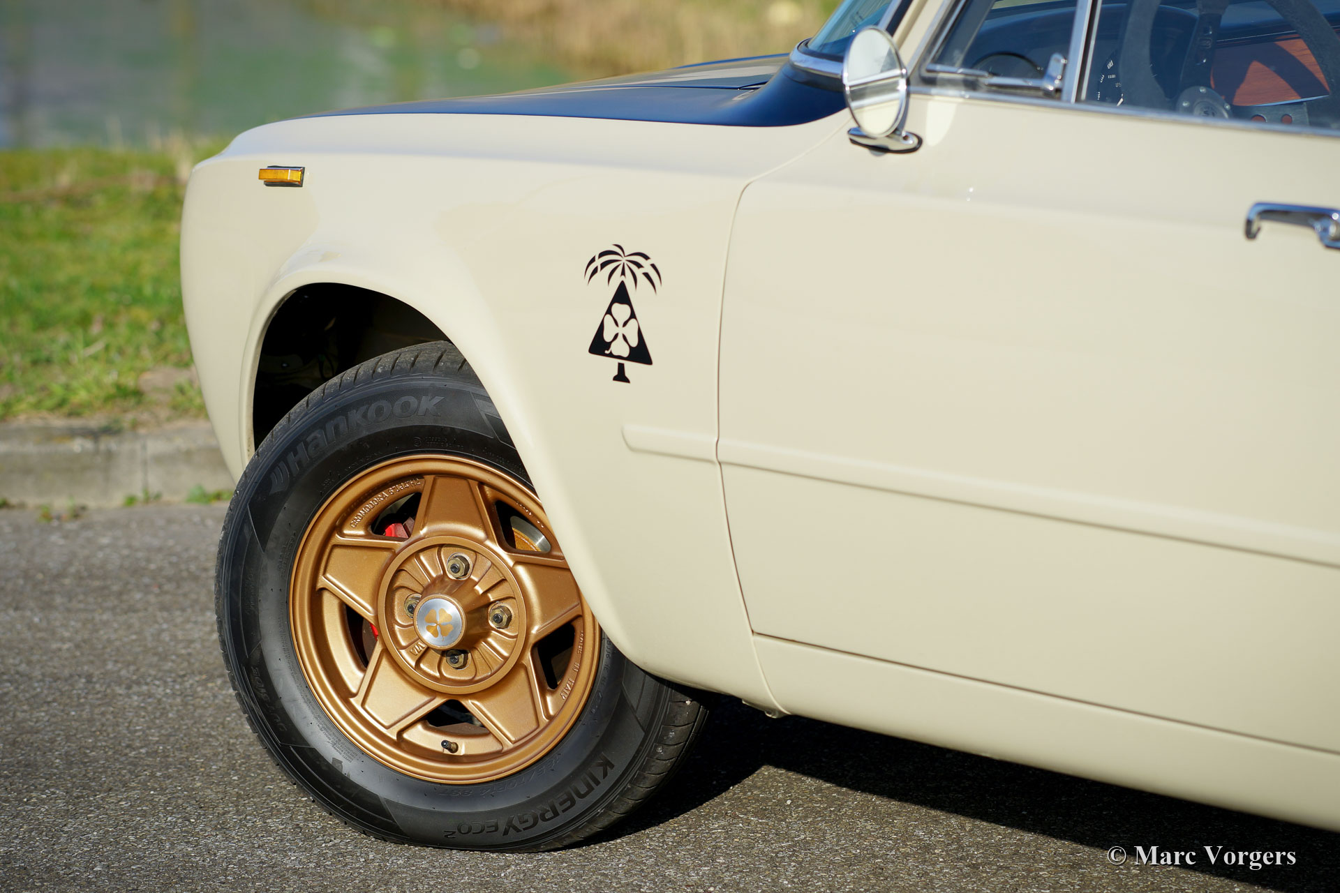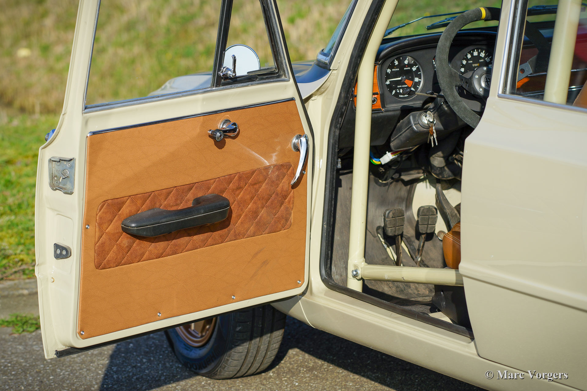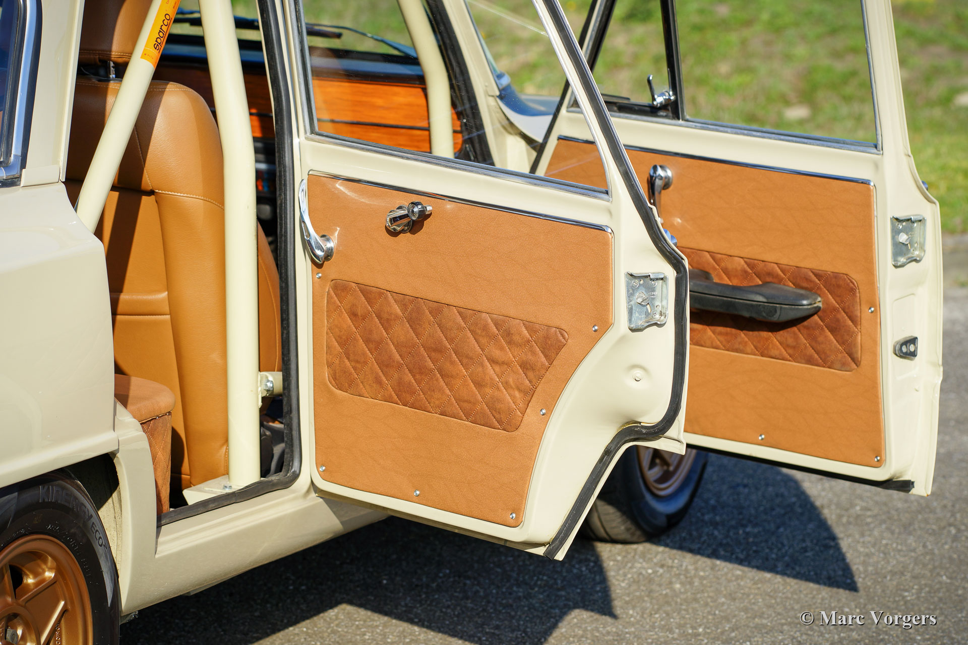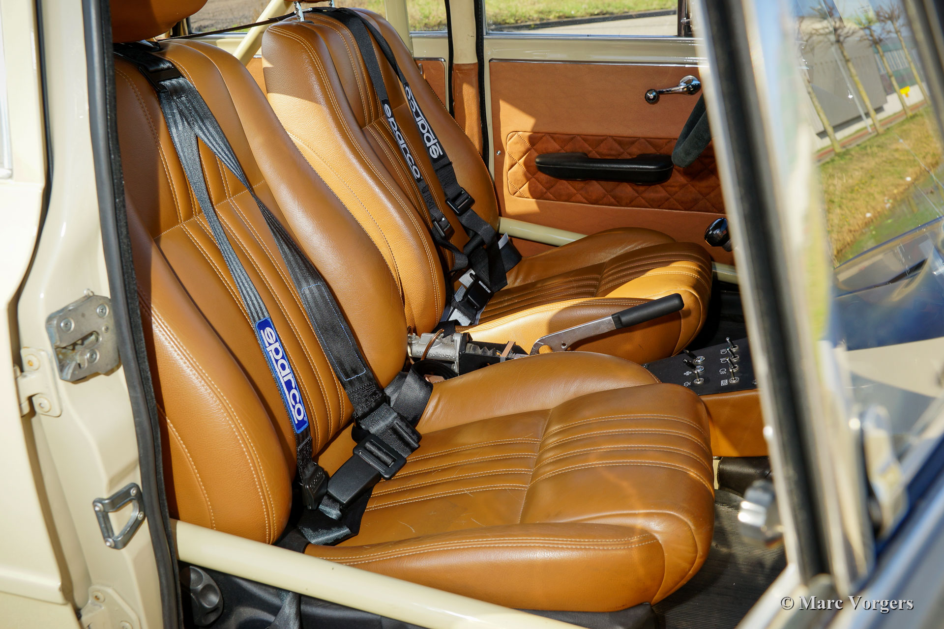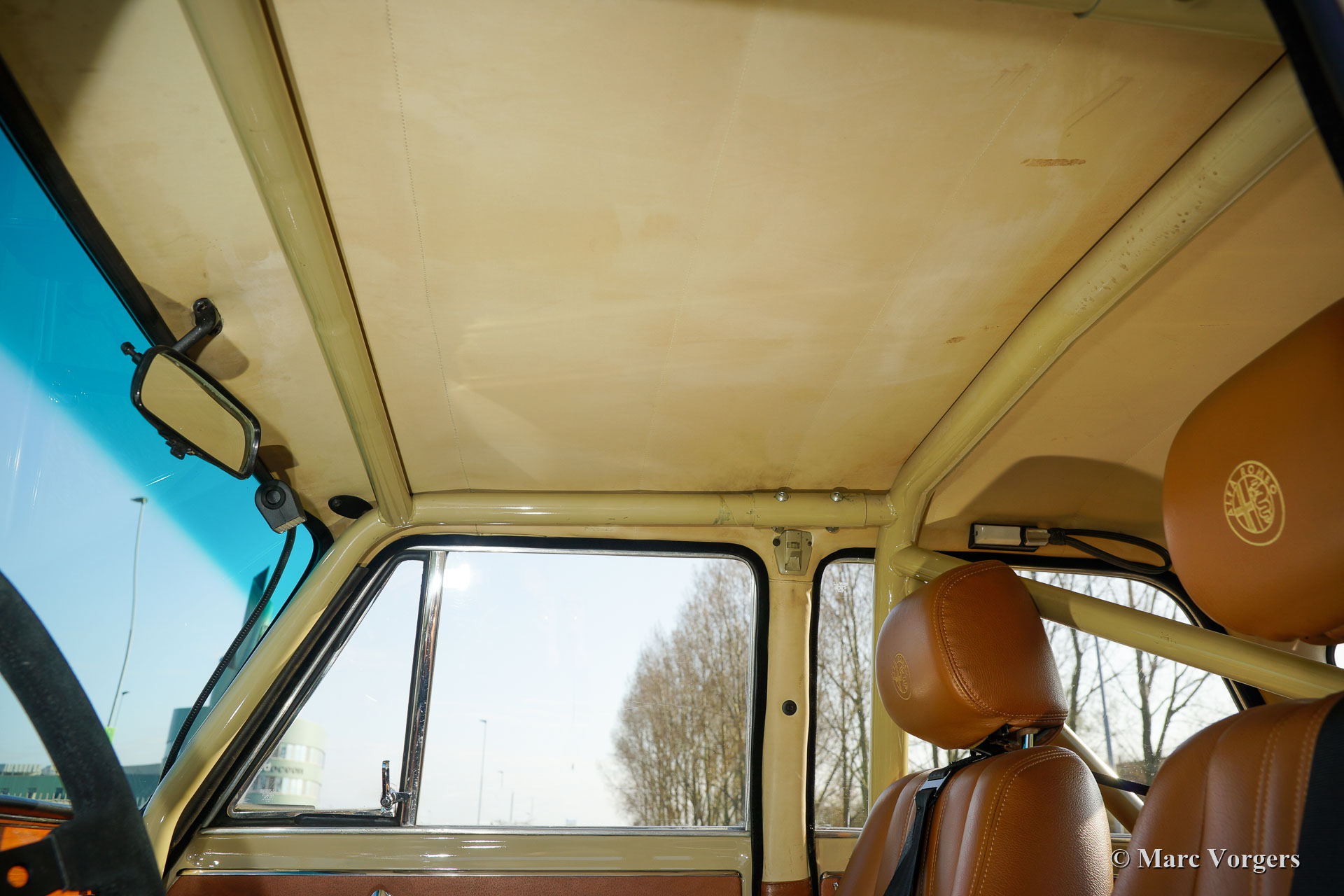 Alfa Romeo Giulia 1300 TI Rally Car, year 1969. Colour Cava (sand-beige) combined with a pale brown leather / leathercloth interior. This fabulous Alfa Romeo Giulia rally car was extensively restored. The car was beautifully rebuilt and prepared as a competitive historic rally car. The bodywork was restored and painted all round and inside and out. The interior was superbly upholstered with eye for details. The 1300 engine was replaced by fully overhauled and tuned 2 Litre unit fitted with fast-road camshafts, higher compression, twin choke carburettors, a sport air-filter, and electronic ignition. The 5-speed gearbox was also fully rebuilt. The wiring loom was renewed and optimised for rally purposes. This Alfa Romeo rally car is in an excellent condition and the car drives perfectly! (Sporty and still comfortable, not hard core.) The rally car features special sports seats with 4-point Sparco safety harnesses, a Sparco roll-cage, a Brantz rally tripmeter, a sump protector plate, Hella 2000 spot lamps, Hella wide beam cornering lamps, a Hella backup lamp, and wonderful bronze painted Cromodora alloy wheels. This is a very desirable Alfa Romeo rally car which was built to perfection. This machine is ready for every (rally) adventure in the hands of a new owner!