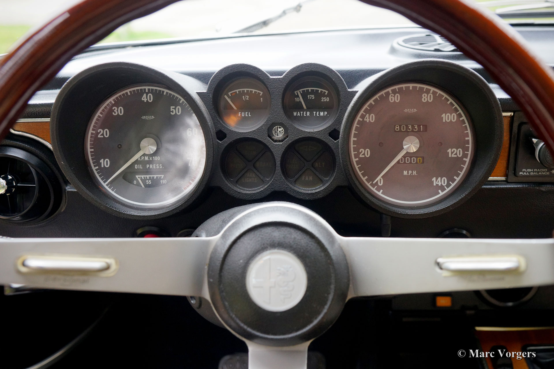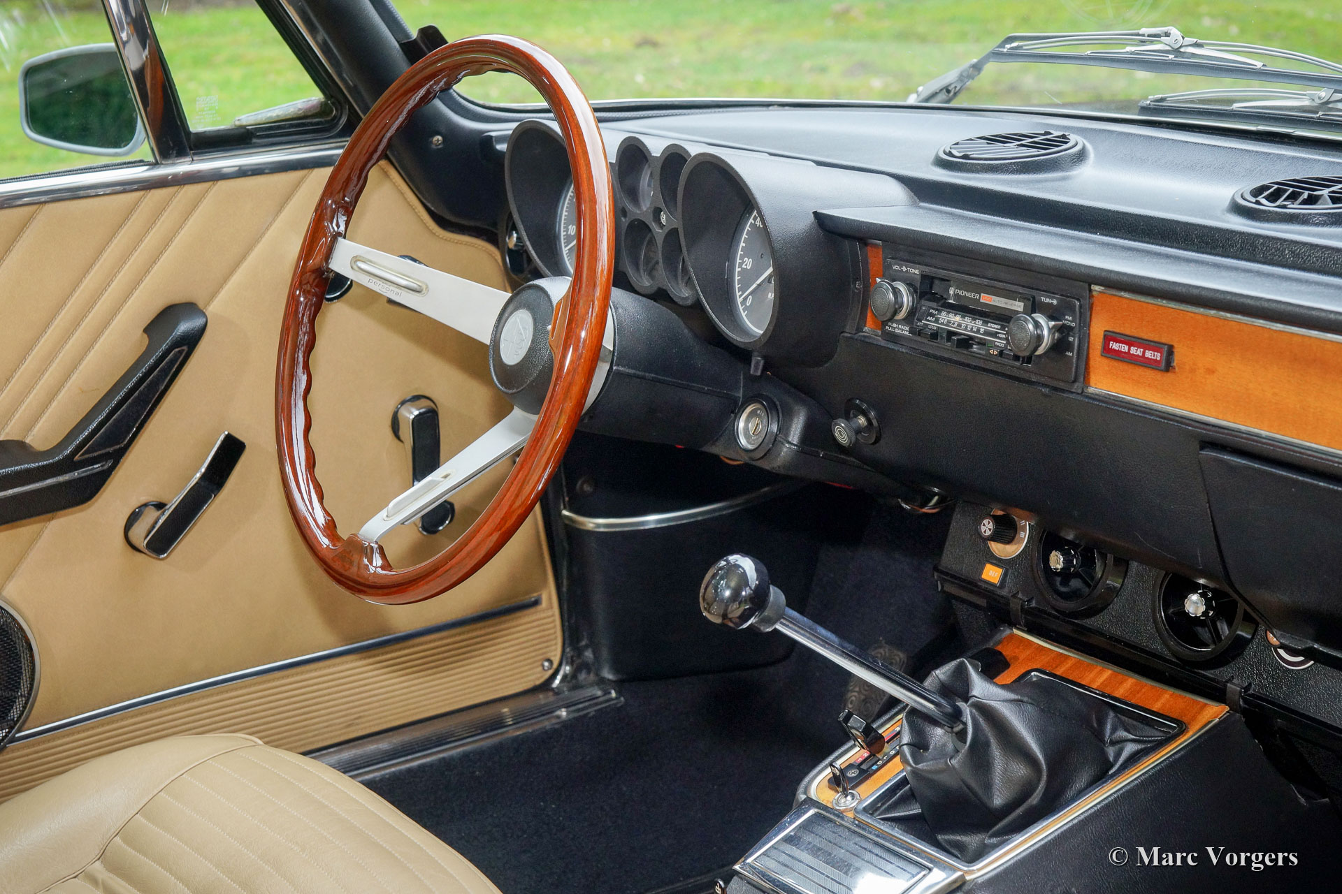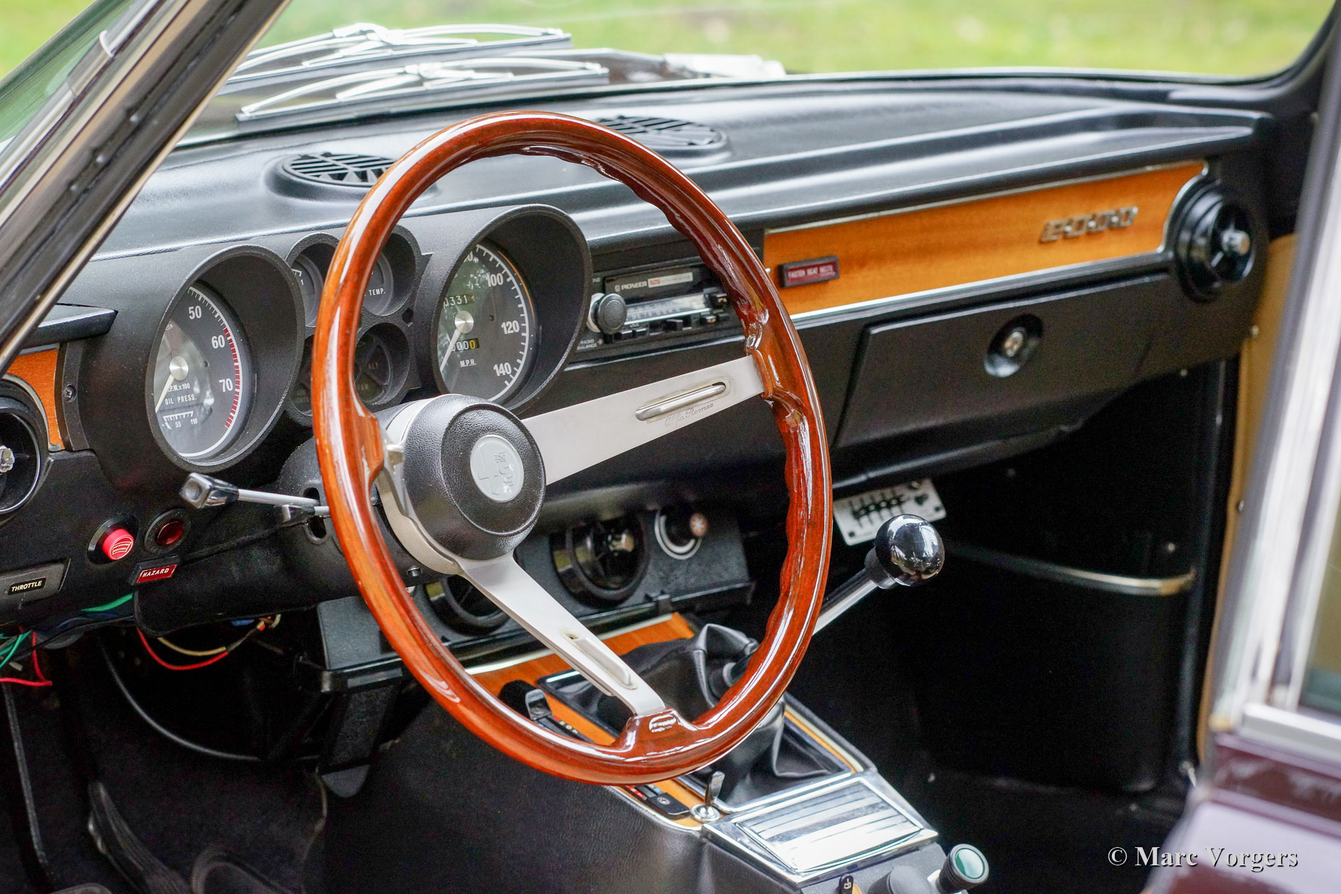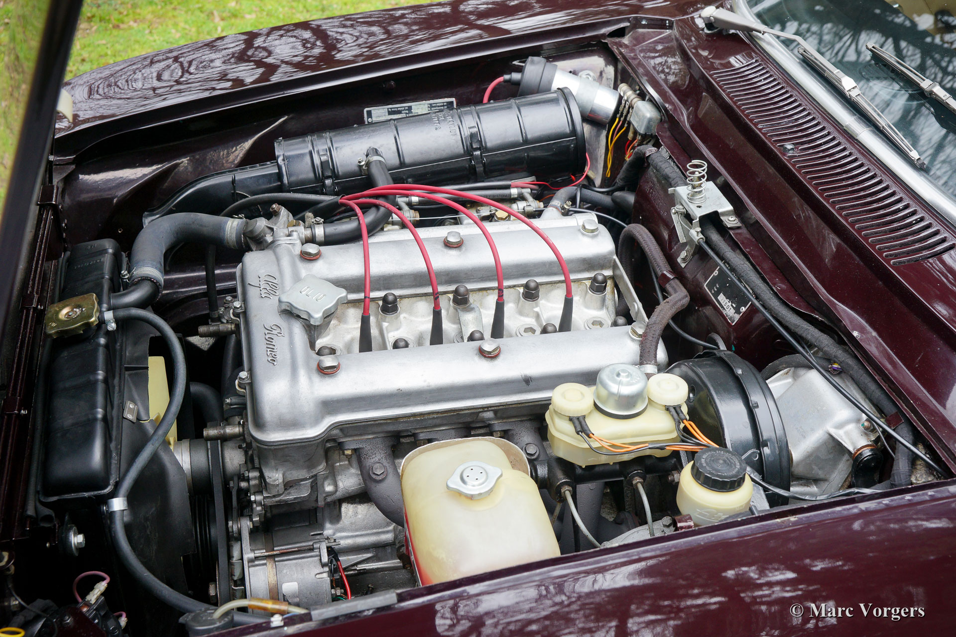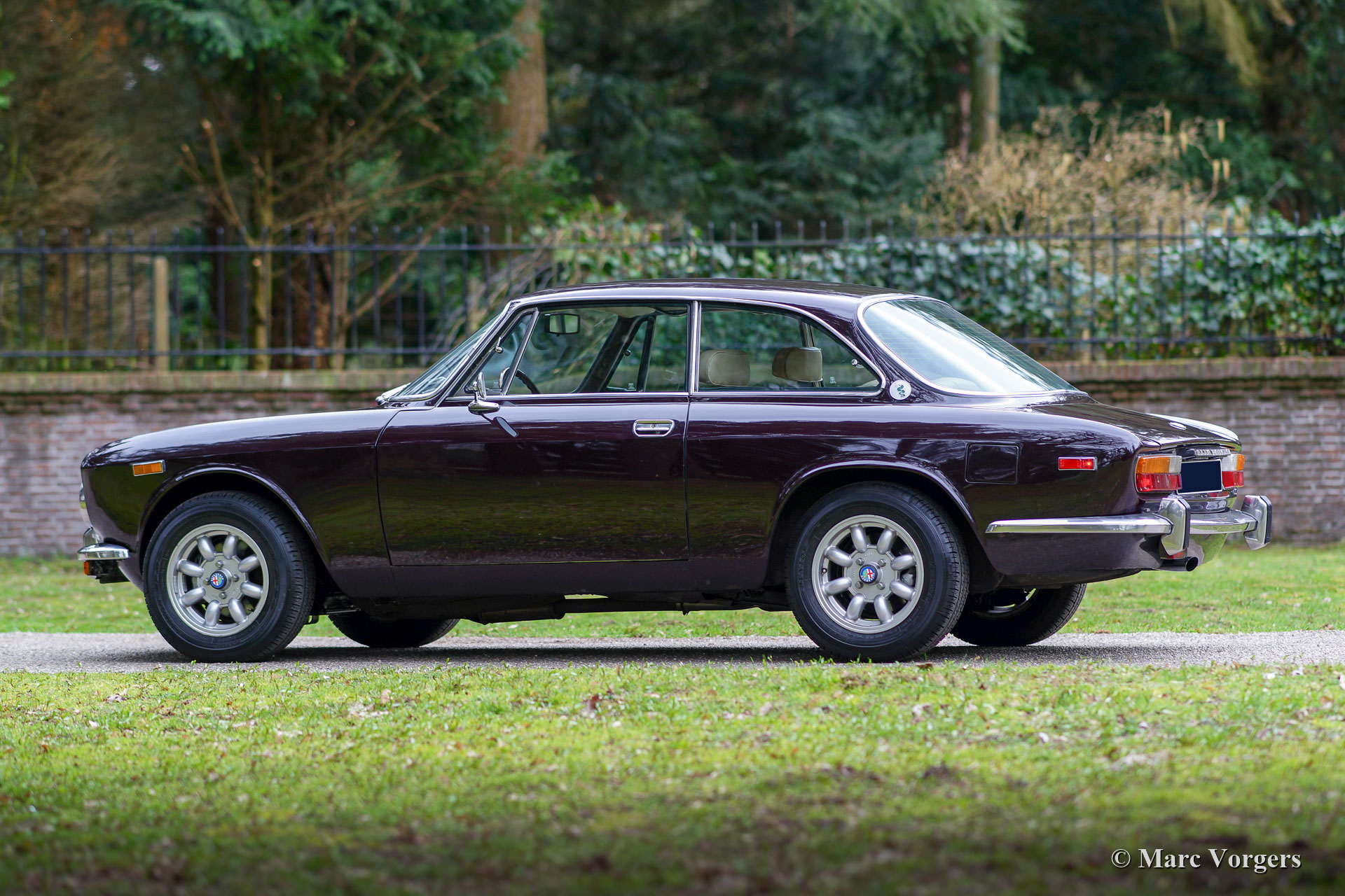 Alfa Romeo Giulia 2000 GTV, year 1975. Colour Faggio (very dark red / brown) combined with a beige leathercloth interior and black carpet. This gorgeous Alfa Romeo ‘Bertone’ was sold new to a German military man in Hamburg. This US model Giulia GTV 2000 was never exported to the USA and the car was fitted with twin double Dell’Orto carburettors instead of Spica petrol injection. This wonderful Alfa Romeo was extensively restored. The automobile is in excellent condition and the car drives perfectly! This Giulia GTV shows beautiful original details and the car features ‘GB’ Minilite style alloy wheels. The 1960s and 1970s Alfa Romeo Giulia cars featured all the hallmarks of the true sports car: an aluminum engine with double overhead camshafts (DOHC), hemispherical combustion chambers, sodium filled / cooled exhaust valves, a five-speed manually operated gearbox and disc brakes all round. The 2000 GTV was also fitted with a limited slip differential to get the 150 SAE bhp on the road properly. This is a very desirable Alfa Romeo Giulia 2000 GTV!