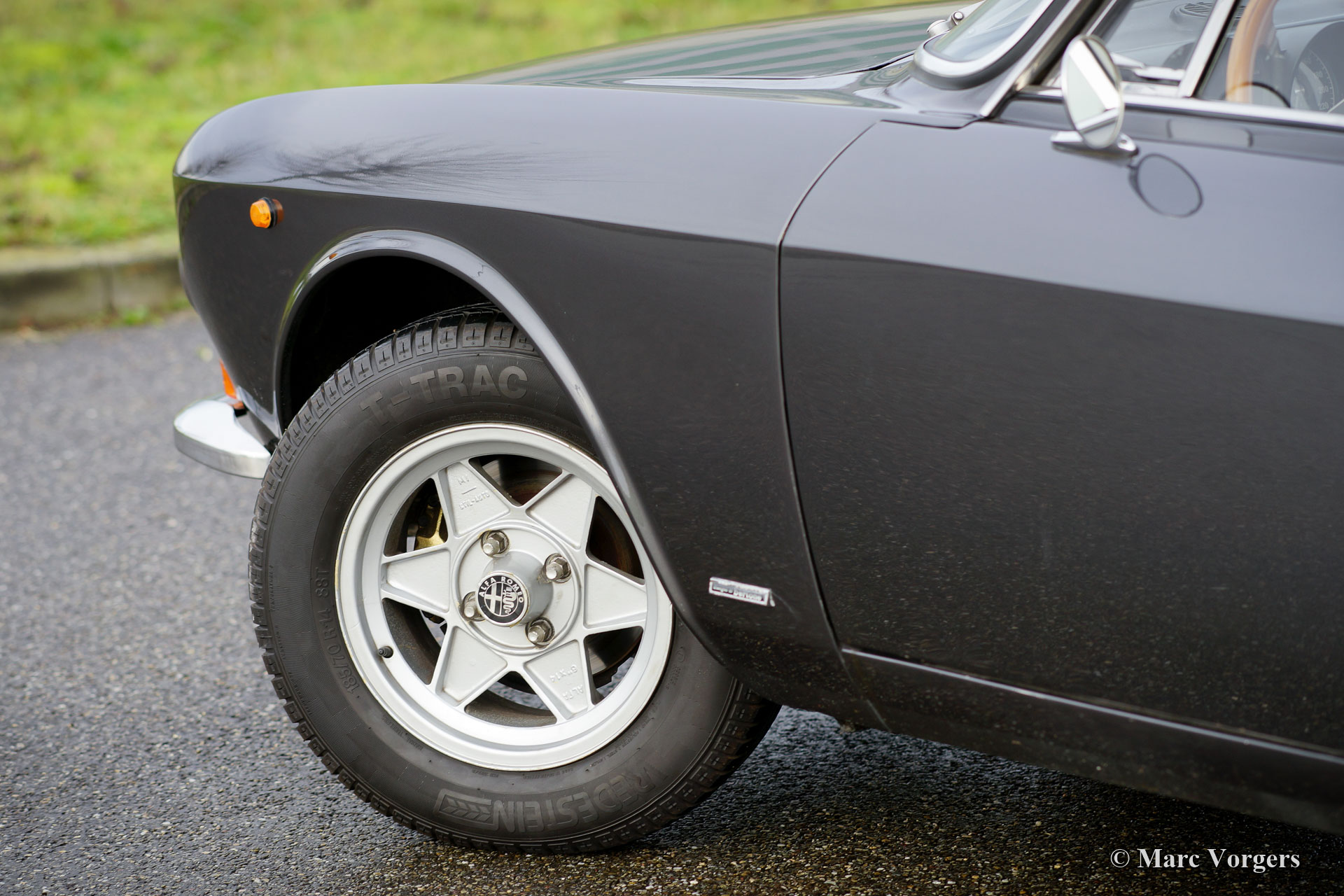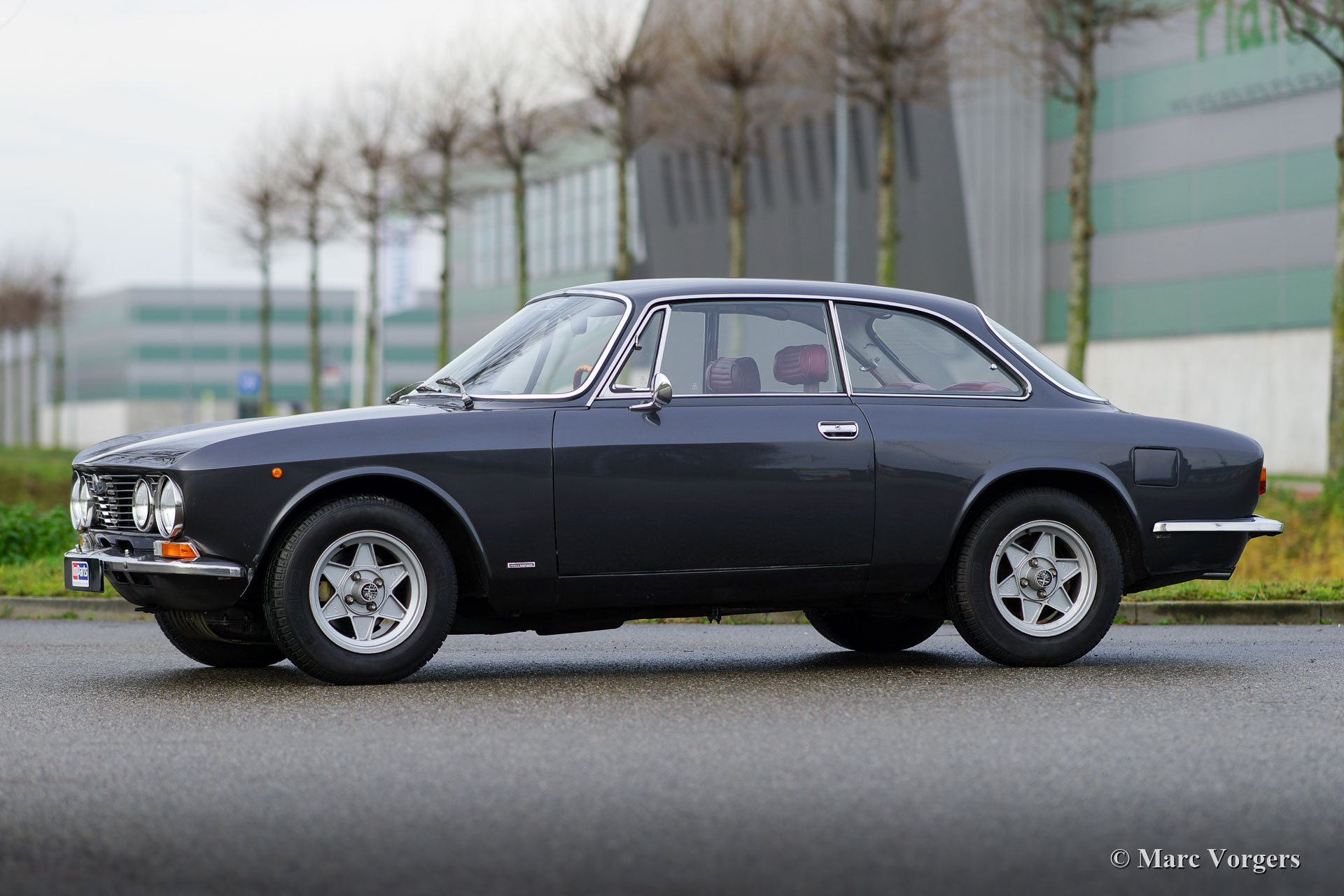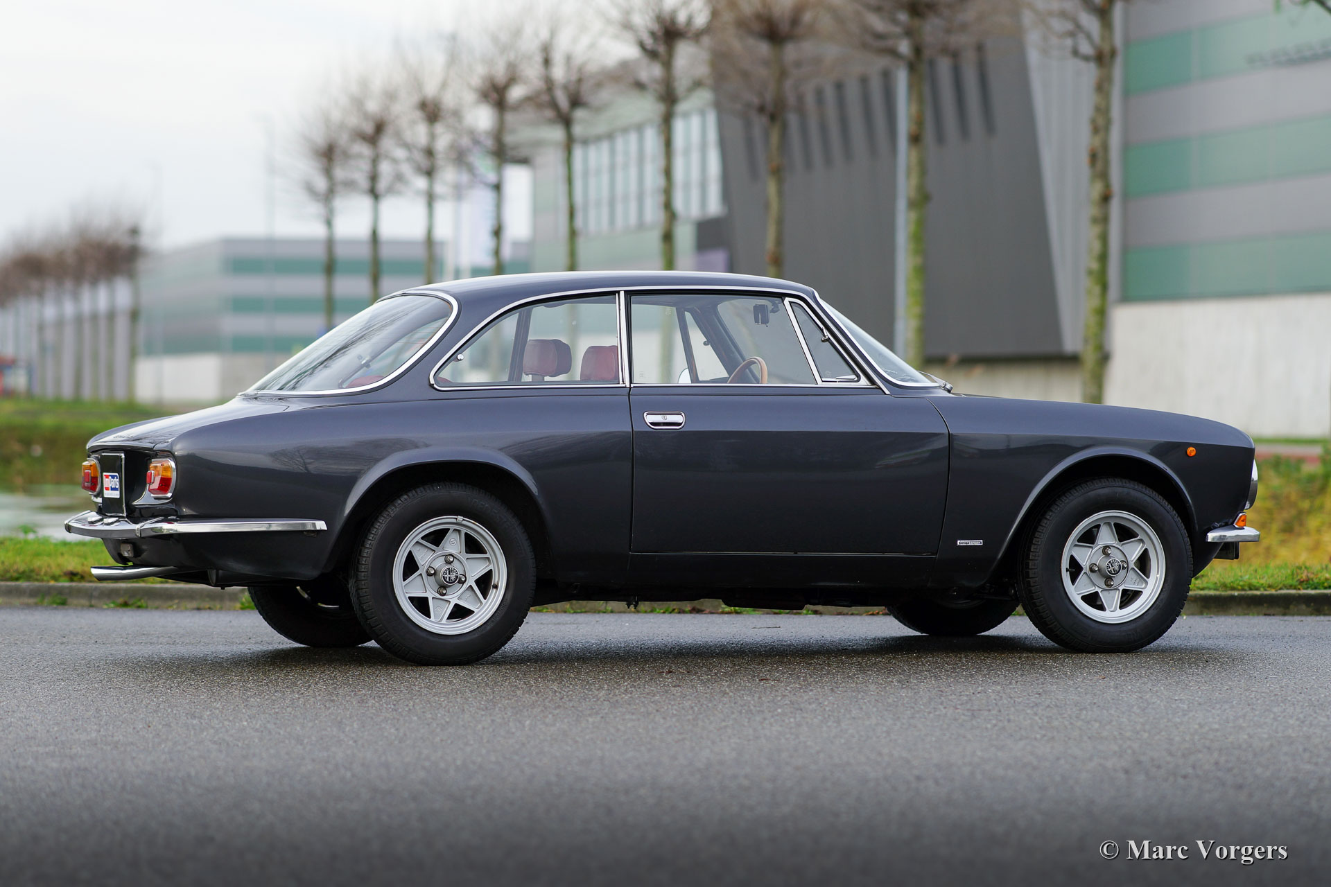 Alfa Romeo Giulia GT 1300 Junior ‘Lusso’, year 1975. Colour dark grey metallic combined with a dark red leather interior and black carpet. This fine Alfa Romeo GT 1300 Junior is the final ‘lusso’ (luxury) version of the GT 1300. It features design details from the GTV 2000 like the chrome grille with quad headlamps, the dashboard and the seats with headrests. The automobile is in very good condition! Recently we have improved the car mechanically. The brake system was overhauled, and the clutch was renewed. The car is ready for every new adventure in the hands of a new owner. The Alfa Romeo Giulia was an advanced car back in the 1960s and early 1970s, the car features an aluminium four-cylinder engine with twin overhead camshafts and a five-speed manual gearbox. This car is fitted with beautiful ATS alloy wheels.