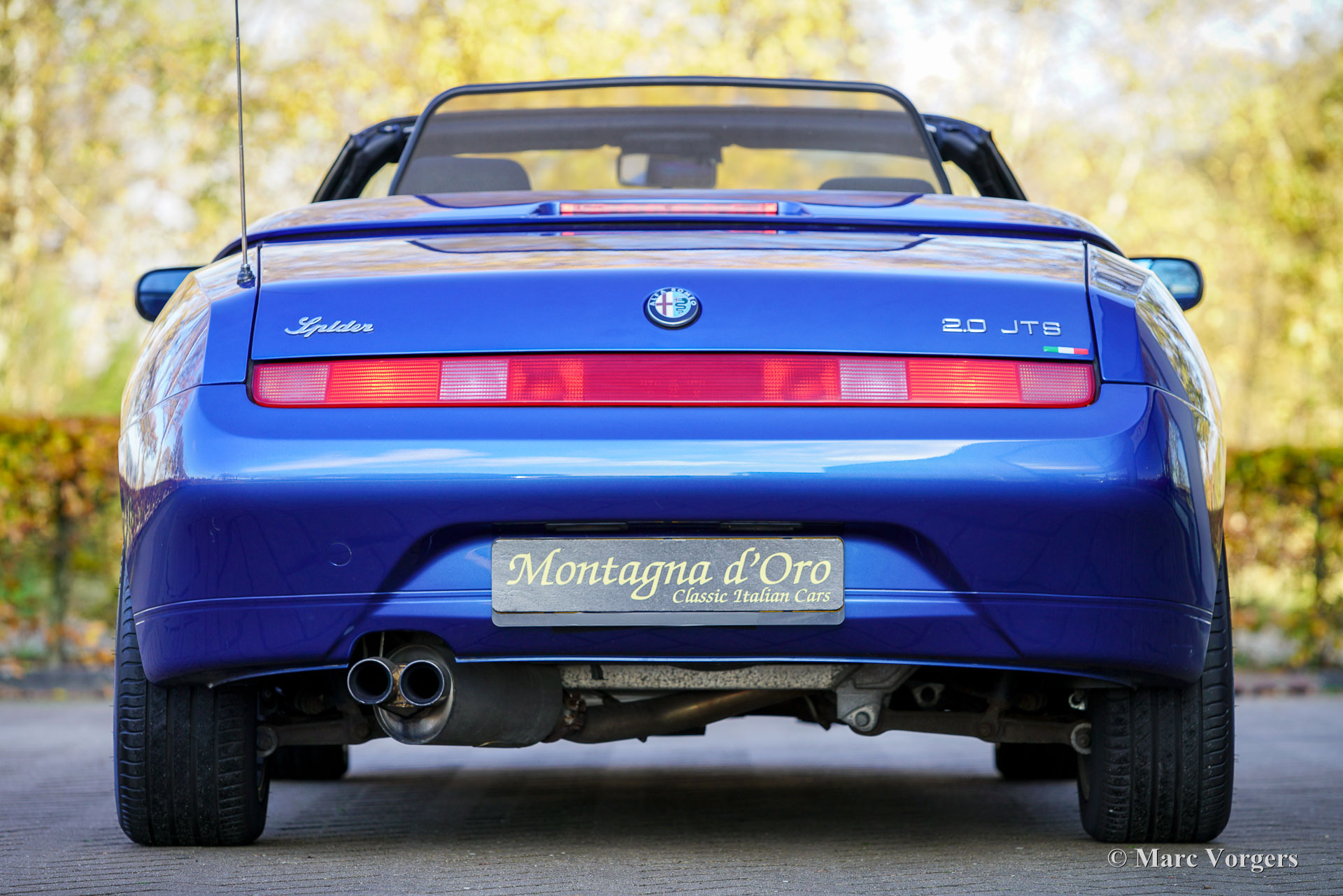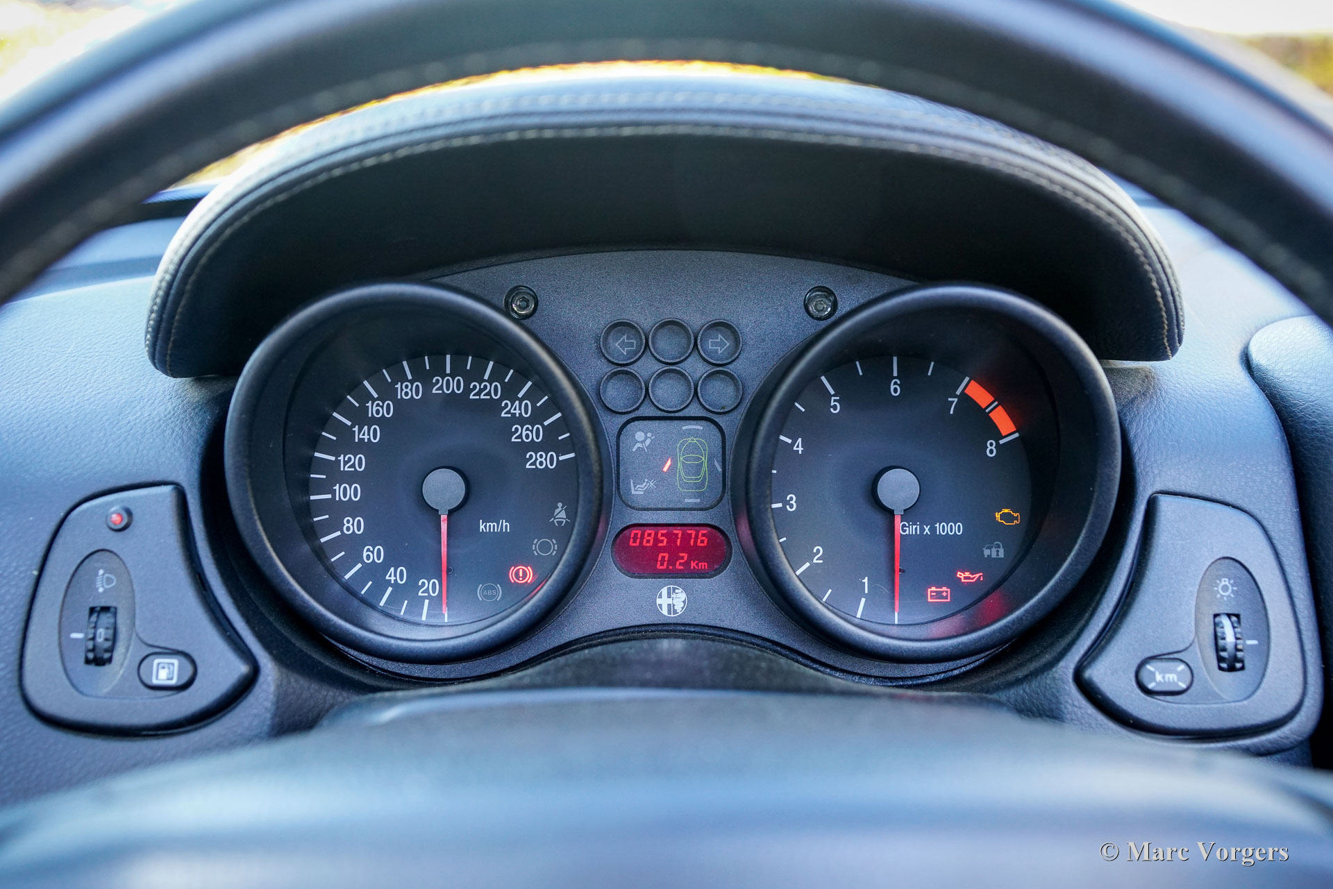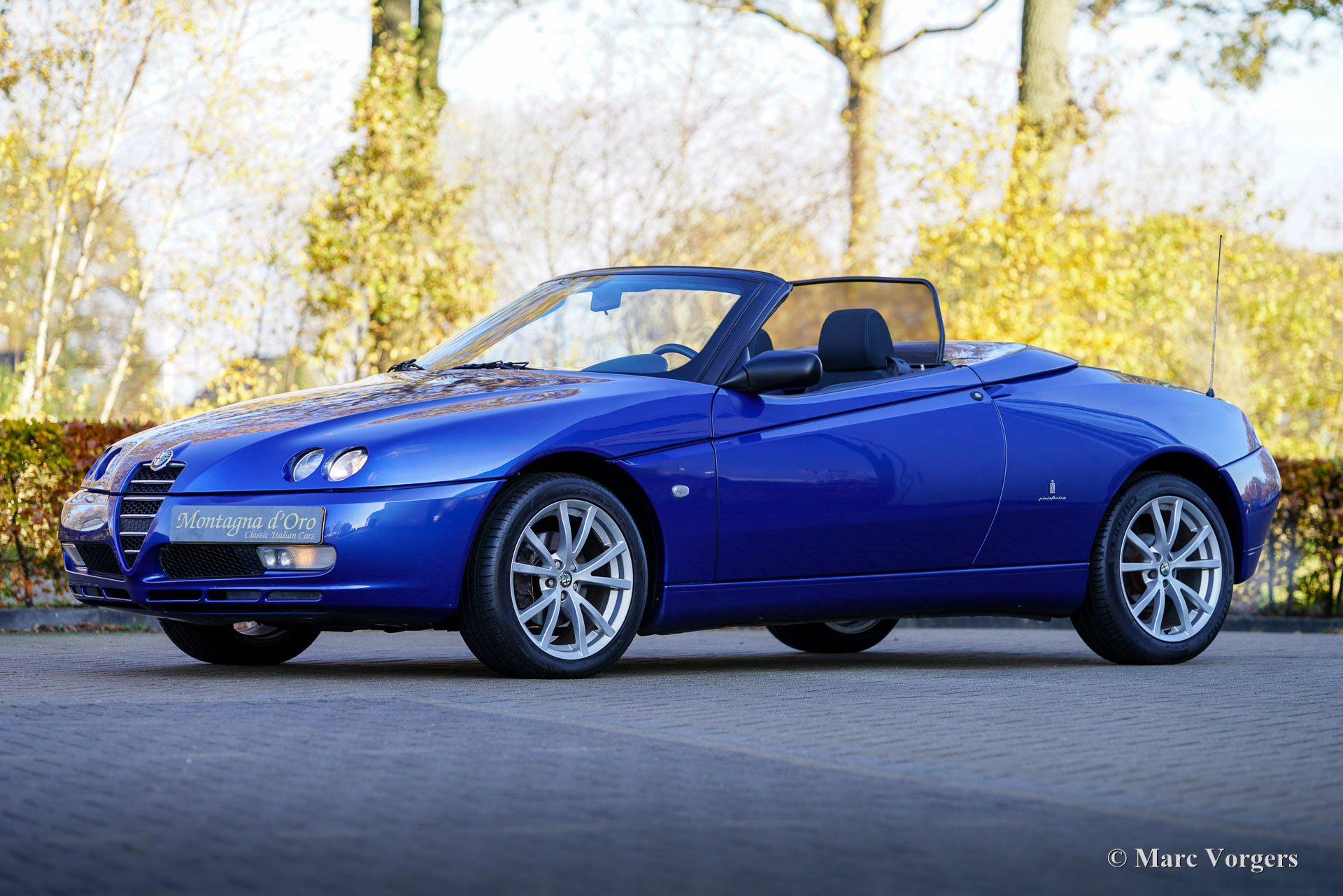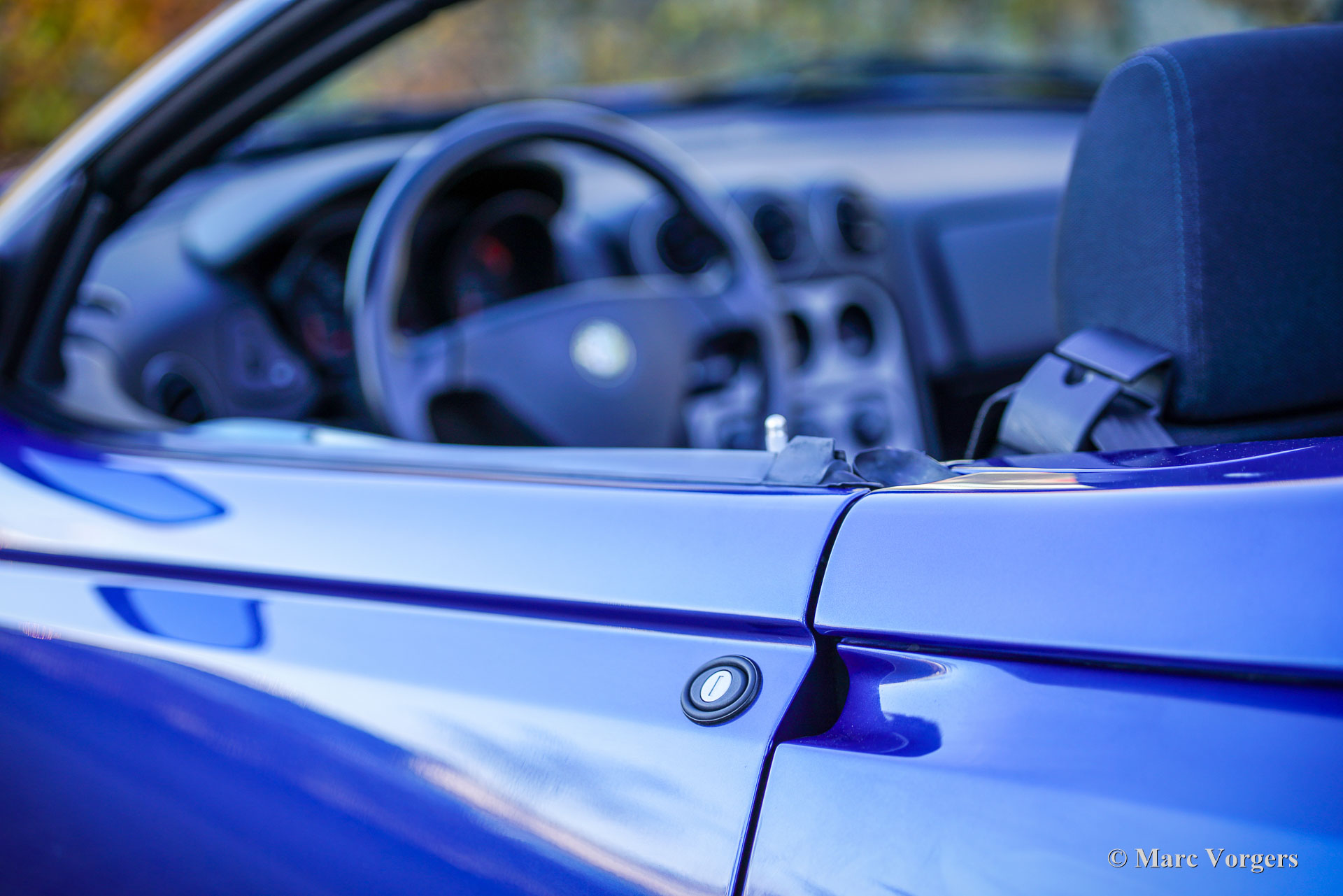 Alfa Romeo Spider 2.0 JTS, year 2005. Colour Blu Reims (Alfa Romeo code 254/A) combined with an anthracite with blue cloth interior. This wonderful Alfa Spider was sold new in Italy. In November 2006 the car was imported to the Netherlands by the first Dutch owner. In 2015 the car found a new owner who has cherished the car until the present day. In 2018, at 64.789 kilometres the timing belt and water pump were renewed. In 2023, at 79.996 kilometres, the car received a full service in which the timing belt was again renewed. Currently the odometer reads 85.758 kilometres. This wonderful alfa Romeo Spider is in a very good to excellent original condition and the car drives perfectly. The bodywork is pristine, the interior shows minor signs of previous use, and the hood is still original and in decent condition.