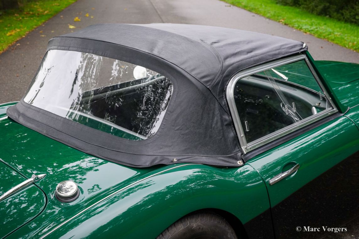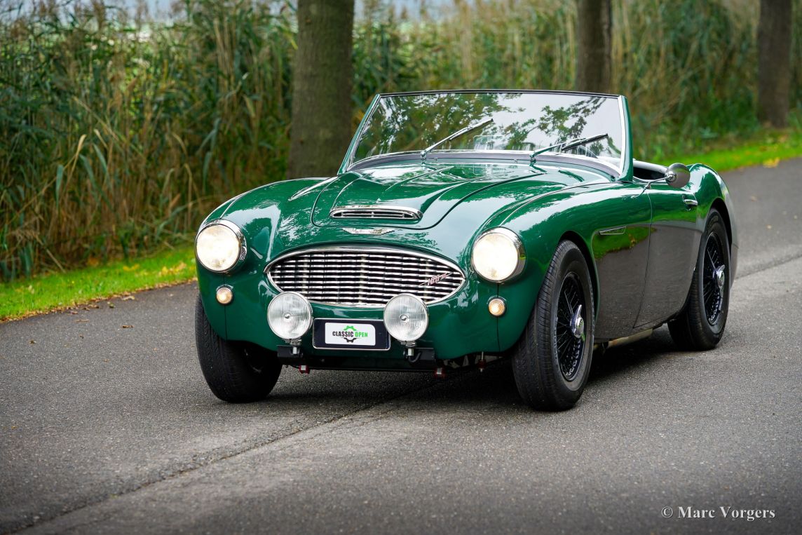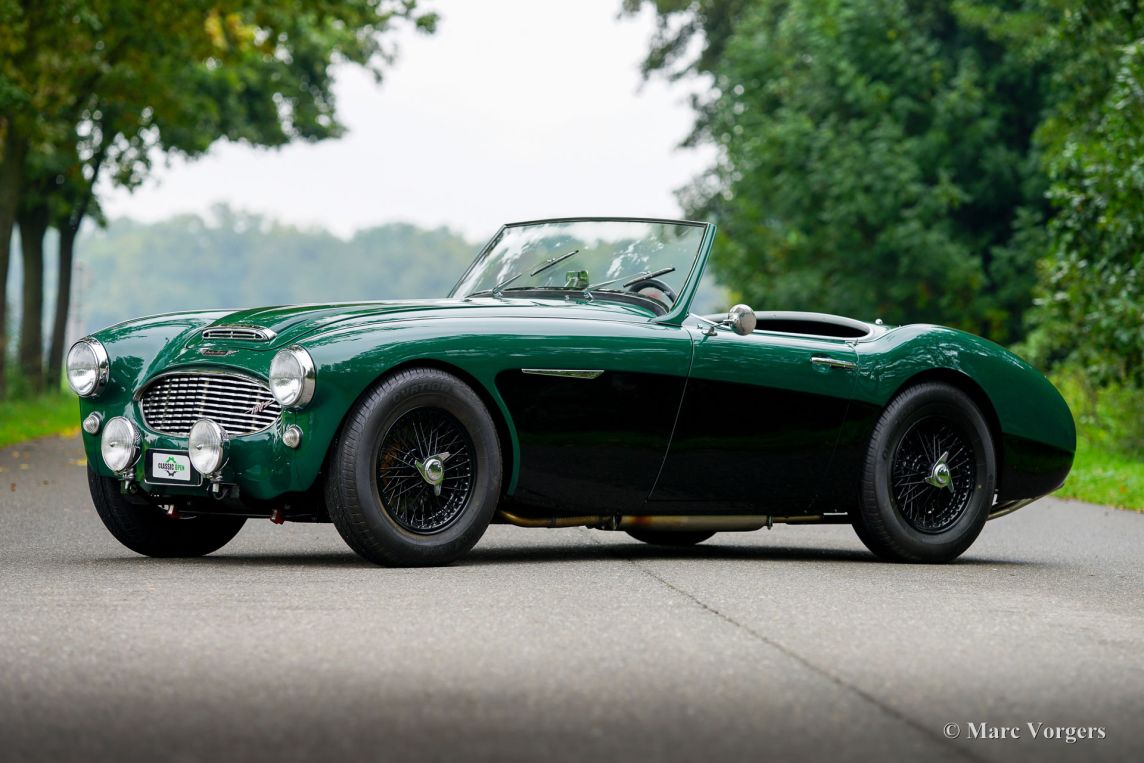 Austin Healey 100/6 (BN6) ‘two-seater’, year 1958. Body colour British Racing Green over black combined with a dark green leather interior trimmed with black piping and pale (suede) green carpet. Black vinyl soft-top and a black canvas tonneau cover. This fabulous ‘Big Healey’ was extensively restored and overhauled in the period 2020-2022. After completion of the restoration the car was driven sparsely. This fine Austin Healey 100 ‘SIX’ is in an excellent top condition and it drives perfectly! No matching numbers car (the engine was exchanged in the past) but a ‘big Healey’ which ticks all the boxes of desirability! It is a two-seater fitted with the engine of a 3000 Mk III, fitted with the big SU carburettors and a ‘centre-shift’ gearbox with overdrive. The car is also fitted with disc brakes at the front wheels, an alternator and electronic ignition. The 150 bhp engine adds greatly to the driving experience with its massive torque. The exterior looks purposeful in its British Racing green with black. The black wire wheels and the big Lucas SFT700 lamps add to the sporty appearance as does the deletion of the standard bumpers. Now, chrome bumperettes are fitted at the rear. The Austin Healey is one of the… No, possibly the best-looking British roadster ever made! This example will be a great treasure to own and look at in your garage, and a fantastic car driver car to enjoy to the fullest!