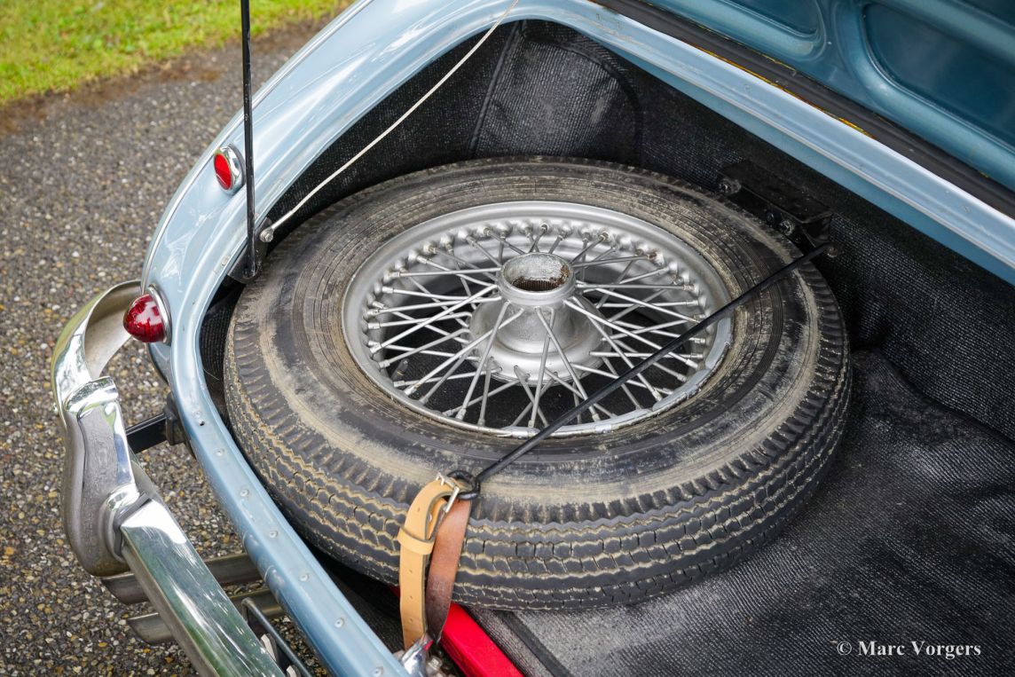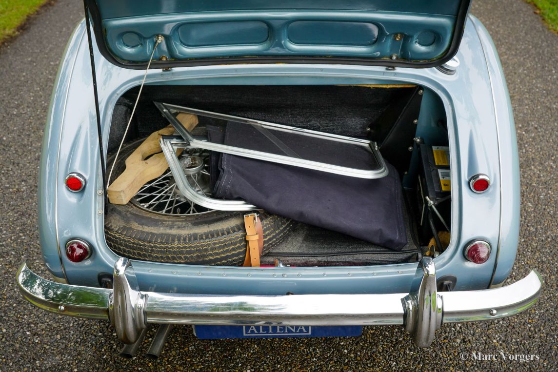 Austin Healey 3000 MK II, year 1961. Chassis (VIN) number HBT7L15775, engine number 29E/RU/H1991. This is a scarce Austin Healey 3000 Mk II 3 carburettor model of which only 5096 examples were built. The bodywork is finished in ice blue metallic over old English white combined with a blue interior featuring blue leather seats trimmed with white piping, a blue leatherette dashboard and door trim, and blue carpet. The blue soft top and tonneau cover are made of blue mohair, and a pair of aluminium side screens with Perspex windows completes the weather equipment. This gorgeous ‘Big Healey’ was sold new in the USA, and the car was shipped from Louisiana to the Netherlands in 2005. In the period 2005 – 2007 the automobile was extensively ‘nut and bolt’ restored to perfection. A restoration logbook is present as is a photo report. The restoration was executed by three renowned specialists: the engine was overhauled by the firm of van Giersbergen, the bodywork was restored by the firm of van Emst. The other mechanical components were overhauled and restored by Altena classic Service. We have assisted the owner completing this glorious Austin Healey. After having thoroughly enjoyed the car for twenty years the owner asked us to find a good new home for it. The shows light traces of use and is in a very good condition! The engine sounds and runs beautifully and the car drives perfectly. The Healey is fitted with chrome wire wheels shod with Vredestein Sprint Classic tyres, chrome ‘knock on’ wheel nuts, a chrome baggage rack, two chrome door mounted rear view mirrors, a MotoLita steering wheel with wood rim, disc brakes at the front, and a Stainless-Steel exhaust. This is a magnificent ‘Big Healey’ in a very good, restored condition and in the most popular colours. A fantastic classic car that will bring great moments of intense open top driving fun!