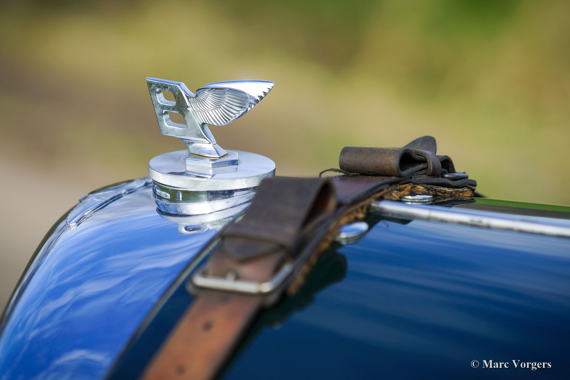 The Bentley 3 Litre was W.O. Bentley’s first design. The car was presented in 1919 but the first cars were sold in 1921. The four cylinder cars of rugged construction where in a class of their own for they combined the size and comfort of the big tourers and saloons with the road holding, and speed of the smaller sports- and racing cars. The Bentley was a true owner-driver car for the sporting motorist and connoisseur. The Bentley car could be had in three different types which were designated with three different radiator badges*. Red badge: short chassis speed model, Blue badge: the early short and then long chassis type for bespoke bodywork, Green badge: very rare and used for about eighteen 100 mph. These Green badge car won at Le Mans in 1924 and 1927 (Old Number Seven.) The 3-Litre was built from 1919 until 1929.
