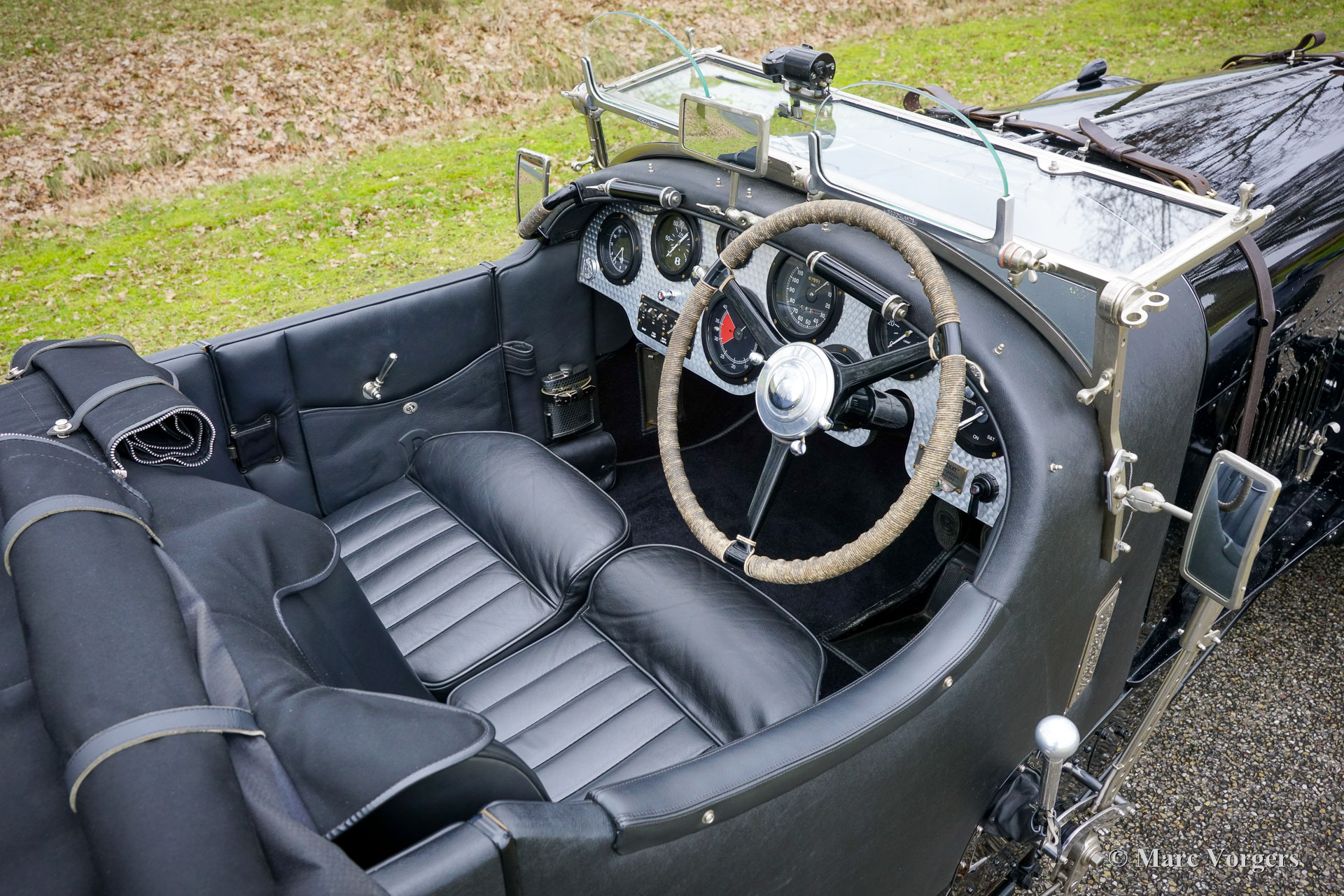 The Bentley 3 Litre was W.O. Bentley’s first design. The car was presented in 1919 but the first cars were sold in 1921. The four cylinder cars of rugged construction where in a class of their own for they combined the size and comfort of the big tourers and saloons with the road holding, and speed of the smaller sports- and racing cars. The Bentley was a true owner-driver car for the sporting motorist and connoisseur. The Bentley car could be had in three different types which were designated with three different radiator badges*. Red badge: short chassis speed model, Blue badge: the early short and then long chassis type for bespoke bodywork, Green badge: very rare and used for about eighteen 100 mph. These Green badge car won at Le Mans in 1924 and 1927 (Old Number Seven.) The 3-Litre was built from 1919 until 1929.
