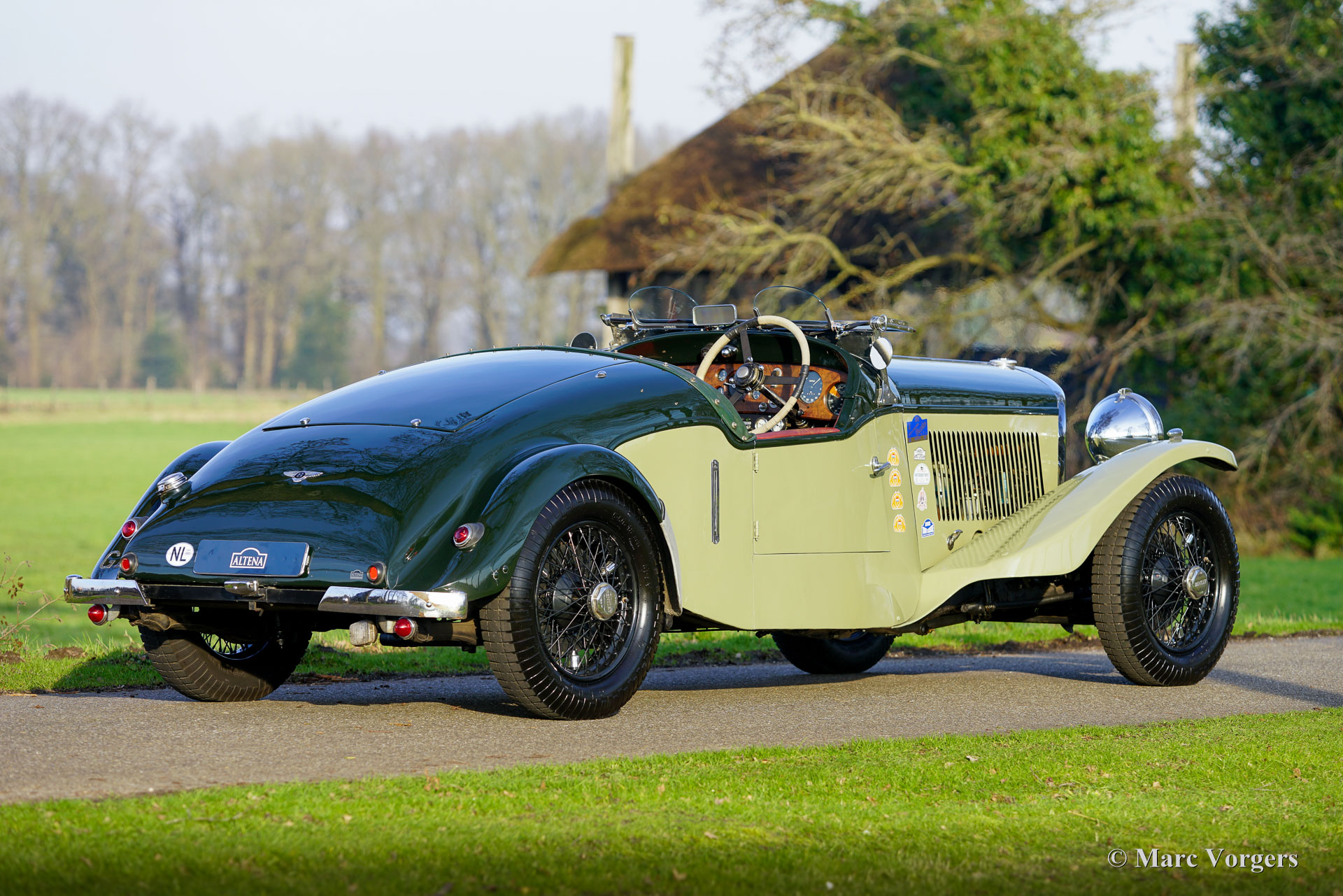 The Bentley 3 Litre was W.O. Bentley’s first design. The car was presented in 1919 but the first cars were sold in 1921. The four cylinder cars of rugged construction where in a class of their own for they combined the size and comfort of the big tourers and saloons with the road holding, and speed of the smaller sports- and racing cars. The Bentley was a true owner-driver car for the sporting motorist and connoisseur. The Bentley car could be had in three different types which were designated with three different radiator badges*. Red badge: short chassis speed model, Blue badge: the early short and then long chassis type for bespoke bodywork, Green badge: very rare and used for about eighteen 100 mph. These Green badge car won at Le Mans in 1924 and 1927 (Old Number Seven.) The 3-Litre was built from 1919 until 1929.