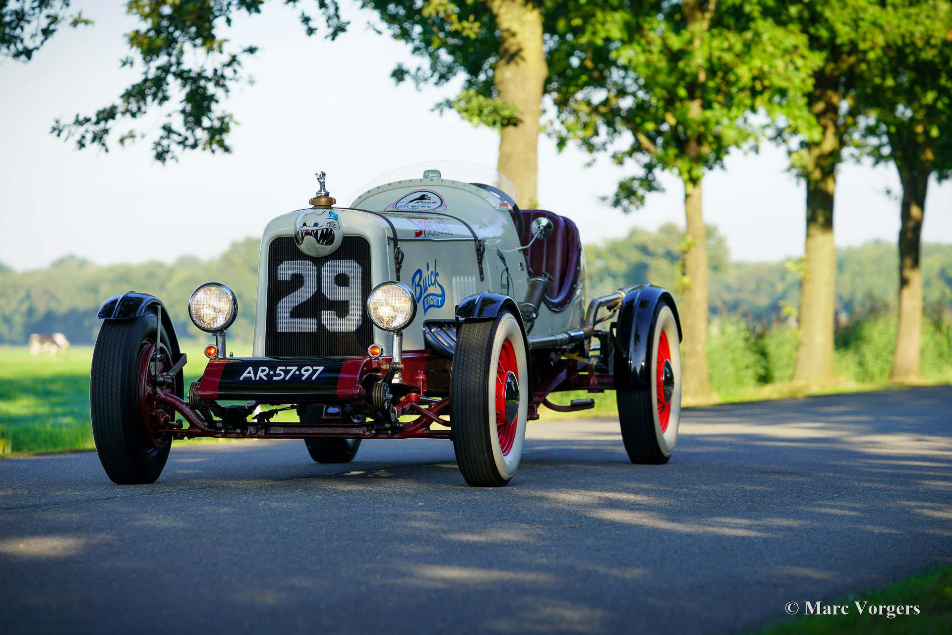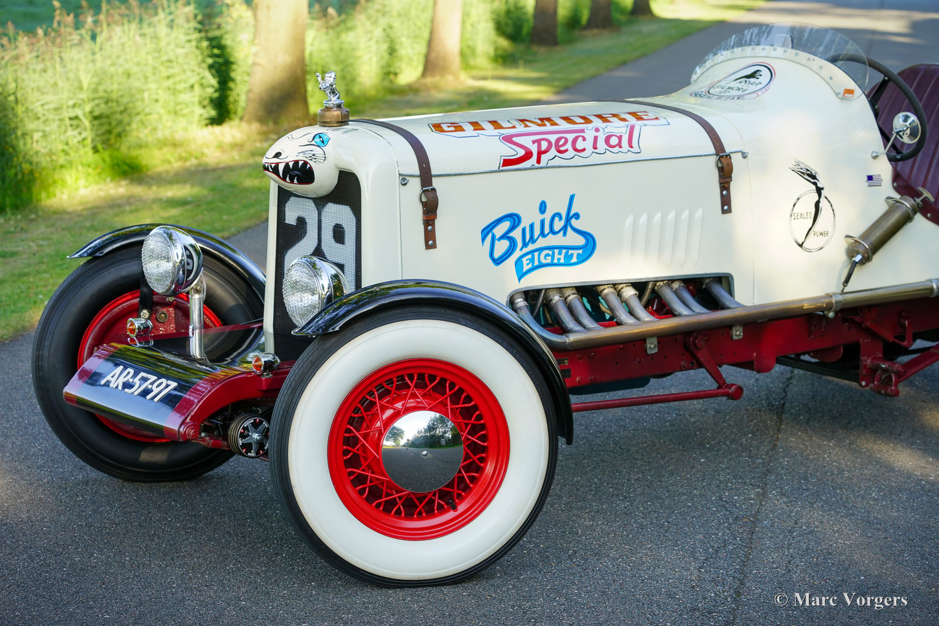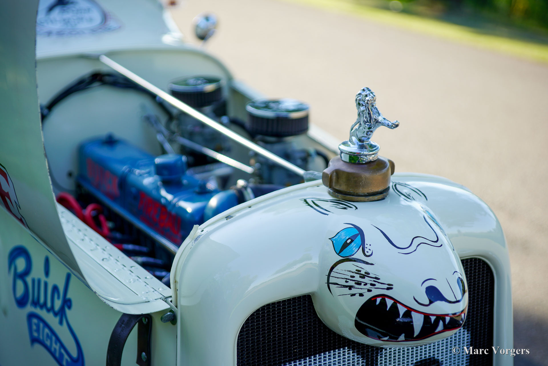 Buick Super 8 Special, year 1930. Colour crème white combined with a burgundy interior. Look what we have here! A magnificent racer built on a 1930 Buick 45 chassis fitted with a ‘straight-eight Buick Fireball 5.3 Litre (320 Ci) engine! The rebuilt engine features two Edelbrock downdraught carburettors and a custom-made exhaust manifold. Power (approx. 165 BHP) is transmitted to the rear wheels via a three-speed manual gearbox with floor shifter. This special machine features a custom built 1920s/30s style two-seater racing body with a mightily long bonnet and an aerodynamic tail. A stupendous detail is the shark head above the grille, a detail in style with the period American racing scene. The hand painted decorations and logos are magnificently crafted and add strongly to the racy look. The burgundy red interior is too plush for a 1930’s racer which would have been stripped down to a spartan minimum. The padded interior of this Buick Special is a delight when driving on the open road where a touch of comfort makes all the difference. The view over the well-equipped dashboard and the long bonnet is fantastic, and the Perspex windscreen is very effective in keeping wind and bugs away! The automobile is fitted with front, rear, indicator, and brake lamps and a Dutch (EU) registration; this automobile is road legal. The driving experience is rough, thrilling, and very satisfying. A monster machine from which the faint of heart should stay away as far as possible!