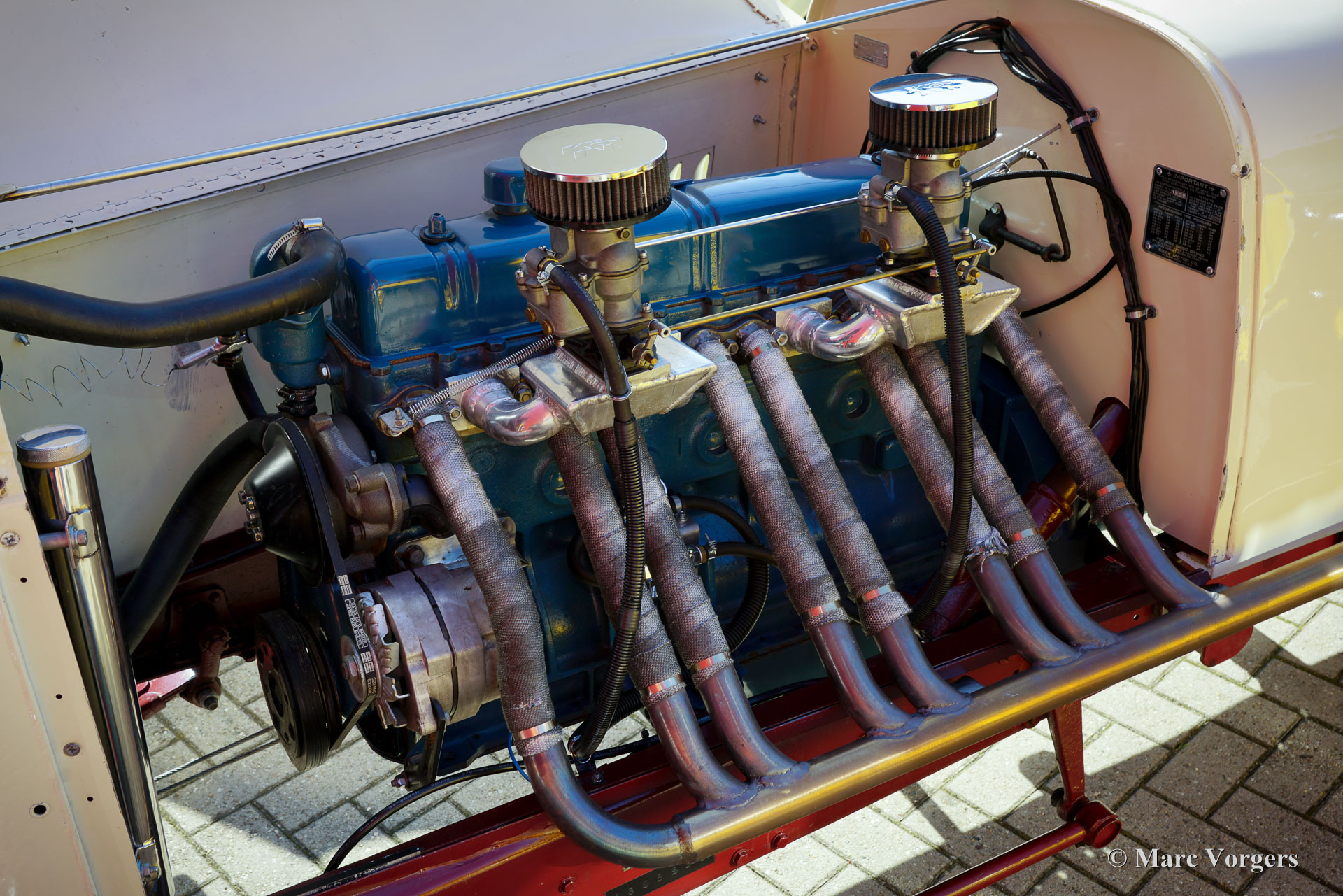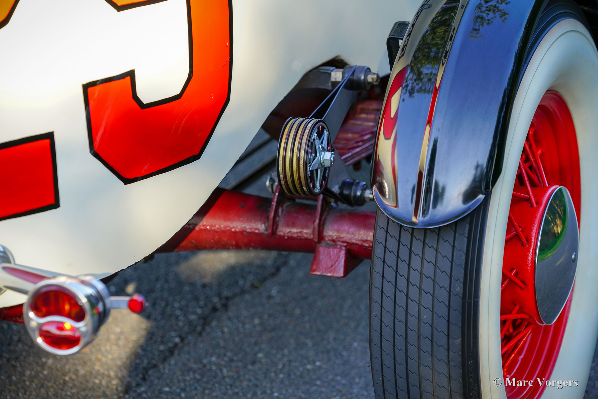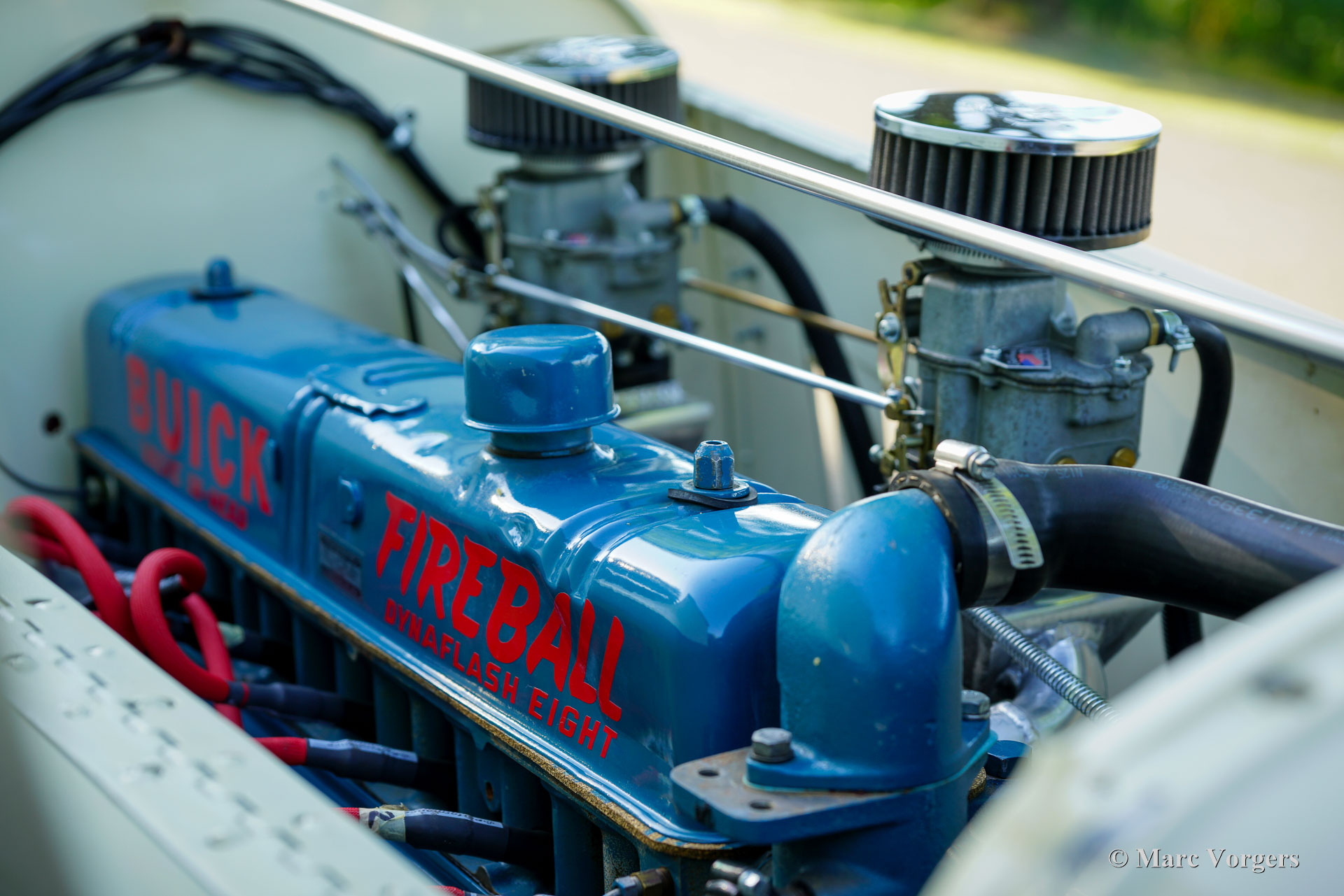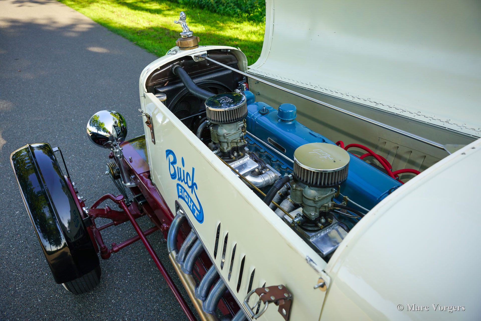 Buick Super 8 Special, year 1930. Colour crème white combined with a burgundy interior. Look what we have here! A magnificent racer built on a 1930 Buick 45 chassis fitted with a ‘straight-eight Buick Fireball 5.3 Litre (320 Ci) engine! The rebuilt engine features two Edelbrock downdraught carburettors and a custom-made exhaust manifold. Power (approx. 165 BHP) is transmitted to the rear wheels via a three-speed manual gearbox with floor shifter. This special machine features a custom built 1920s/30s style two-seater racing body with a mightily long bonnet and an aerodynamic tail. A stupendous detail is the shark head above the grille, a detail in style with the period American racing scene. The hand painted decorations and logos are magnificently crafted and add strongly to the racy look. The burgundy red interior is too plush for a 1930’s racer which would have been stripped down to a spartan minimum. The padded interior of this Buick Special is a delight when driving on the open road where a touch of comfort makes all the difference. The view over the well-equipped dashboard and the long bonnet is fantastic, and the Perspex windscreen is very effective in keeping wind and bugs away! The automobile is fitted with front, rear, indicator, and brake lamps and a Dutch (EU) registration; this automobile is road legal. The driving experience is rough, thrilling, and very satisfying. A monster machine from which the faint of heart should stay away as far as possible!