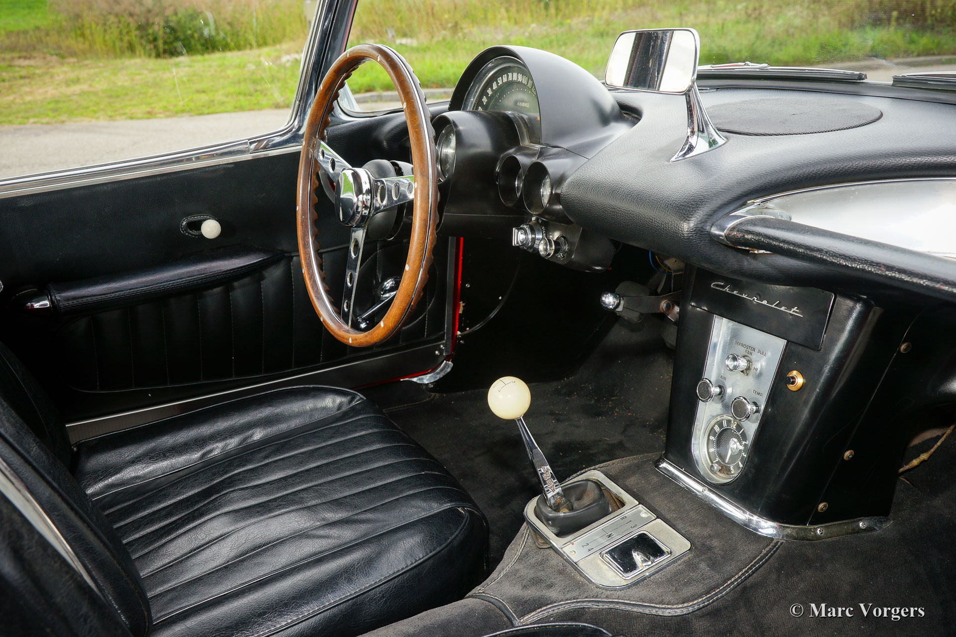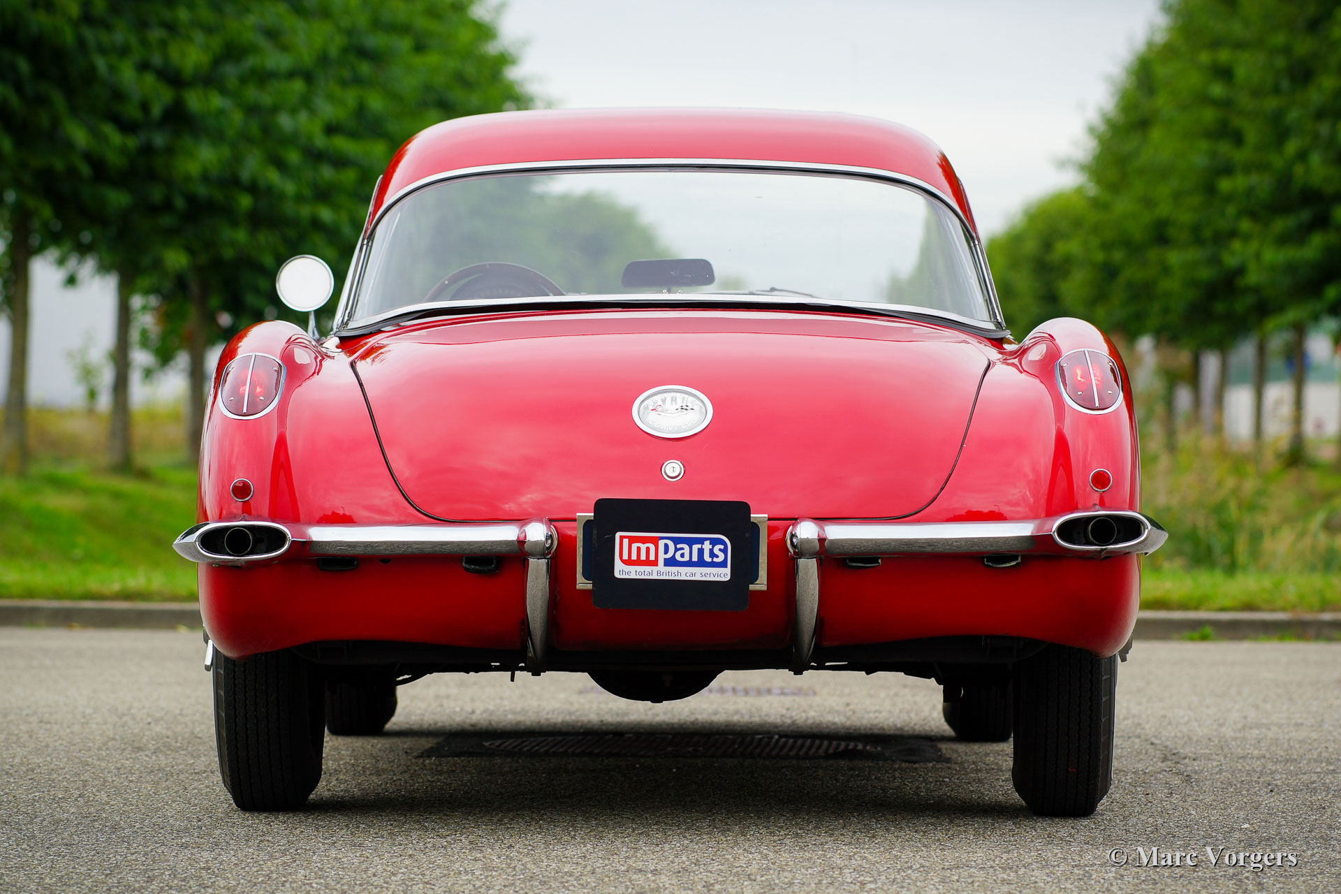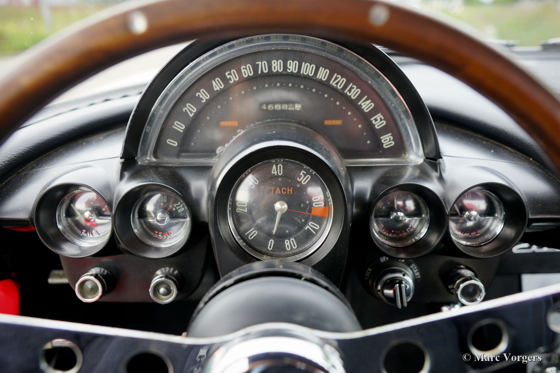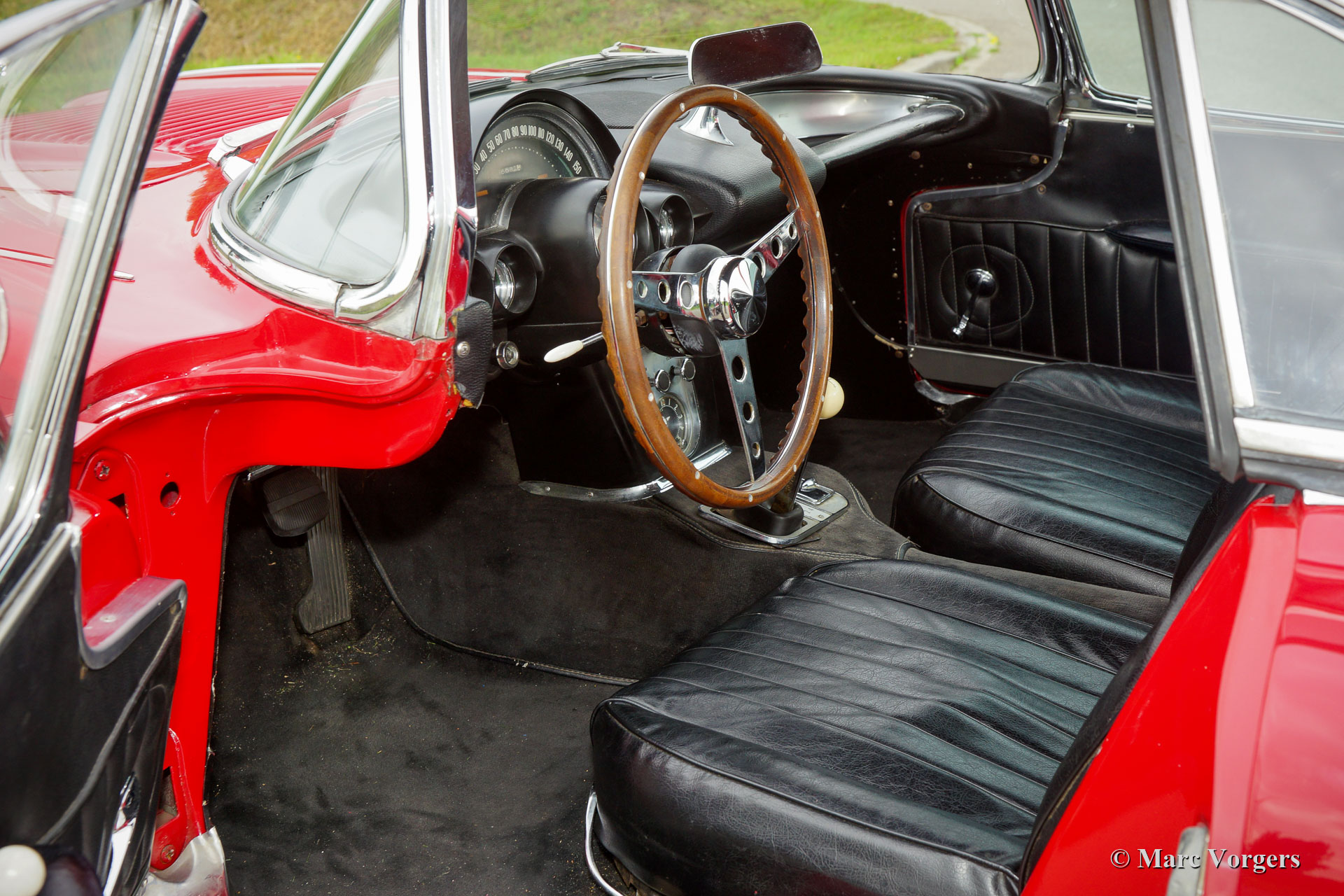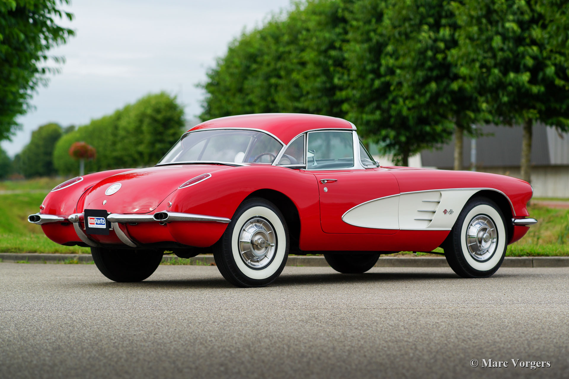 Chrevrolet Corvette, year 1958. Colour red with crème white ‘coves’ and a black leathercloth interior and black carpet. Original red hard-top. This fantastic 1958 Corvette is in good to very good driver condition. The car is fitted with a 389 cui (6400 cc) V8 engine mated to a 4-speed manual gearbox! The engine features a large Edelbrock carburettor and an Edelbrock manifold. This gorgeous Chevrolet Corvette brings you back to the colourful ‘Rock & Roll’ times of the 1950s!