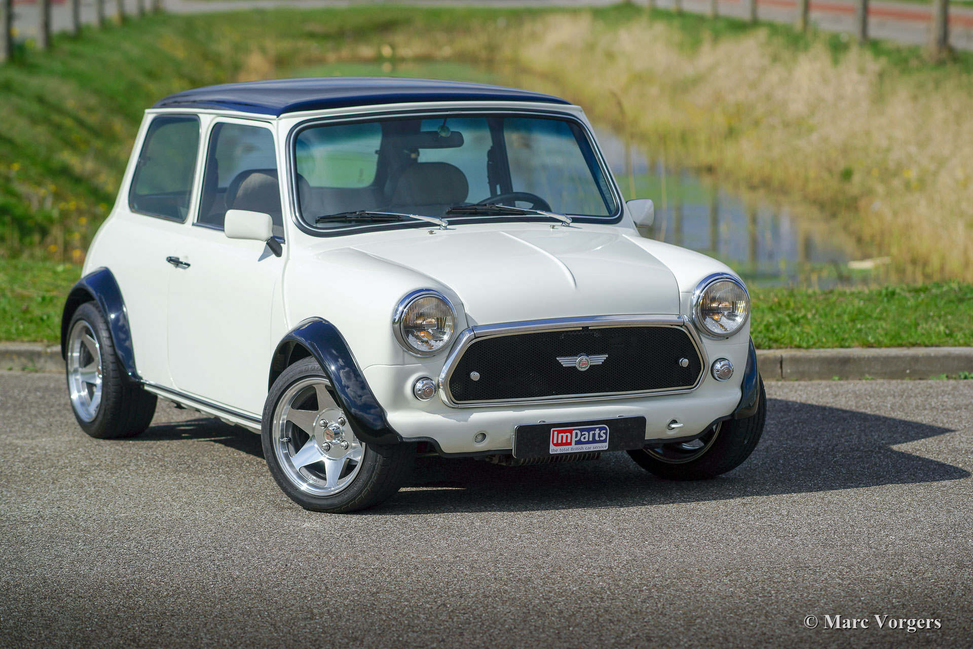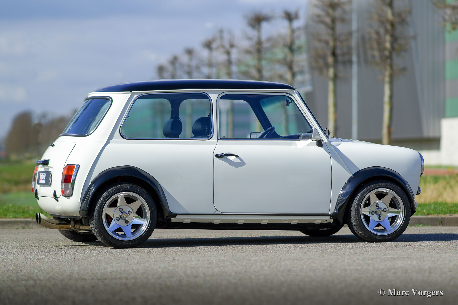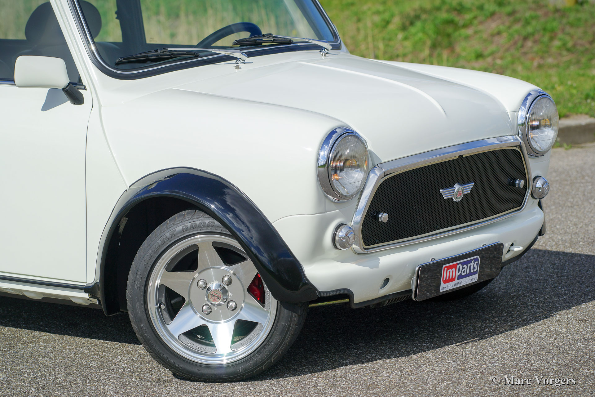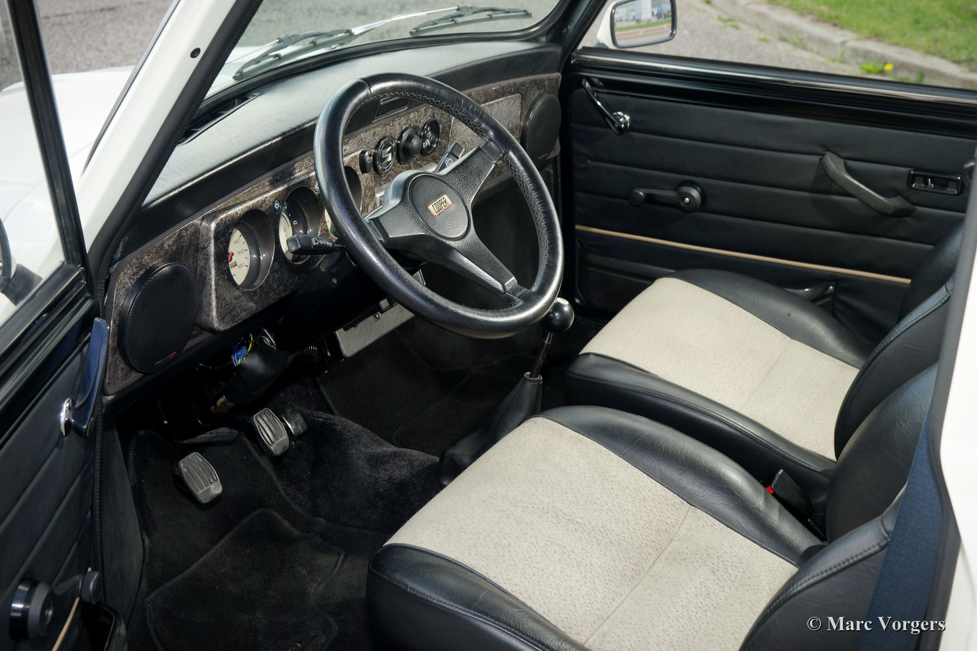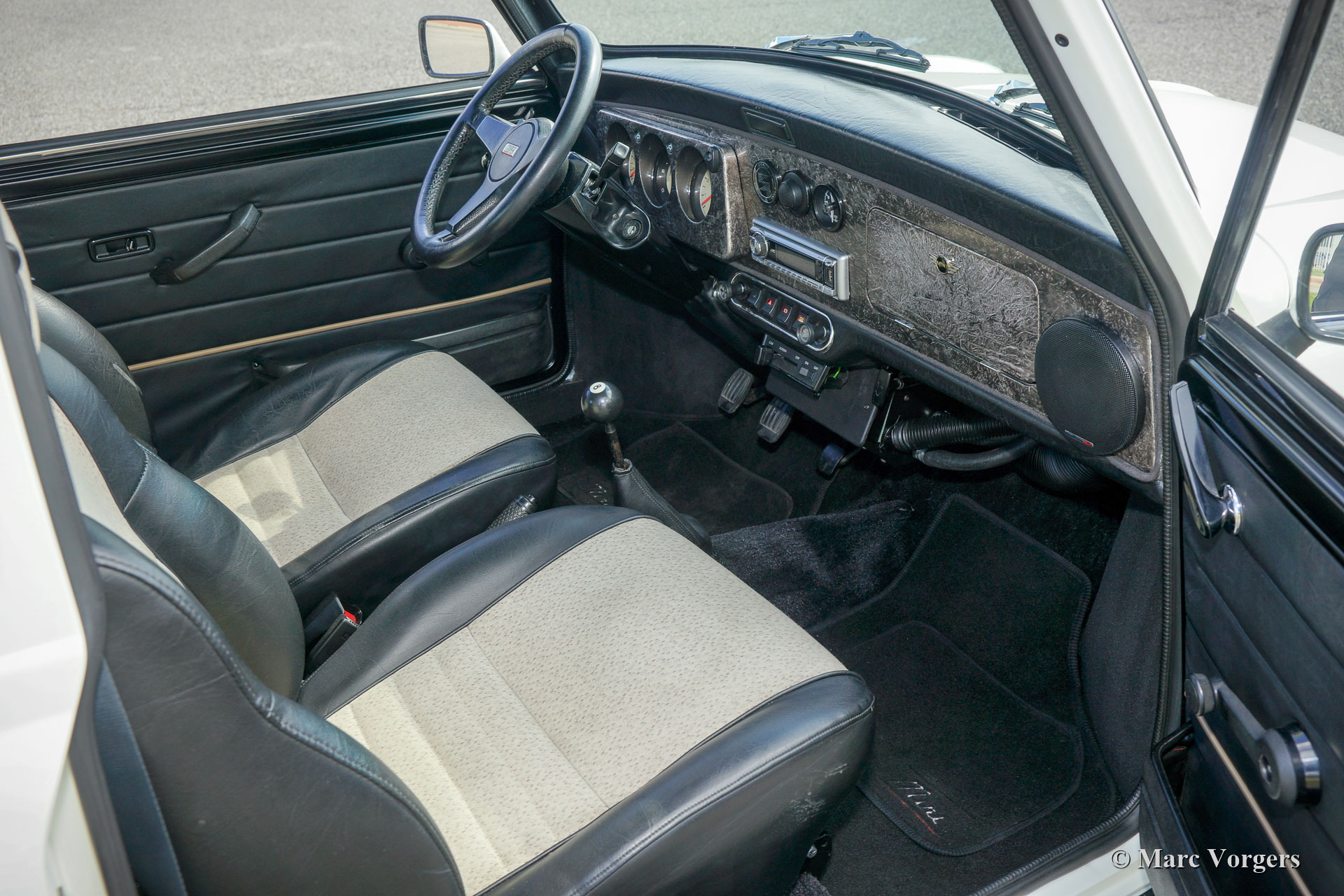 Classic Mini ‘Outlaw’ 1275, year 1985. Colour white combined with a black roof-top and wide black wheel-arches. Black Cooper interior with crème white seat contrasts and black carpet. This extravagant Leyland Mini ‘Outlaw’ 1275 cannot go unnoticed… The white body colour, the WIDE wheel arches, the fantastic polished wheels and the grumbling exhaust note all make a statement; HERE I AM! This Classic Mini is in superb condition and the car drives and feels like new! The Cooper interior with the special dashboard by Stilauto of Milan is stunning! The 1275 cc engine delivers 69 horsepower and the high-end audio system is powerful enough to fight the sound-track of the DTM-Style exhaust! The car comes with many more desirable options: Starmag 13x7 inch polished alloy wheels, 175/45-13 Dunlop SP Sport tyres, green tinted glass, ‘sports-pack’ wheel-arch extenders, Cooper upholstery, Cooper leather rimmed steering wheel, Cooper dashboard, dashboard gauges with cream (magnolia) scale backgrounds, two rear view mirrors in body-colour, sound insulation under the carpet, a special grille, halogen head-lamps, Koni shock absorbers… Too much to list here! This is an: AWESOME Classic Mini in top condition!