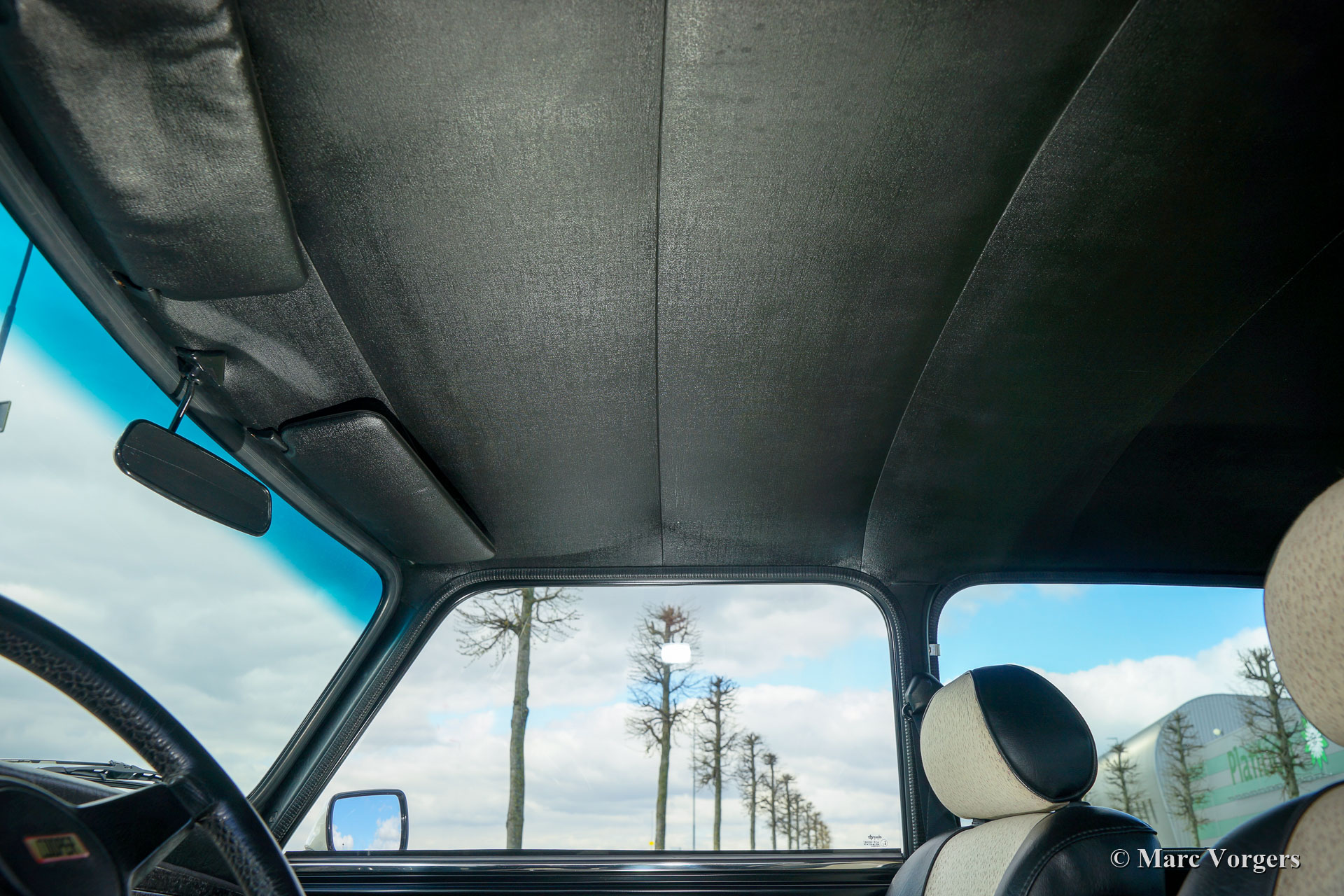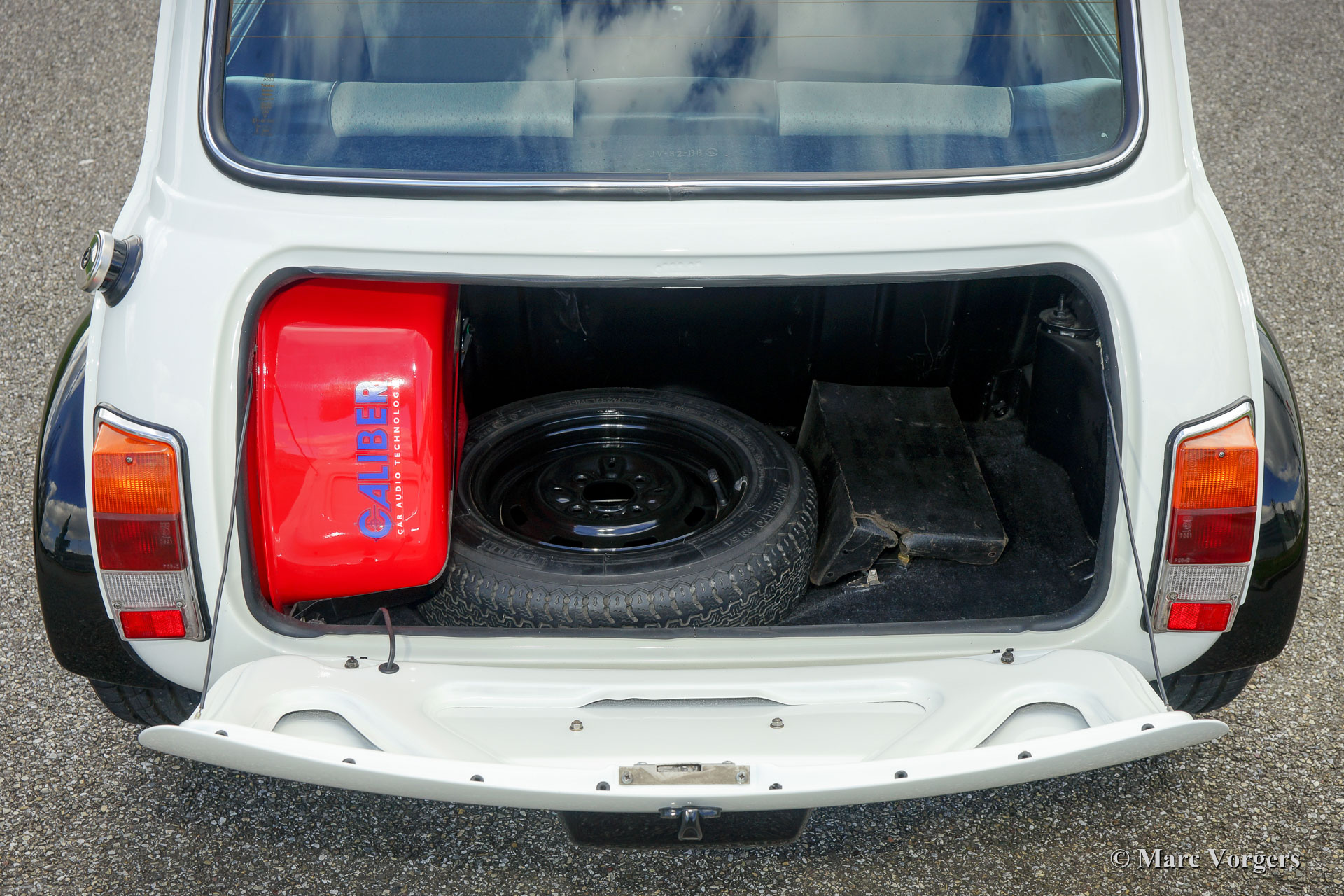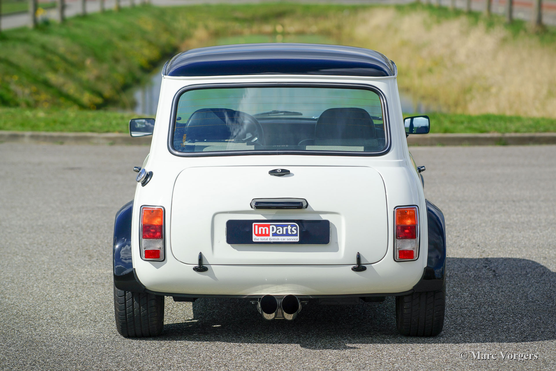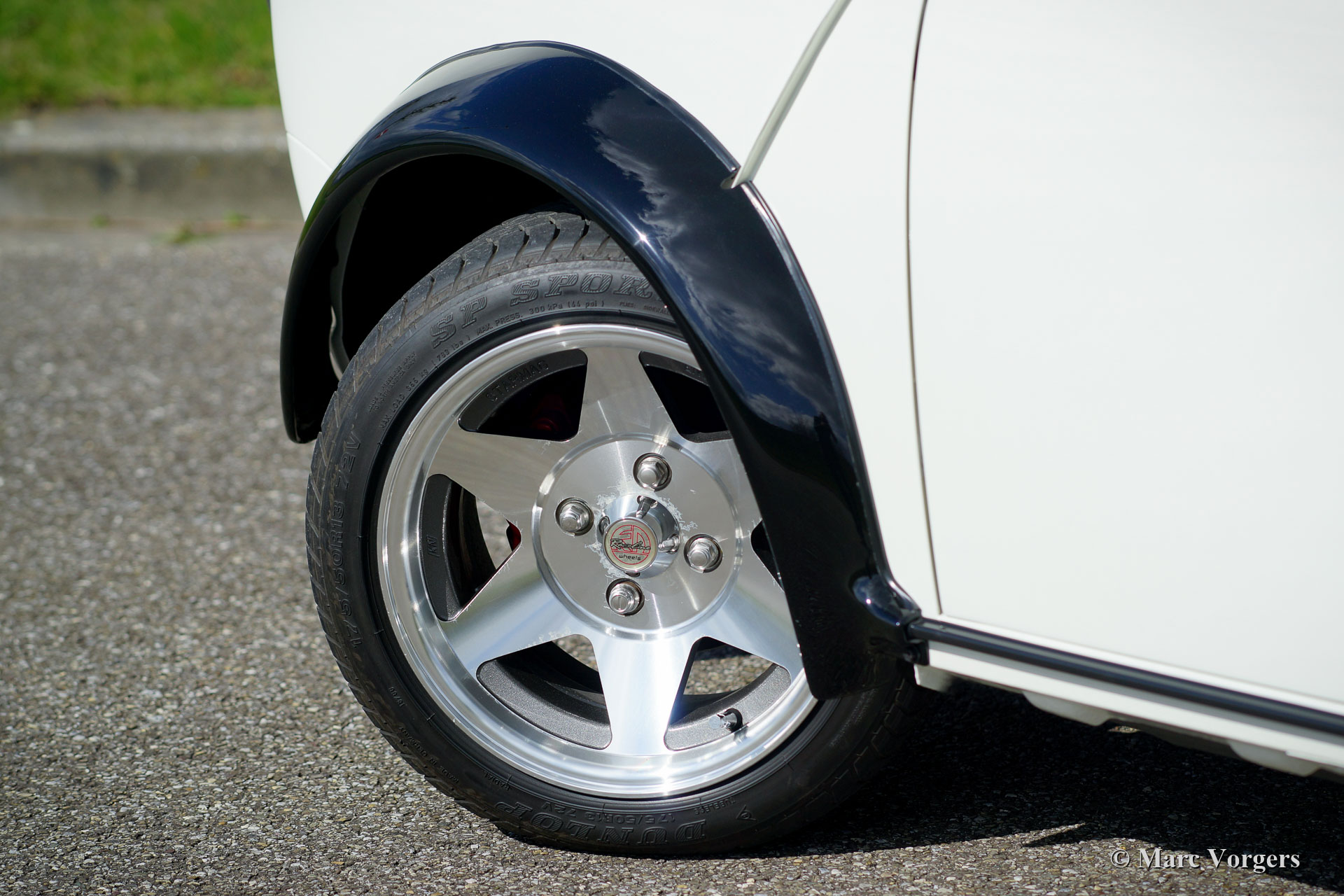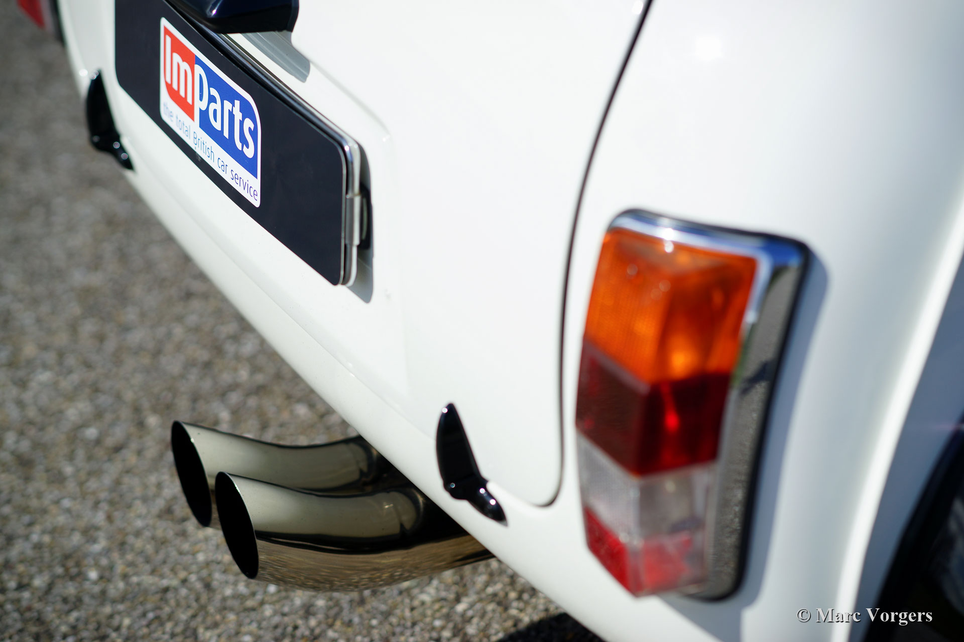 Classic Mini ‘Outlaw’ 1275, year 1985. Colour white combined with a black roof-top and wide black wheel-arches. Black Cooper interior with crème white seat contrasts and black carpet. This extravagant Leyland Mini ‘Outlaw’ 1275 cannot go unnoticed… The white body colour, the WIDE wheel arches, the fantastic polished wheels and the grumbling exhaust note all make a statement; HERE I AM! This Classic Mini is in superb condition and the car drives and feels like new! The Cooper interior with the special dashboard by Stilauto of Milan is stunning! The 1275 cc engine delivers 69 horsepower and the high-end audio system is powerful enough to fight the sound-track of the DTM-Style exhaust! The car comes with many more desirable options: Starmag 13x7 inch polished alloy wheels, 175/45-13 Dunlop SP Sport tyres, green tinted glass, ‘sports-pack’ wheel-arch extenders, Cooper upholstery, Cooper leather rimmed steering wheel, Cooper dashboard, dashboard gauges with cream (magnolia) scale backgrounds, two rear view mirrors in body-colour, sound insulation under the carpet, a special grille, halogen head-lamps, Koni shock absorbers… Too much to list here! This is an: AWESOME Classic Mini in top condition!