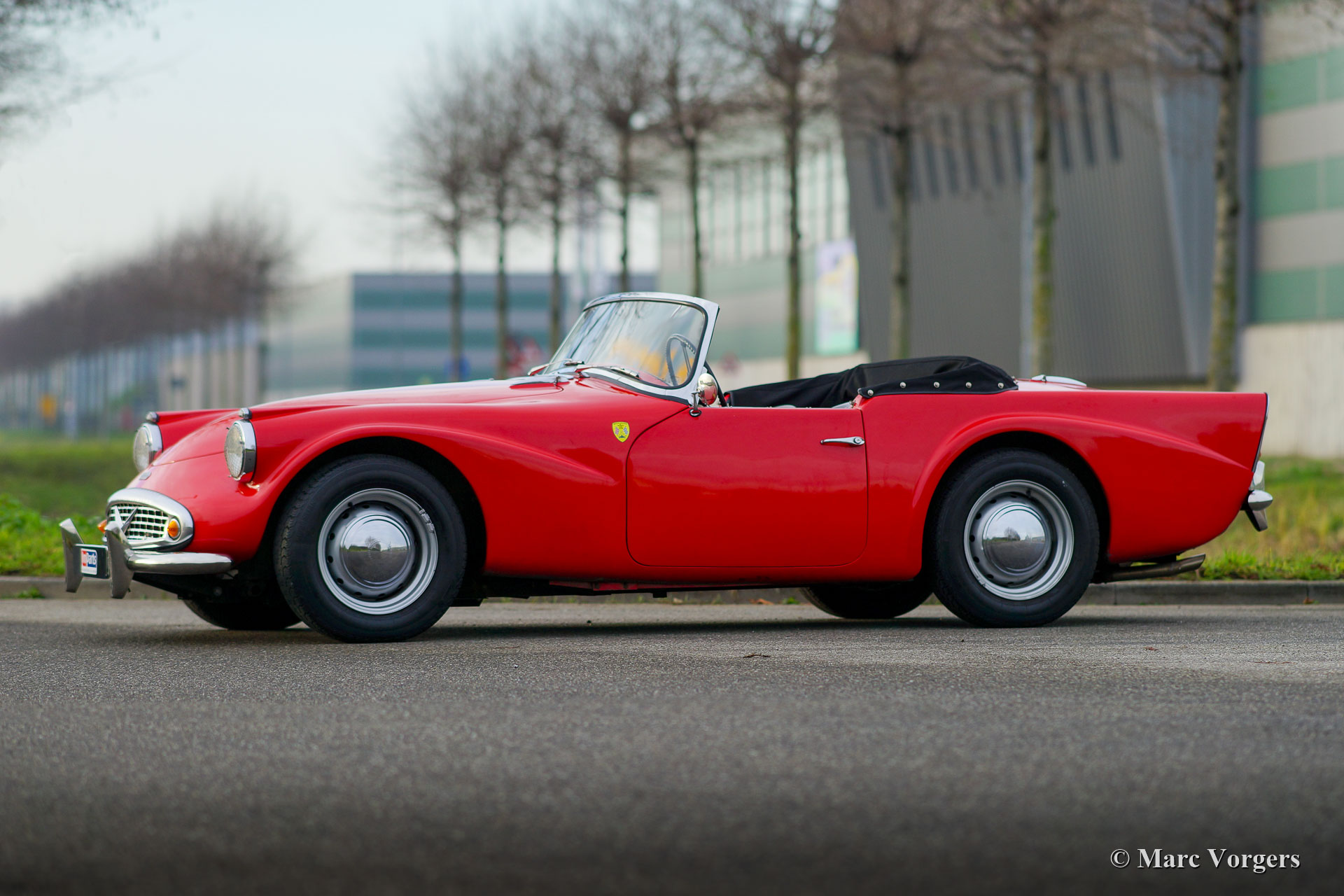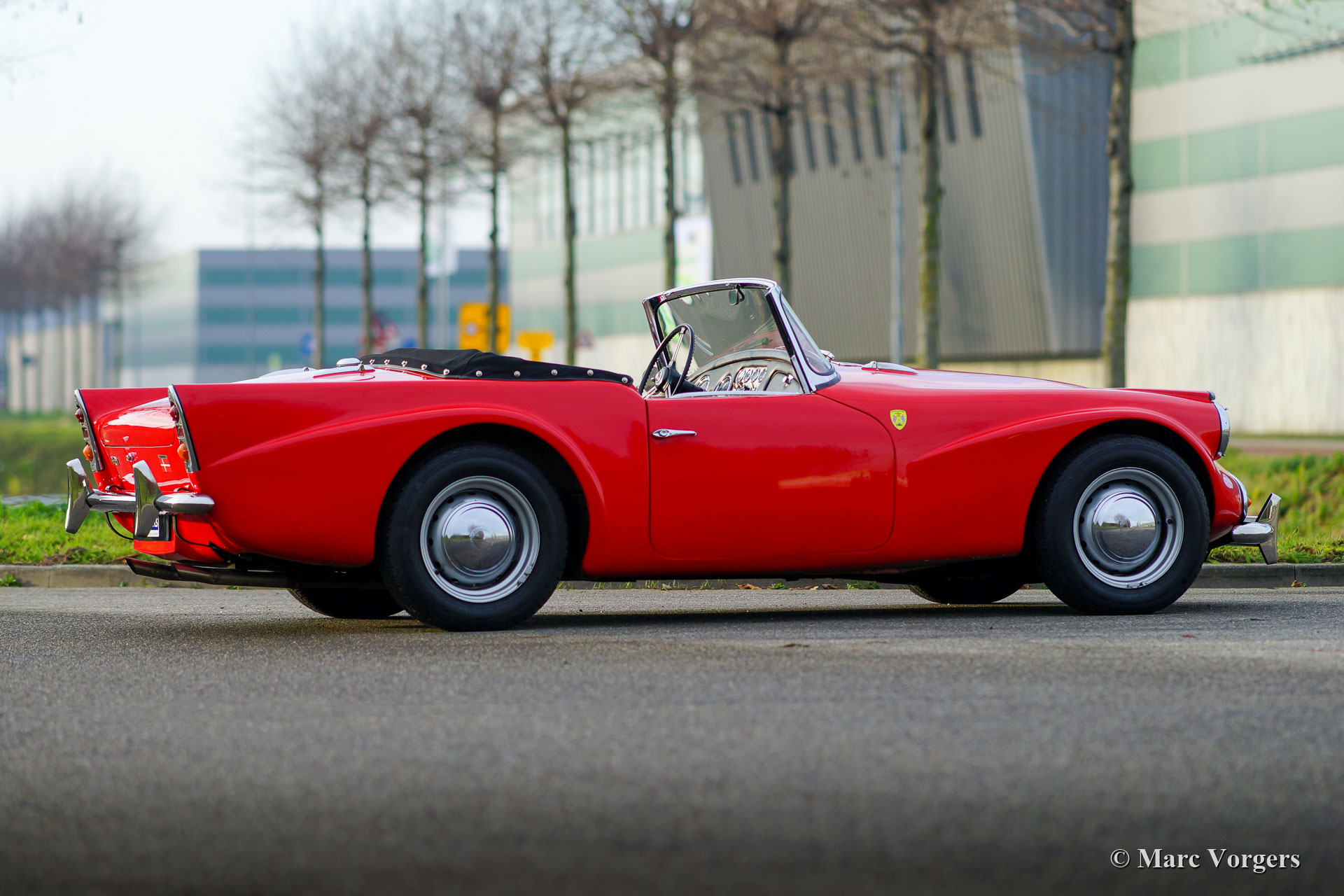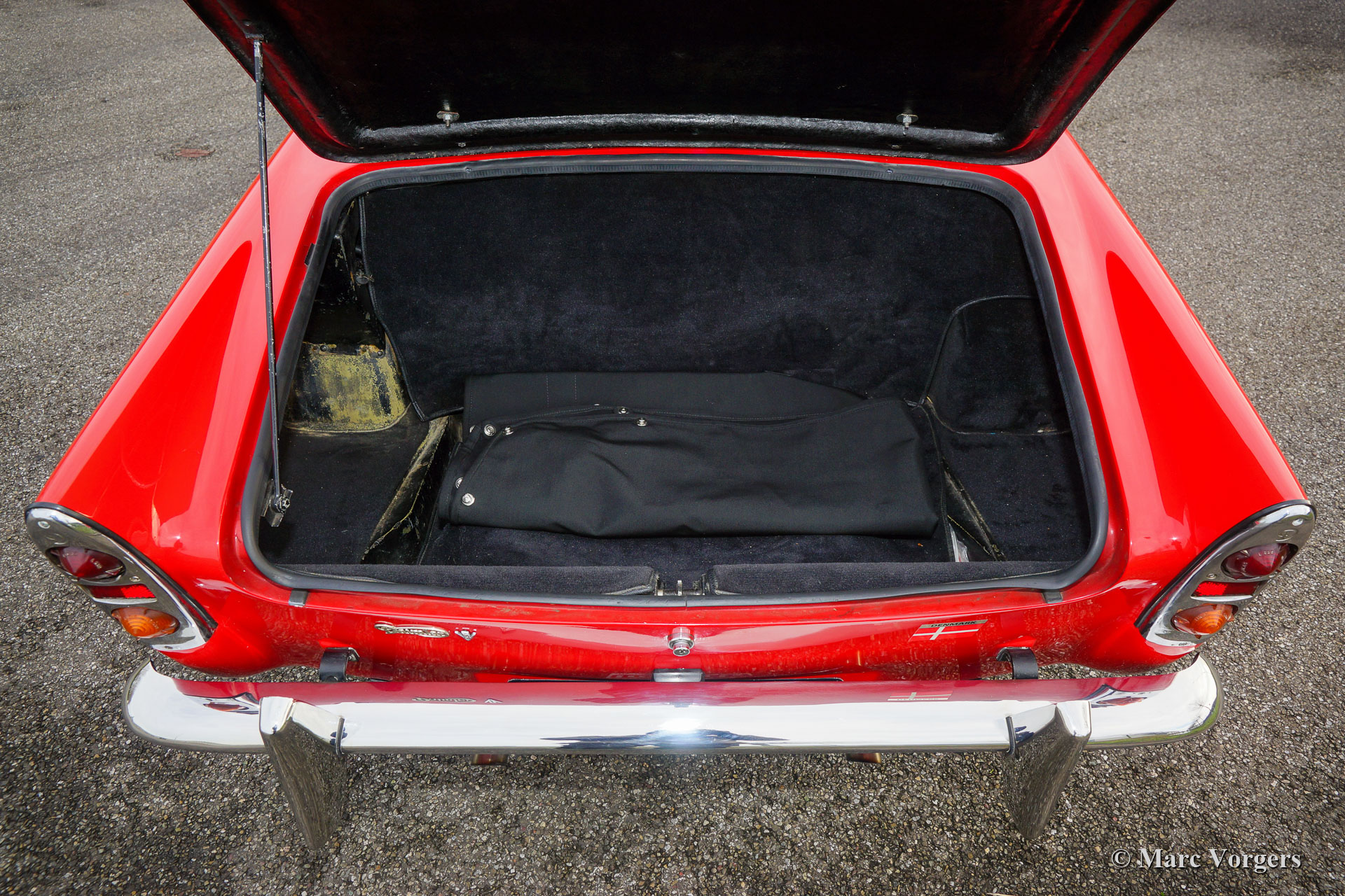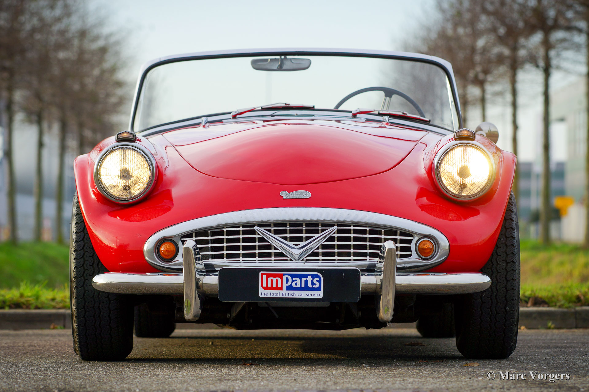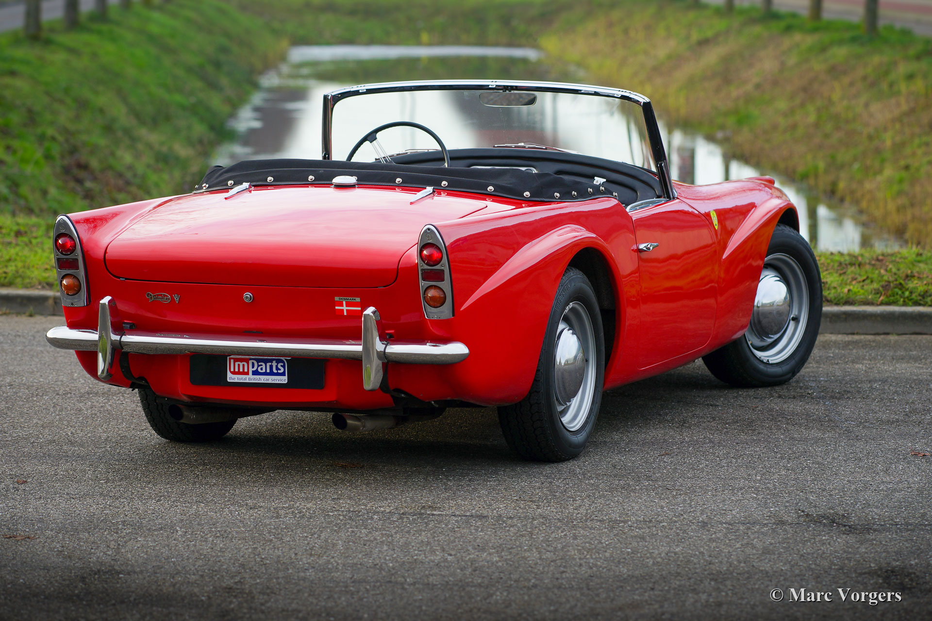 Daimler SP 250 ‘Dart’, year 1962. Colour red combined with a black leather interior and black carpet. The Daimler SP250 ‘Dart’ is a rare car, only 2645 cars of this type were built. This is an even rarer left hand drive specimen. The Daimler SP250 is constructed with a Glass fibre reinforced polyester (GRP) bodywork on a steel chassis. The automobile is in good condition and the car drives, sounds, shifts and brakes beautifully. The V8 Daimler engine sounds very inspiring and it delivers 142 bhp which are transmitted to the rear wheels via a 4-speed manually operated gearbox. The Daimler SP250 features disc brakes all round. This beautiful Daimler SP250 ‘Dart’ is fitted with an aluminium radiator, an electric cooling fan, a mohair soft-top and it comes complete with a mohair tonneau cover and original manuals. The car comes with a good history file. This is a rare Daimler SP250 ‘Dart’, one of the most ‘expressive’ British sports cars ever built!
