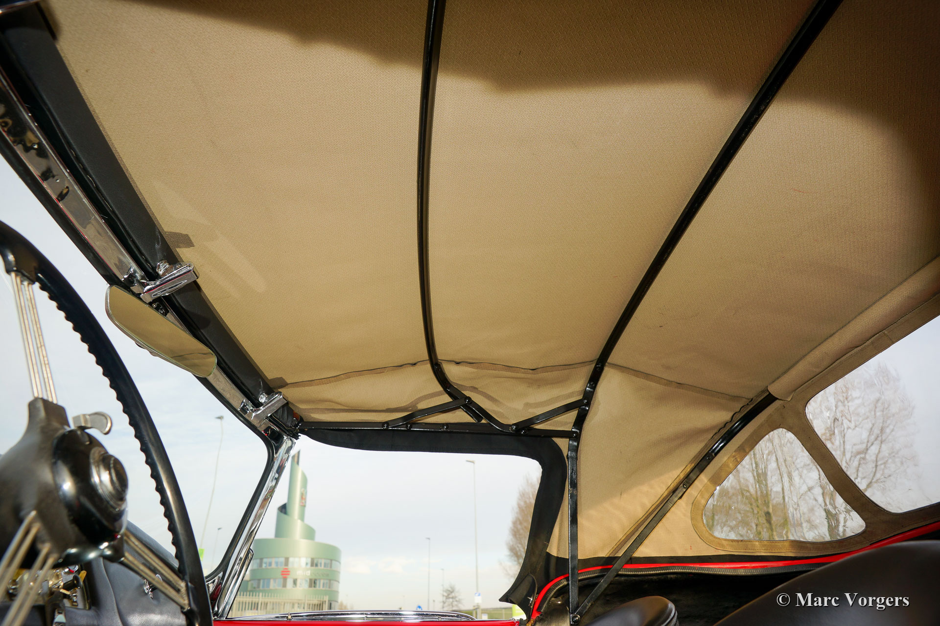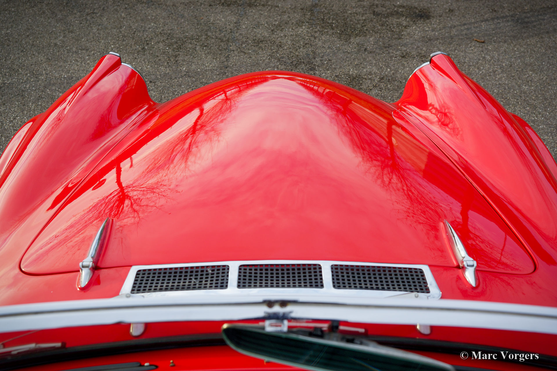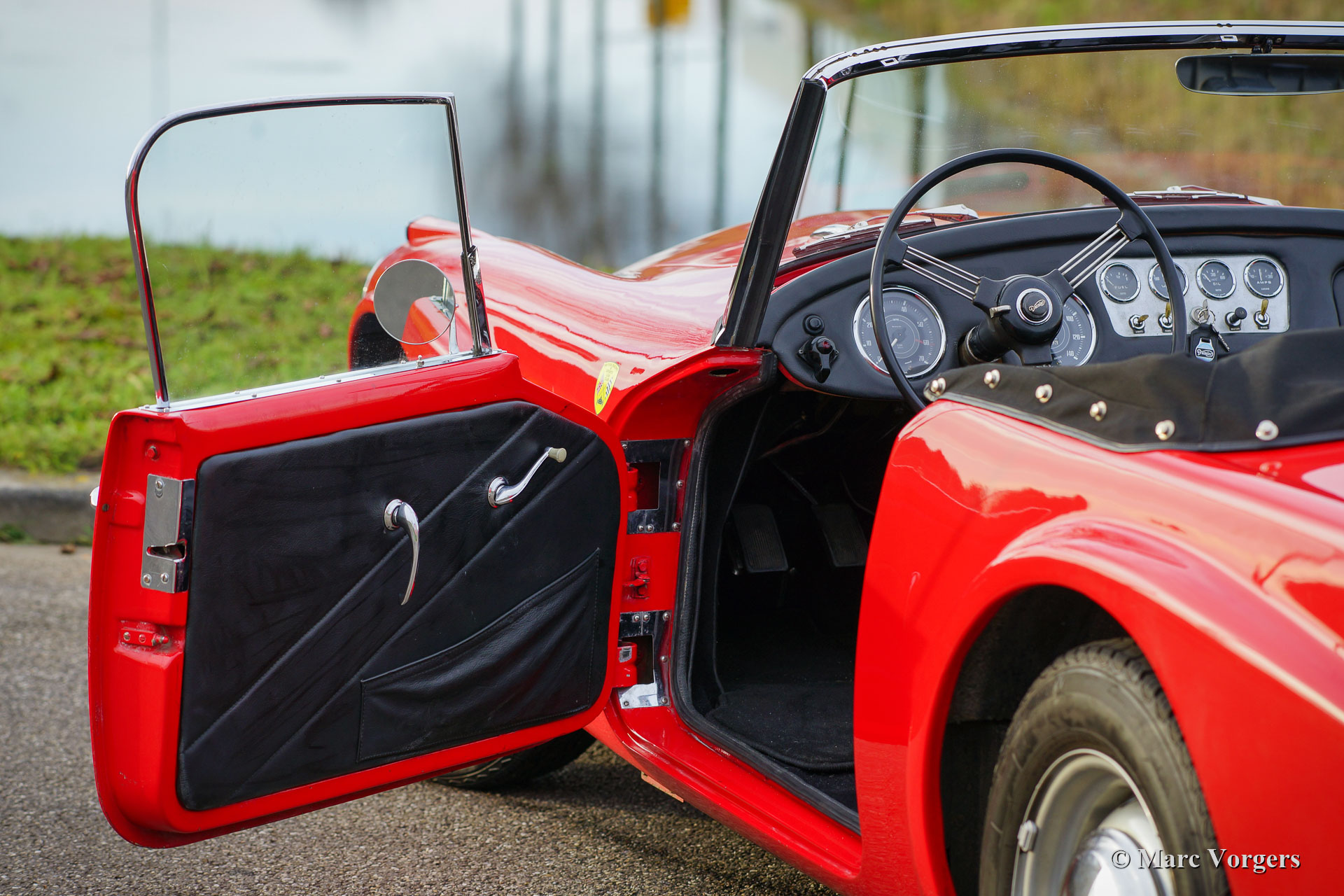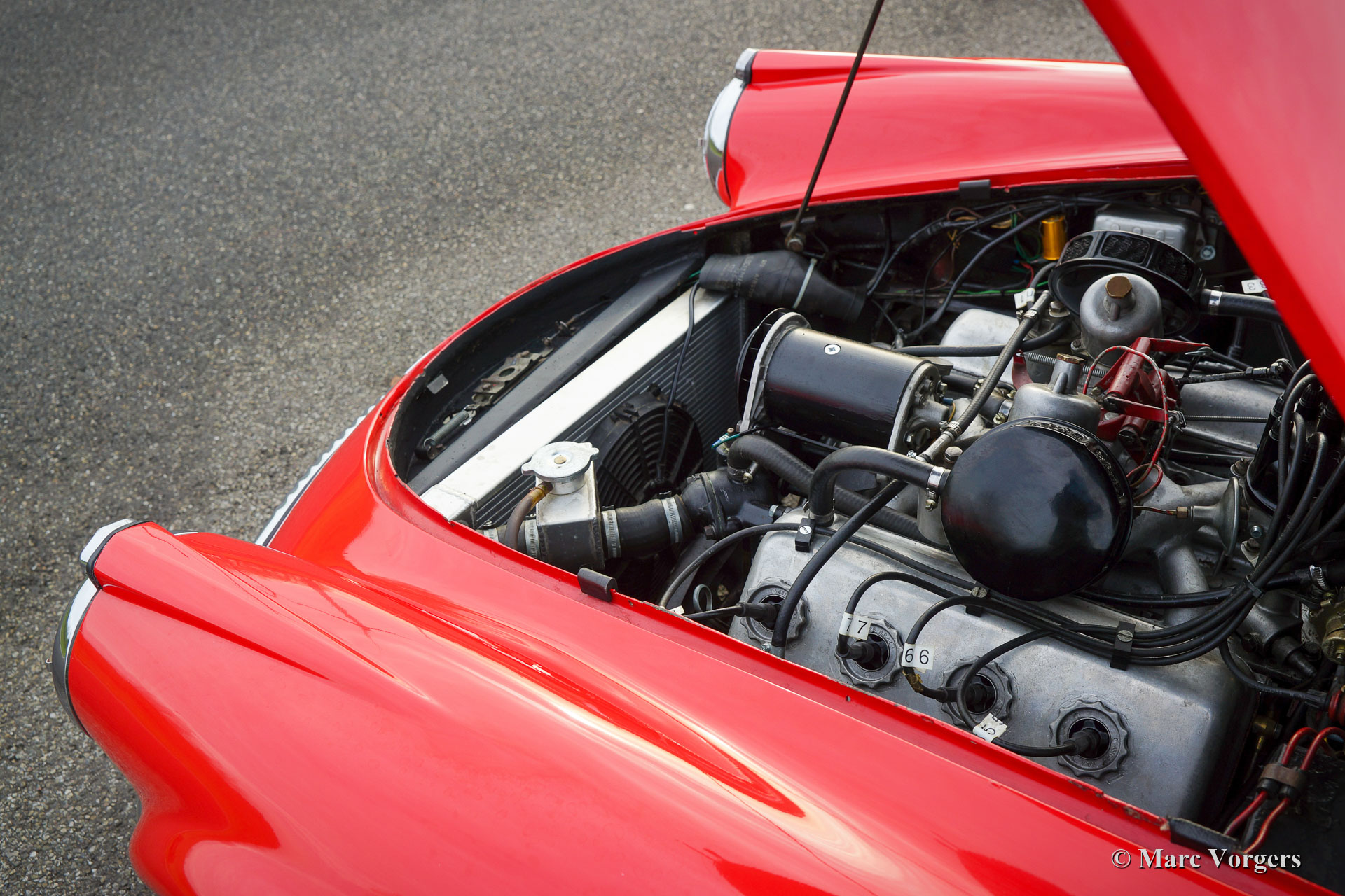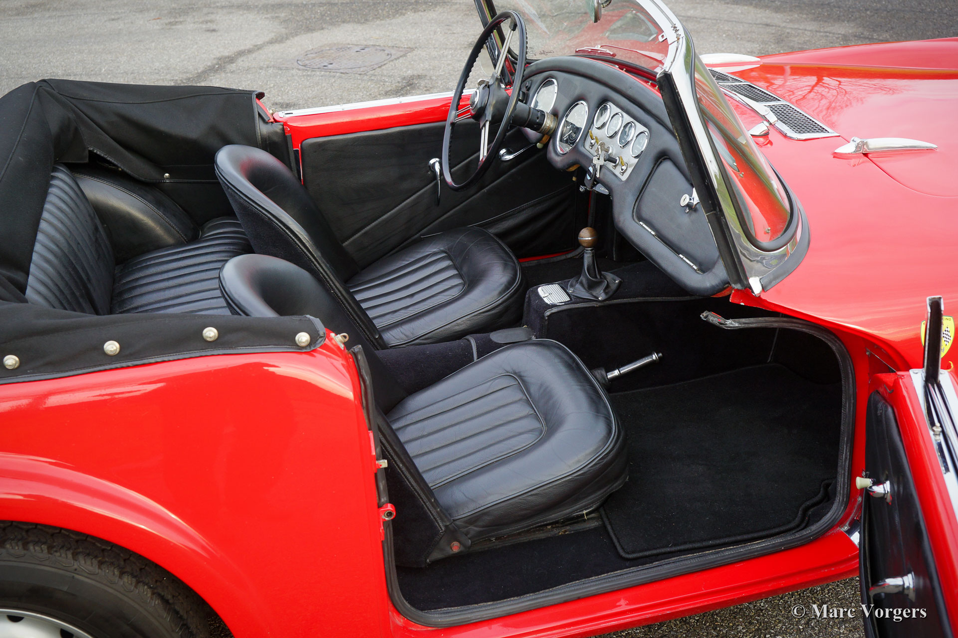 Daimler SP 250 ‘Dart’, year 1962. Colour red combined with a black leather interior and black carpet. The Daimler SP250 ‘Dart’ is a rare car, only 2645 cars of this type were built. This is an even rarer left hand drive specimen. The Daimler SP250 is constructed with a Glass fibre reinforced polyester (GRP) bodywork on a steel chassis. The automobile is in good condition and the car drives, sounds, shifts and brakes beautifully. The V8 Daimler engine sounds very inspiring and it delivers 142 bhp which are transmitted to the rear wheels via a 4-speed manually operated gearbox. The Daimler SP250 features disc brakes all round. This beautiful Daimler SP250 ‘Dart’ is fitted with an aluminium radiator, an electric cooling fan, a mohair soft-top and it comes complete with a mohair tonneau cover and original manuals. The car comes with a good history file. This is a rare Daimler SP250 ‘Dart’, one of the most ‘expressive’ British sports cars ever built!