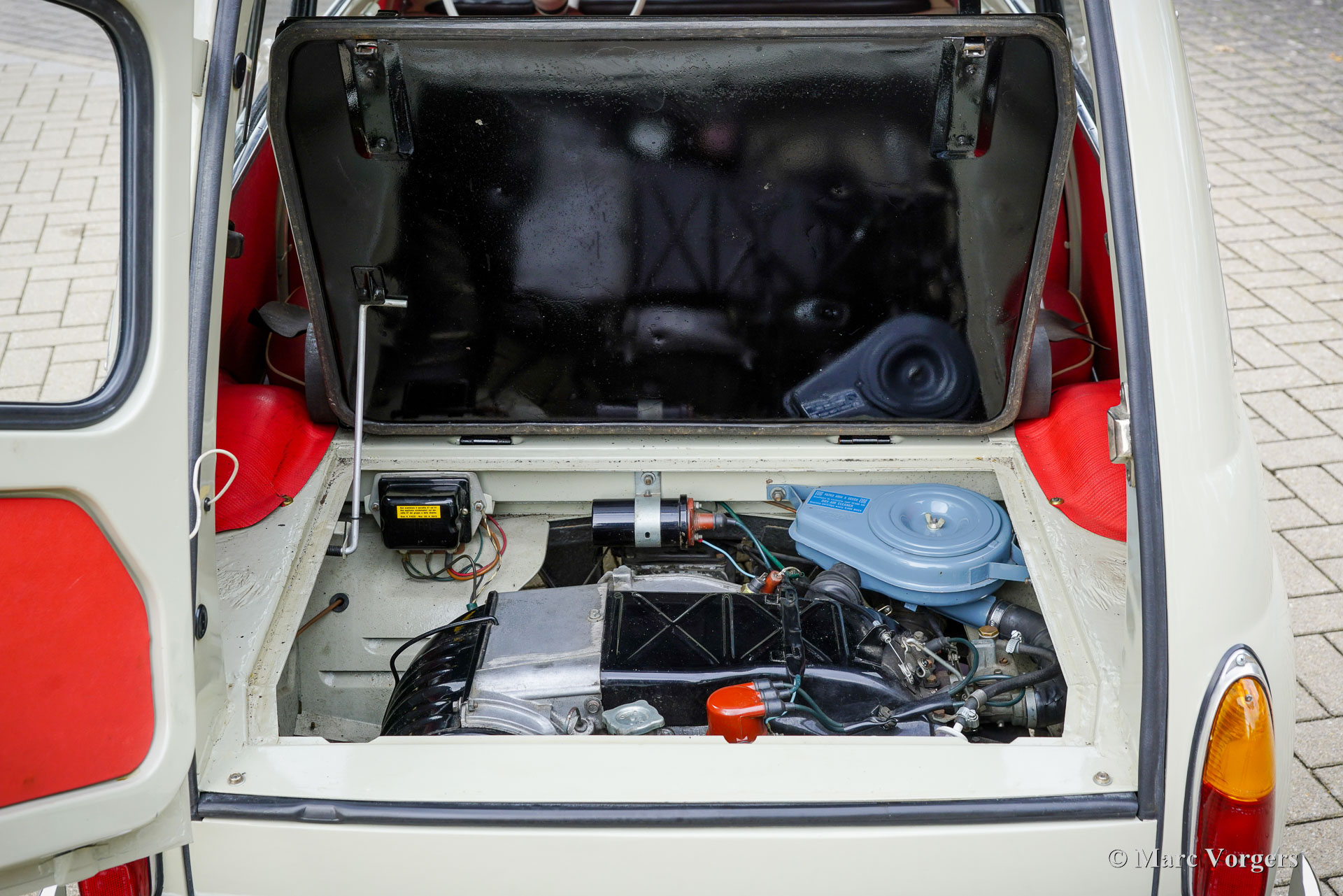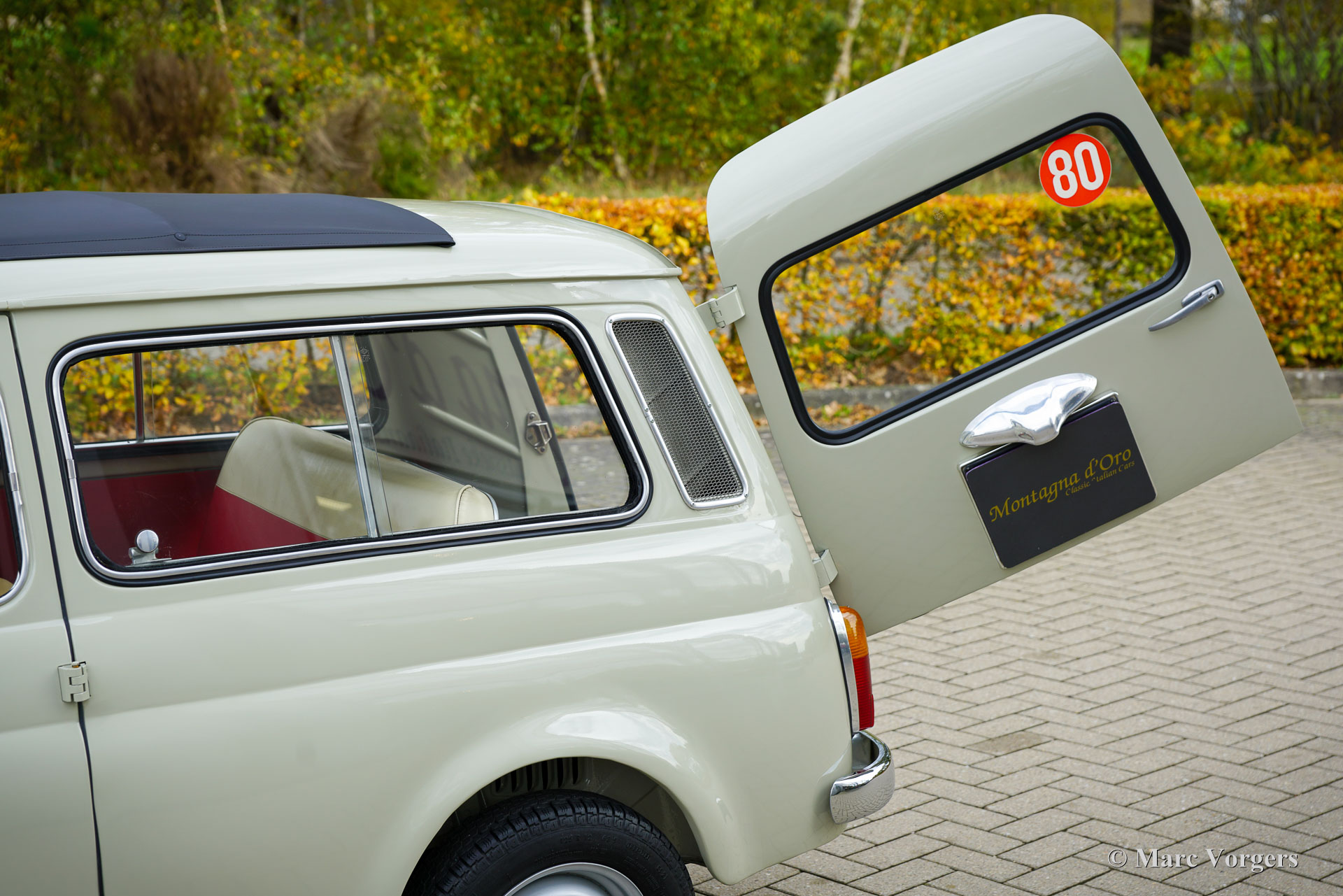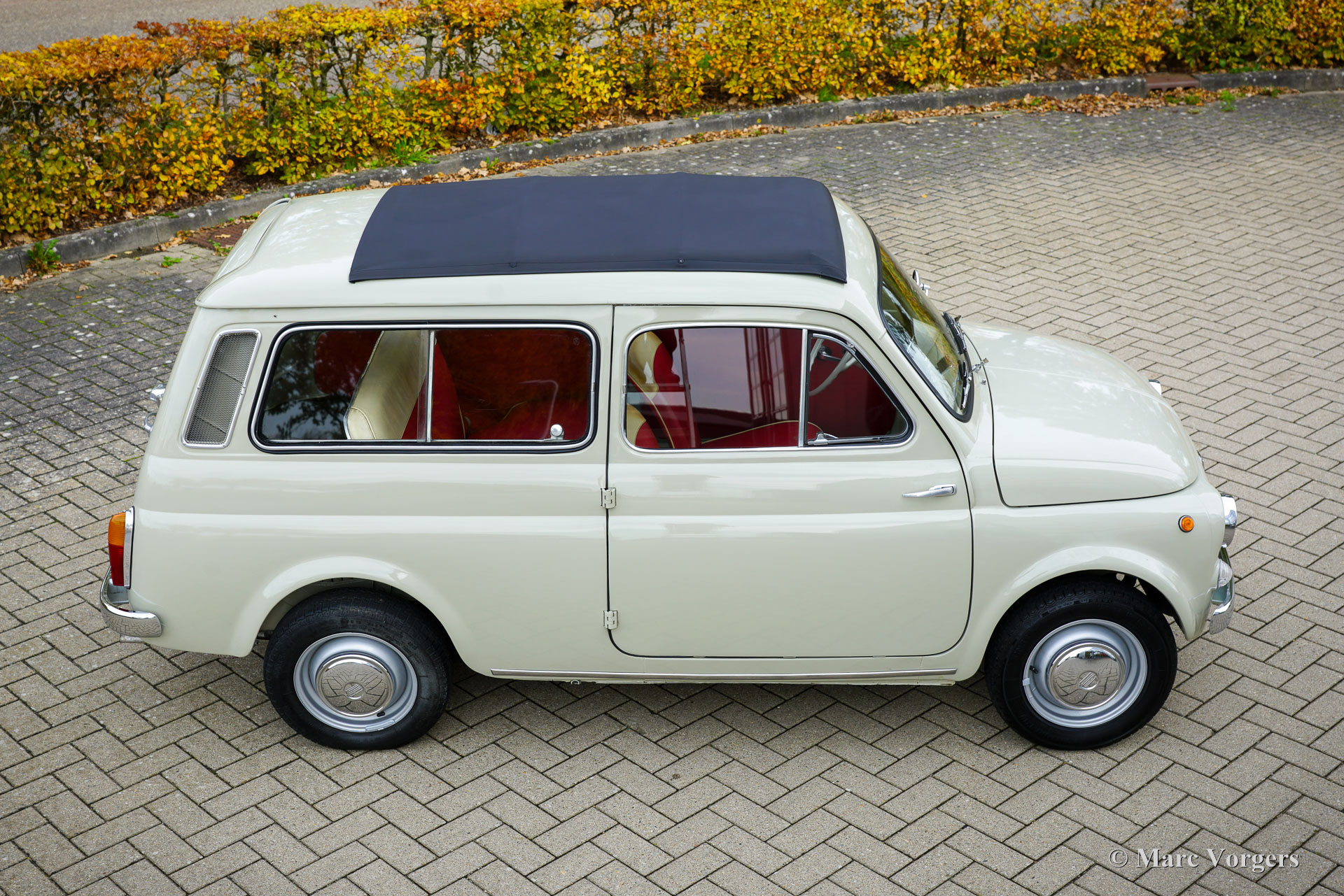 Fiat 120 Nuova 500 Giardiniera, year 1965. Chassis (VIN) number Fiat120*144869*, engine number 120000*243877*. Body colour warm grey (beige) combined with a red/cream faux leather (vinyl) interior trimmed with black rubber carpet. This delightful Fiat 120 Nuova 500 Giardiniera was sold new in the south of Italy where it stayed until recently. After an extensive service in Italy, including a brake service, the car was sold to the Netherlands. This Fiat Nuova 500 Giardiniera is in an excellent condition! The odometer shows 82.796 kilometres. The bodywork looks brand new and was beautifully restored/ repainted in the past; the interior is in a wonderful and excellent condition. The engine compartment looks as if the car has left the factory just two years ago. This stunning Fiat 500 Giardiniera shows all the original details and the car drives and handles as it should. The driving experience is a time travel to sweeter times were modesty and kindness were virtues. Visiting local villages driving this lovely dream machine you will be showered with compliments, thumbs up and there will be no shortage of conversations. If you do not like that, stay away from this cutie! This Fiat 120 Nuova 500 Giardiniera is a great collector’s item. Some would like to put it on show in their spacious house as a statement piece of Italian design, others would like to cherish and cuddle it in their barn or garage. Either way, it comes with the promise of joy!