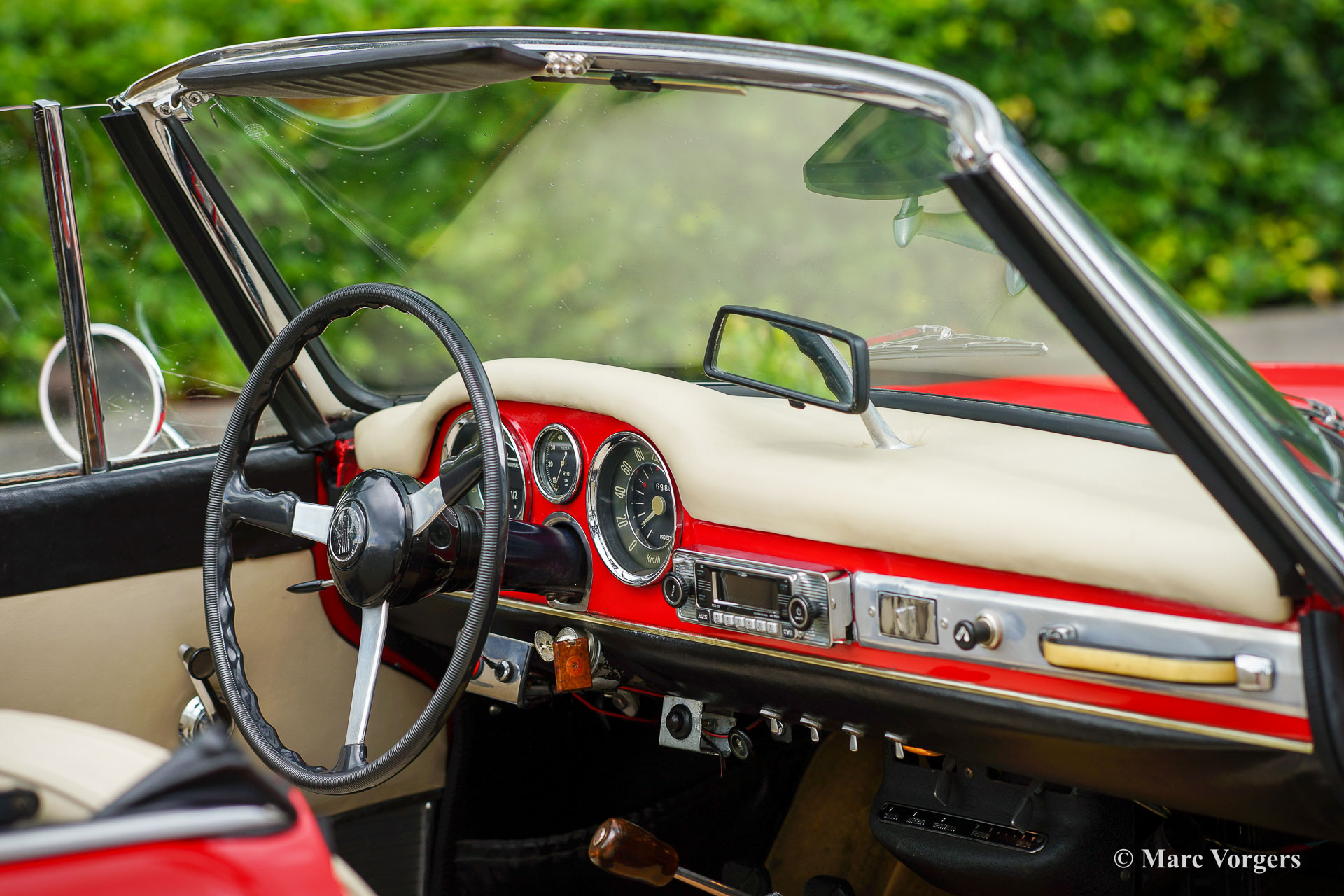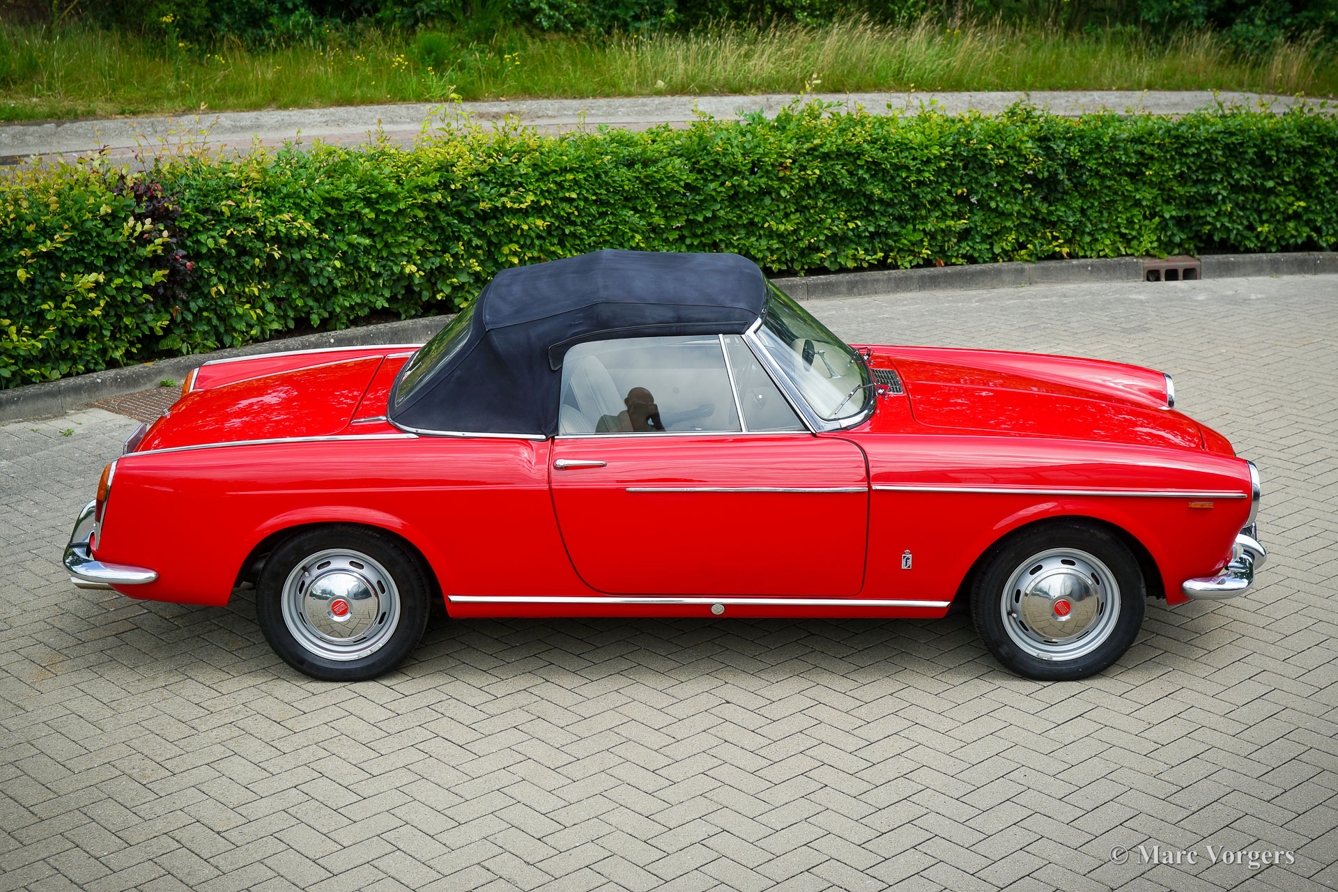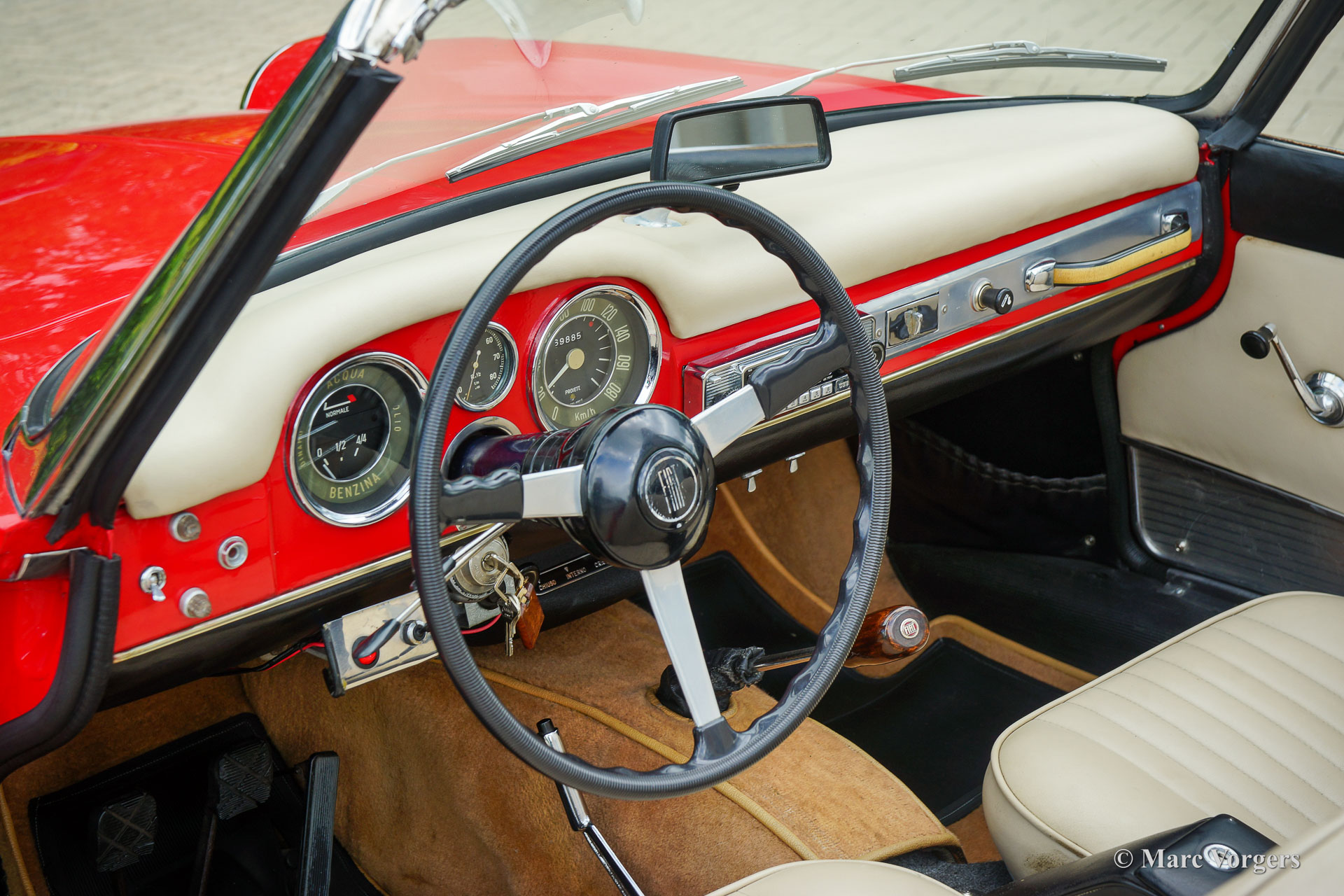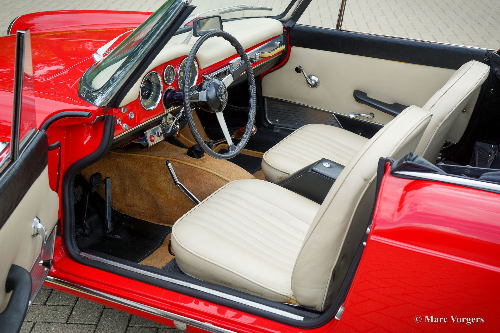 Fiat 1500 cabriolet, year 1963. Colour red combined with a pale beige leatherette interior trimmed with beige carpet. Black hood. The Fiat 1500 cabriolet is a wonderful design by Pininfarina, much appreciated by the ‘audience’ in the streets when driving this car on a sunny day. This very good example shows all the original details, the odometer reads 69.886 kilometres. This Fiat cabriolet is fitted with the more powerful 1500 engine instead of the 1200 unit. The Fiat 1500 is a delightful touring cabriolet which offers ample comfort, speed, and space for two on a pan-European holiday trip! A black Fiat Osca hard top is available separately. This Fiat 1500 cabriolet is a desirable driver car to be enjoyed to the fullest by a proud new owner.