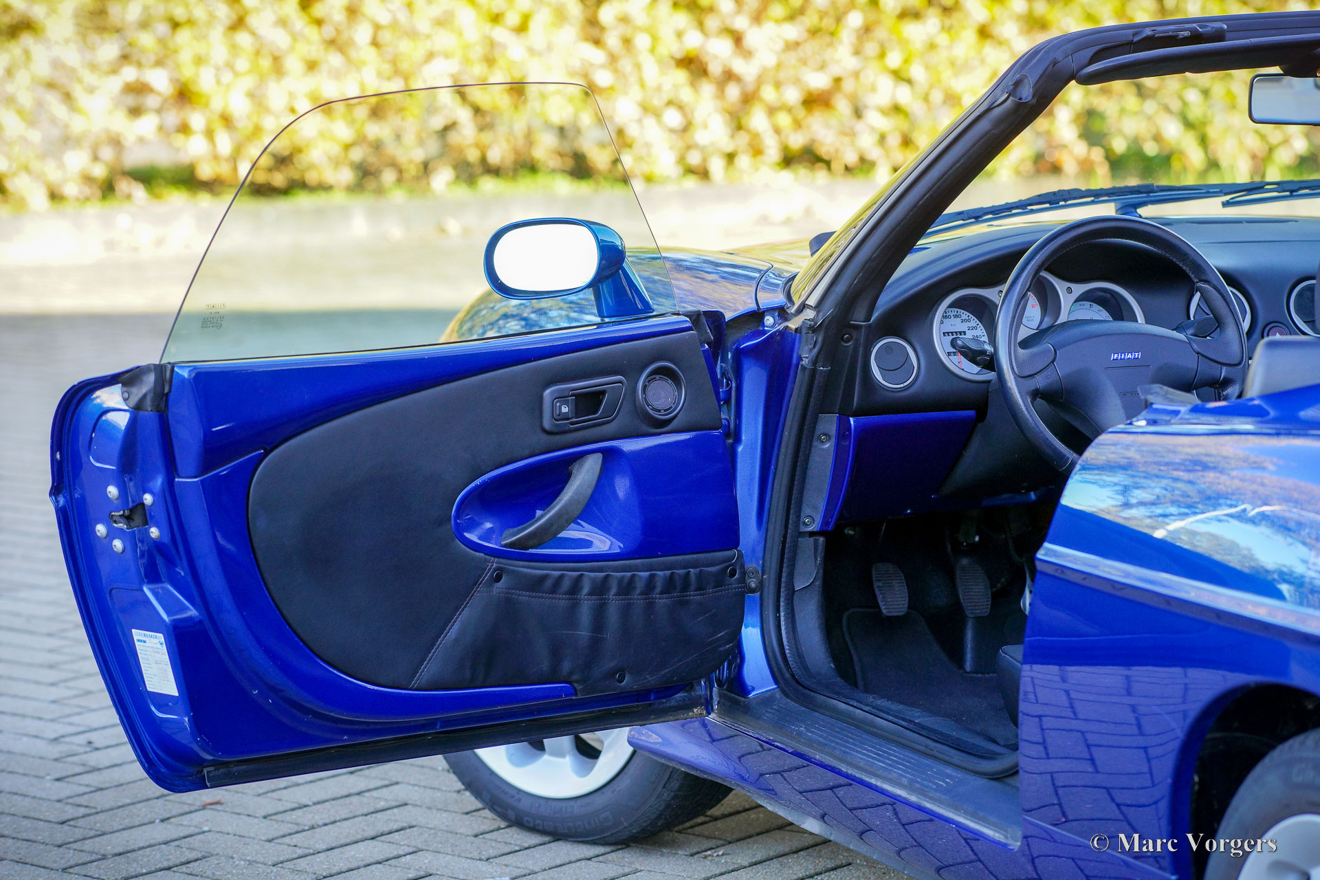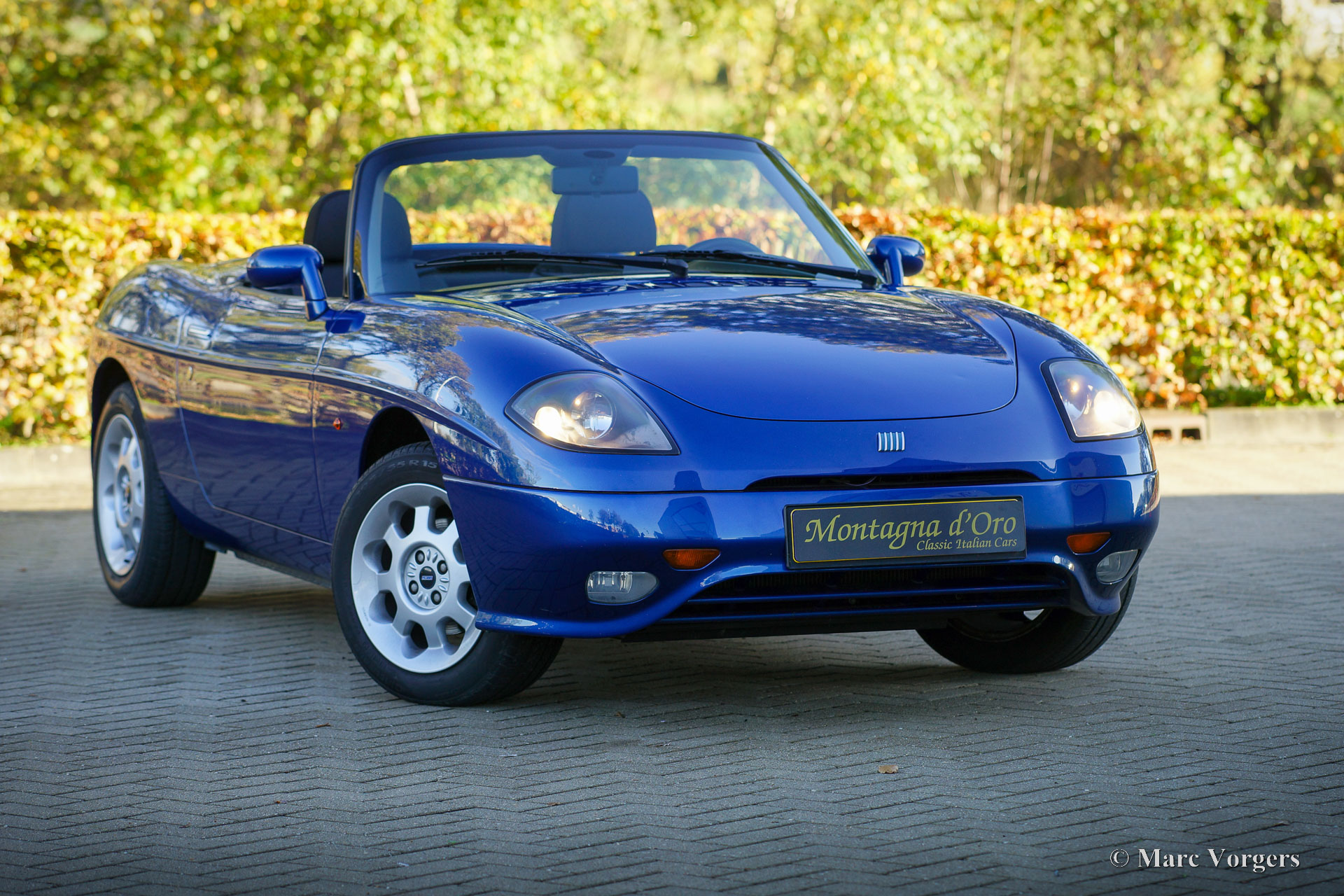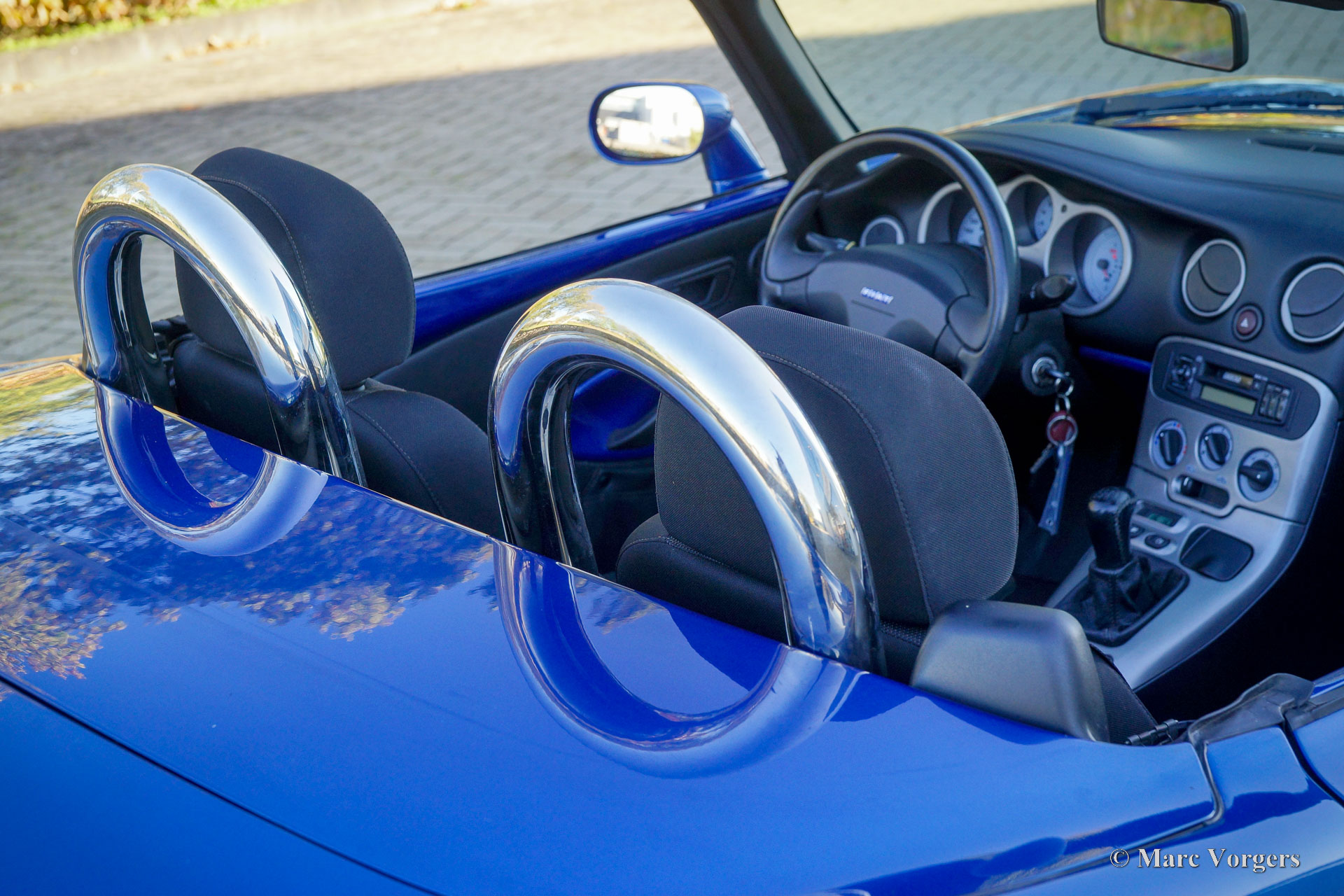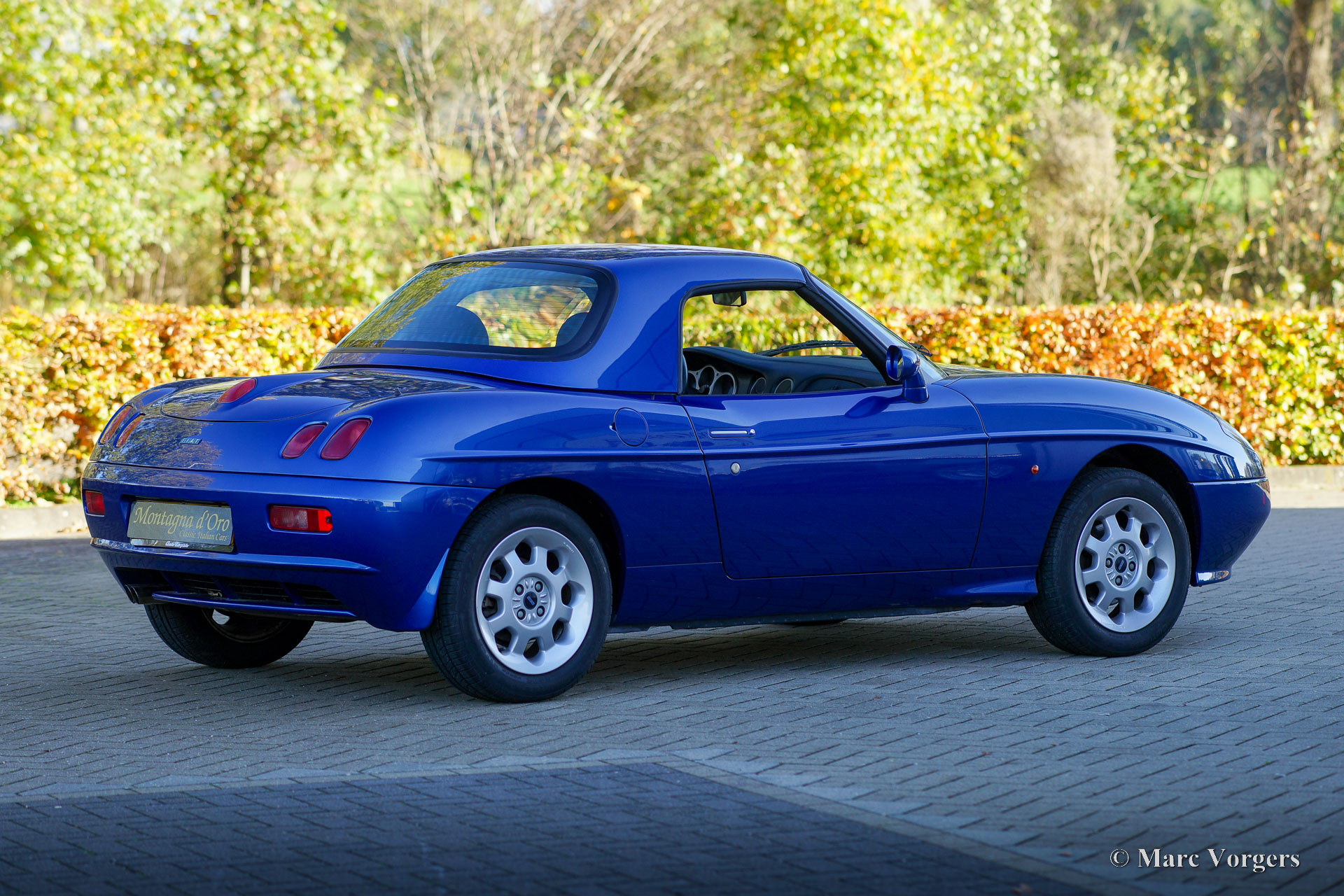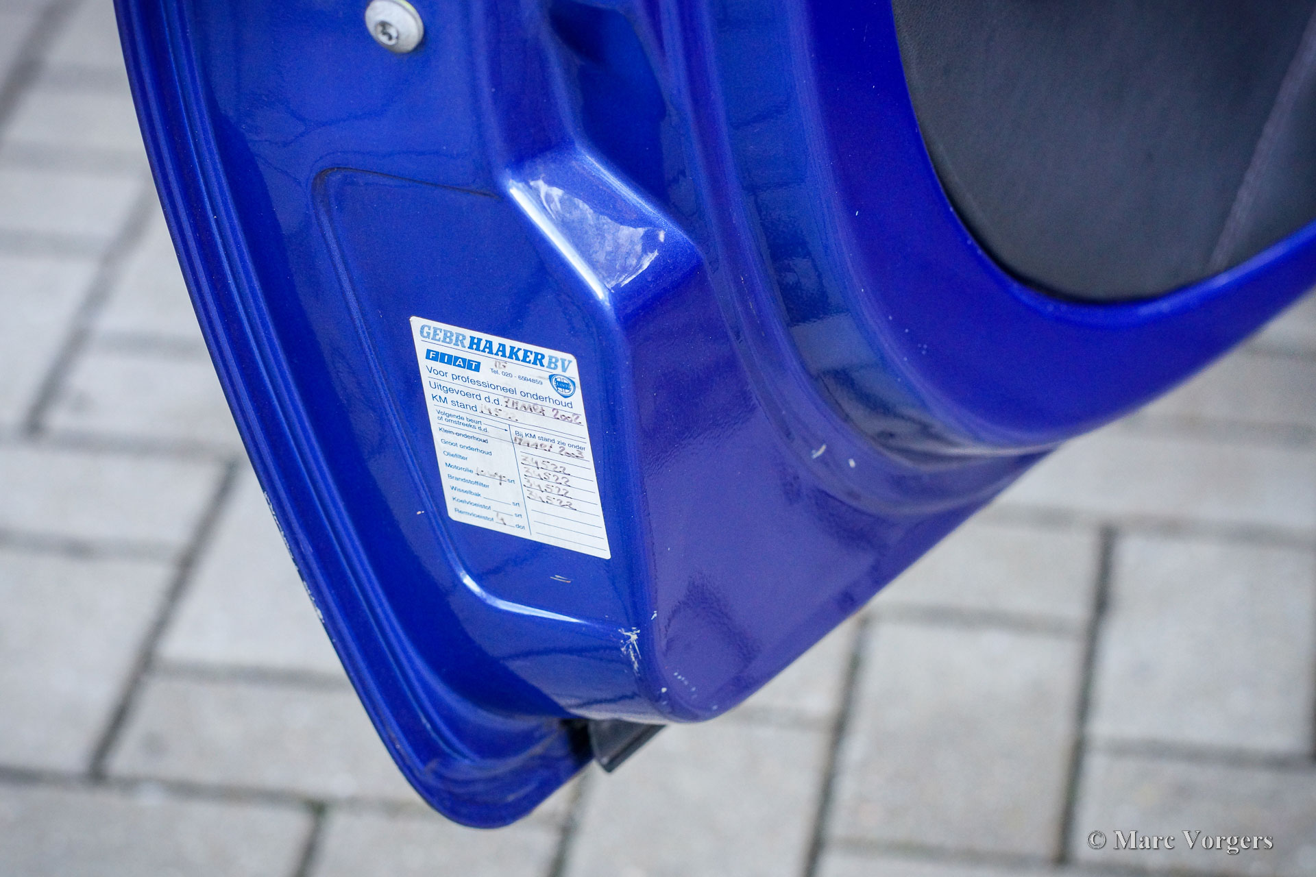 Fiat Barchetta 1.8 16V, year 2001. Colour blue metallic combined with a grey interior. Black soft top and hard top in body colour. The Fiat Barchetta (which means small boat in Italian) was presented in 1995 and built until 2005. For the 2001 model year the Barchetta was given tiny updates like the brake light on the boot lid. This fantastic Fiat Barchetta was sold new in the Netherlands, the car was cherished by one careful owner from new! This Barchetta is in an excellent original condition showing only the slightest signs of previous use. The odometer currently shows 39.304 km. The Dutch registration number is 77-GZ-BB, the car comes with a correct NAP. This fine Fiat Barchetta comes with desirable extra’s like the hard top with heated window, a ‘wind stop’, chrome baggage rack, and chrome roll bars which can be mounted behind the seats. This is a very desirable example in excellent condition!