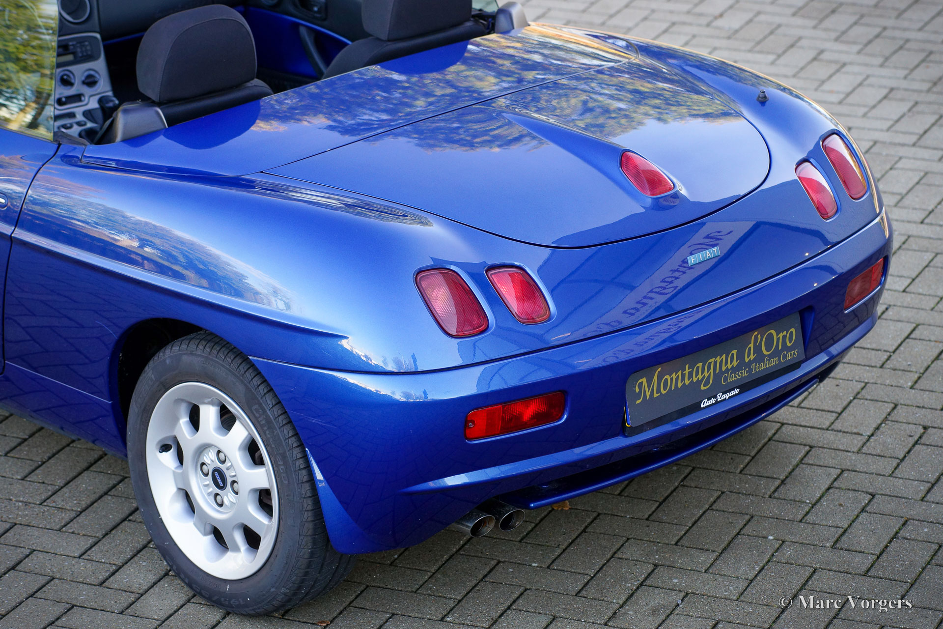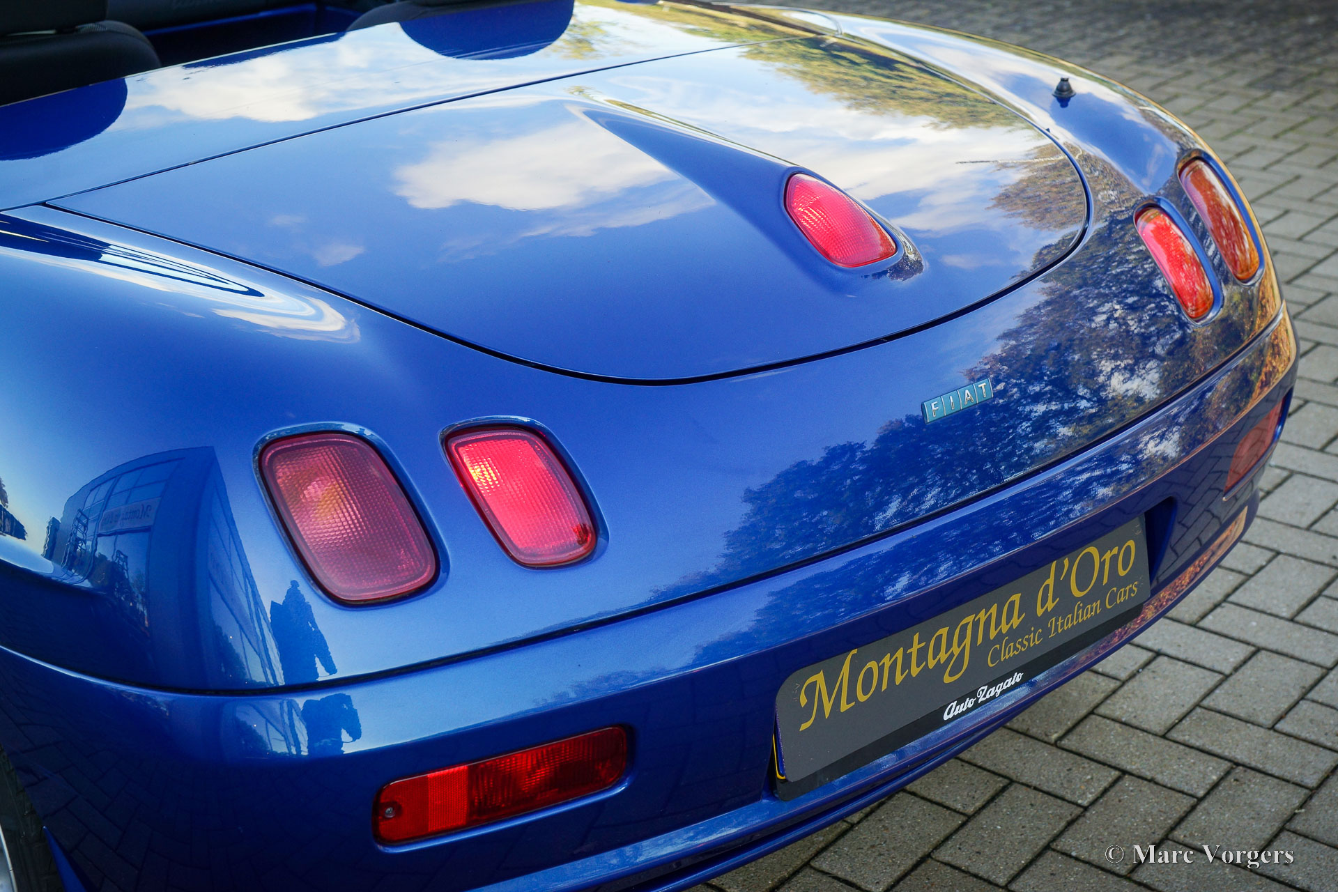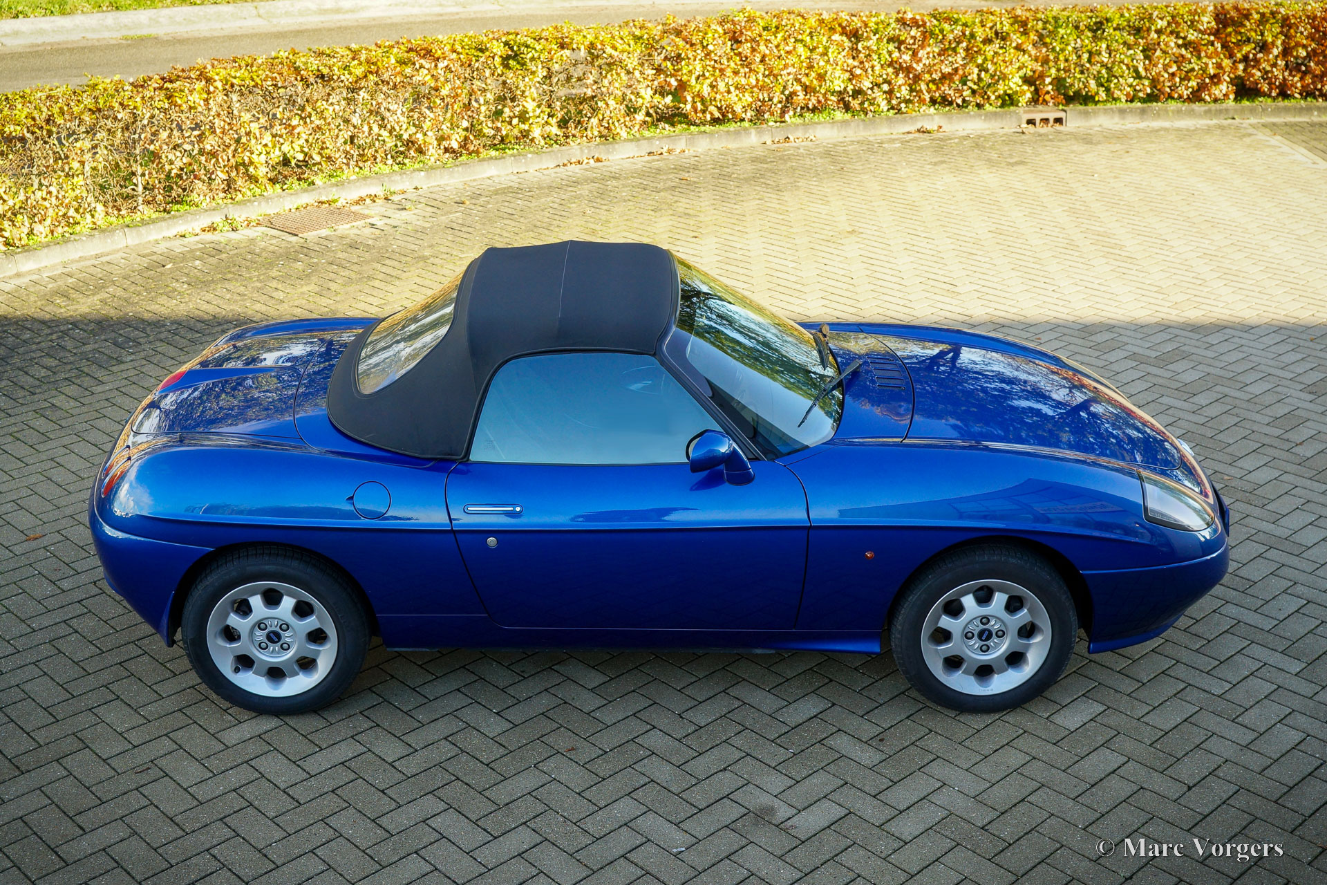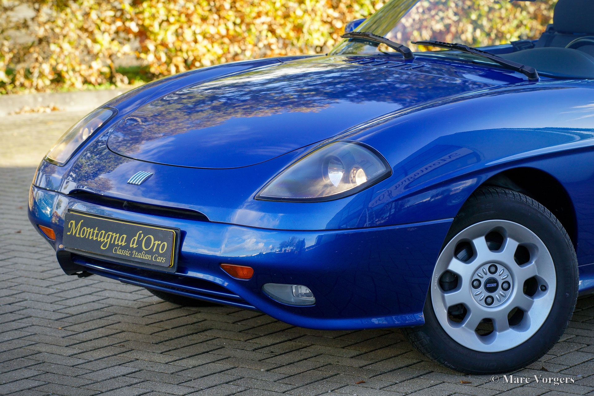Fiat Barchetta 1.8 16V, year 2001. Colour blue metallic combined with a grey interior. Black soft top and hard top in body colour. The Fiat Barchetta (which means small boat in Italian) was presented in 1995 and built until 2005. For the 2001 model year the Barchetta was given tiny updates like the brake light on the boot lid. This fantastic Fiat Barchetta was sold new in the Netherlands, the car was cherished by one careful owner from new! This Barchetta is in an excellent original condition showing only the slightest signs of previous use. The odometer currently shows 39.304 km. The Dutch registration number is 77-GZ-BB, the car comes with a correct NAP. This fine Fiat Barchetta comes with desirable extra’s like the hard top with heated window, a ‘wind stop’, chrome baggage rack, and chrome roll bars which can be mounted behind the seats. This is a very desirable example in excellent condition!