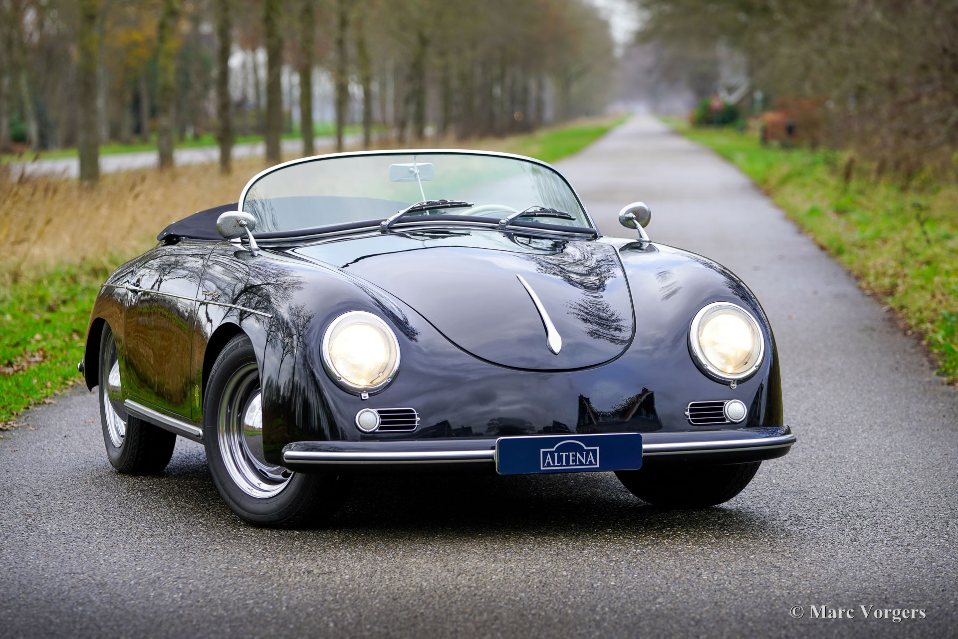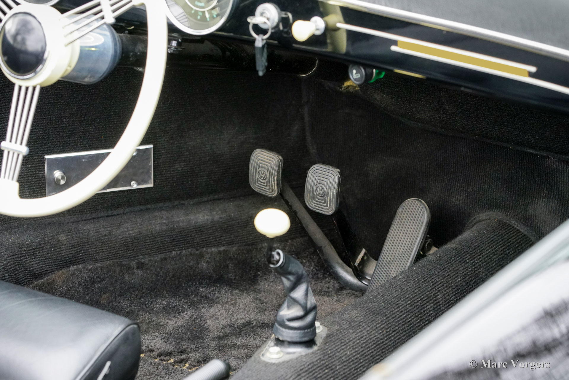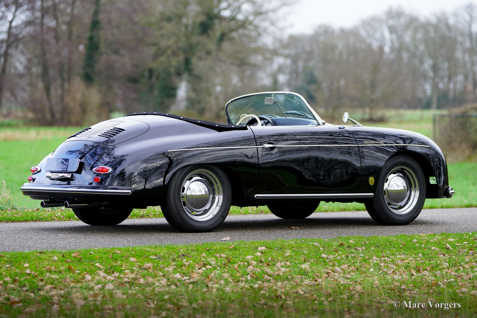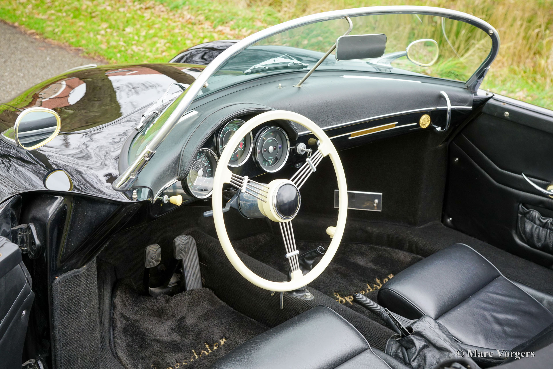 356 Speedster ‘recreation’, year 1965. Finished in ‘triple black’ with black bodywork, a black interior, and a black soft top this gorgeous 356 Speedster recreation looks stunning! This wonderful 356 Speedster recreation was built on a shortened 1965 VW Beetle chassis. The bodywork of this recreation was sculpted to exactly match the original 356 A Speedster (with the curved windscreen) produced by Porsche between 1955 and 1959 and is made from GRP instead of metal. All the recreated exterior and interior details match the looks of the original. The dashboard, the gauges, the steering wheel, the shift sick, door handles, logos and badges (removed in the photos) front- and rear lamps, wheels and wheel covers all match the original. The plush floor mats are a later addition, but they add a comfy touch to this spartan sport car! The air-cooled VW four-cylinder boxer engine delivers a spirited performance and produces an impressive soundtrack. This 356 Speedster replica is in a wonderful and very good condition; the car shows only slight signs of previous use. The car comes with black mohair weather equipment (soft-top, tonneau cover and side screens) and is road registered in the Netherlands. Only about 4144 (2910 A-models) original Porsche 356 Speedsters were built by Porsche, these cars are rare, very much sought after, and therefore very expensive. A good recreation is quite affordable and can be the ideal substitute for many to enjoy the beauty, style and very special driving experience of a 356 Speedster. This is a gorgeous example which can from the outside only be distinguished from an original by a specialist.