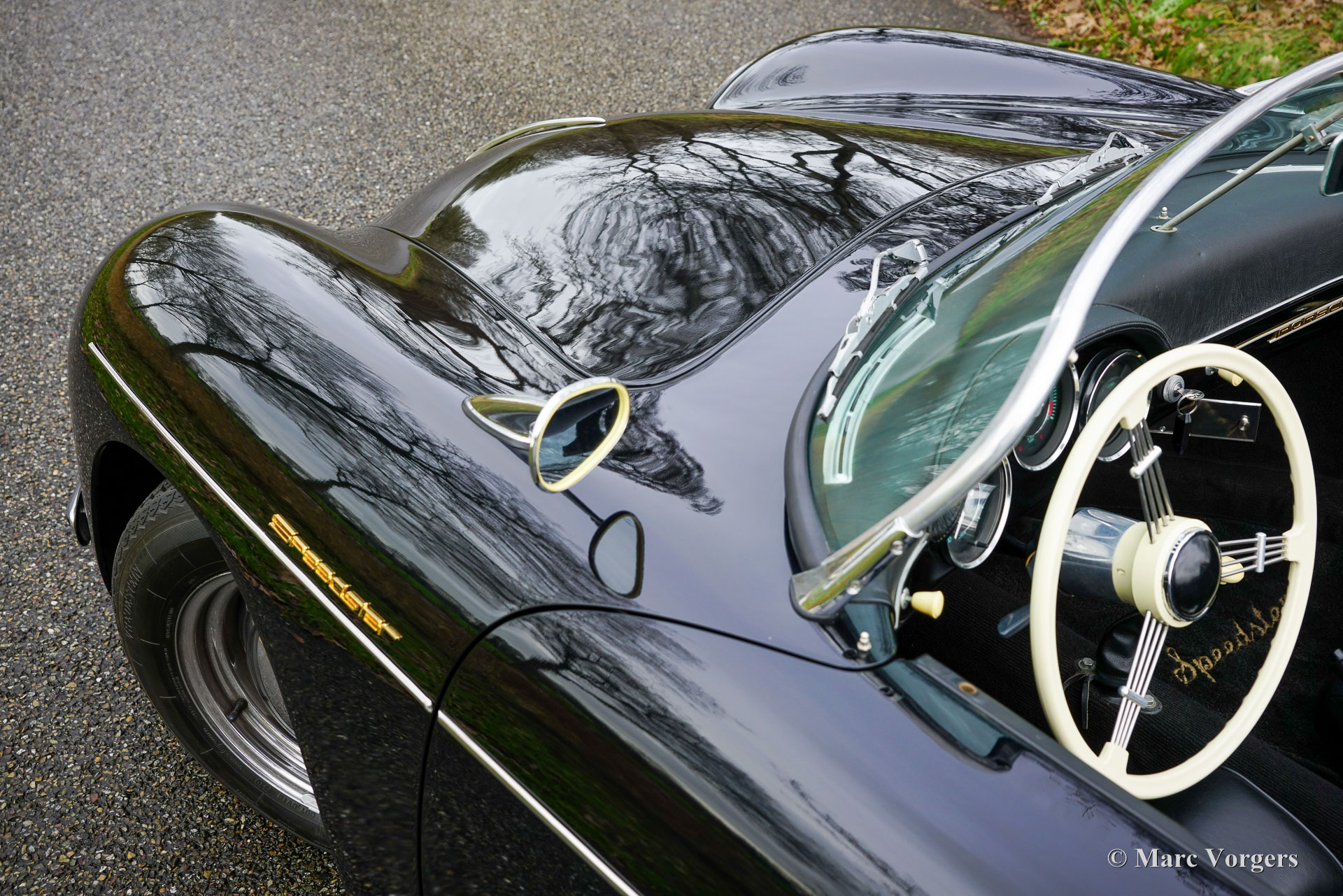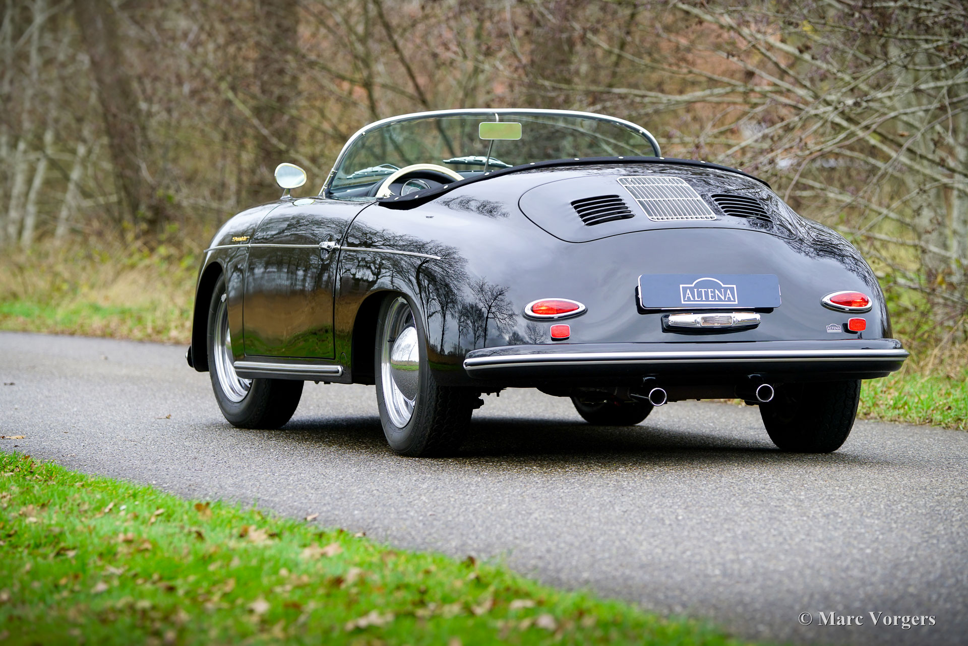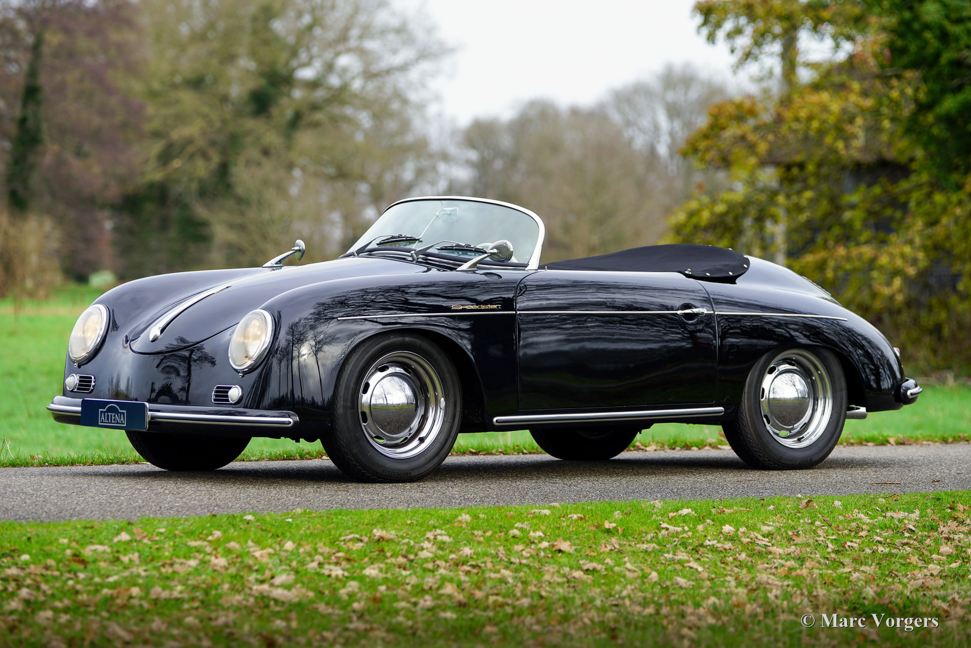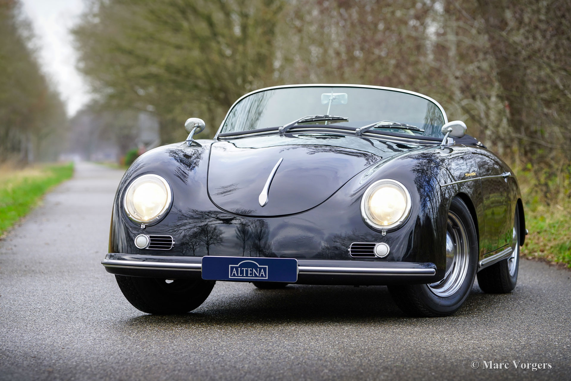 356 Speedster ‘recreation’, year 1965. Finished in ‘triple black’ with black bodywork, a black interior, and a black soft top this gorgeous 356 Speedster recreation looks stunning! This wonderful 356 Speedster recreation was built on a shortened 1965 VW Beetle chassis. The bodywork of this recreation was sculpted to exactly match the original 356 A Speedster (with the curved windscreen) produced by Porsche between 1955 and 1959 and is made from GRP instead of metal. All the recreated exterior and interior details match the looks of the original. The dashboard, the gauges, the steering wheel, the shift sick, door handles, logos and badges (removed in the photos) front- and rear lamps, wheels and wheel covers all match the original. The plush floor mats are a later addition, but they add a comfy touch to this spartan sport car! The air-cooled VW four-cylinder boxer engine delivers a spirited performance and produces an impressive soundtrack. This 356 Speedster replica is in a wonderful and very good condition; the car shows only slight signs of previous use. The car comes with black mohair weather equipment (soft-top, tonneau cover and side screens) and is road registered in the Netherlands. Only about 4144 (2910 A-models) original Porsche 356 Speedsters were built by Porsche, these cars are rare, very much sought after, and therefore very expensive. A good recreation is quite affordable and can be the ideal substitute for many to enjoy the beauty, style and very special driving experience of a 356 Speedster. This is a gorgeous example which can from the outside only be distinguished from an original by a specialist.