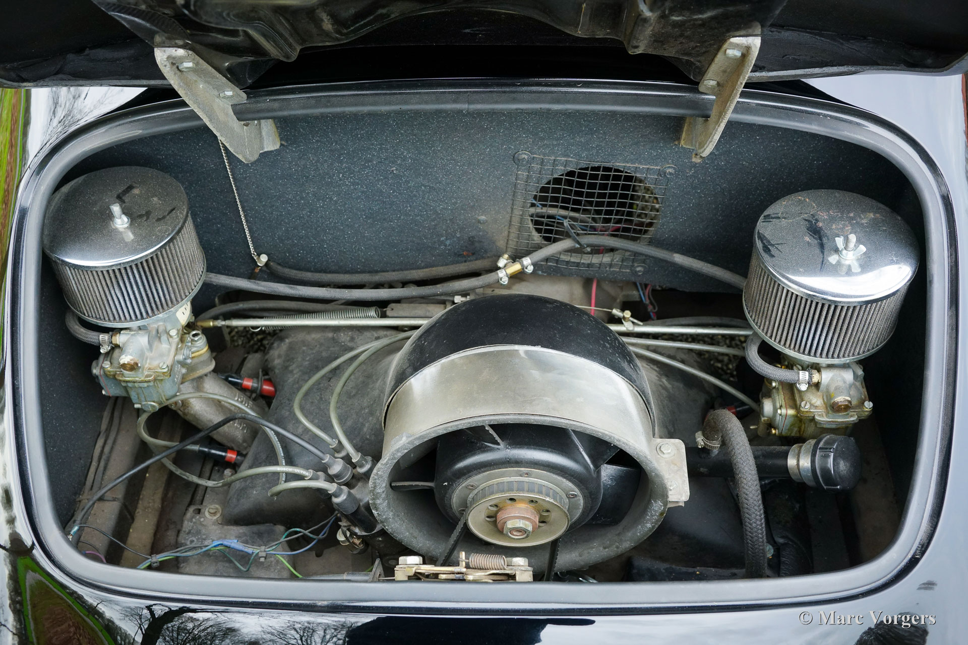 The Porsche 911 was designed with a steel unitary bodywork construction in which the engine was located behind the rear axle. The 911 engine is a air-cooled six cylinder "boxer" engine. The suspension of the Porsche 911 was independent from the start as was a five speed gearbox with floor shift.