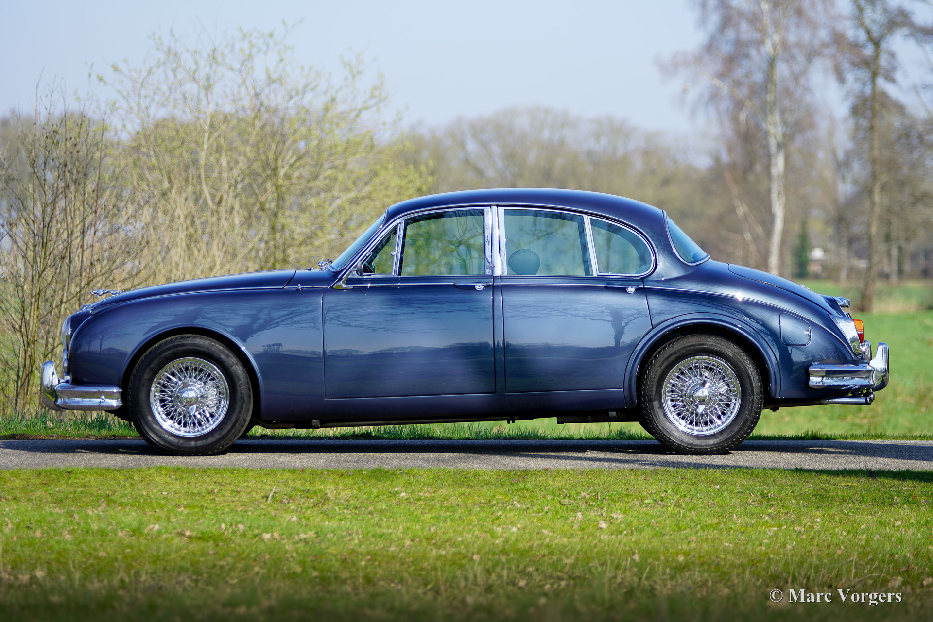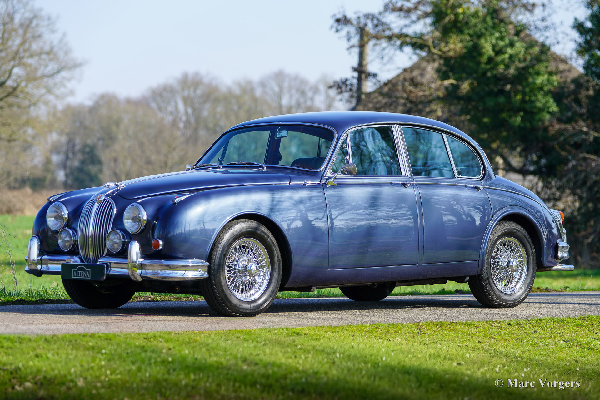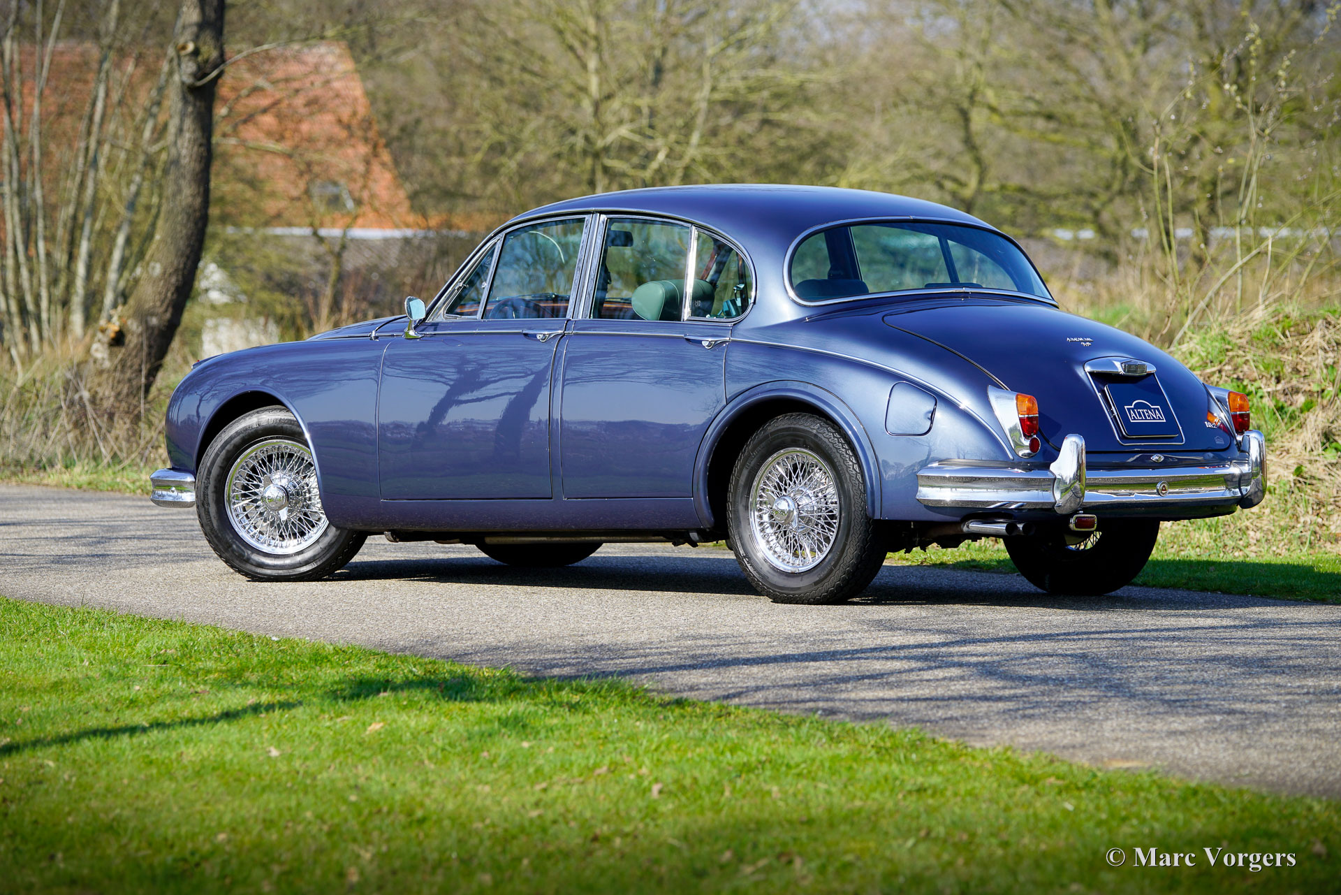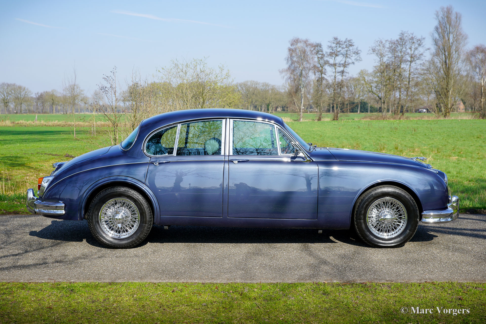 Jaguar Mk II (Mk 2) 3.8 Litre, year 1963. Chassis (VIN) number P222387BW, engine number LC5929-9. The exterior of this beautiful Jaguar Mk II is finished in Opalescent Blue (Metallic Blue) combined with a grey leather interior finished with blue carpet. This stunning example was fully restored a few years ago and underwent significant technical improvements. This Mk II is a classic car offering improved comfort, improved safety, and improved user-friendliness. This Jaguar is in excellent condition, and the driving experience is fantastic! The bodywork has been restored down to the bare metal and was extensively treated against rust. During the rebuild, various modernizations were implemented, making the car noticeably better to drive than a standard Mk II. The 3.8-liter six-cylinder engine has been completely overhauled and was lightly tuned for extra power, featuring an oil cooler, electric fan, and larger radiator for improved cooling. The engine is coupled to a fully synchronized five-speed gearbox, which enhances comfort and usability in today's traffic. The chassis features modified springs, adjustable shock absorbers, improved stabilizers, and a rear axle with a modified final drive ratio. The steering features power steering derived from a Jaguar XJS. The brakes have been upgraded all around with XJ6 discs and callipers and a more powerful brake servo. The interior has been completely renewed while retaining its classic appearance. Leather, wood trim, and carpet have been renewed and restored, extra insulation reduces road noise, and the fitted XJS seats offer greater comfort. Modern features such as cruise control, central locking, tinted glass, and halogen lighting are discreetly integrated. A beautiful Mota-Lita steering wheel with a wood rim provides the finishing touch to the stunning interior. The car has been well maintained and driven regularly since the restoration, making it ready for immediate use. Thanks to the elegant integration of the improvements, the distinctive atmosphere of a British 1960s saloon is preserved. The Jaguar Mk II with the 3.8-liter engine and manual gearbox was the top model of the series. This upgraded example adds a substantial extra layer of performance, comfort, safety, and finesse. This is an ideal Jaguar Mk II for Jaguar enthusiasts who want to regularly drive a classic in modern traffic and do not want to make any compromises.