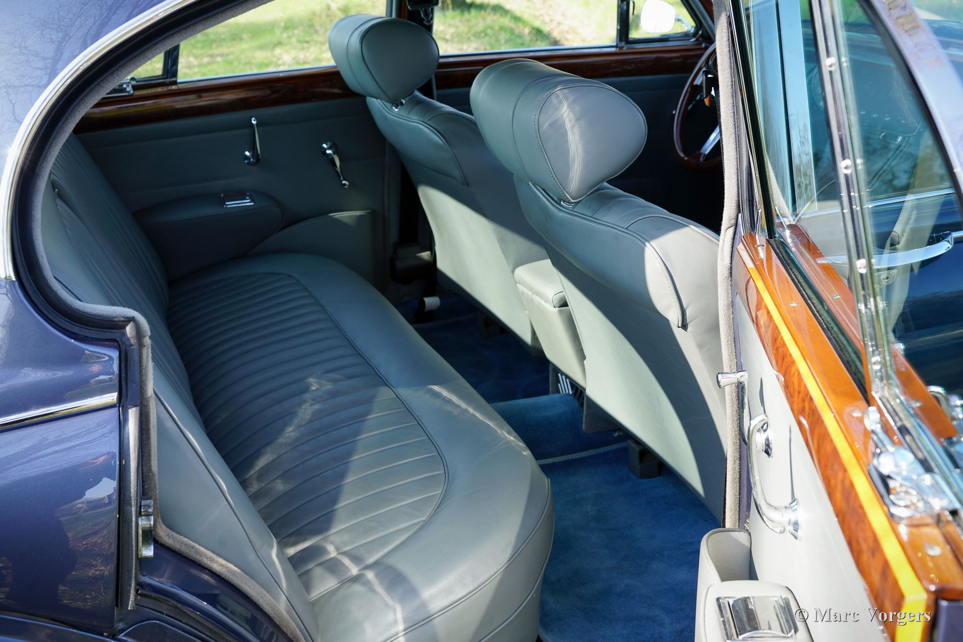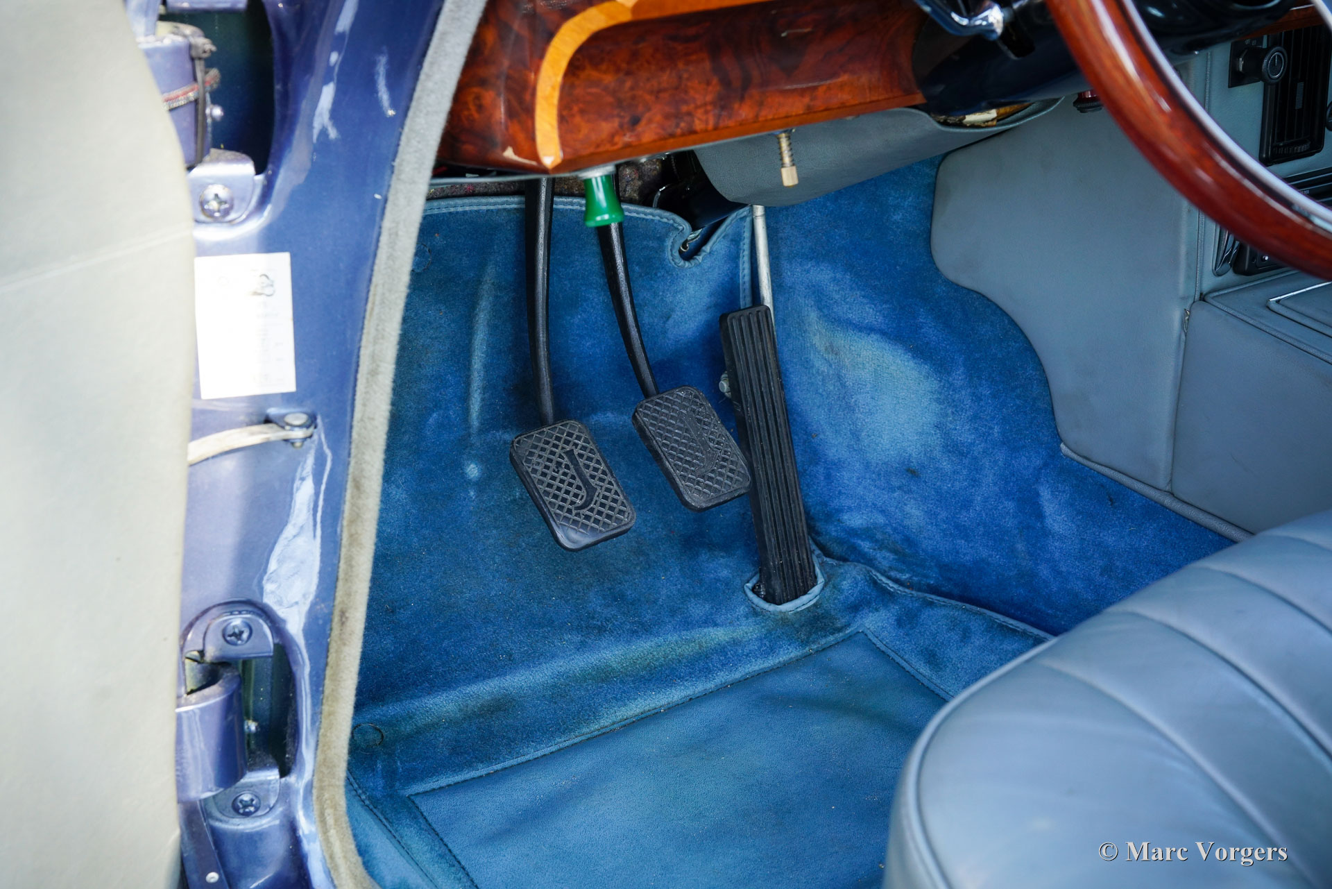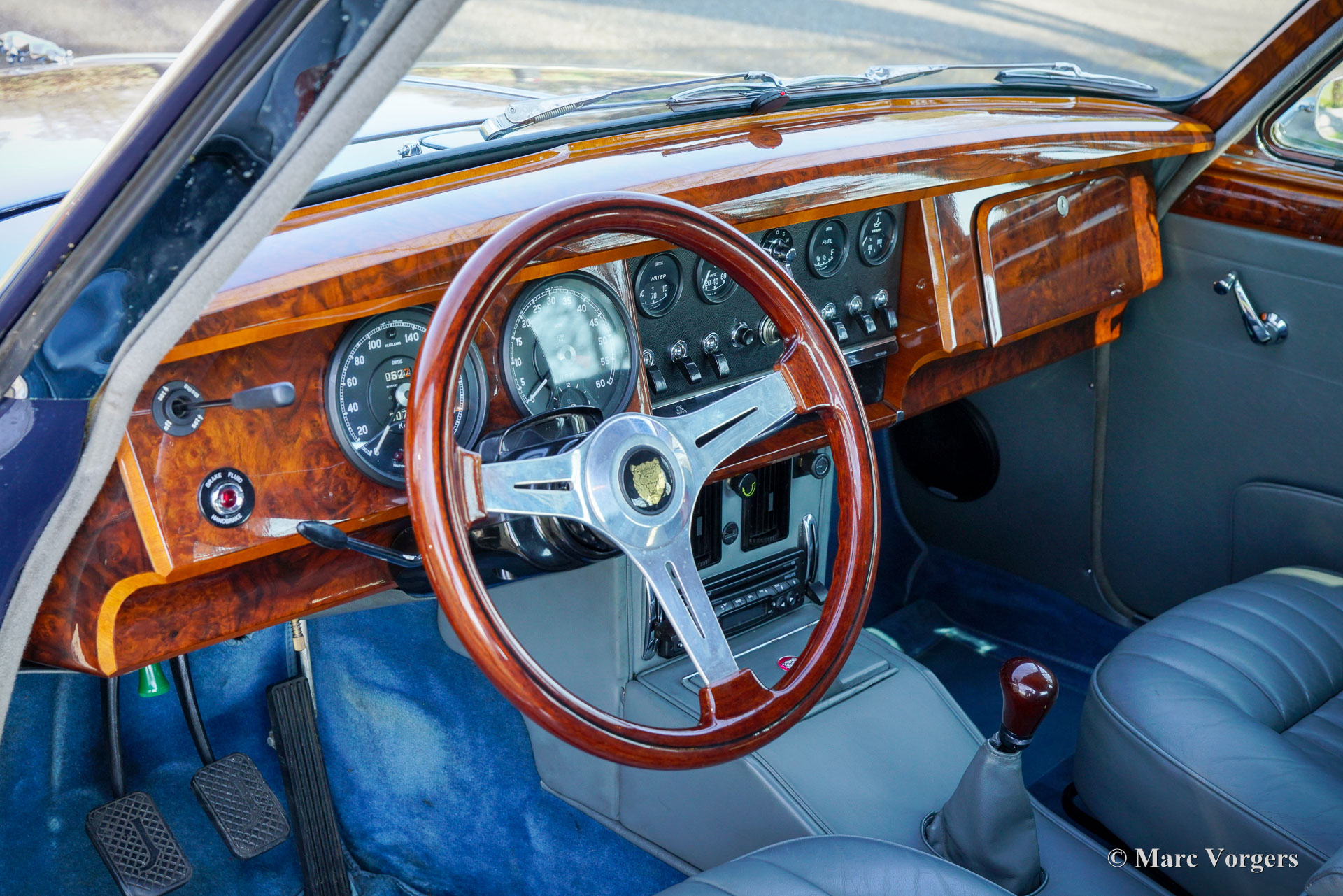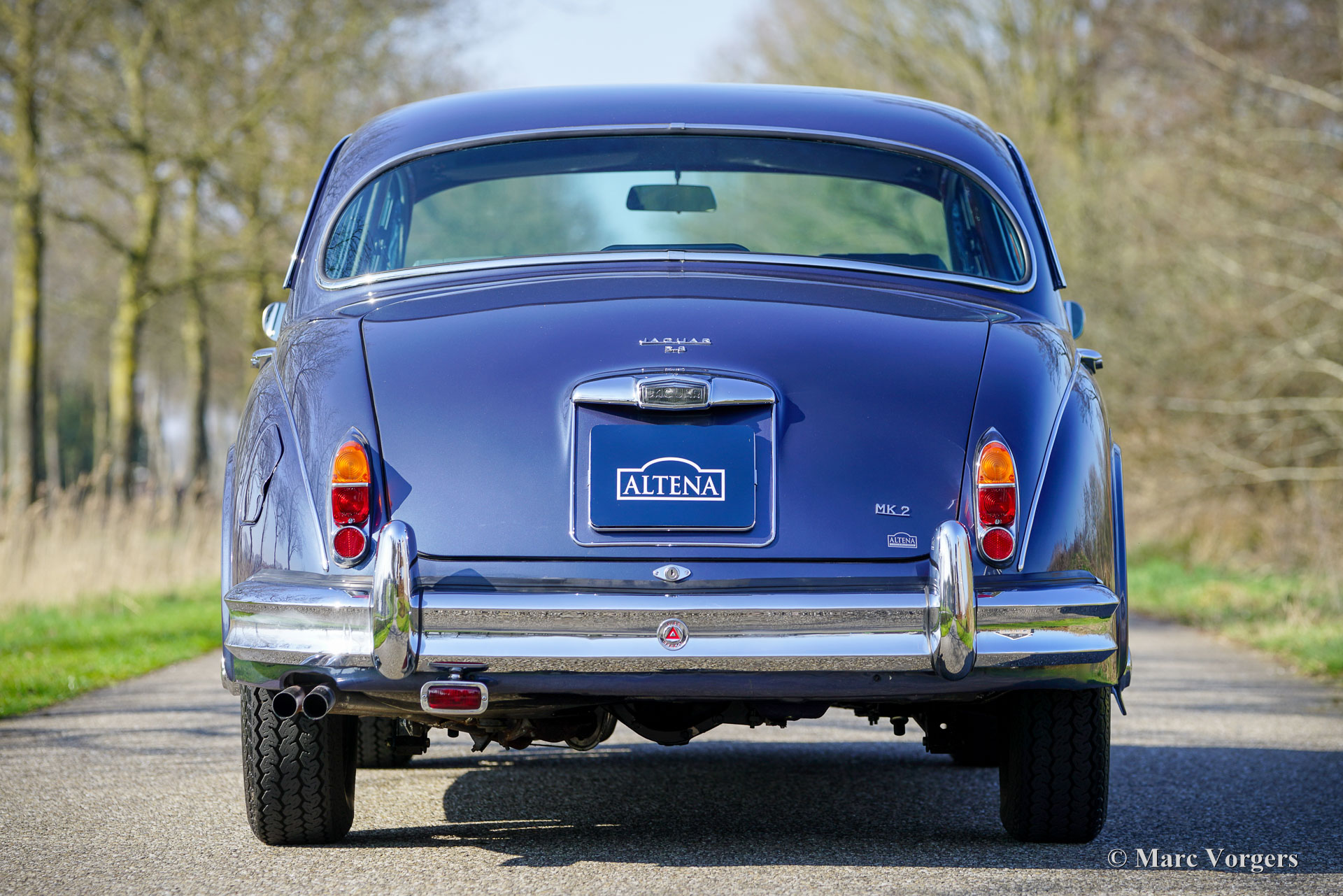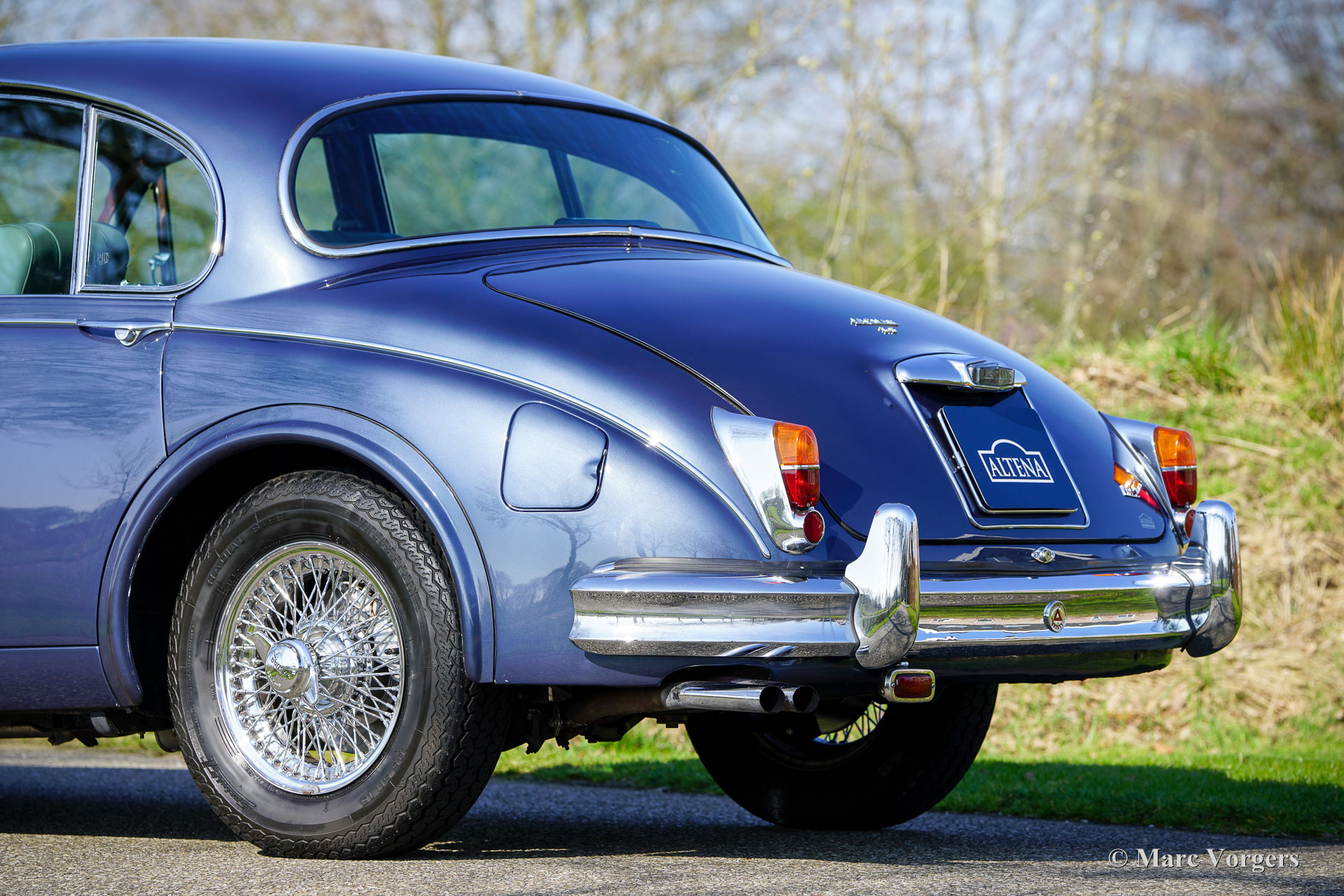 Jaguar Mk II (Mk 2) 3.8 Litre, year 1963. Chassis (VIN) number P222387BW, engine number LC5929-9. The exterior of this beautiful Jaguar Mk II is finished in Opalescent Blue (Metallic Blue) combined with a grey leather interior finished with blue carpet. This stunning example was fully restored a few years ago and underwent significant technical improvements. This Mk II is a classic car offering improved comfort, improved safety, and improved user-friendliness. This Jaguar is in excellent condition, and the driving experience is fantastic! The bodywork has been restored down to the bare metal and was extensively treated against rust. During the rebuild, various modernizations were implemented, making the car noticeably better to drive than a standard Mk II. The 3.8-liter six-cylinder engine has been completely overhauled and was lightly tuned for extra power, featuring an oil cooler, electric fan, and larger radiator for improved cooling. The engine is coupled to a fully synchronized five-speed gearbox, which enhances comfort and usability in today's traffic. The chassis features modified springs, adjustable shock absorbers, improved stabilizers, and a rear axle with a modified final drive ratio. The steering features power steering derived from a Jaguar XJS. The brakes have been upgraded all around with XJ6 discs and callipers and a more powerful brake servo. The interior has been completely renewed while retaining its classic appearance. Leather, wood trim, and carpet have been renewed and restored, extra insulation reduces road noise, and the fitted XJS seats offer greater comfort. Modern features such as cruise control, central locking, tinted glass, and halogen lighting are discreetly integrated. A beautiful Mota-Lita steering wheel with a wood rim provides the finishing touch to the stunning interior. The car has been well maintained and driven regularly since the restoration, making it ready for immediate use. Thanks to the elegant integration of the improvements, the distinctive atmosphere of a British 1960s saloon is preserved. The Jaguar Mk II with the 3.8-liter engine and manual gearbox was the top model of the series. This upgraded example adds a substantial extra layer of performance, comfort, safety, and finesse. This is an ideal Jaguar Mk II for Jaguar enthusiasts who want to regularly drive a classic in modern traffic and do not want to make any compromises.