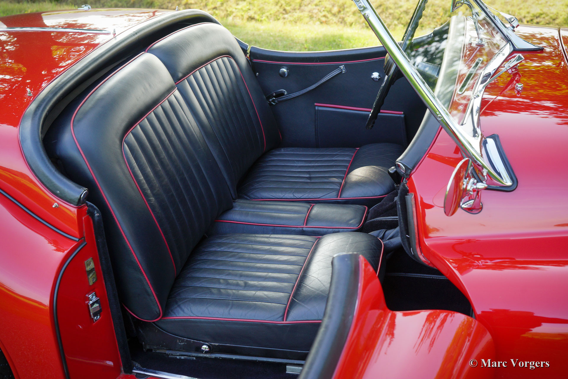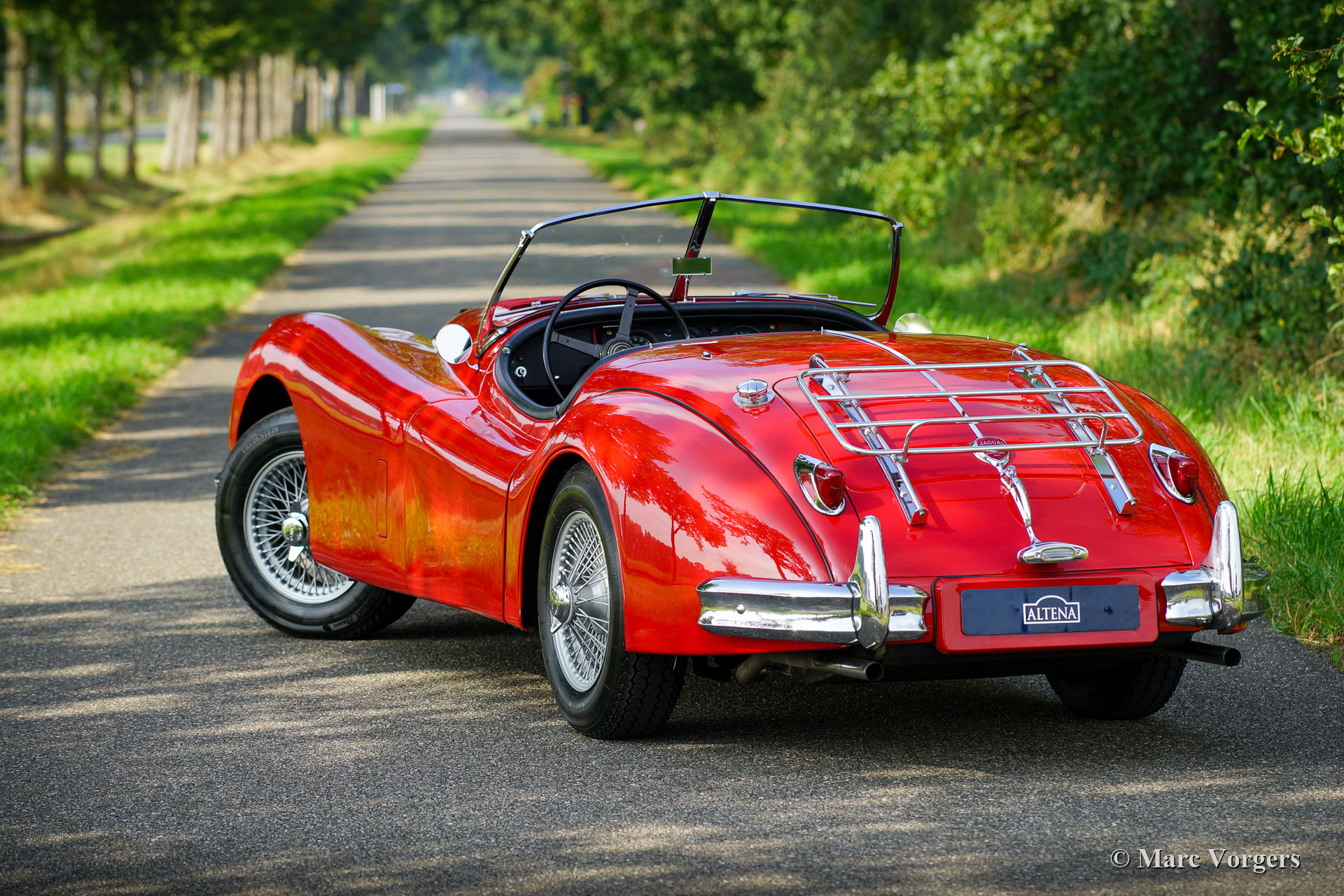 Jaguar XK 140 3.4 Litre OTS, year 1957. This is a matching numbers car, a Heritage certificate to confirm this is present. Colour red combined with a black leather interior trimmed with red piping and black carpet. Black mohair soft-top, tonneau cover and side-screens. This wonderful Jaguar XK 140 Open Two Seater (also named roadster in the US) was sold new to the US. In the year 1996 the automobile was shipped to the Netherlands where an extensive nut and bolt restoration was executed. The restoration was done to perfection and the car was serviced and maintained beautifully ever since. The car is mechanically and technically fully up to date. This gorgeous Jaguar XK 140 roadster is in an excellent condition, and it comes complete with a complete history file. This Jaguar shows wonderful details, and the car drives and handles perfectly. This XK 140 features silver painted wire wheels shod with Vredestein 185/16 Sprint Classic tyres, louvers in the bonnet for improved cooling, a ‘fast filler’ petrol cap, a Stainless-Steel baggage rack, a chrome badge bar on the front bumper and a pair of Lucas SFT 576 wide beam fog lamps with mesh protectors at the front. Furthermore, the car is fitted with an alarm system This is a highly desirable specimen in excellent condition!