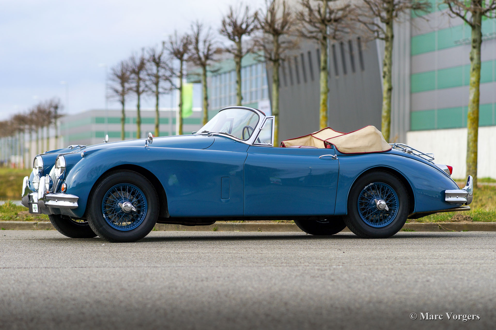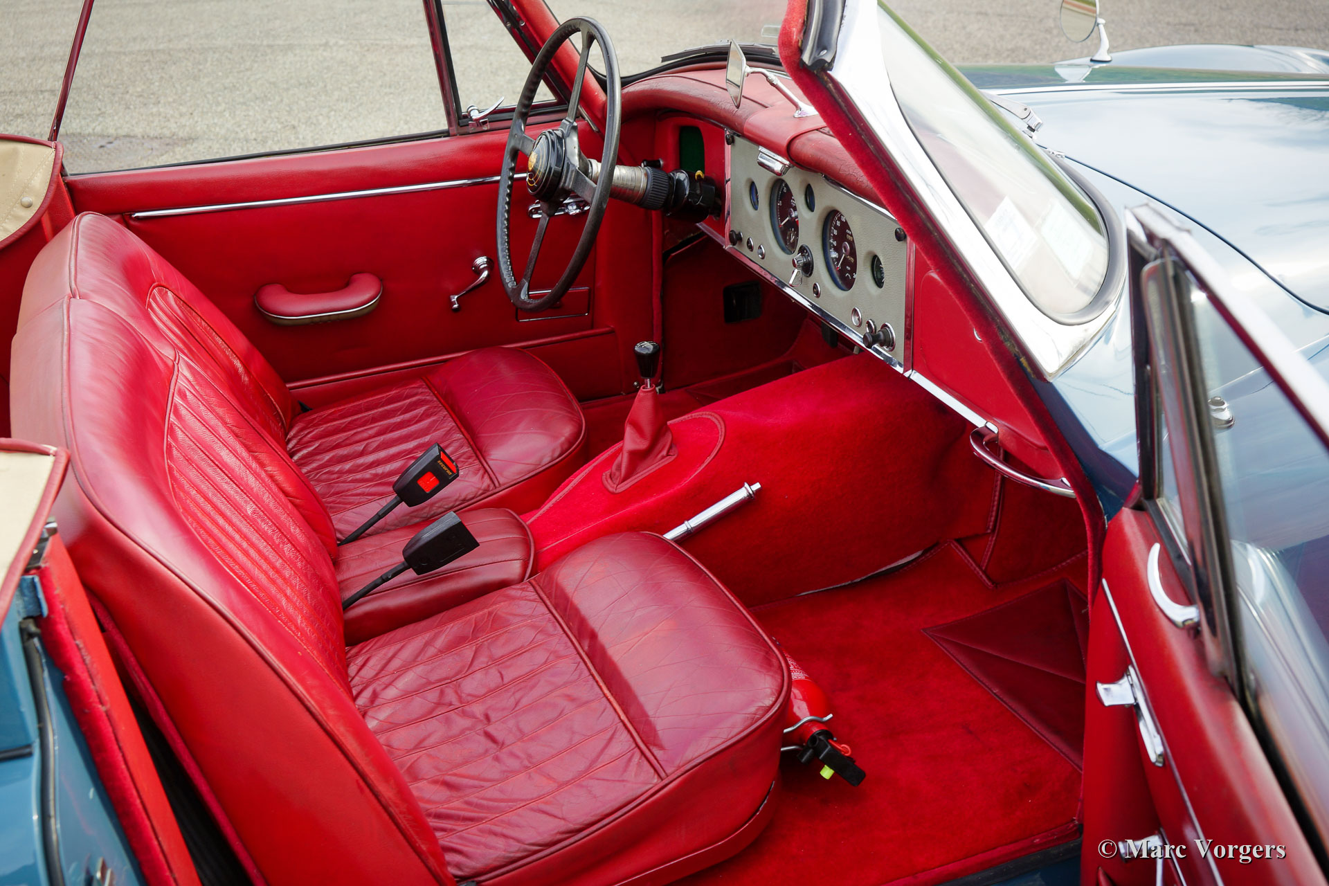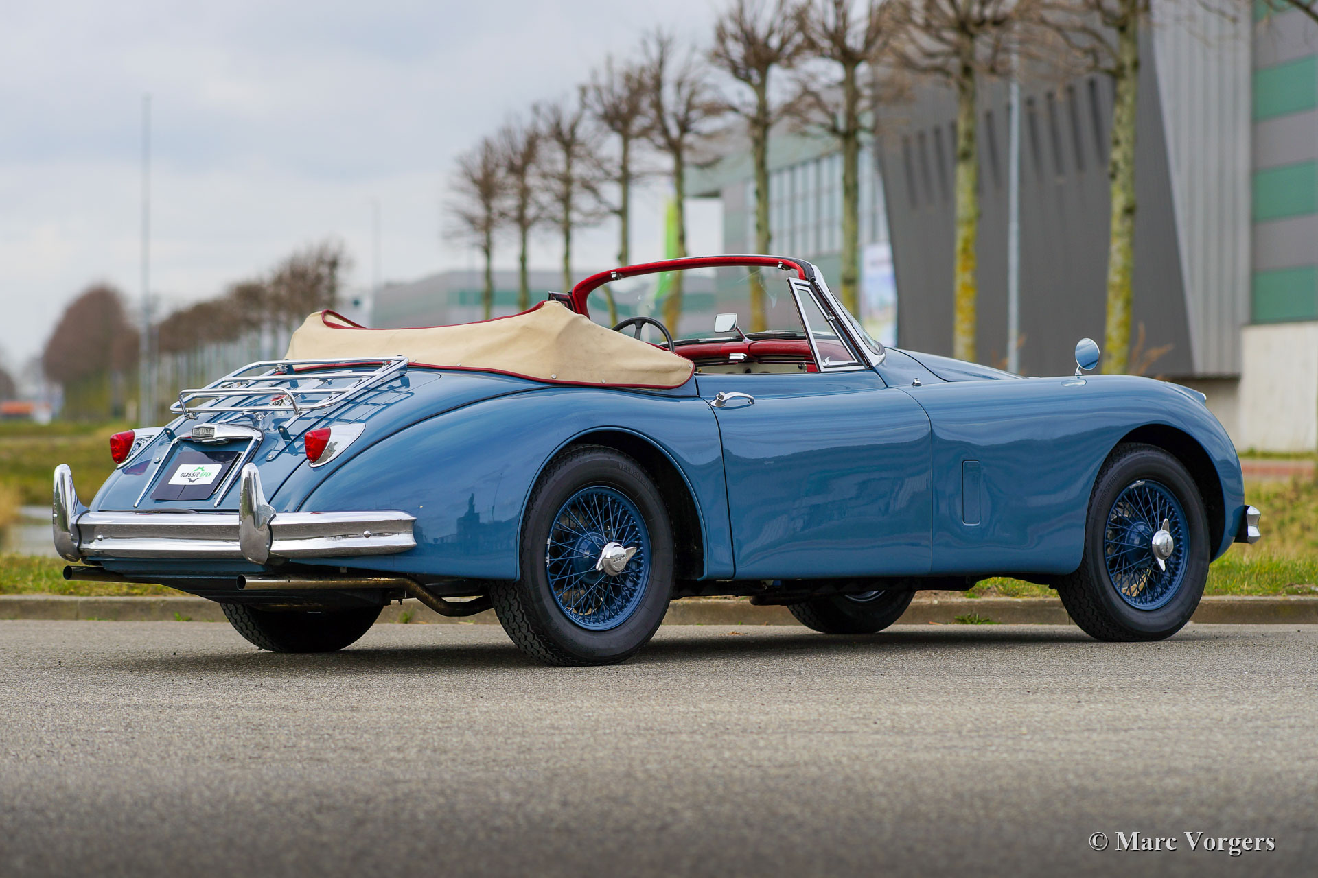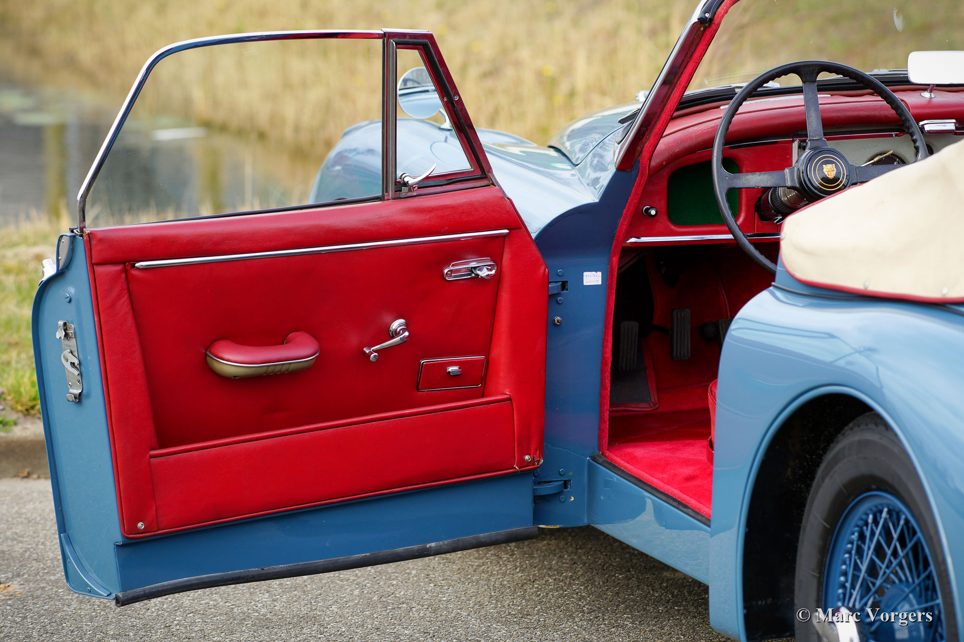 Jaguar XK 150 DHC, 1959. Colour Cotswold blue combined with blue wire wheels and a red leather interior trimmed with red carpet. This magnificent Jaguar XK 150 DHC (Drop Head Coupe) was sold new in the USA. The automobile was well serviced and maintained over the years, the car is in a good to very good driver condition with slight signs of use and age. This Jaguar XK 150 DHC is a true ‘head turner’ with its sleek appearance, wonderful colour scheme and the sporty exhaust note. This XK 150 does not only offer show, but the new proud owner is also in for a lot of go! The car is fitted with a powerful Jaguar 4.2 Litre E-type 265 bhp spec engine, a modern 5-speed manual gearbox, and a Stainless-Steel exhaust system. This Jaguar XK 150 drives and handles impressively powerful! The stopping power is also well catered for, the car features servo disc brakes on all four wheels. Furthermore, this gorgeous Jaguar is fitted with safety belts, wide beam Lucas SFT576 fog-lamps at the front, and a chrome baggage rack on the boot lid. This is an impressive Jaguar XK 150 DHC driver car which can be enjoyed to the fullest!