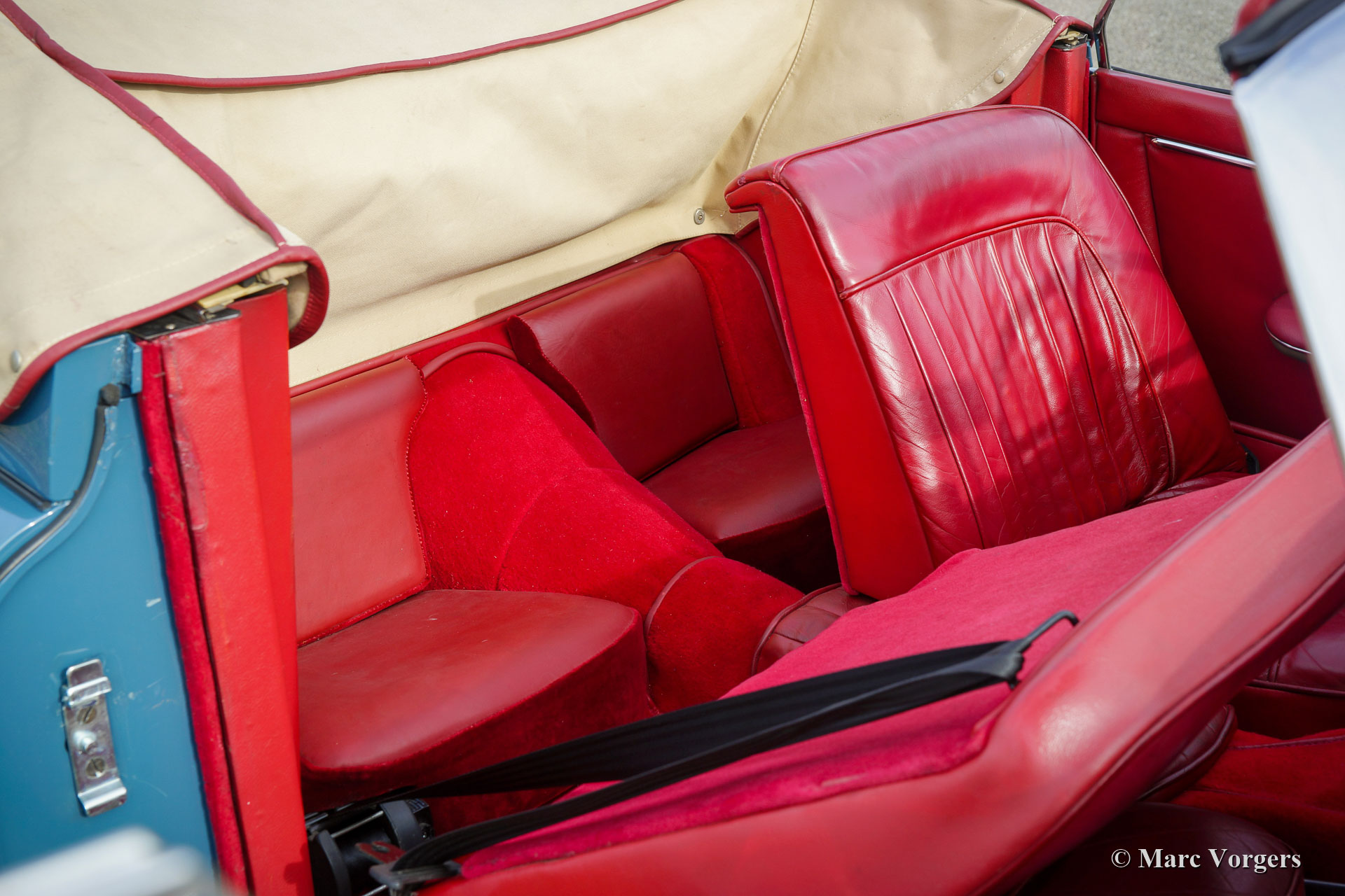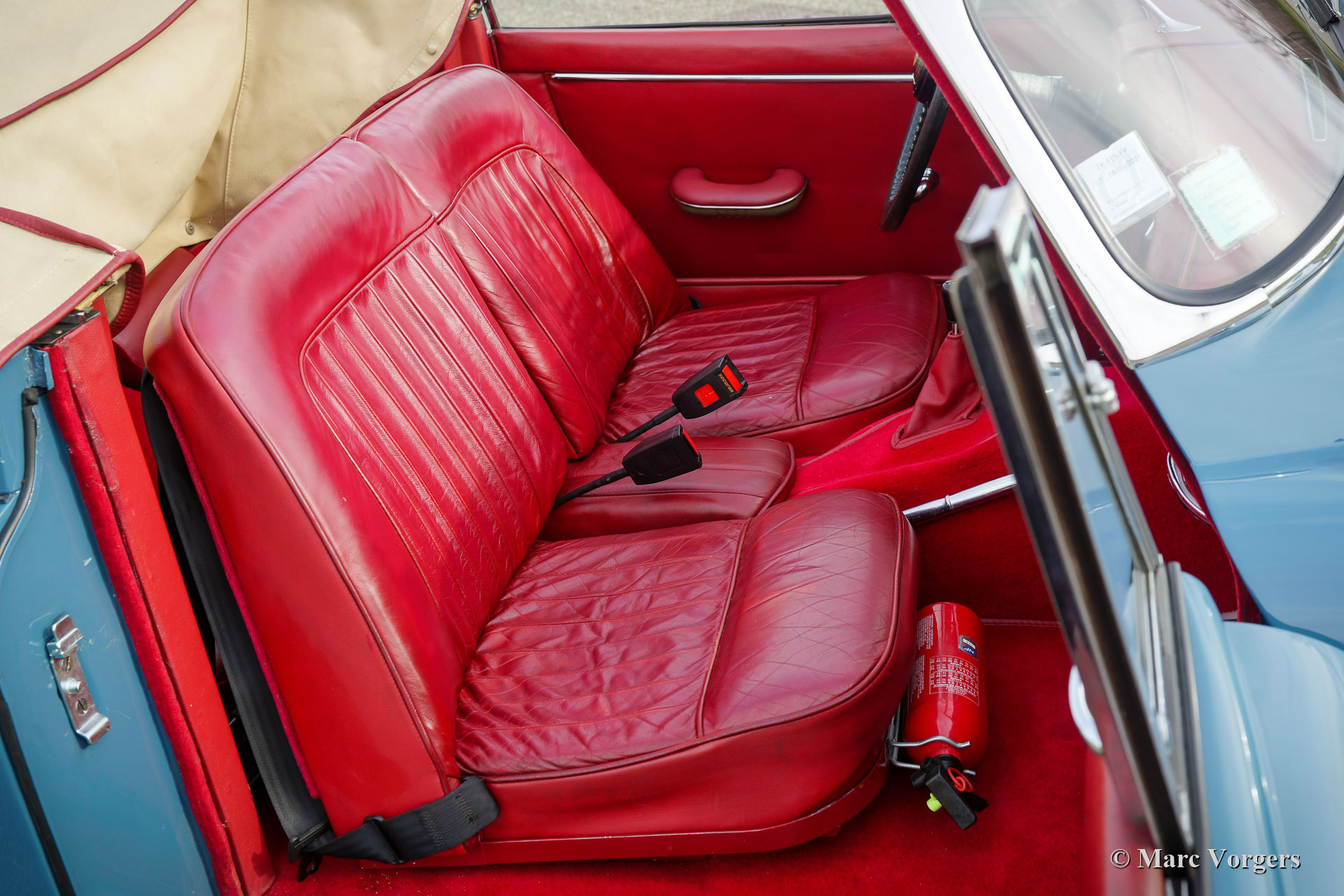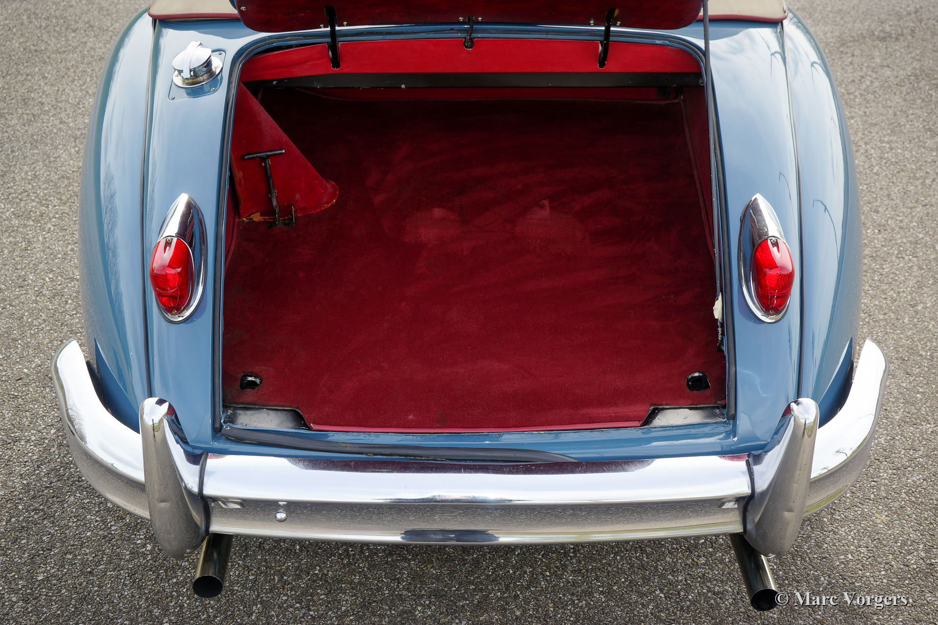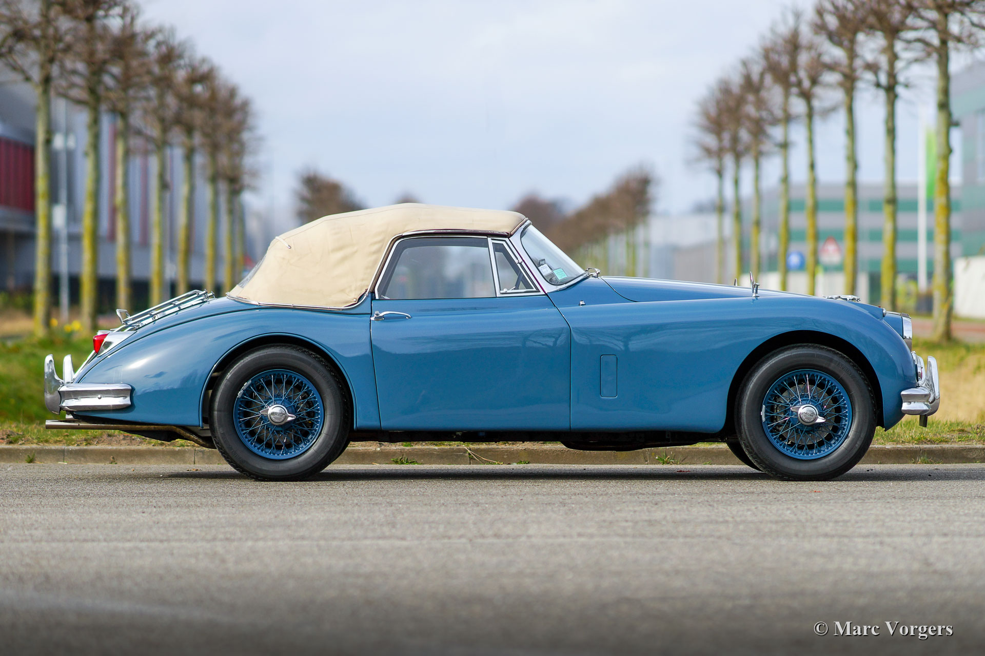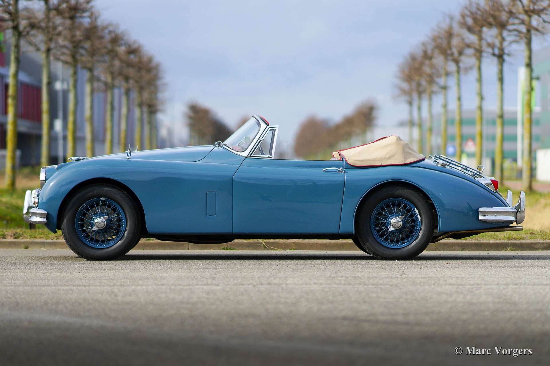 Jaguar XK 150 DHC, 1959. Colour Cotswold blue combined with blue wire wheels and a red leather interior trimmed with red carpet. This magnificent Jaguar XK 150 DHC (Drop Head Coupe) was sold new in the USA. The automobile was well serviced and maintained over the years, the car is in a good to very good driver condition with slight signs of use and age. This Jaguar XK 150 DHC is a true ‘head turner’ with its sleek appearance, wonderful colour scheme and the sporty exhaust note. This XK 150 does not only offer show, but the new proud owner is also in for a lot of go! The car is fitted with a powerful Jaguar 4.2 Litre E-type 265 bhp spec engine, a modern 5-speed manual gearbox, and a Stainless-Steel exhaust system. This Jaguar XK 150 drives and handles impressively powerful! The stopping power is also well catered for, the car features servo disc brakes on all four wheels. Furthermore, this gorgeous Jaguar is fitted with safety belts, wide beam Lucas SFT576 fog-lamps at the front, and a chrome baggage rack on the boot lid. This is an impressive Jaguar XK 150 DHC driver car which can be enjoyed to the fullest!