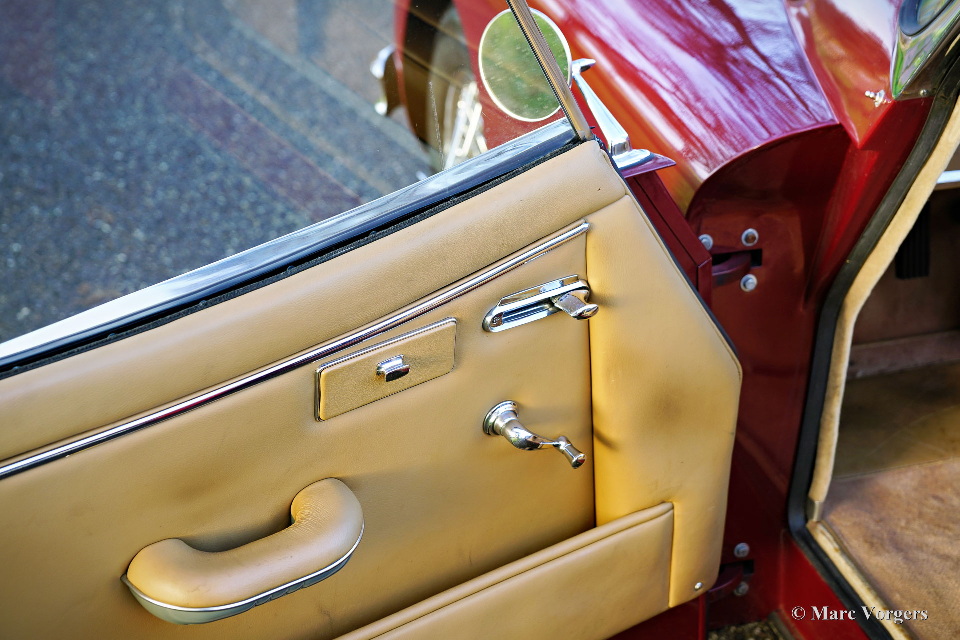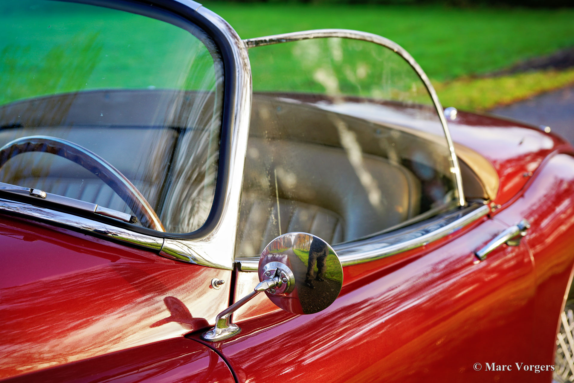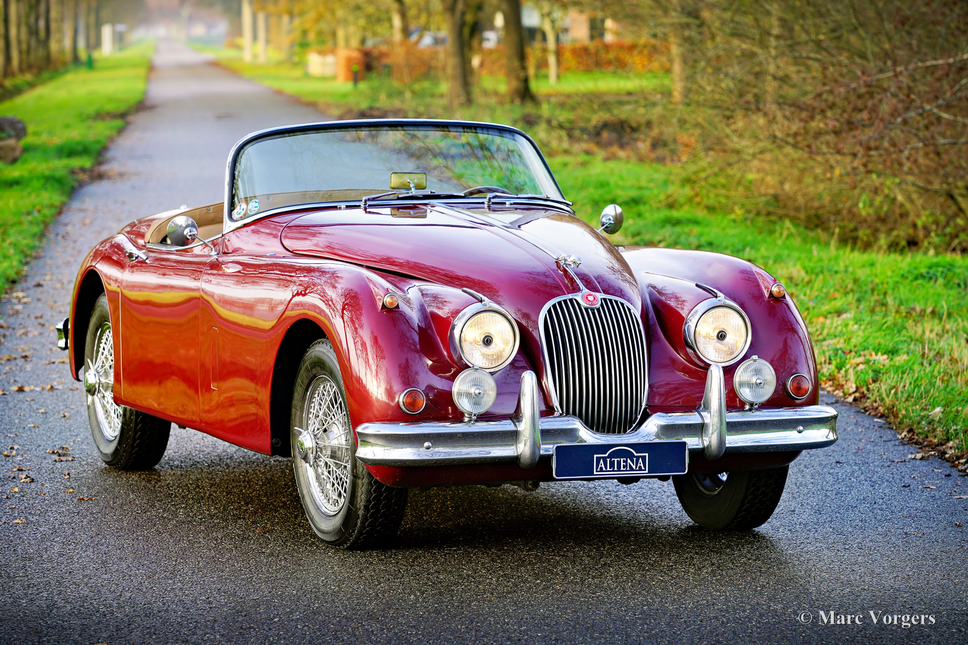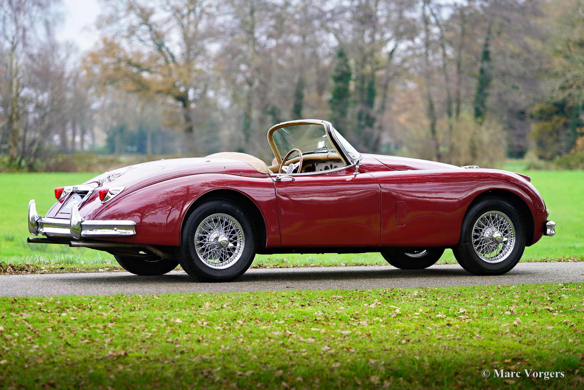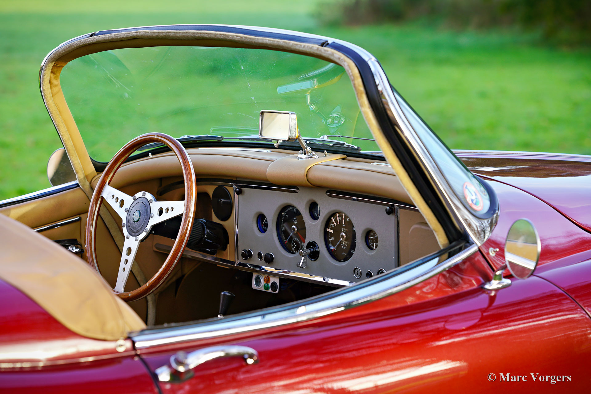 Jaguar XK 150 OTS (Roadster), year 1958. Colour opalescent dark red combined with a beige leather interior and matching wool carpet. The car features a black mohair soft top and a black tonneau cover. This glorious Jaguar XK 150 OTS (Open Two Seater, named ‘roadster’ in the USA) was sold new in the USA. The automobile was shipped to the Netherlands in the year 2010. In the Netherlands the car was extensively refurbished: The bodywork was perfected and repainted, and the mechanically the car was brought up to date. The six cylinder XK engine was replaced by an overhauled example, the original engine is still available. After completion of the works, the owners have fully enjoyed the car for several years discovering the Alps and a large part of Italy. This wonderful Jaguar XK 150 roadster is ion a good to very good condition and the car drives delightfully. The car shifts, steers, and breaks like it should and the engine runs and sounds perfectly. The car is fitted with overdrive, a pair of Lucas SFT576 wide-beam cornering/fog lamps, and 16-inch chrome wire wheels shod with Vredestein Sprint Classic 185/16 tyres. This is a wonderful and sought-after Jaguar XK 150 Roadster at a very interesting price/quality level. A beautiful classic to be enjoyed to the fullest!