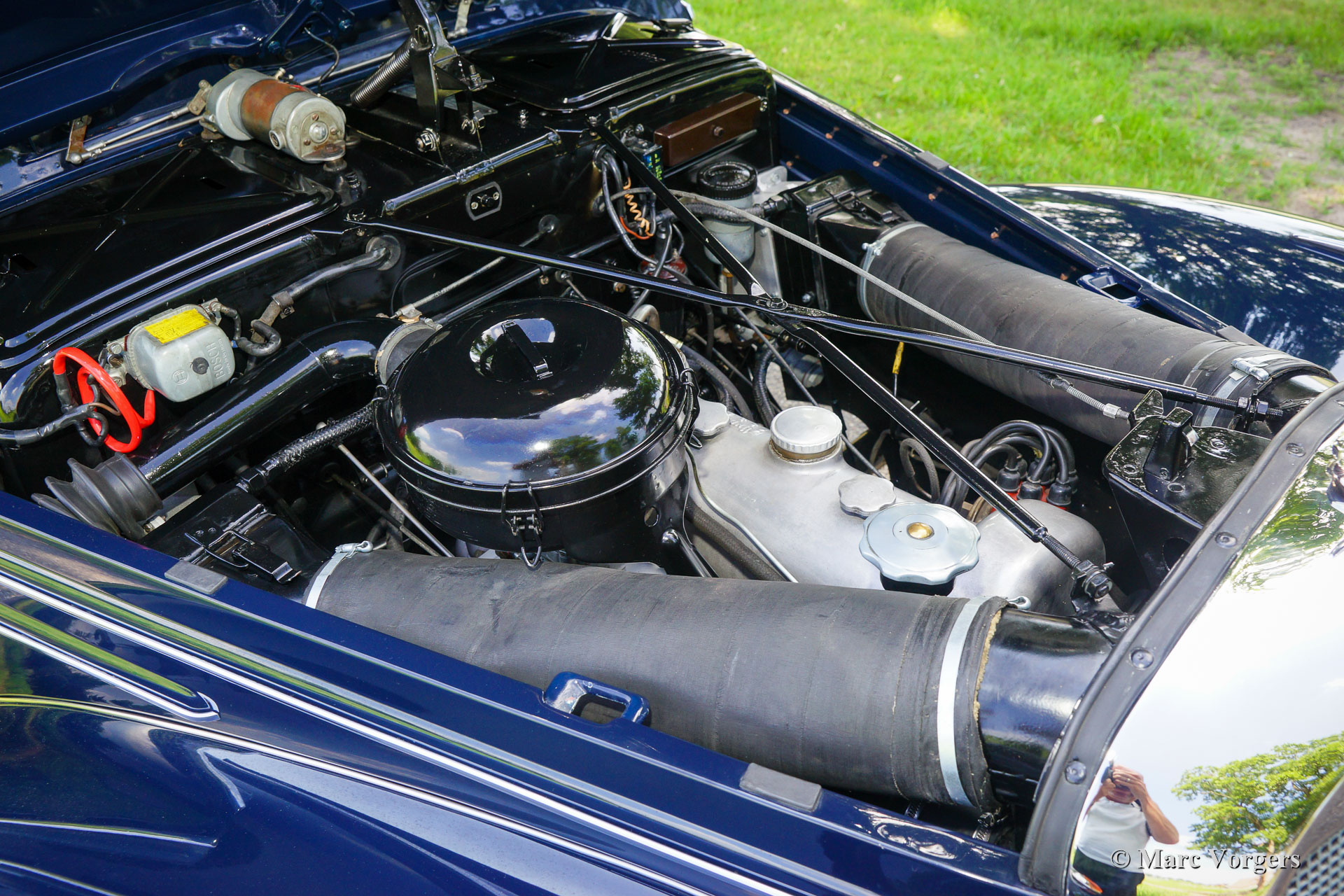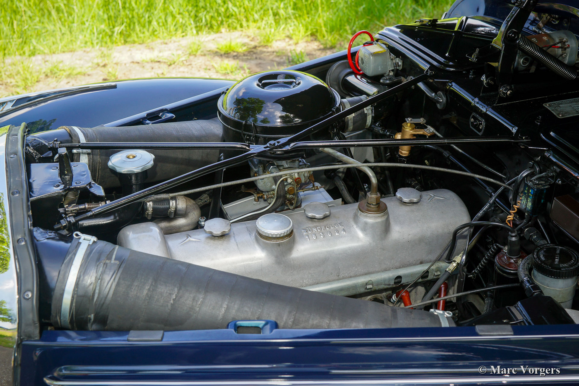 Mercedes-Benz 220 Cabriolet A, year 1951. Colour dark blue combined with a grey leather interior and grey carpet. Dark blue hood and hood cover. In the 1990s, this gorgeous and rare Mercedes 220 Cabriolet A was extensively restored to perfection by a Mercedes-Benz specialist in the Netherlands. Everything was restored, overhauled, and / or renewed, only the original leather interior upholstery was refurbished and carried over in the restored car. After over 20 years and only 4983 kilometres since the restoration the car is still in excellent condition! The bodywork, paintwork and chrome are in superb condition. The engine-room, underside and boot look nice and clean. The almost 70 years old original interior is in good condition with traces of use and age. The automobile shows all the original details and it is fitted with the factory original Becker radio and Bosch fog lamps. Furthermore, the car comes with the original tool-roll and the ultra-rare original ‘Bad Cannstadt’ suitcase set. A highly desirable example.