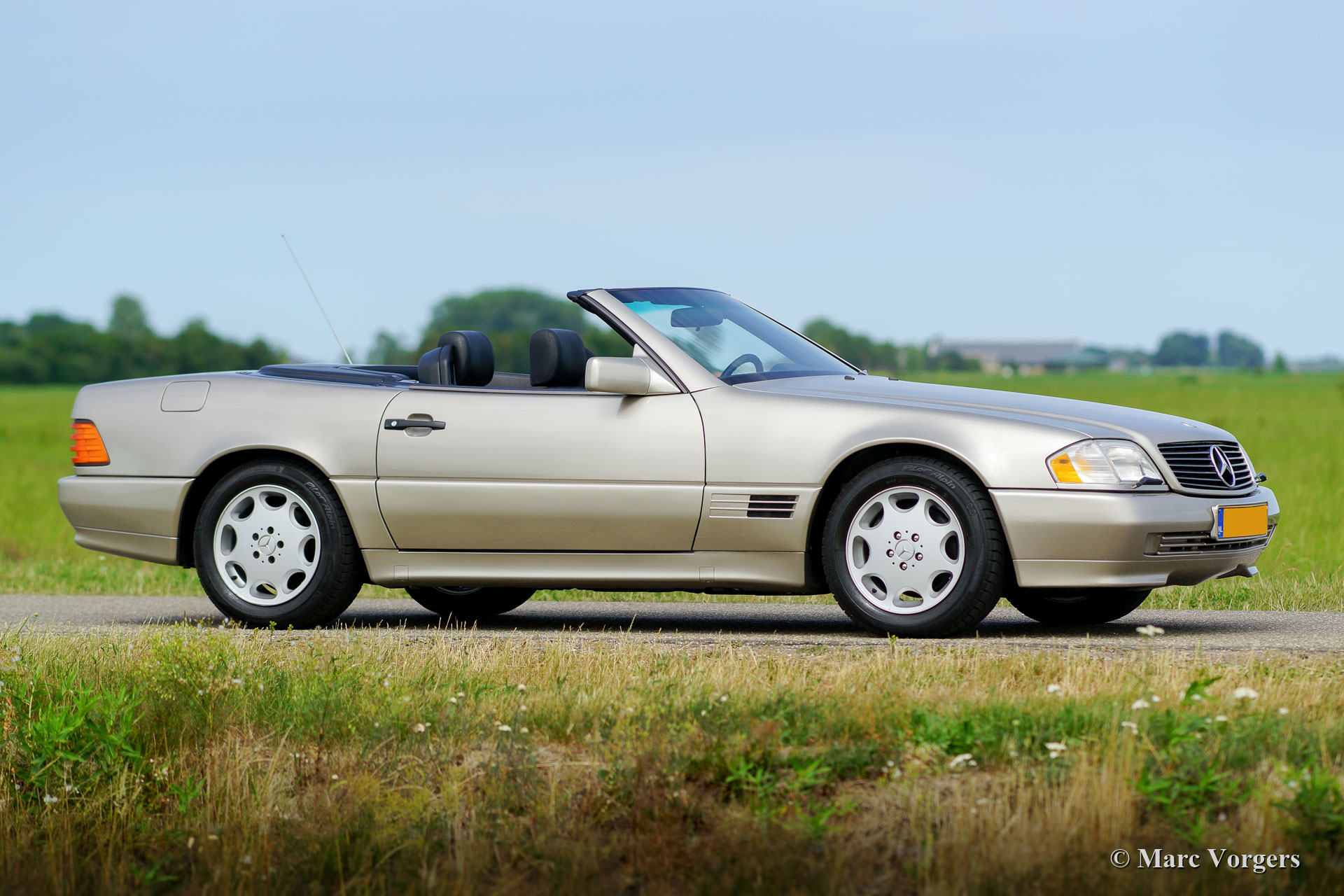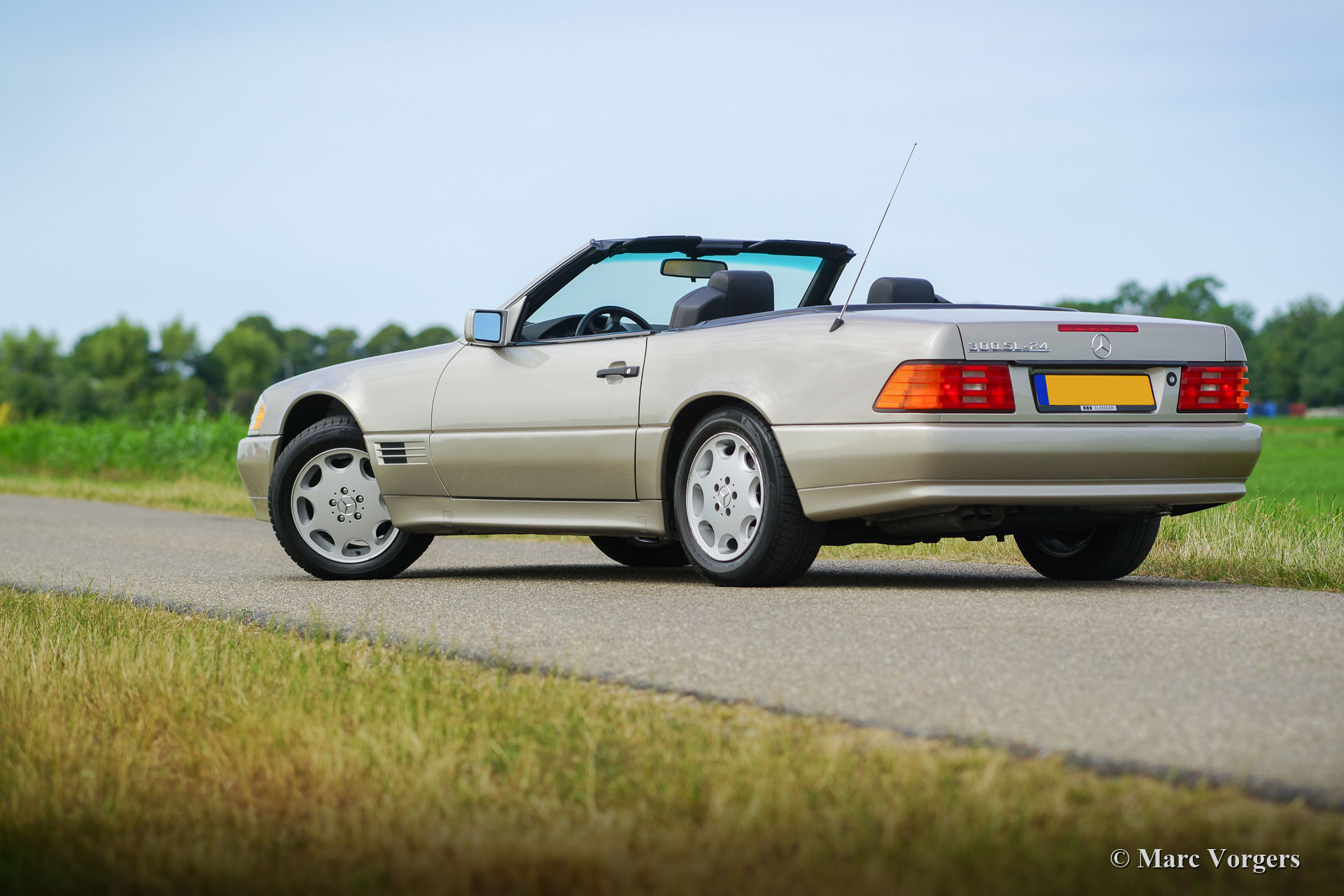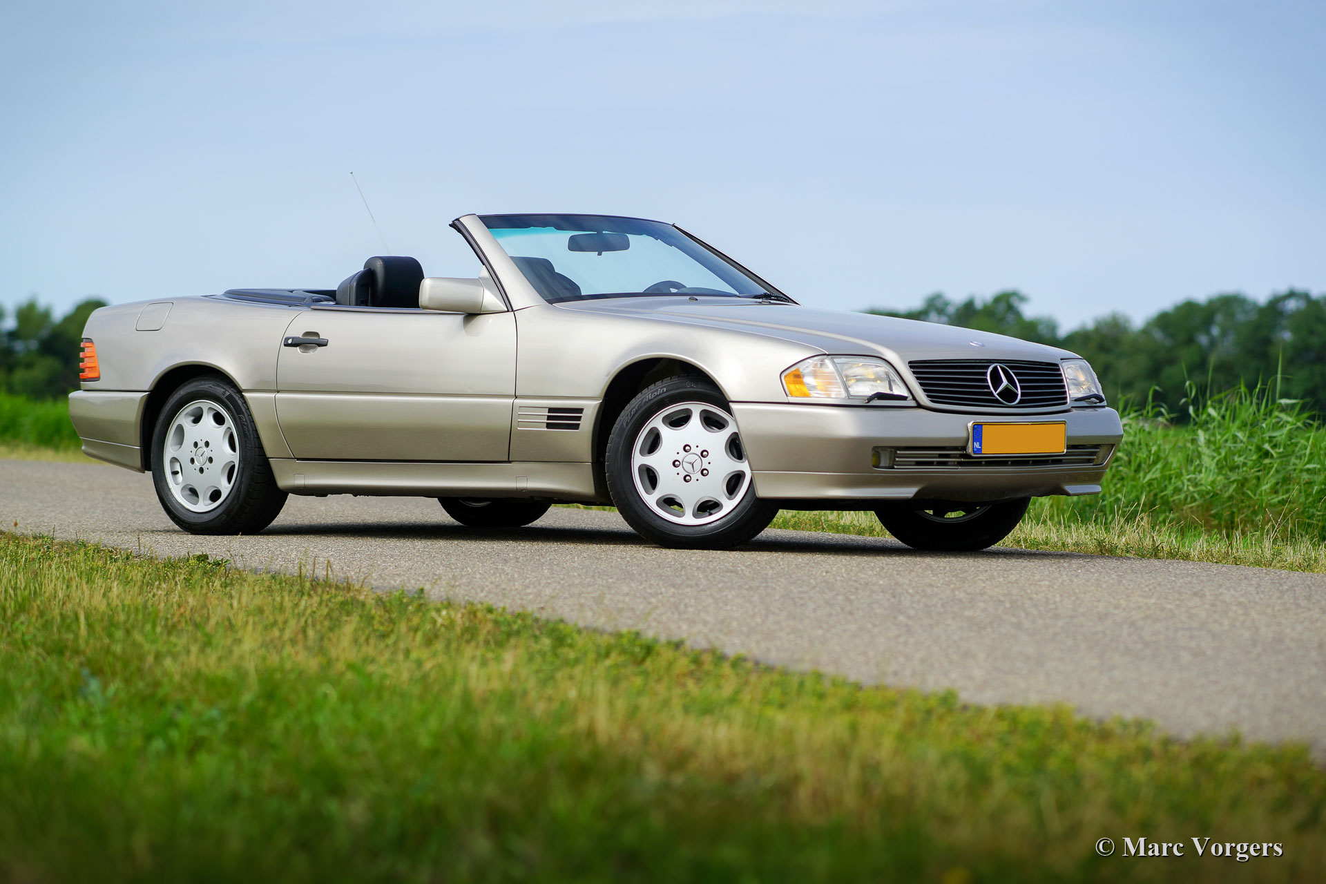 Mercedes-Benz 300 SL-24 (R129), year 1992. Colour Champagne metallic combined with a black leather interior and black carpet. Black mohair soft-top and a hard-top in body colour. This magnificent Mercedes 300 SL was sold new in France and it is in excellent original condition. The car has driven only 52.000 kilometres from new! The exterior, the interior and the soft-top look almost like new, only very slight signs of use can be found. The 24-valve engine runs and pulls superbly! This fine Mercedes-Benz features power windows, central locking, seats with memory function, ABS and Air-conditioning. The car comes complete with the original tool-set.