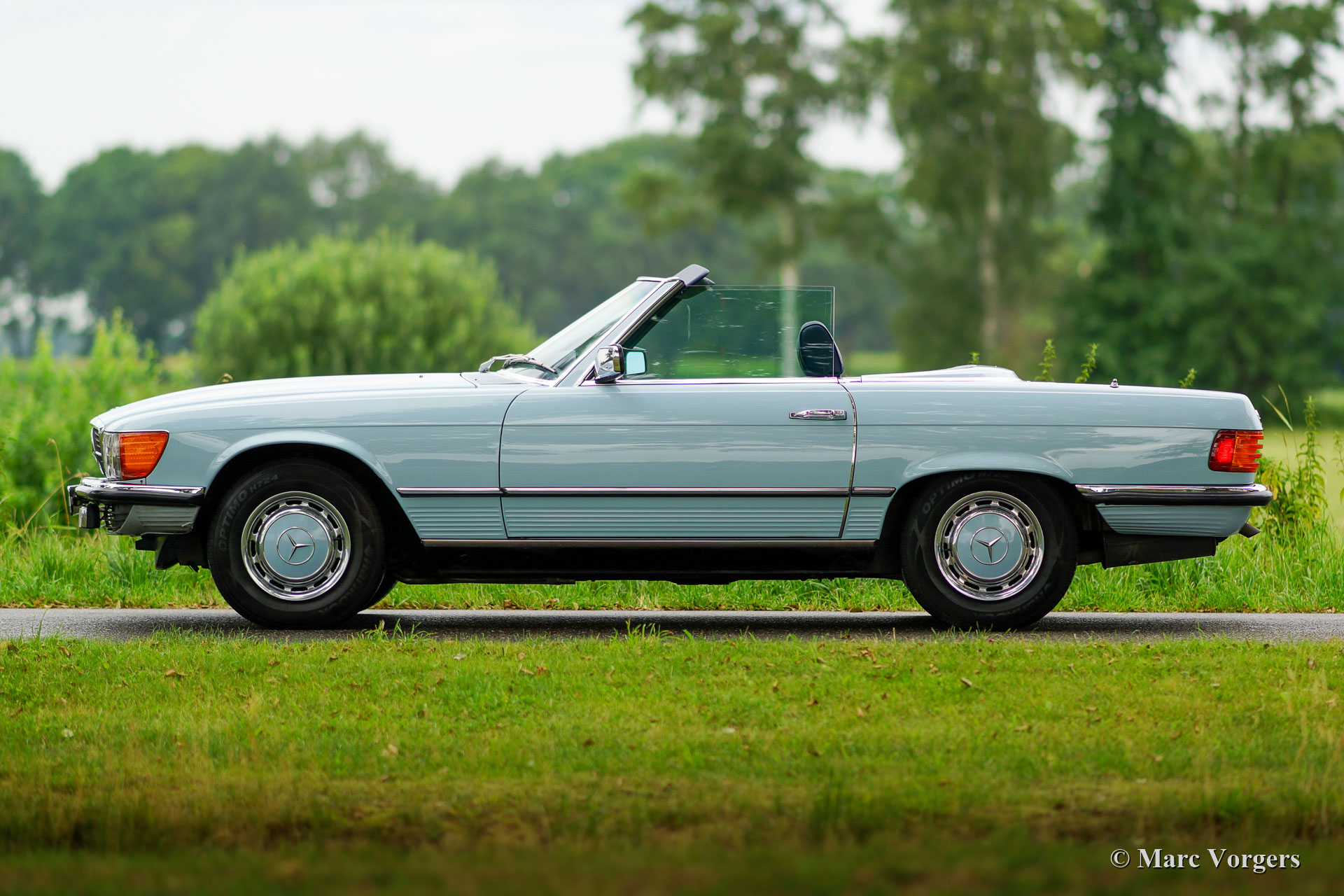 The Mercedes 280 SL, 350 SL and 450 SL are the successors of the 230 SL, 250 SL and 280 SL as we know under the nickname "Pagoda". The "Pagoda was built from the year 1963 until the year 1971, the year the new SL generation was presented to the market. Again Mercedes-Benz achieved to create a timeless design with slick, proper lines. In this shape the SL was sold for over twenty years. The "new" generation Mercedes SL is bigger, wider and heavier than its predecessor but again it was a perfect car considering construction, road holding and driving-comfort. The Mercedes-Benz SL was built with several engines. the buyer had to choose between a V8 with 3.5 or 4.5 liter cylinder capacity or a six cylinder engine with a cylinder capacity of 2.8 liter. The SL was standard equipped with a soft-top which could neatly be stowed away under a lid fully integrated in the car. Optionally the SL could be fitted with a hard-top. The hardtop can easily be fitted to the car, in a couple of minutes, with the soft-top down in place.